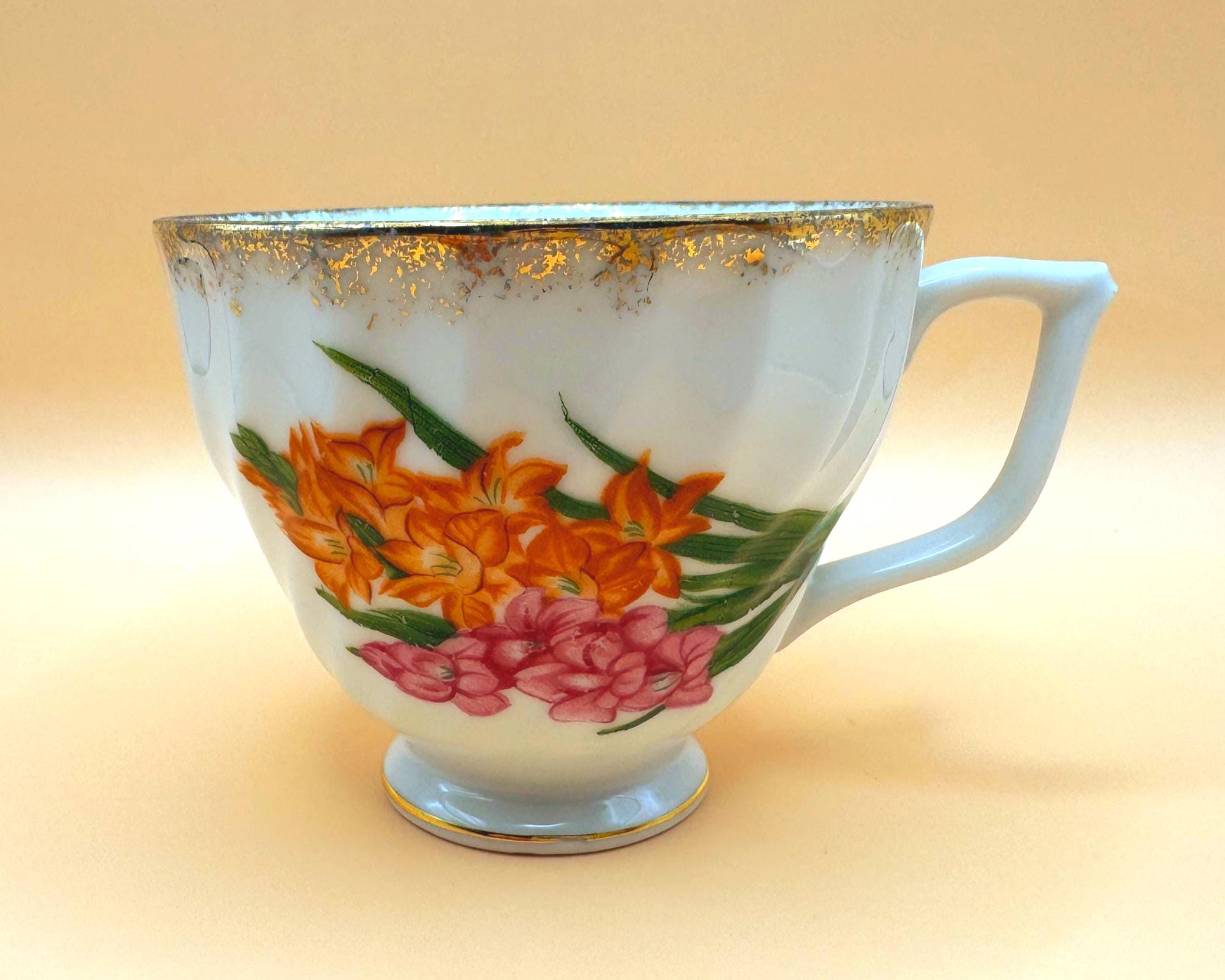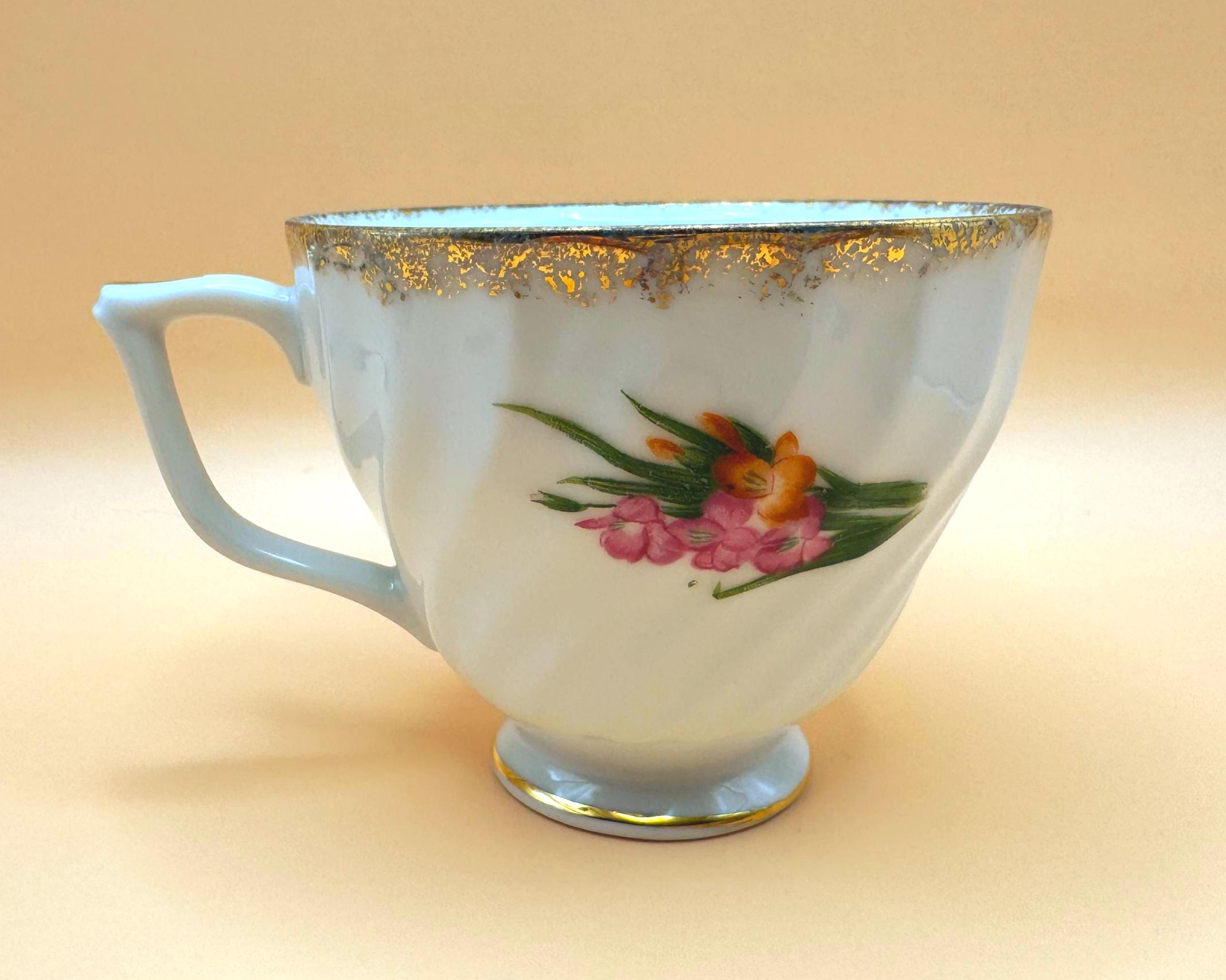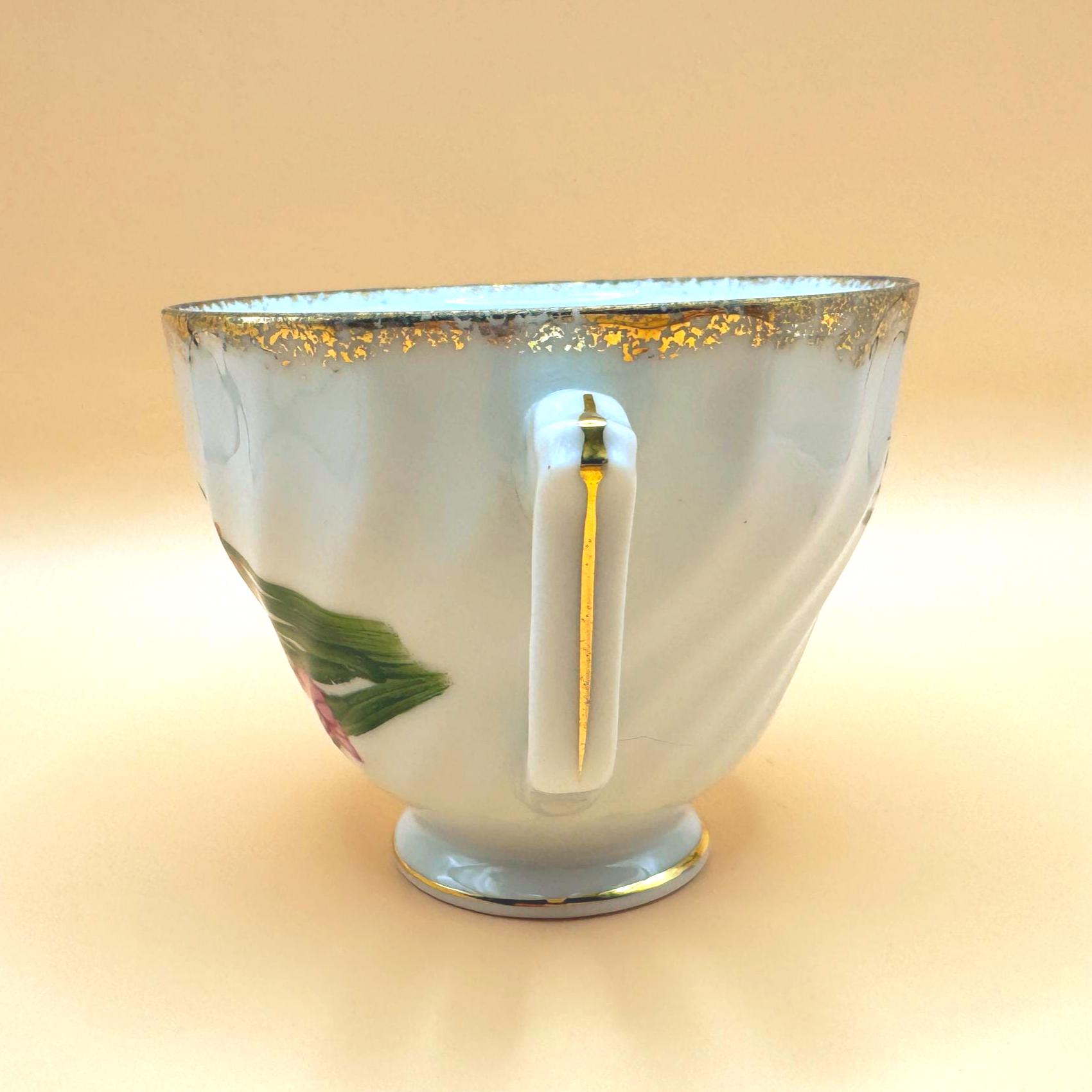 The cup has a gently swirled form, pedestal base, and delicate gold trim along the rim and handle, giving it a graceful, classic look. A lovely piece for display, a cottage-style tea collection, or a vintage-inspired tea setting.