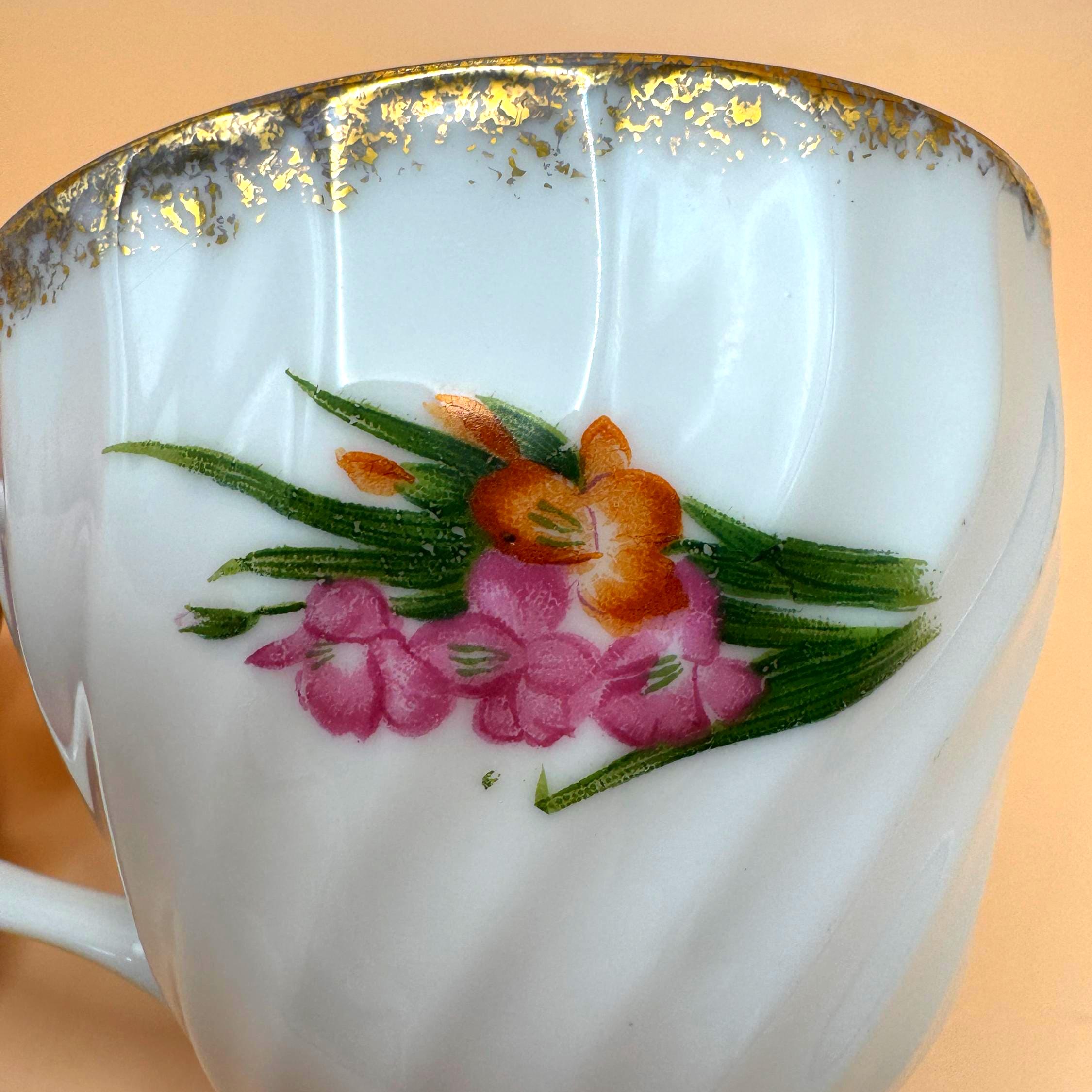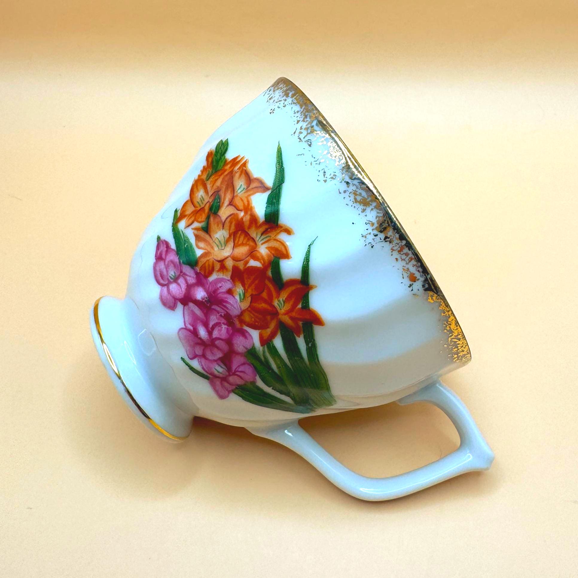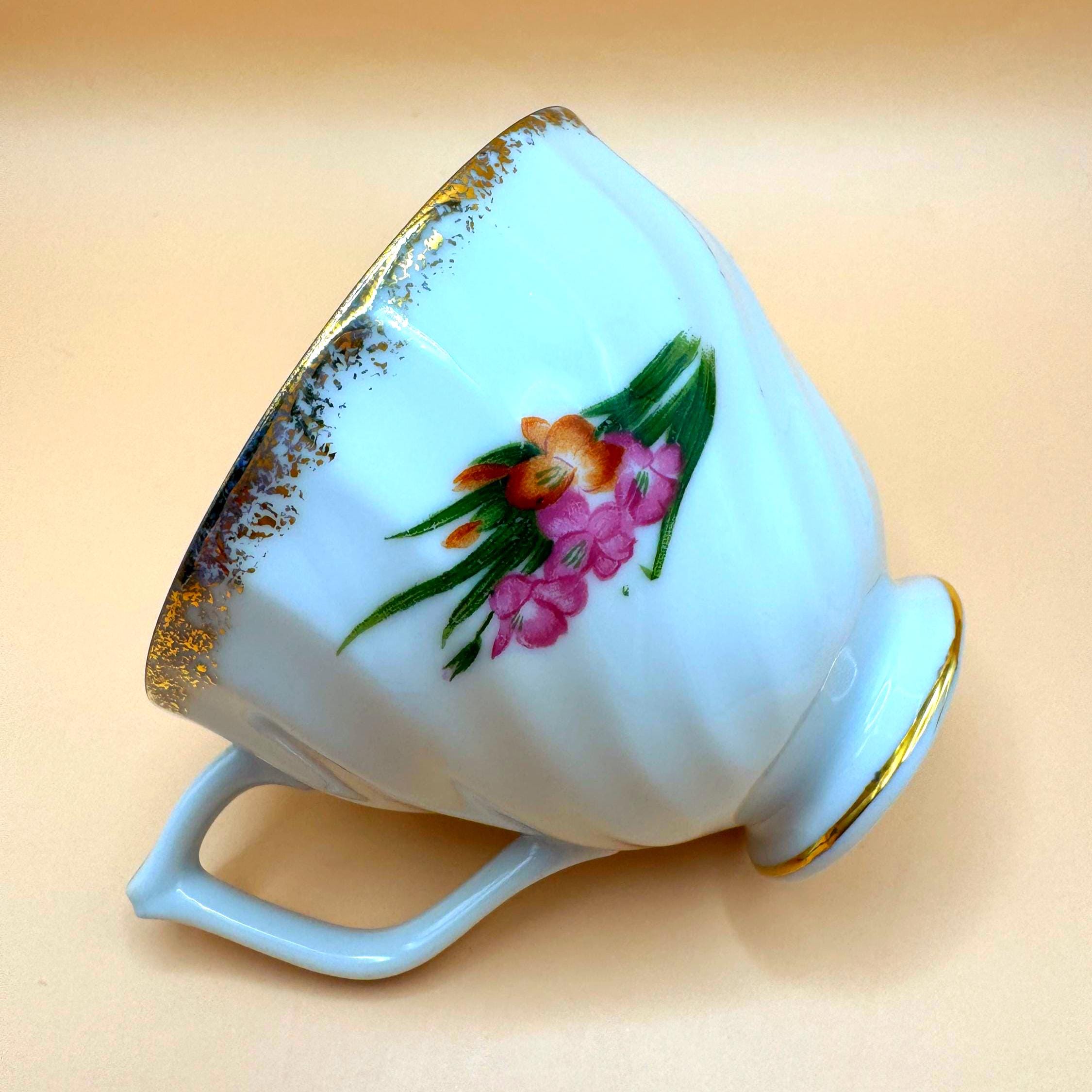 The cup has a gently swirled form, pedestal base, and delicate gold trim along the rim and handle, giving it a graceful, classic look. A lovely piece for display, a cottage-style tea collection, or a vintage-inspired tea setting.
