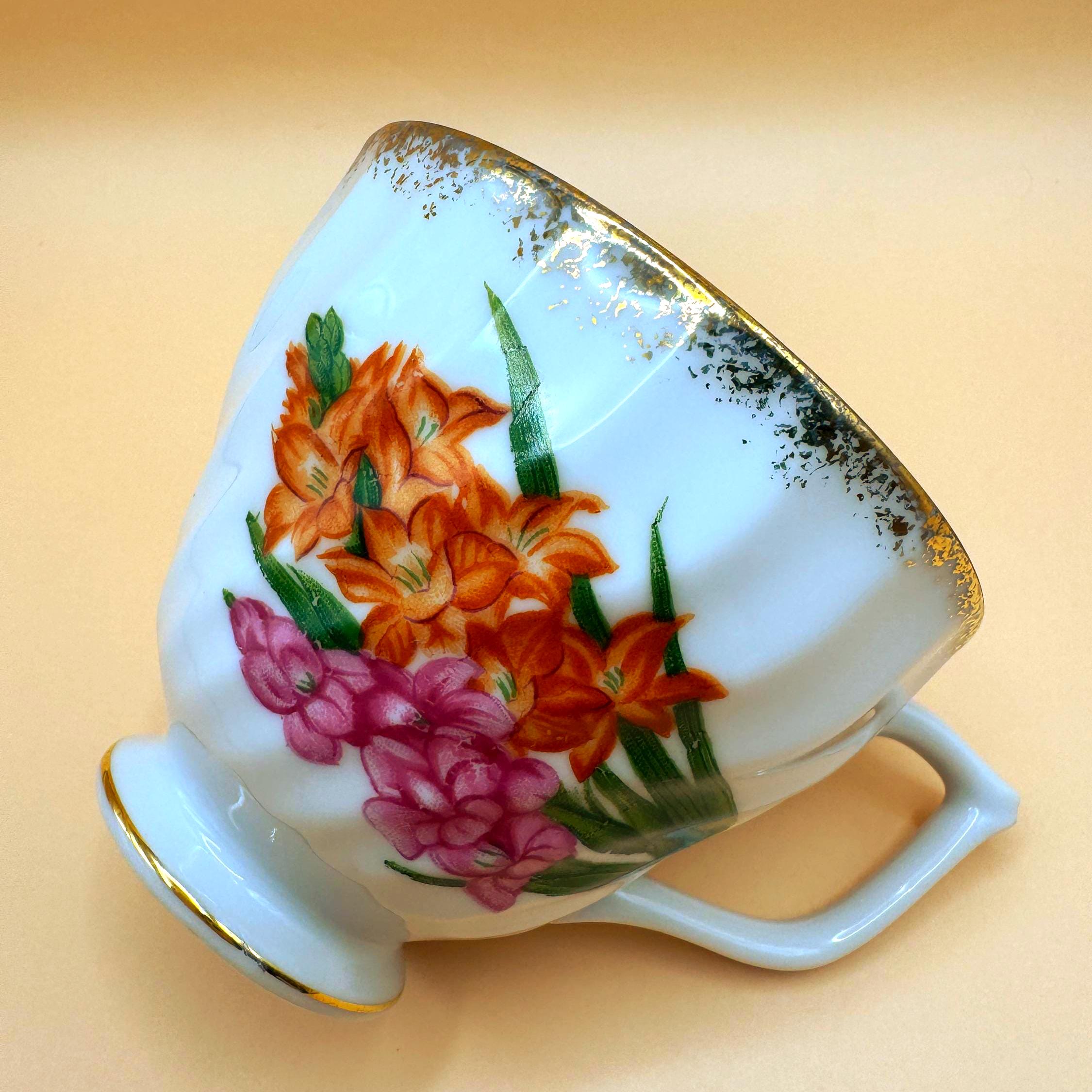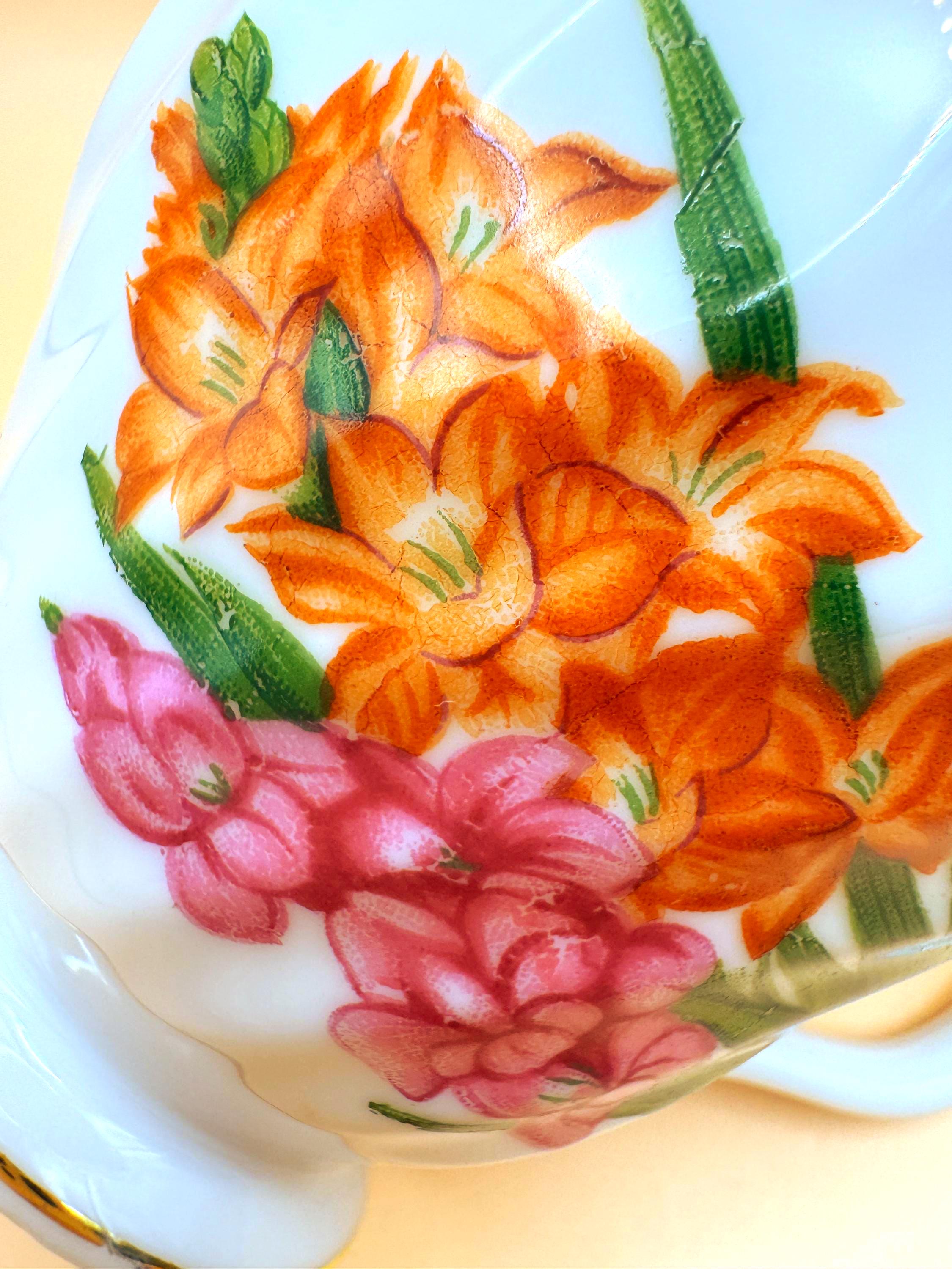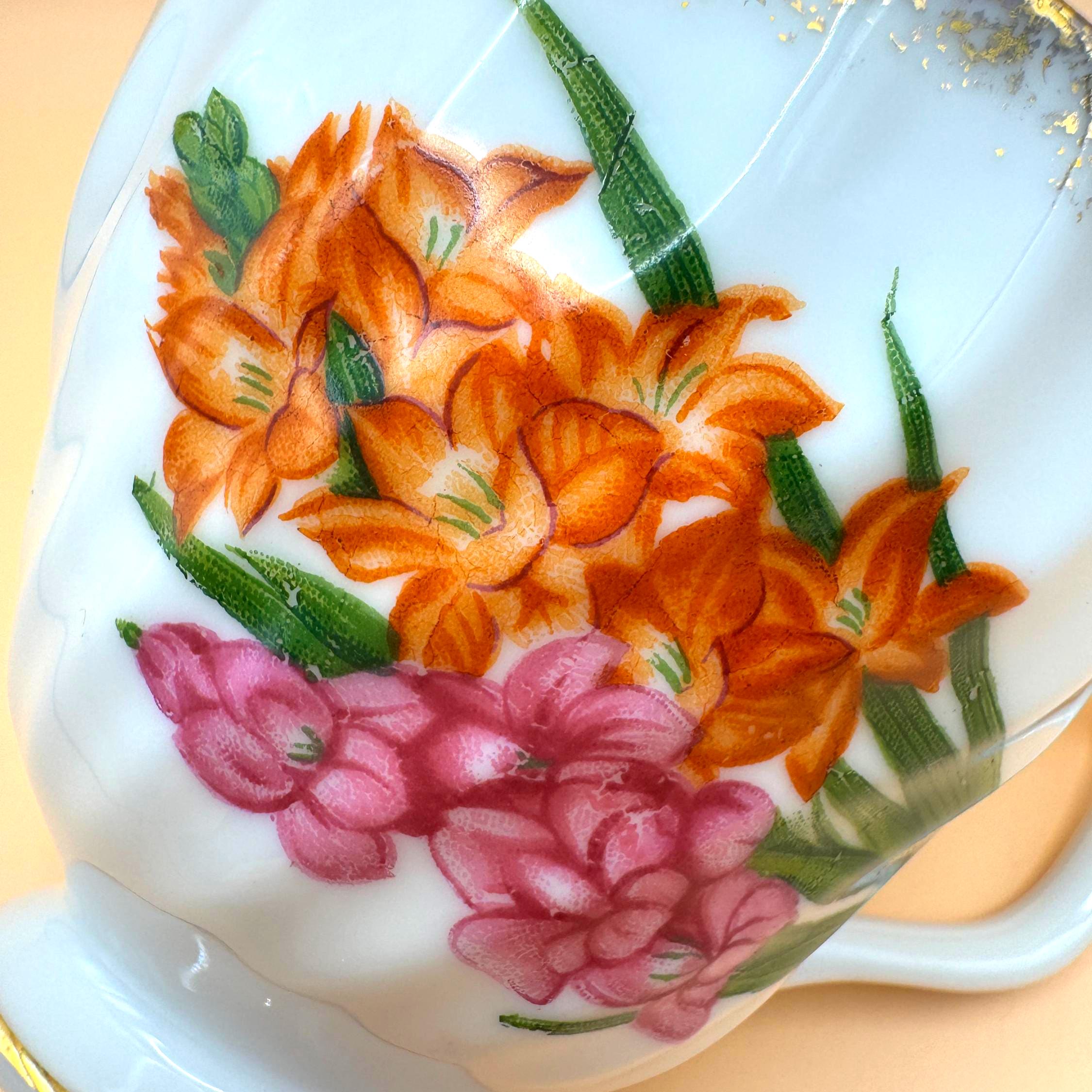 Charming vintage bone china teacup featuring a soft white to ivory body with hand-painted florals in warm orange and rosy pink, accented with green leaves. The fine bone china body shows natural translucence when held to the light, a hallmark of quality bone china.