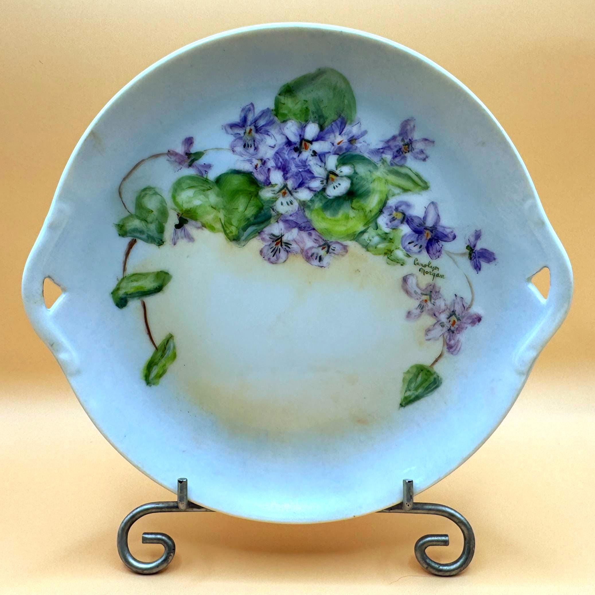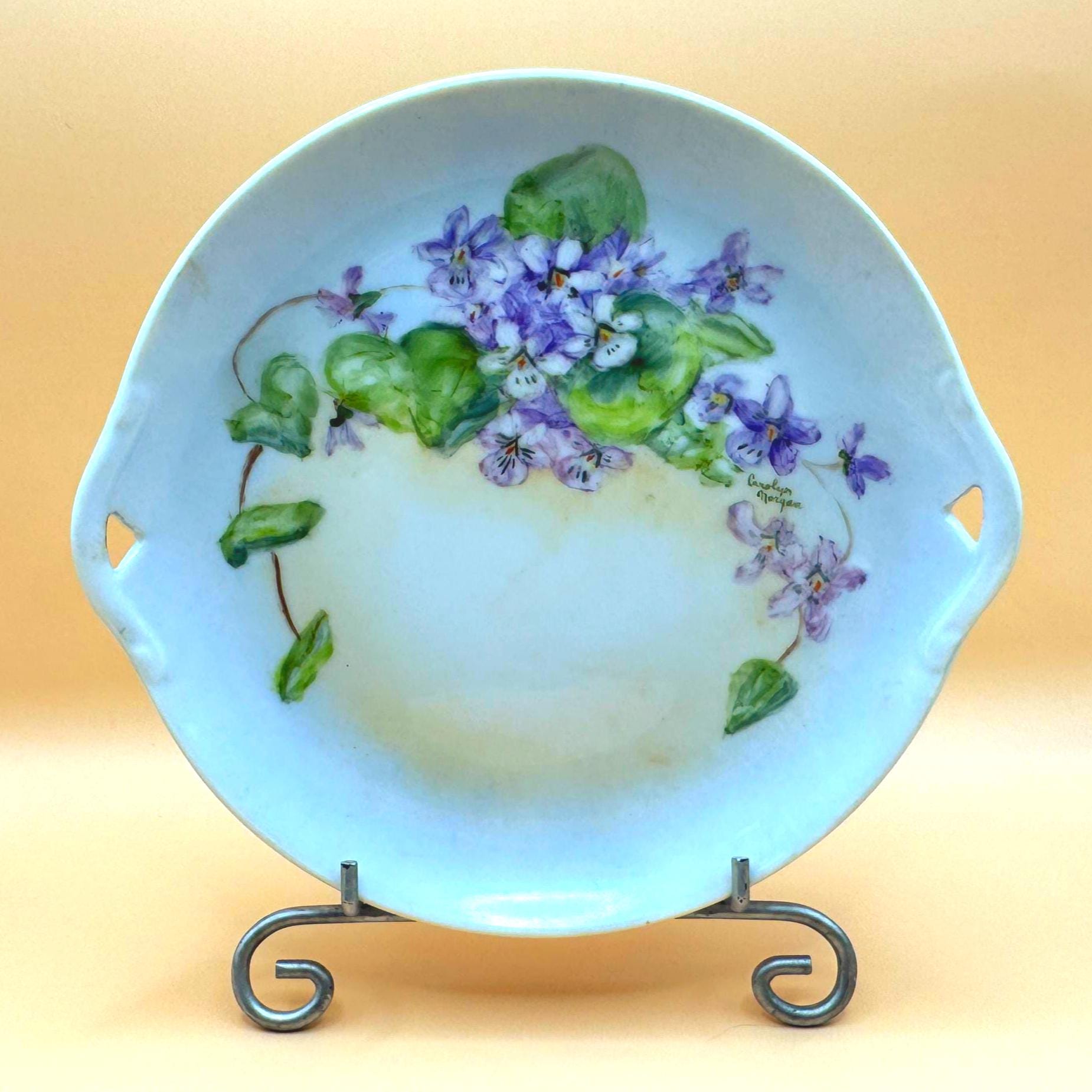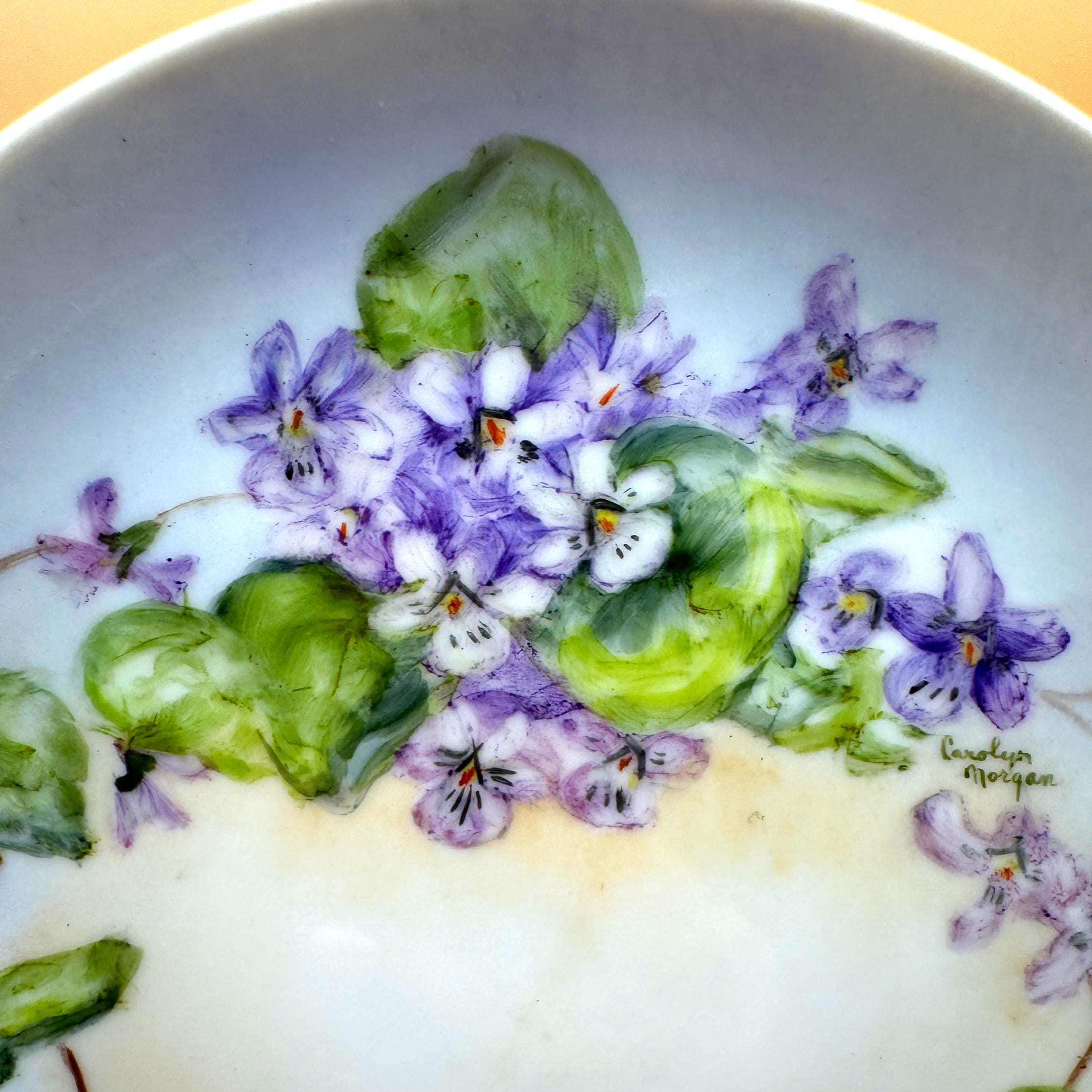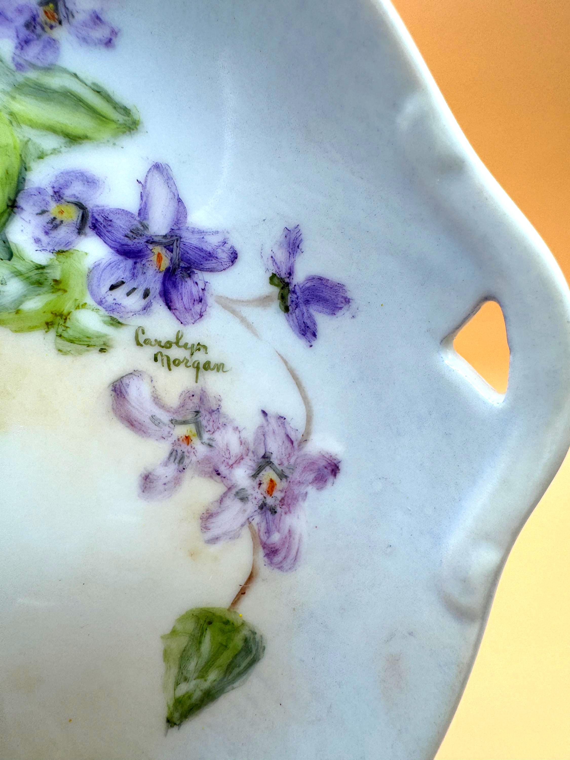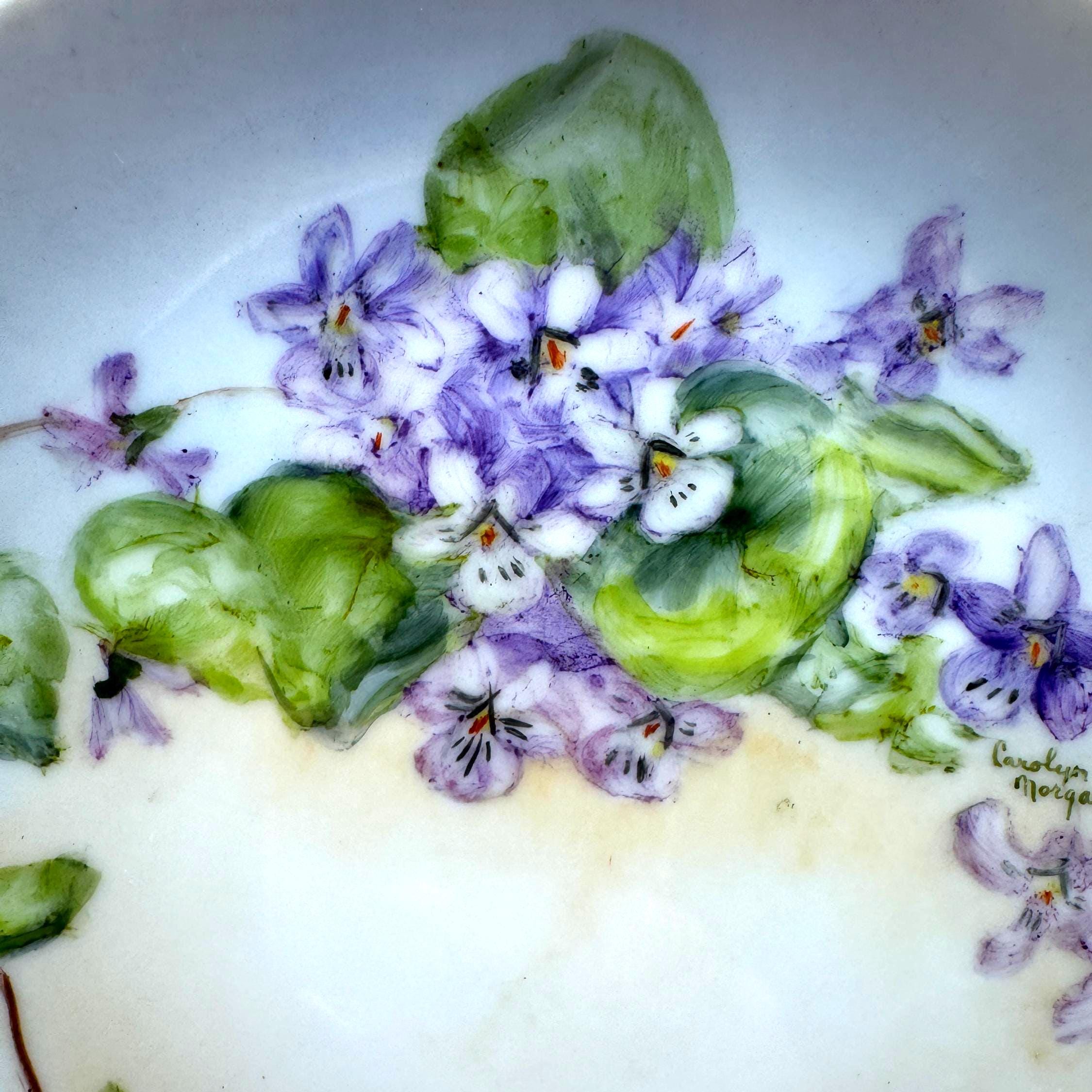 Beautiful vintage porcelain decorative plate featuring a hand-painted floral design in soft purple and green tones. The artwork showcases delicate violet flowers and leafy vines, thoughtfully arranged and signed by artist, Carolyn Morgan, adding collectible and artistic appeal.