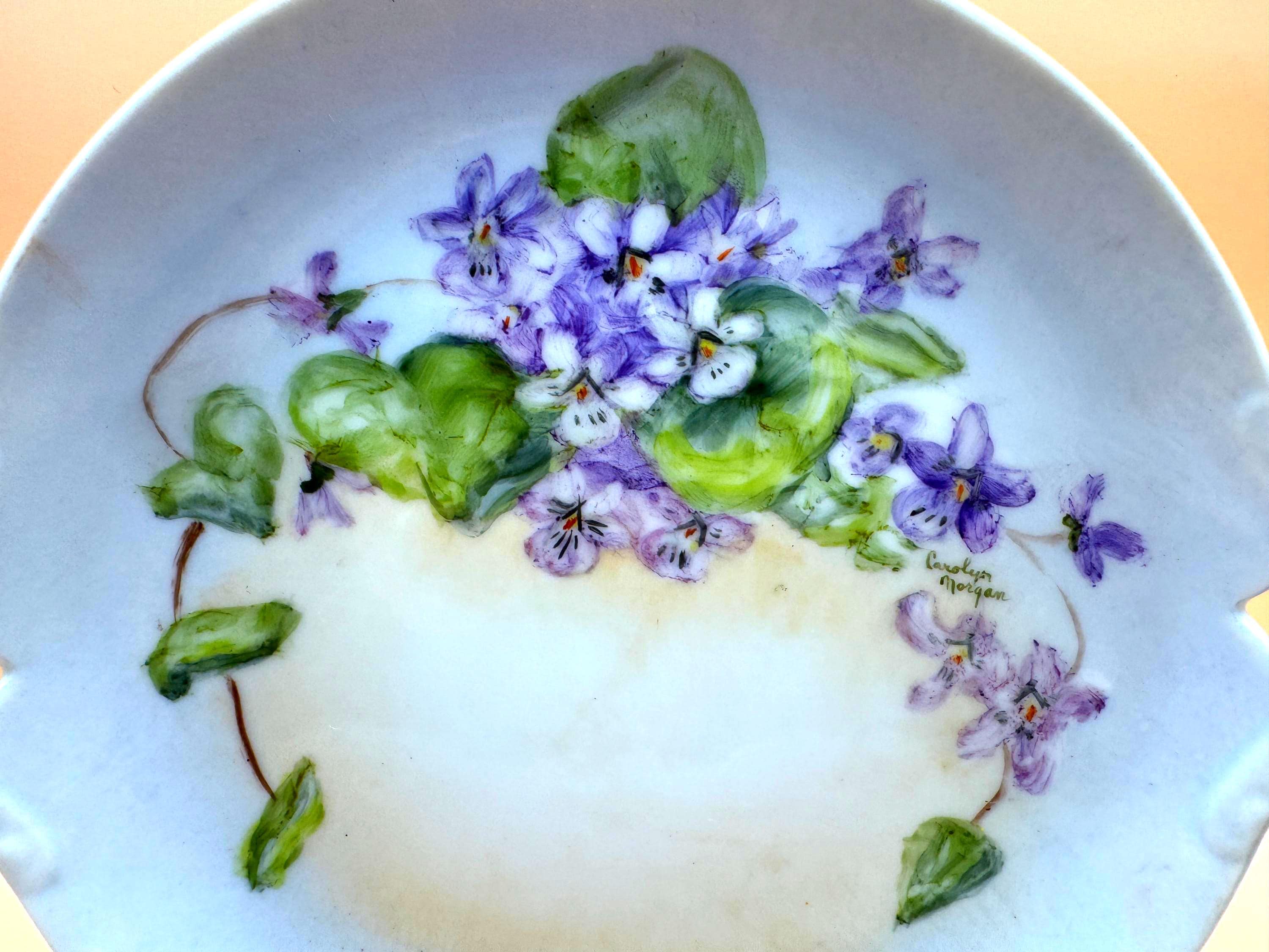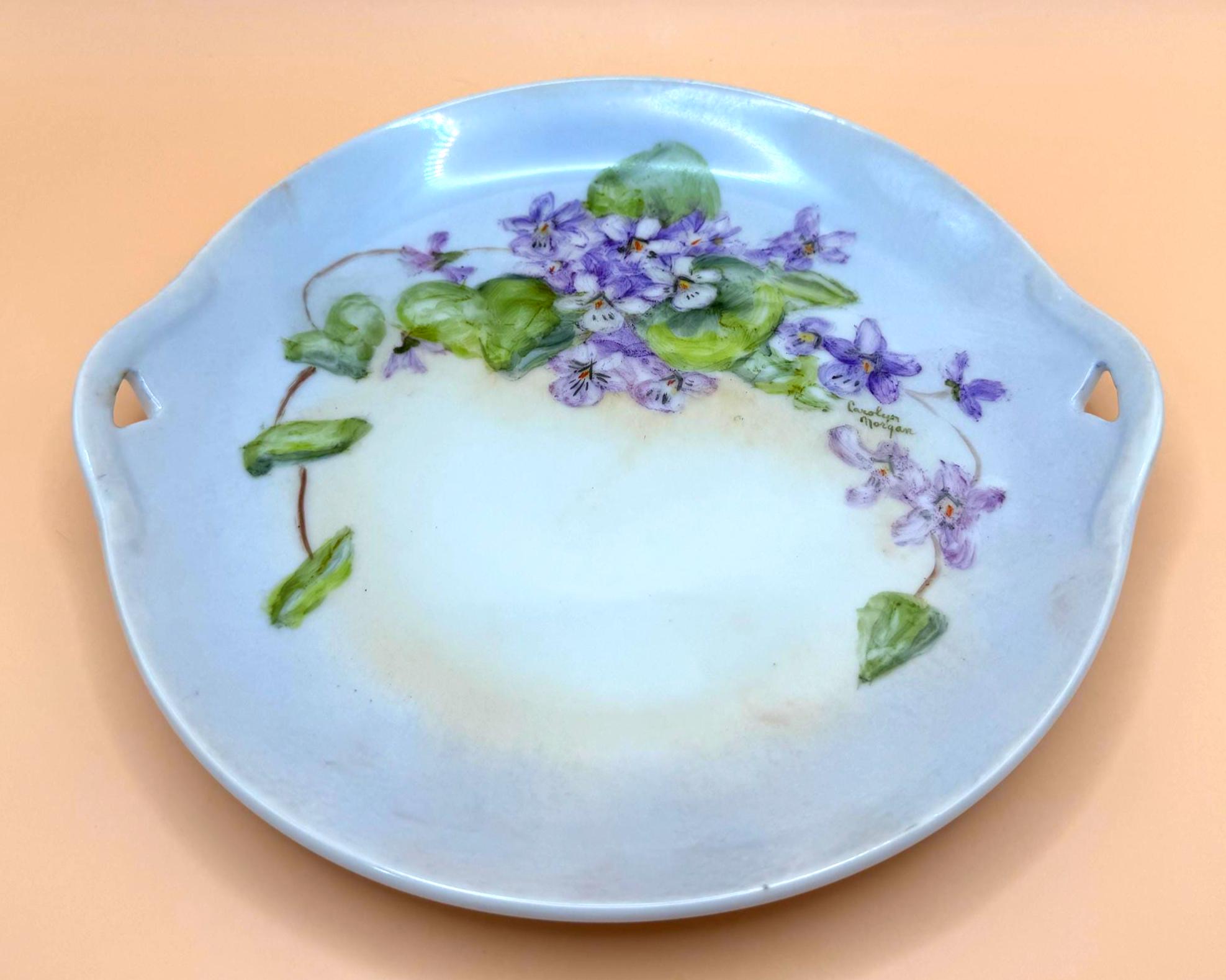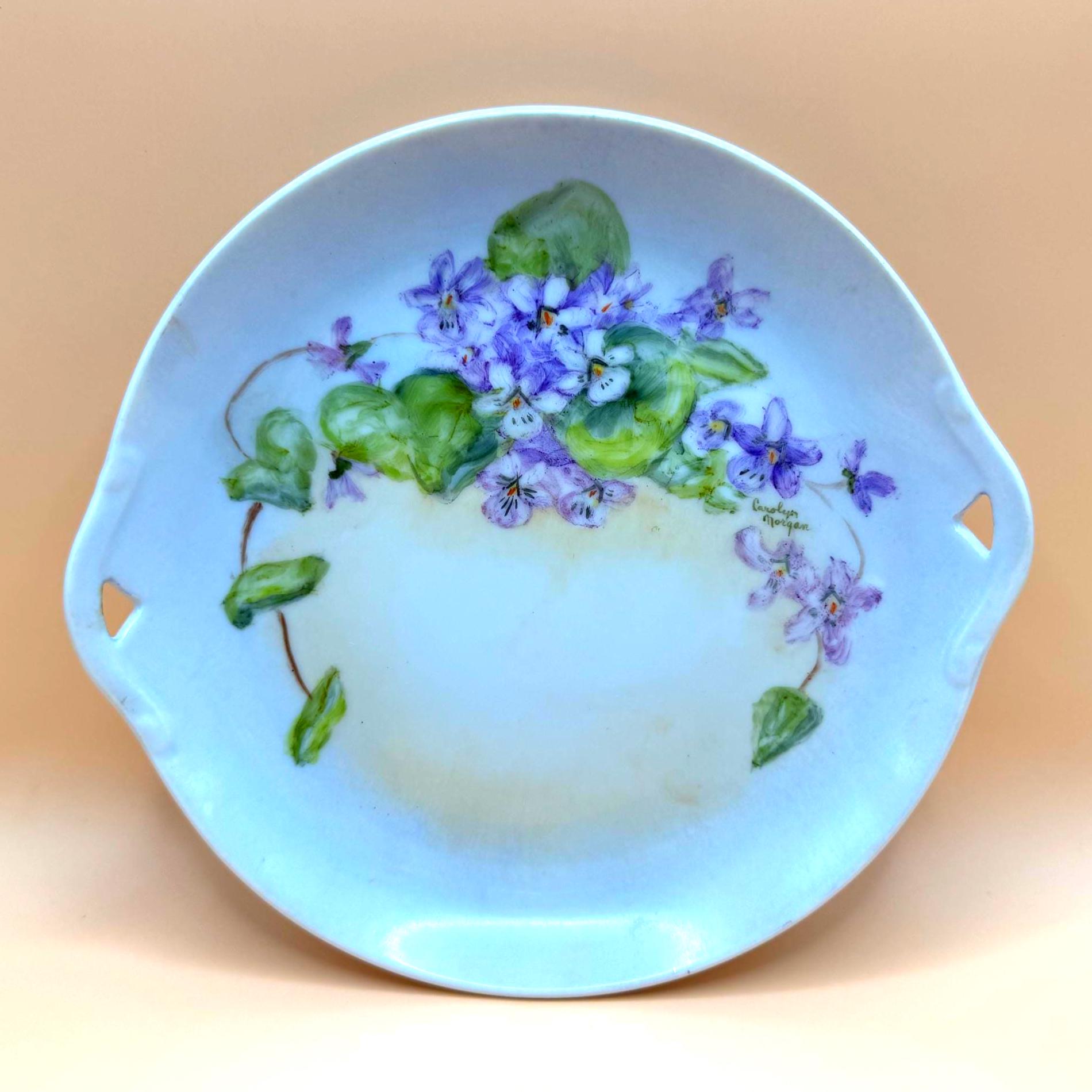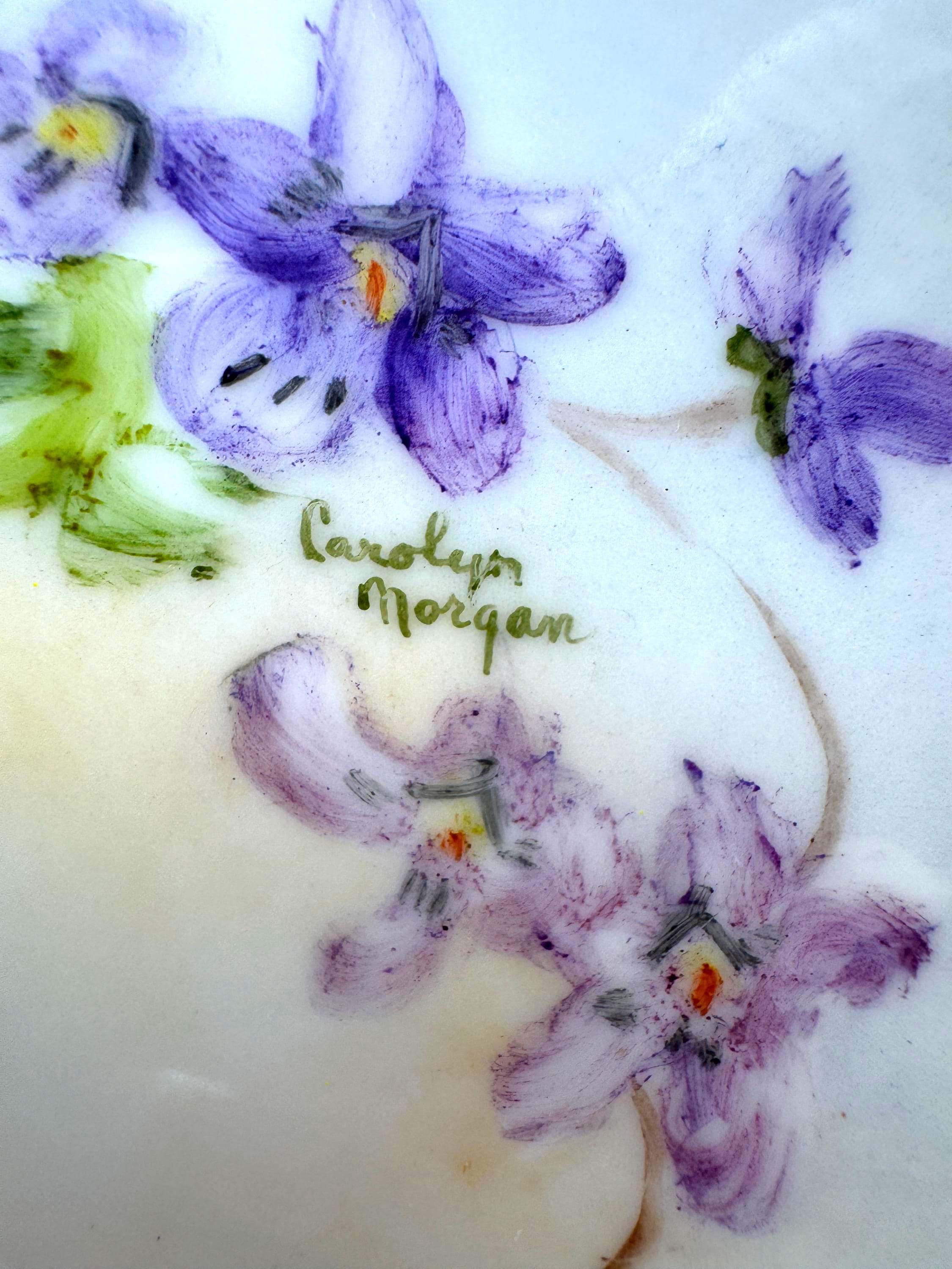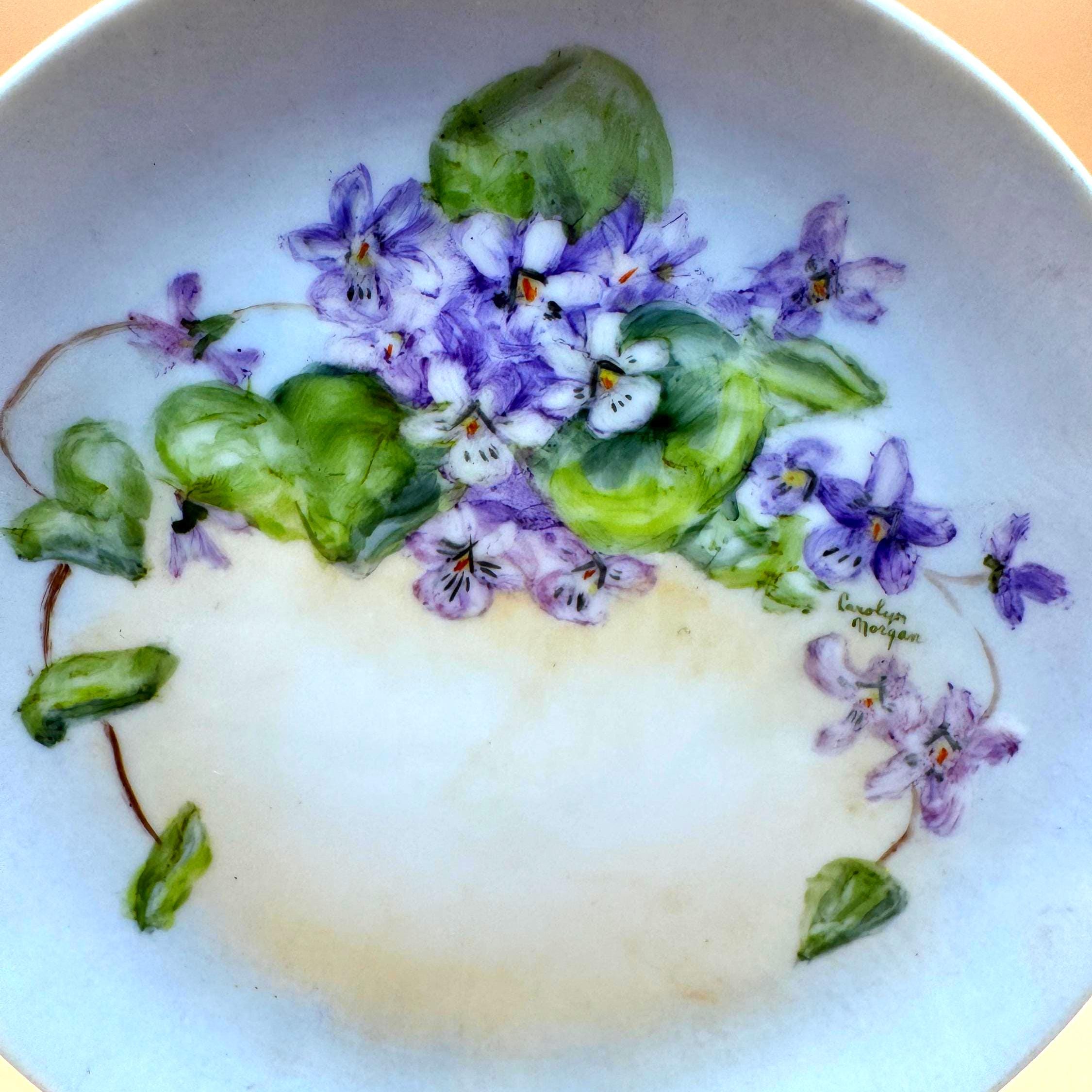 Beautiful vintage porcelain decorative plate featuring a hand-painted floral design in soft purple and green tones. The artwork showcases delicate violet flowers and leafy vines, thoughtfully arranged and signed by artist, Carolyn Morgan, adding collectible and artistic appeal.