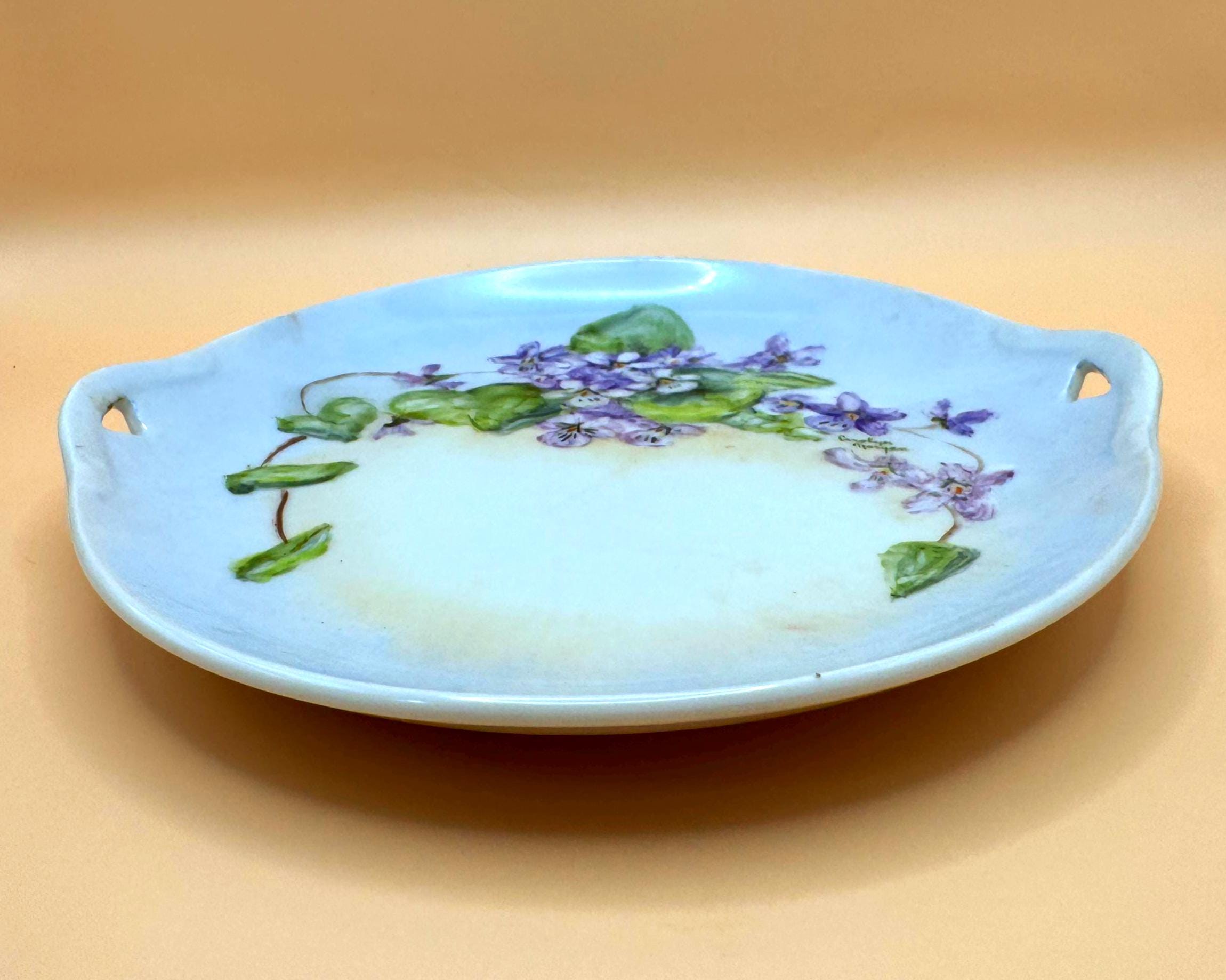 This plate includes dual pierced handles on opposite sides, giving it an elegant silhouette ideal for display. A lovely piece for a china cabinet, wall display, or plate stand, and a wonderful addition to a vintage porcelain or hand-painted ceramics collection.