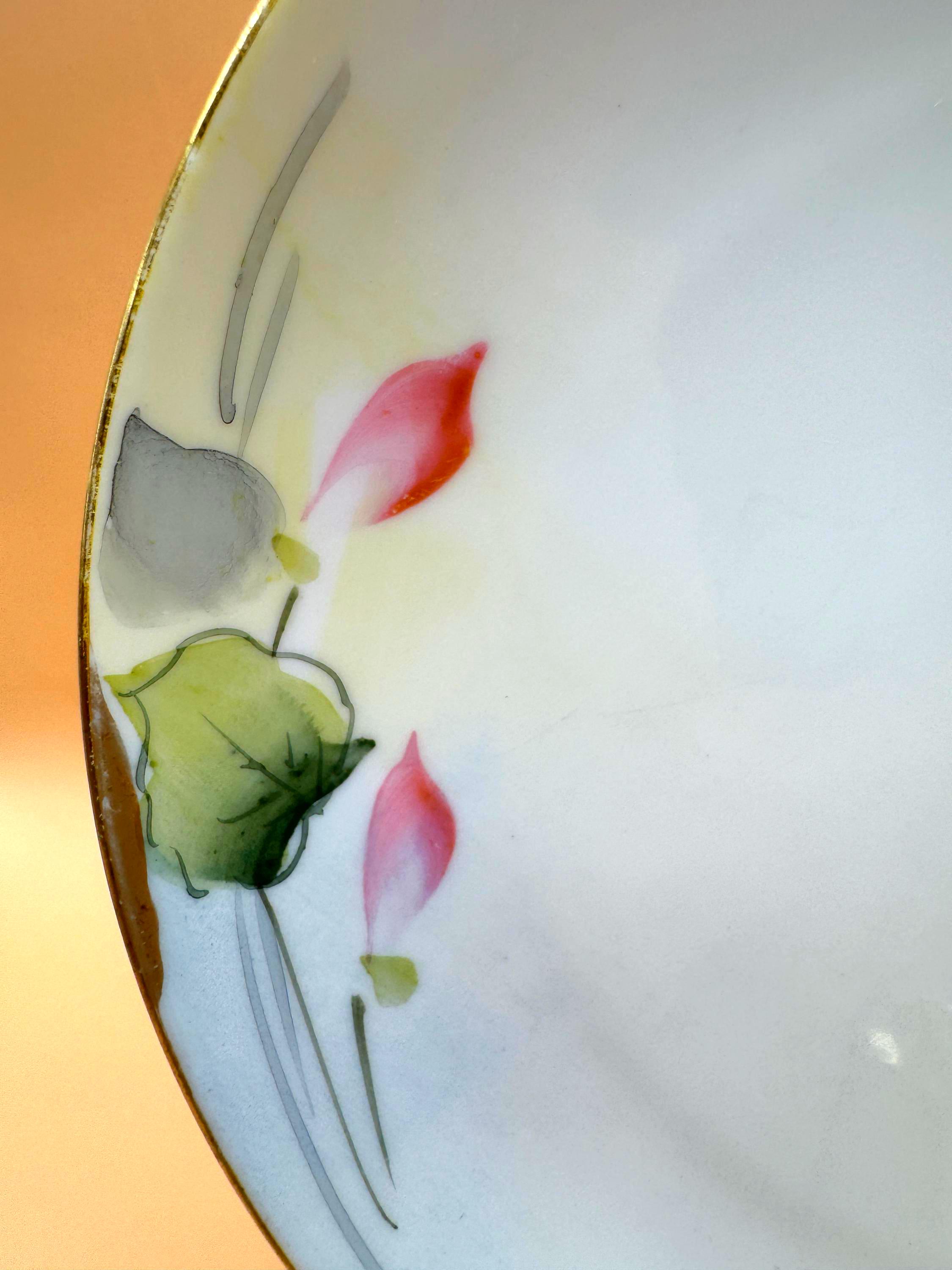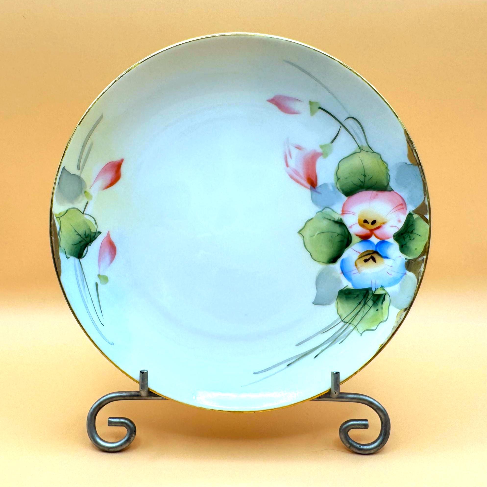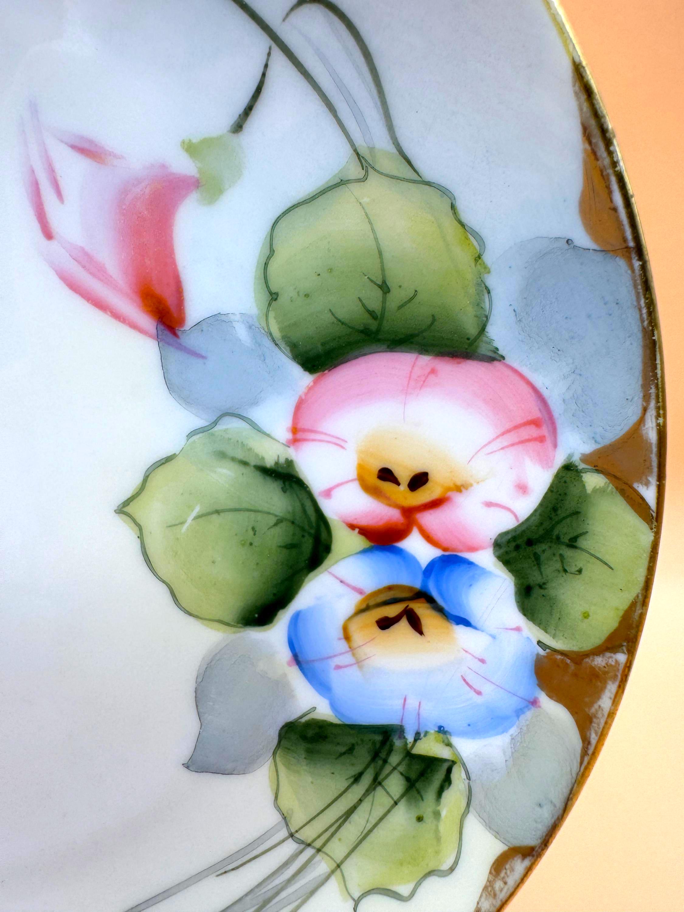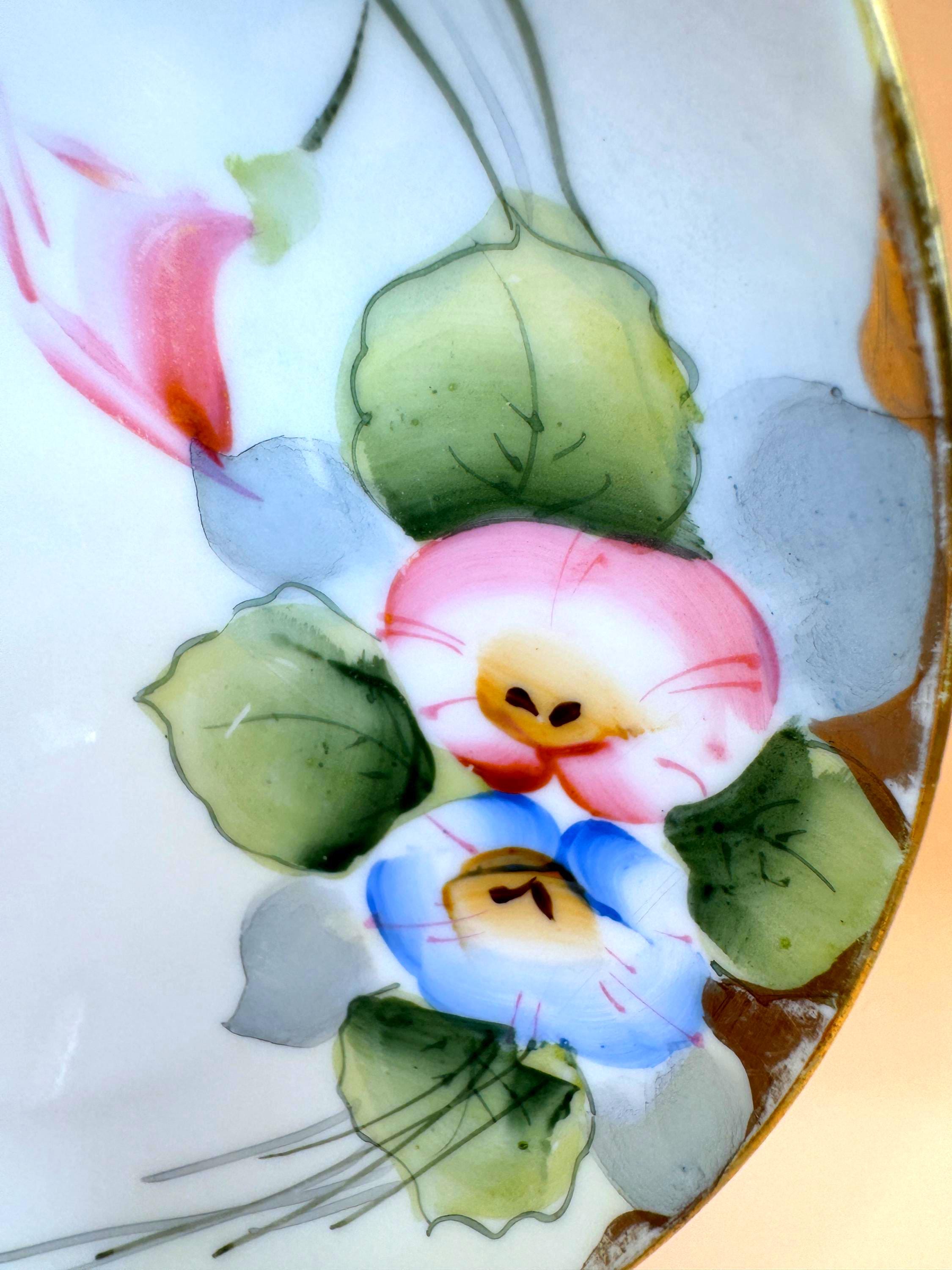 Delicate antique porcelain plate from the Nippon era, circa 1900–1921, featuring a beautifully hand-painted floral design in soft pastel tones with green foliage. The painting shows fine brushwork and gentle shading, characteristic of early 20th-century Nippon studio-decorated porcelain.