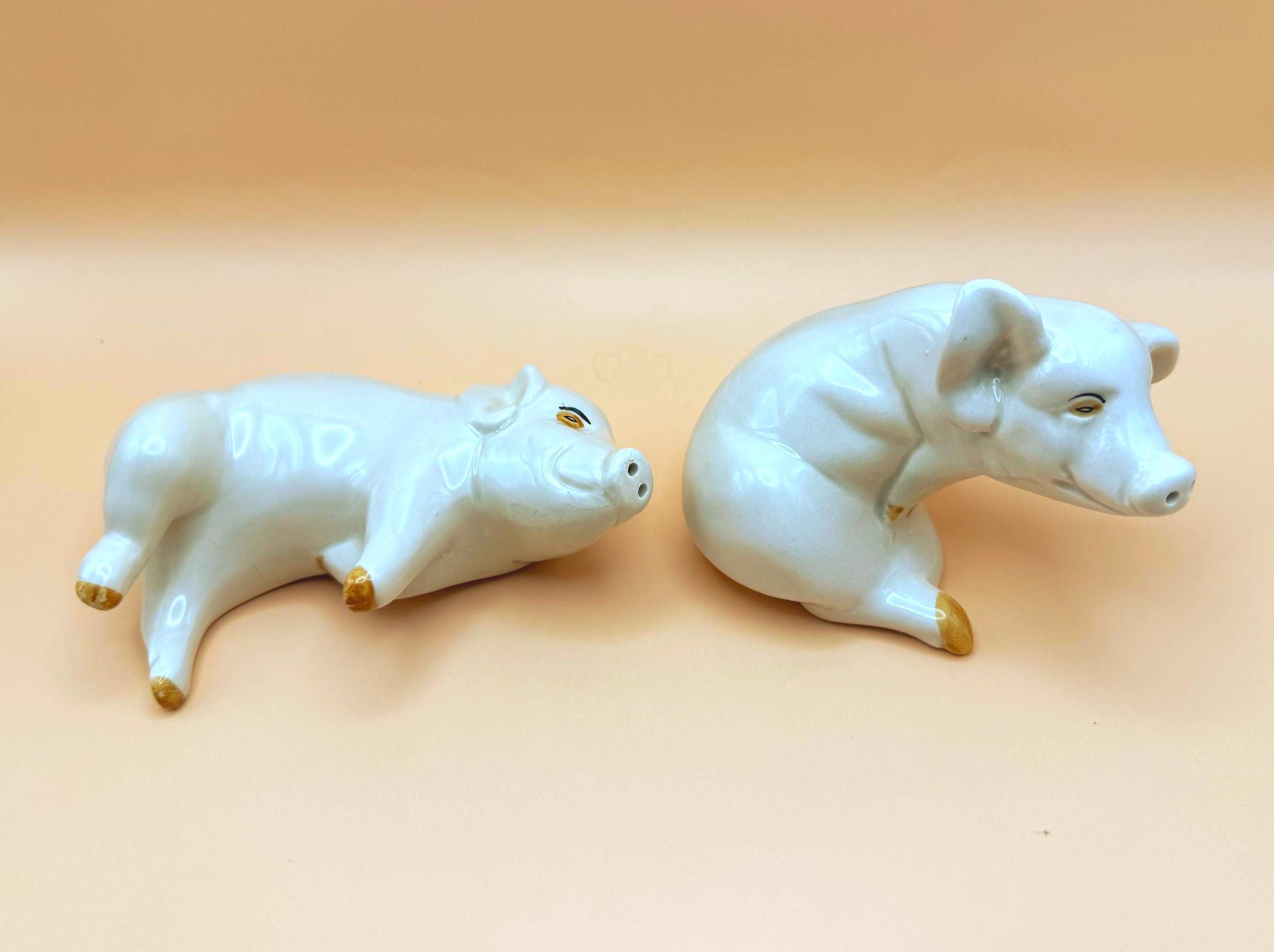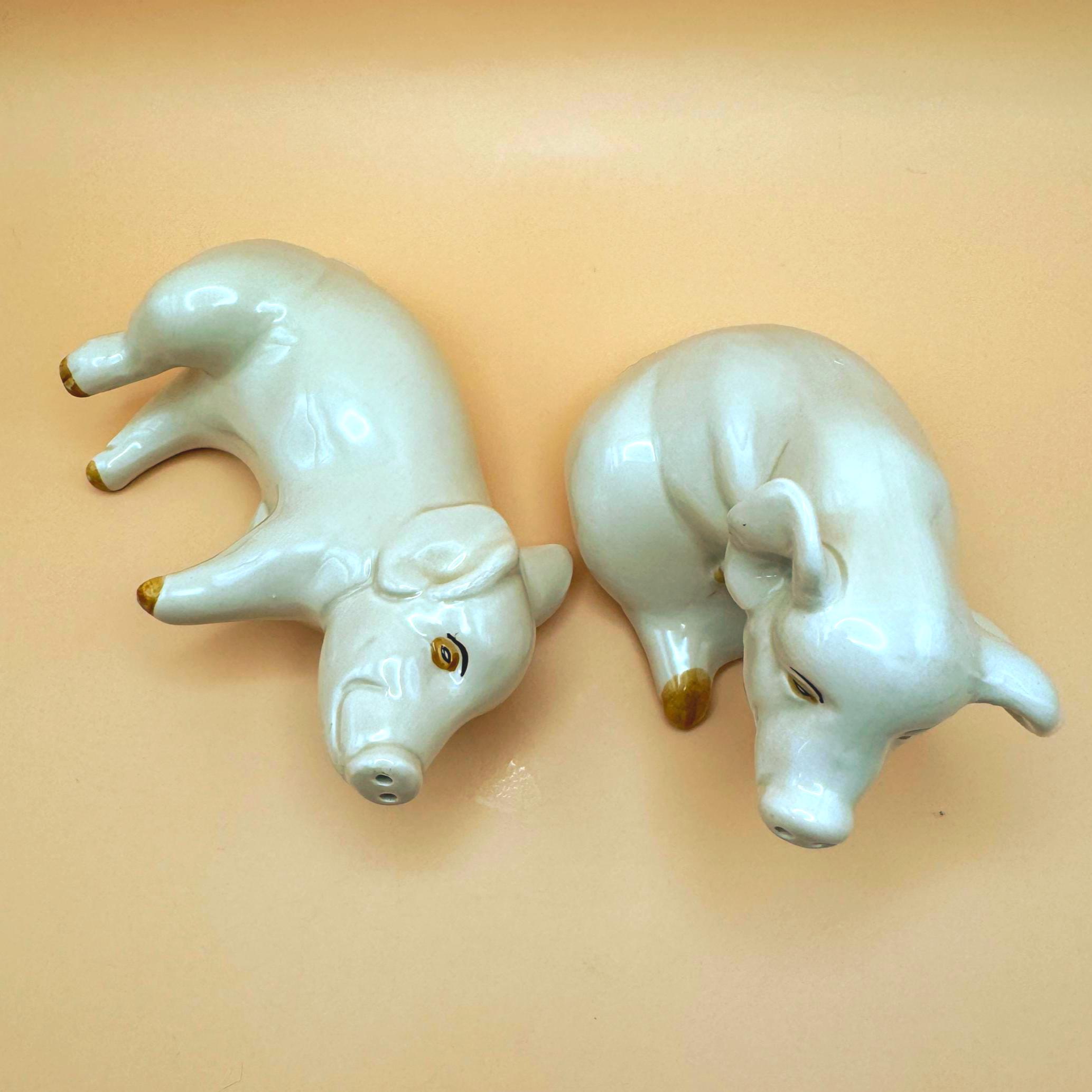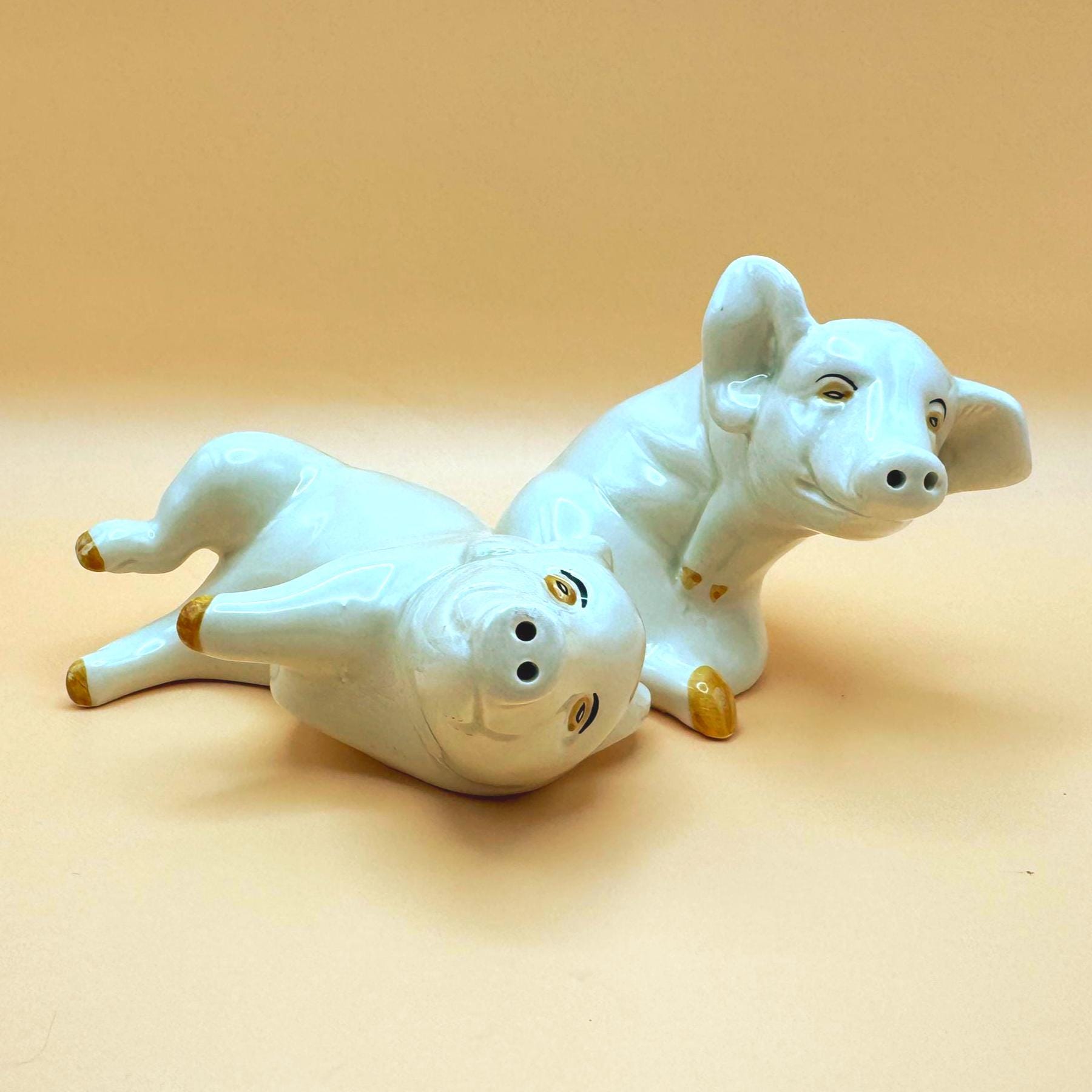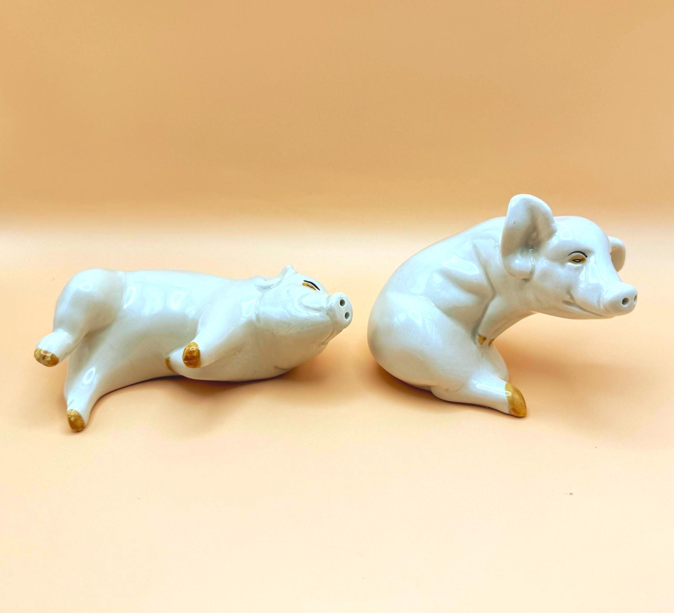 Charming vintage pig salt and pepper shaker set by Fitz and Floyd, dated 1976 and made in Japan. This delightful duo features two pigs in sweet, playful poses — one sitting upright and one lying down — with soft white glaze, hand-painted facial details, and subtle golden accents on the hooves.