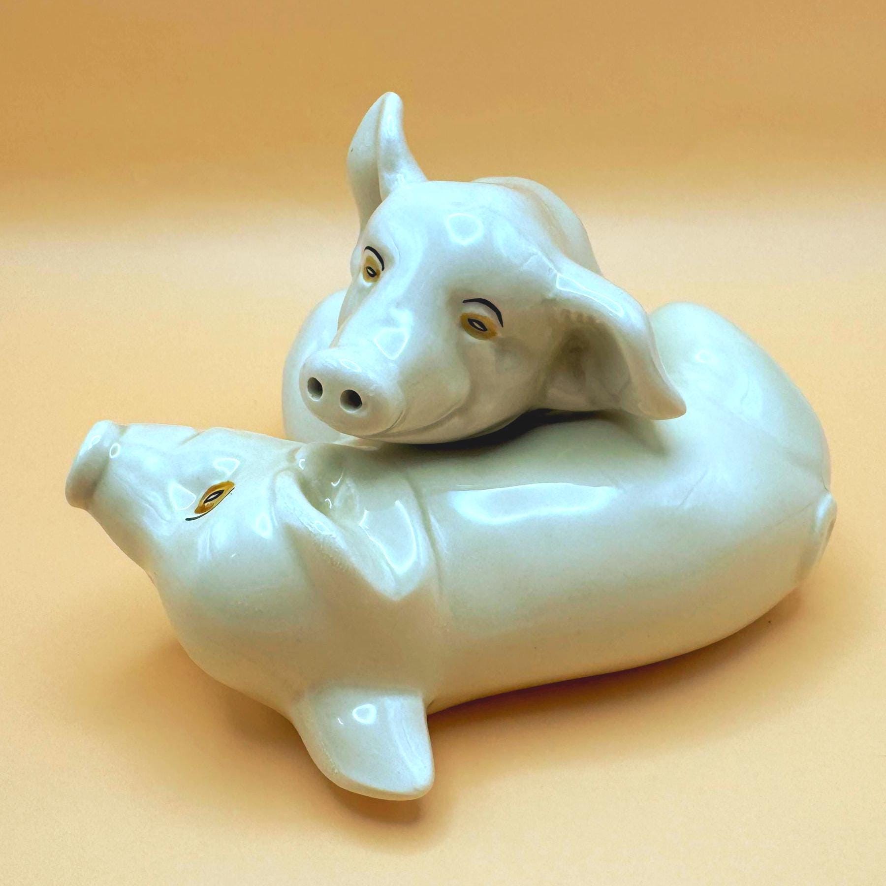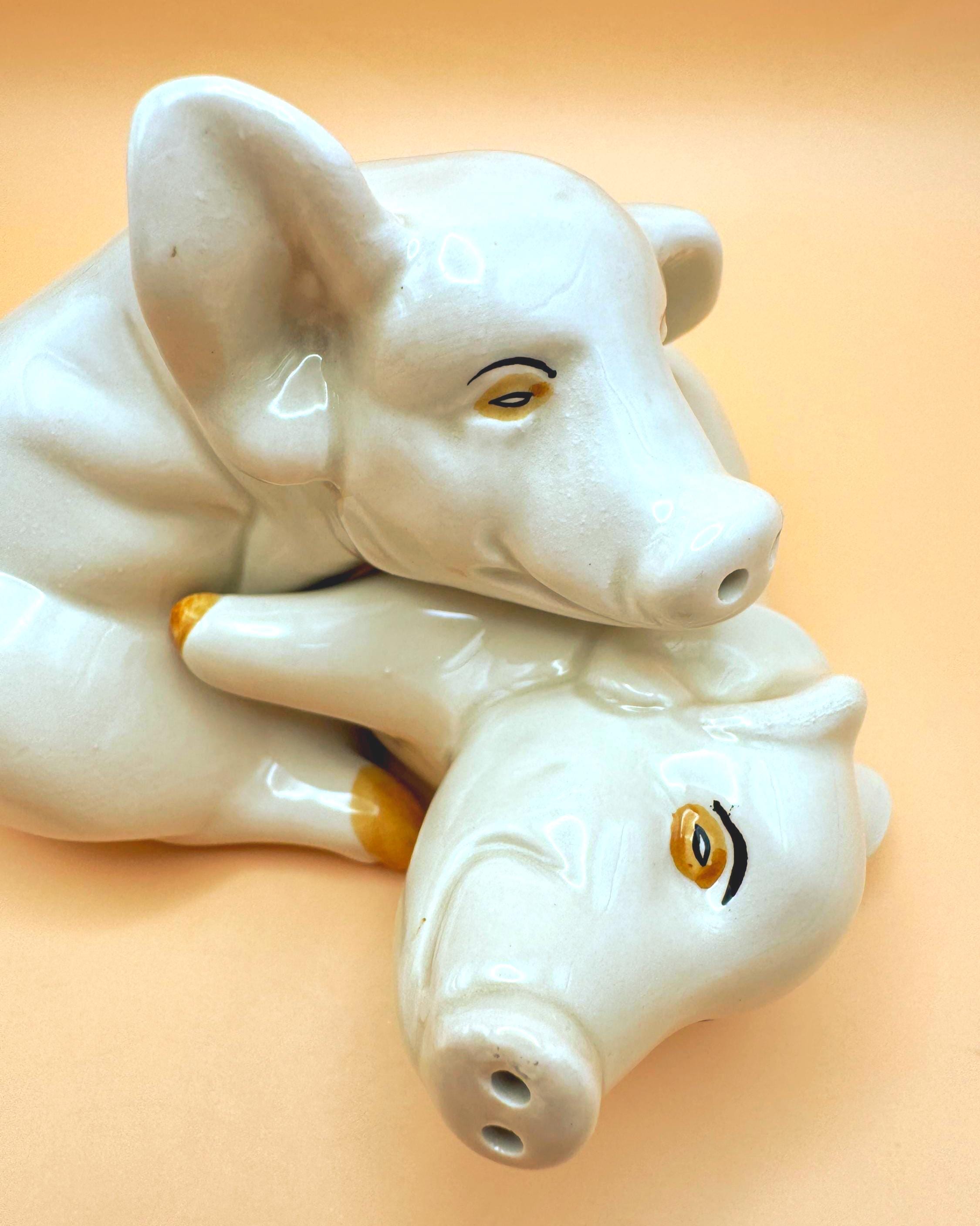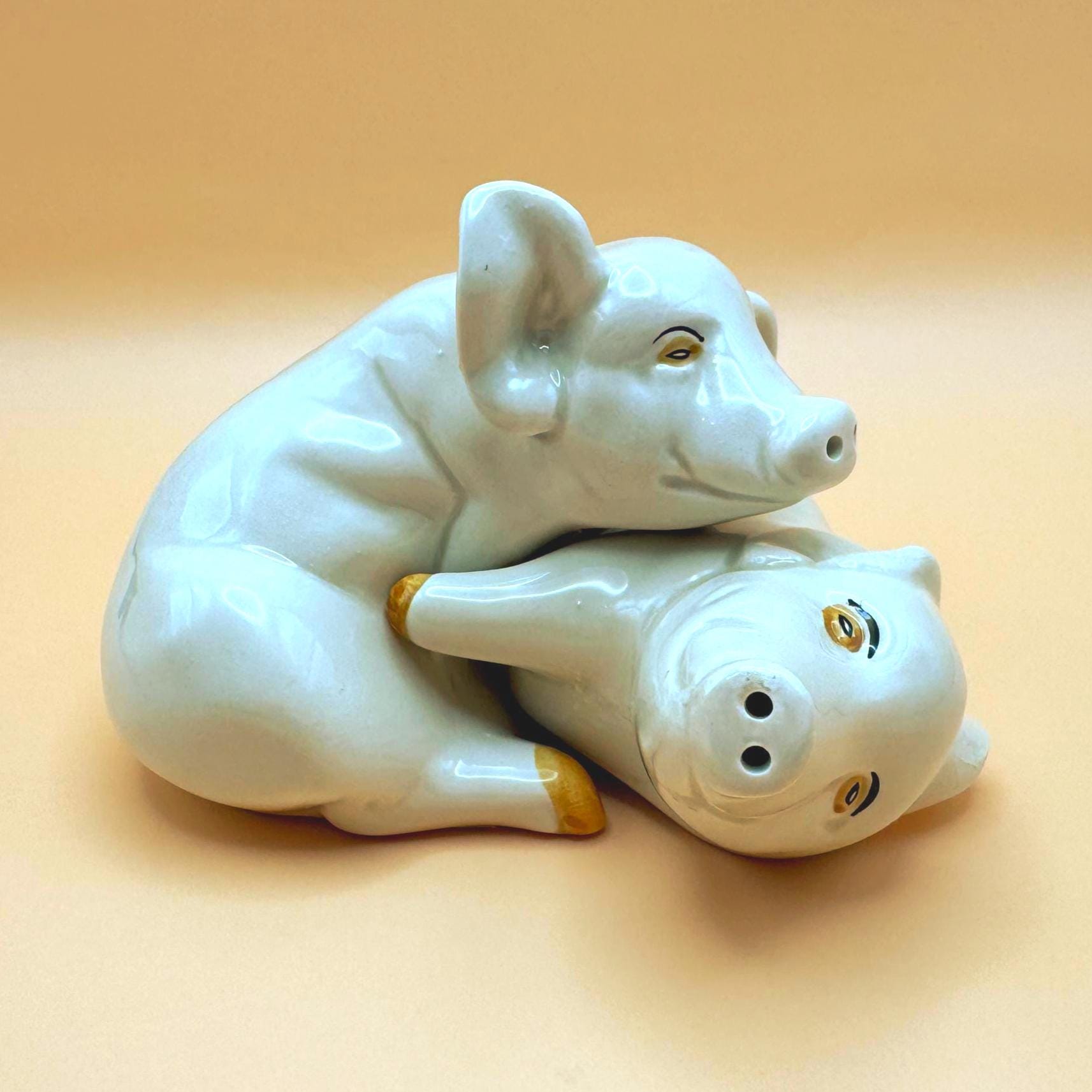 Charming vintage pig salt and pepper shaker set by Fitz and Floyd, dated 1976 and made in Japan. This delightful duo features two pigs in sweet, playful poses — one sitting upright and one lying down — with soft white glaze, hand-painted facial details, and subtle golden accents on the hooves.