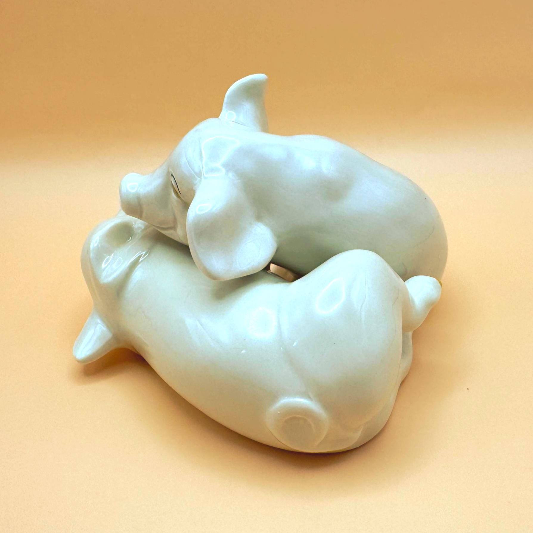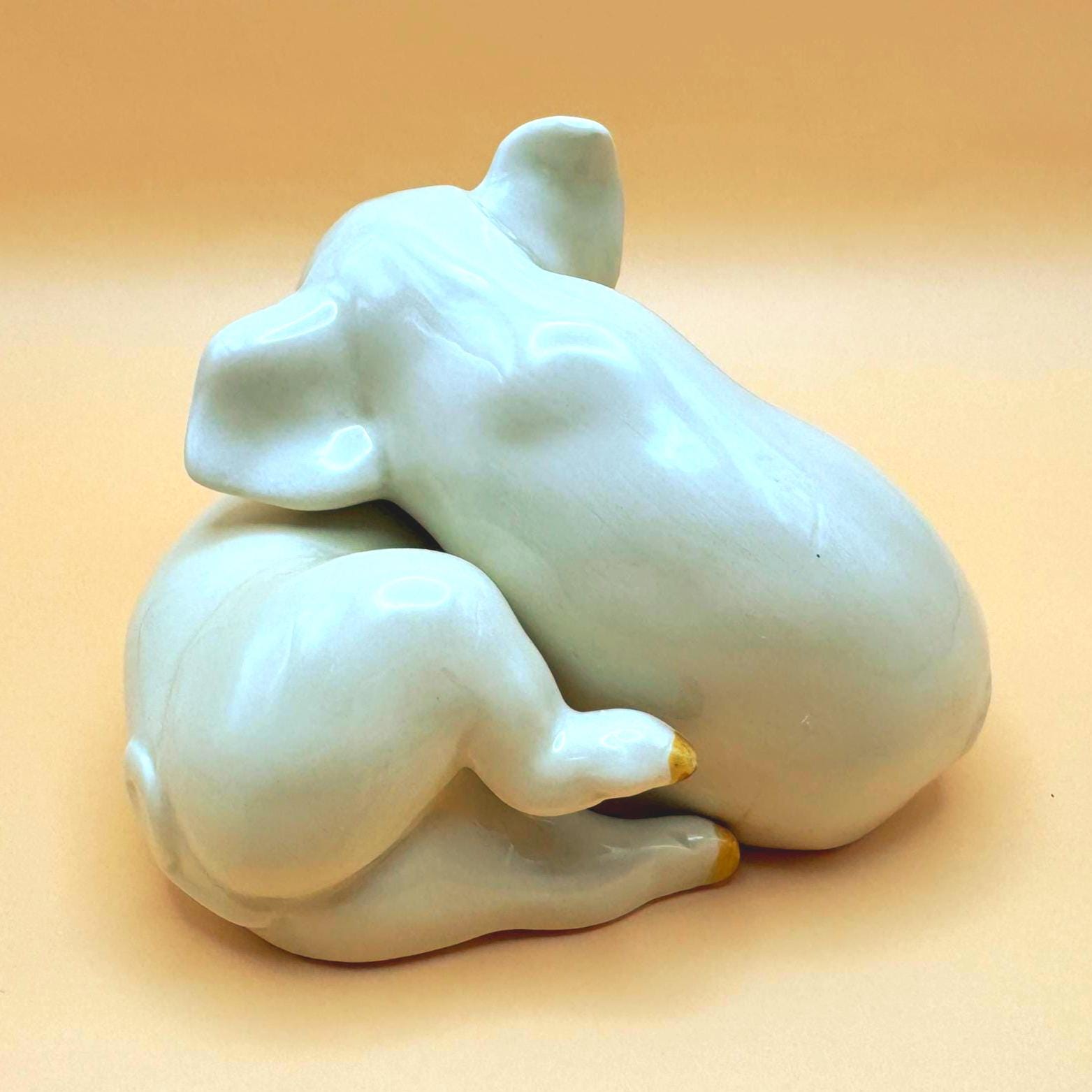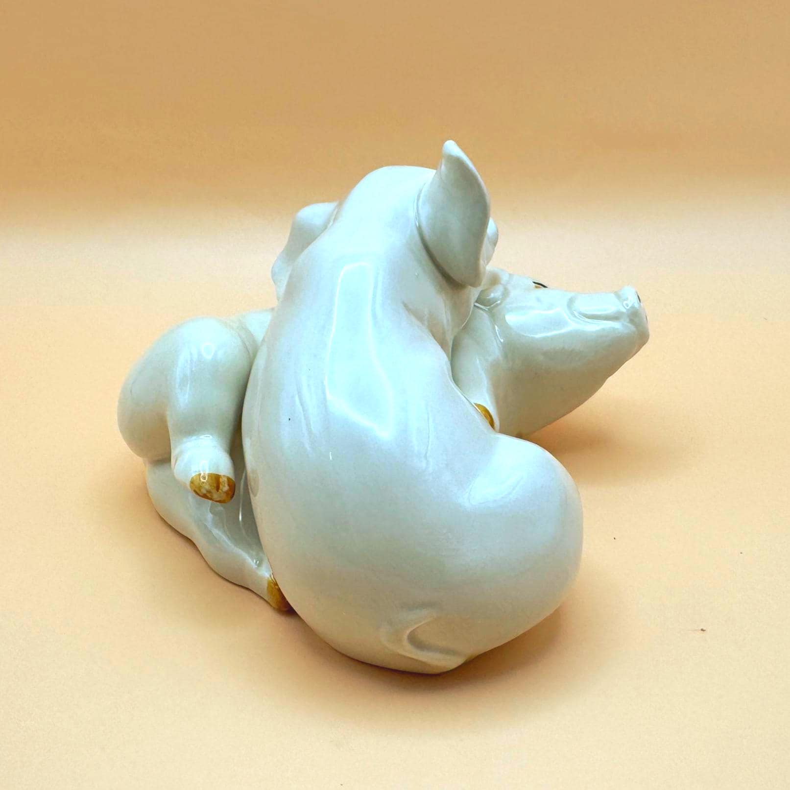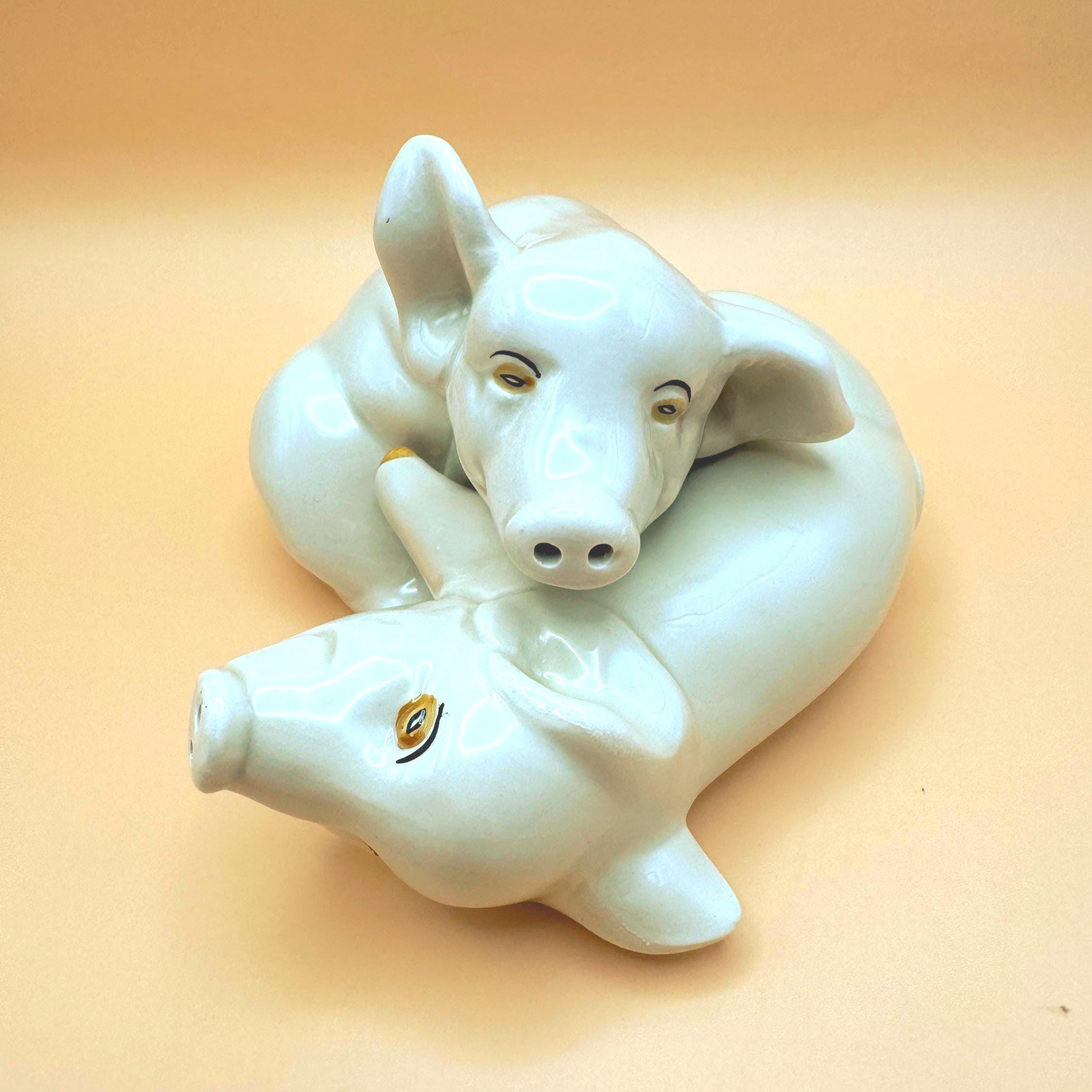 Charming vintage pig salt and pepper shaker set by Fitz and Floyd, dated 1976 and made in Japan. This delightful duo features two pigs in sweet, playful poses — one sitting upright and one lying down — with soft white glaze, hand-painted facial details, and subtle golden accents on the hooves.