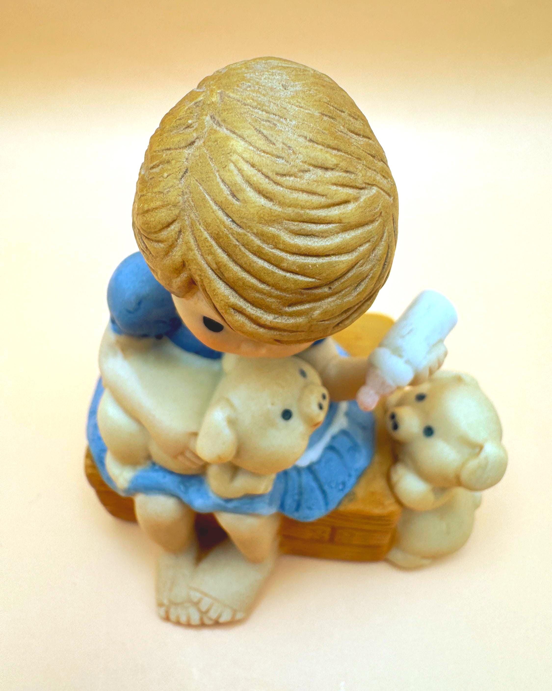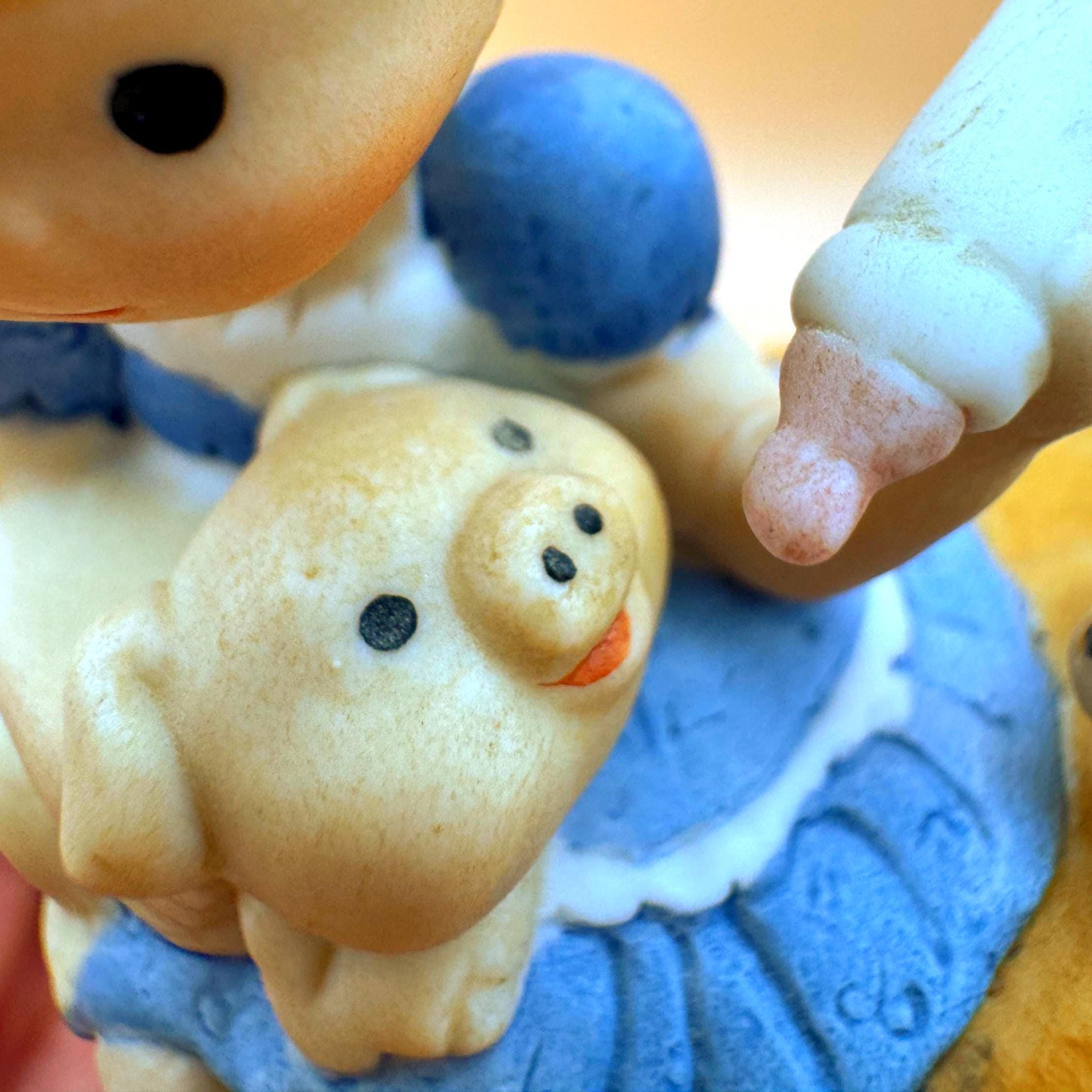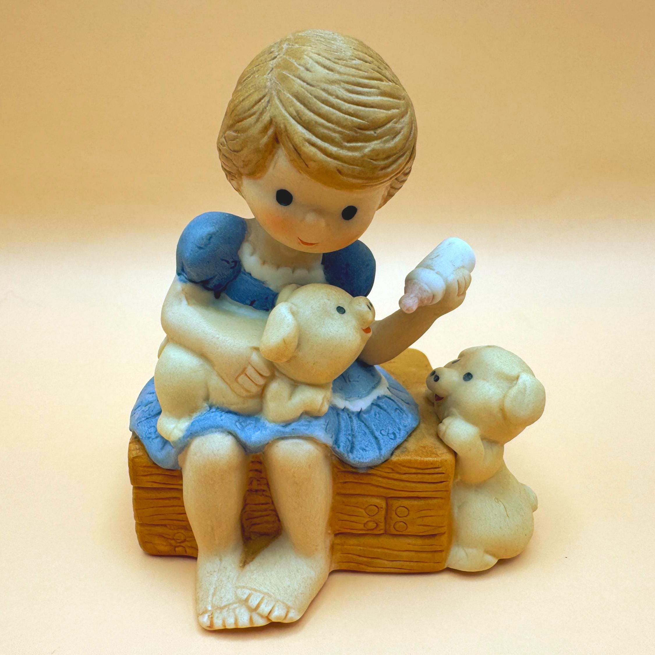 Sweet vintage figurine by Enesco, dated 1983, featuring a young girl seated on a wooden bench bottle-feeding a piglet while another piglet eagerly waits nearby. The soft pastel colors, gentle expressions, and farm-inspired scene capture the cozy, sentimental charm Enesco is known for.