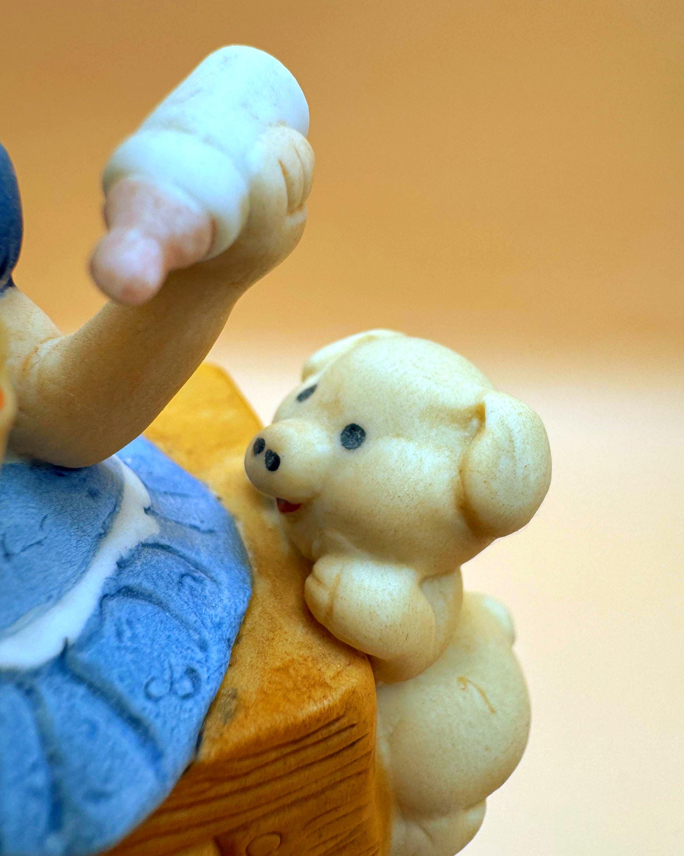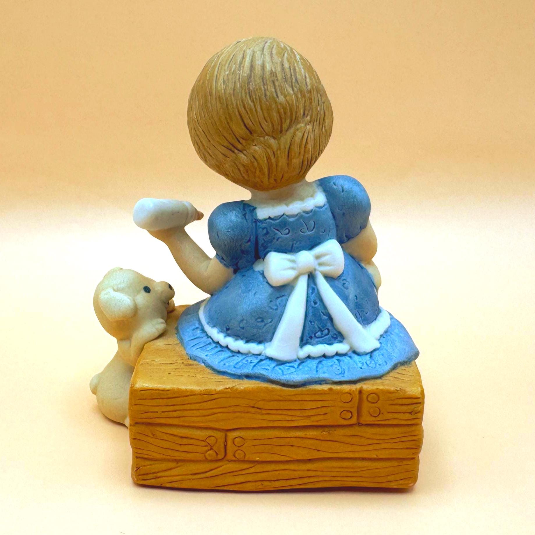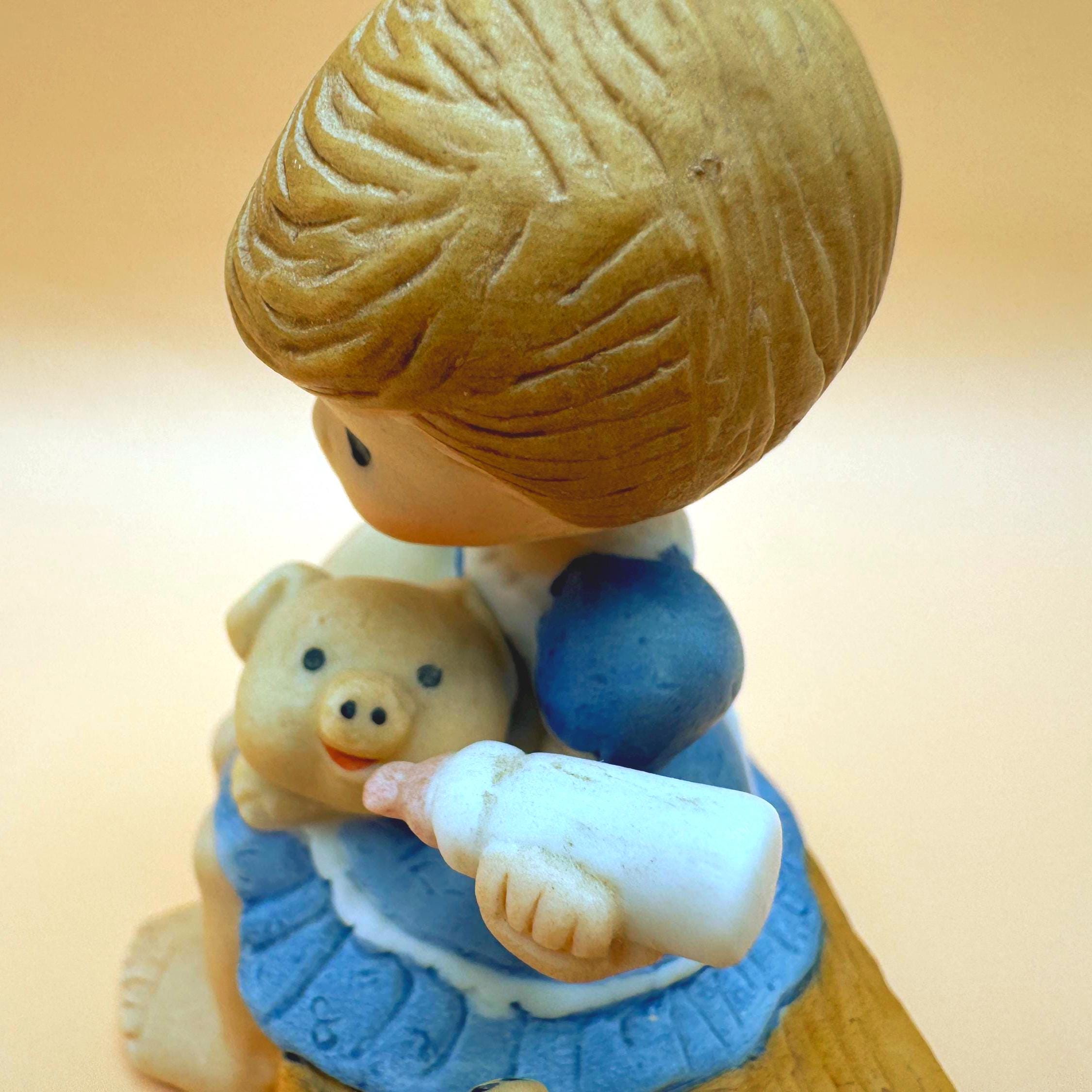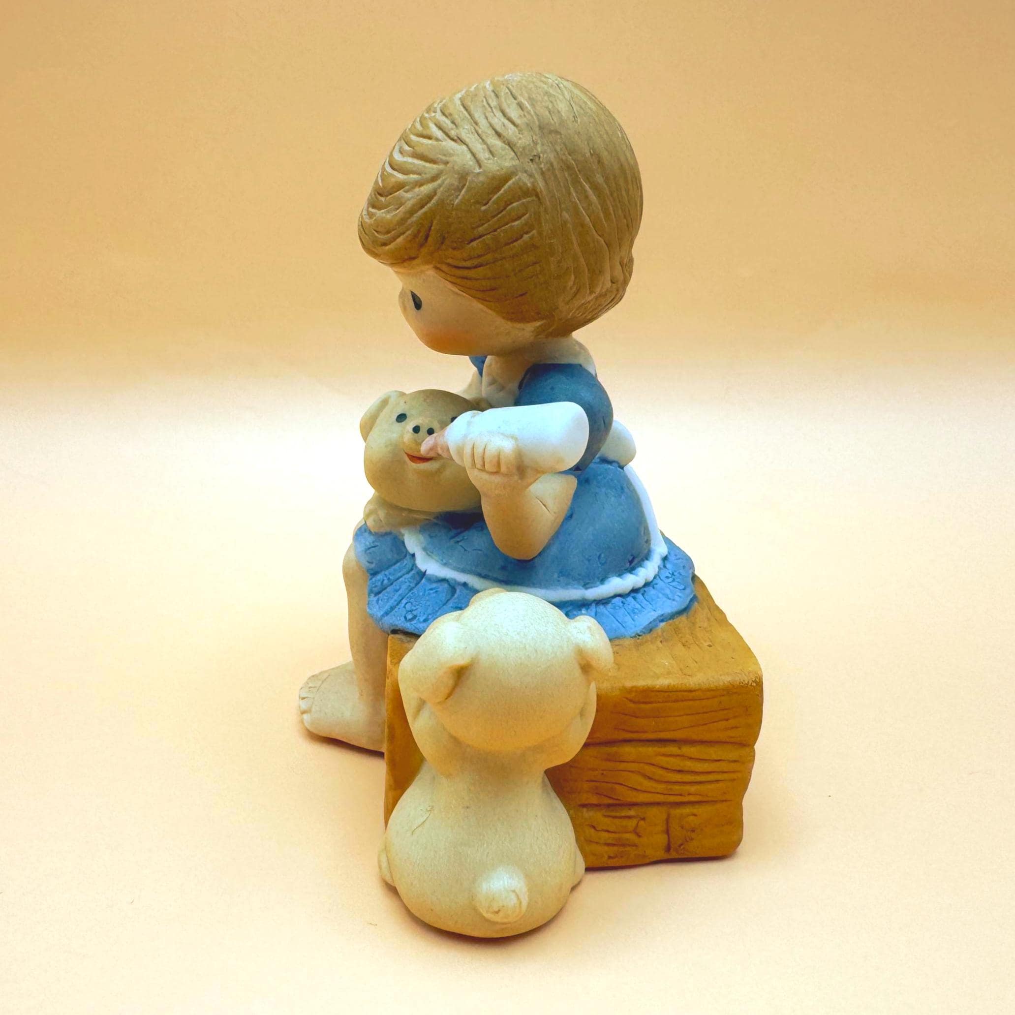 Sweet vintage figurine by Enesco, dated 1983, featuring a young girl seated on a wooden bench bottle-feeding a piglet while another piglet eagerly waits nearby. The soft pastel colors, gentle expressions, and farm-inspired scene capture the cozy, sentimental charm Enesco is known for.