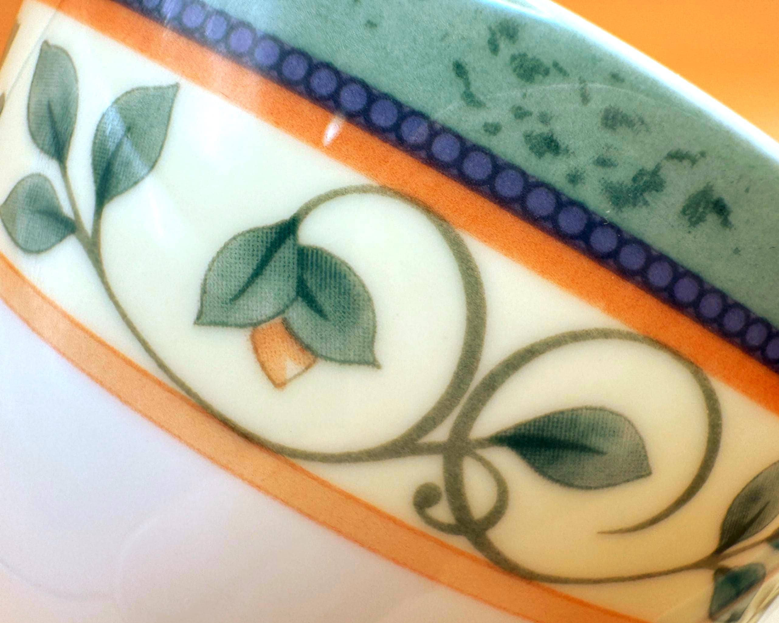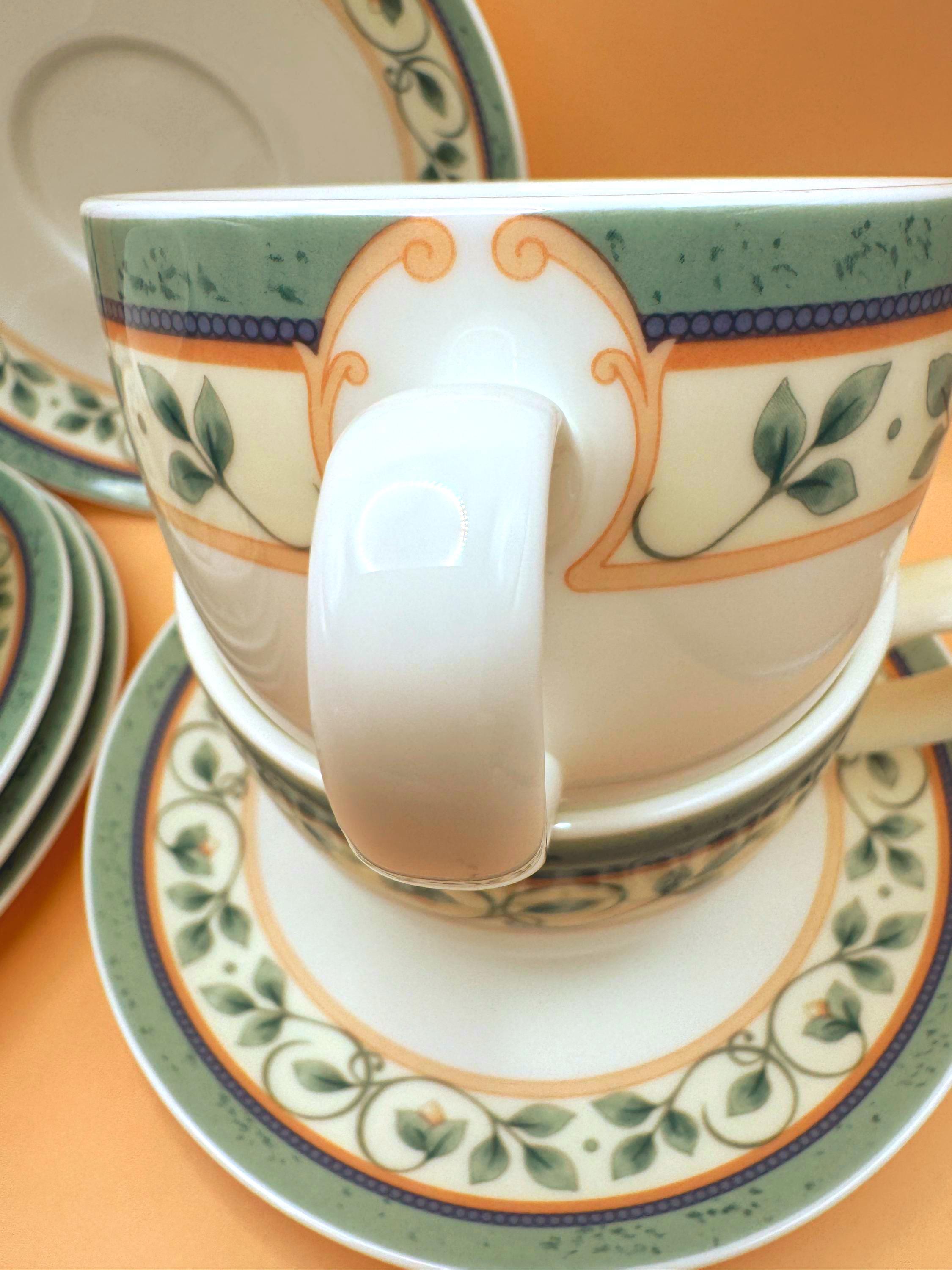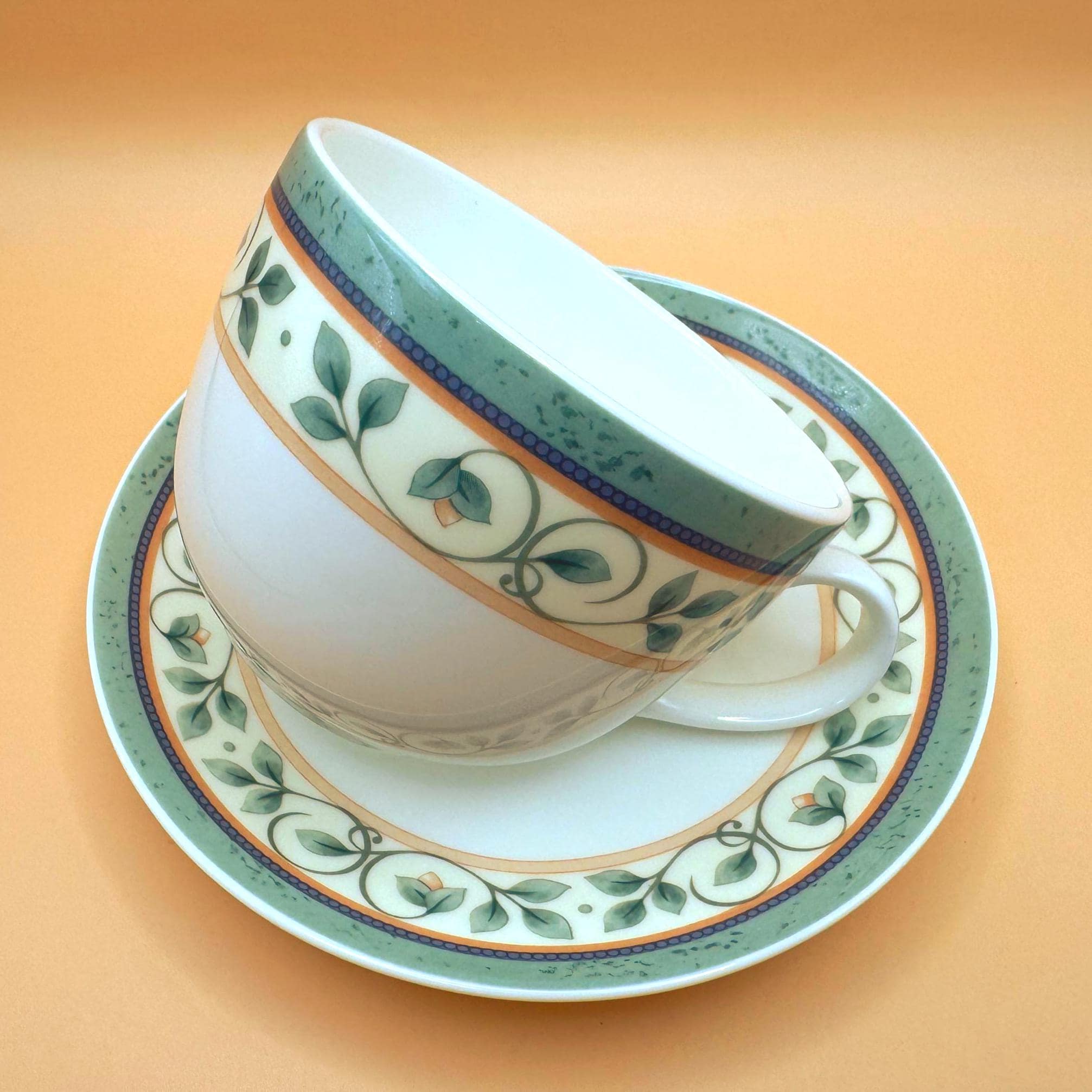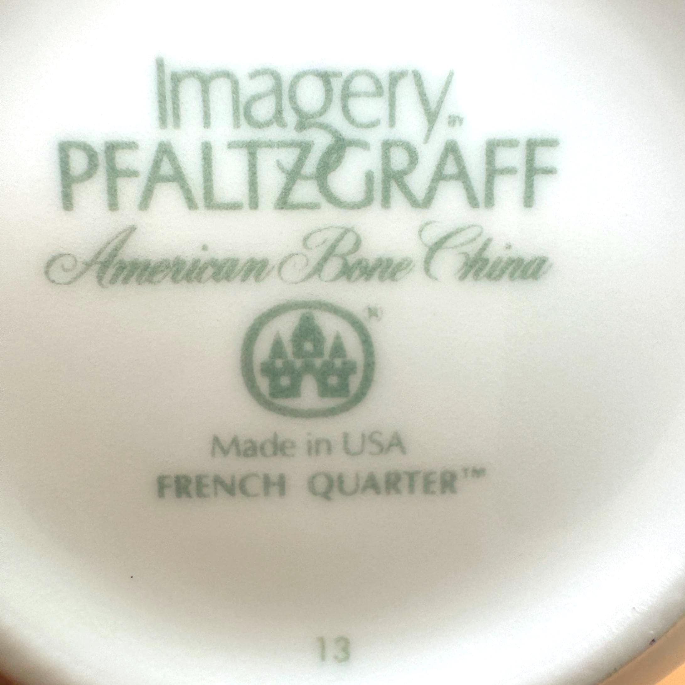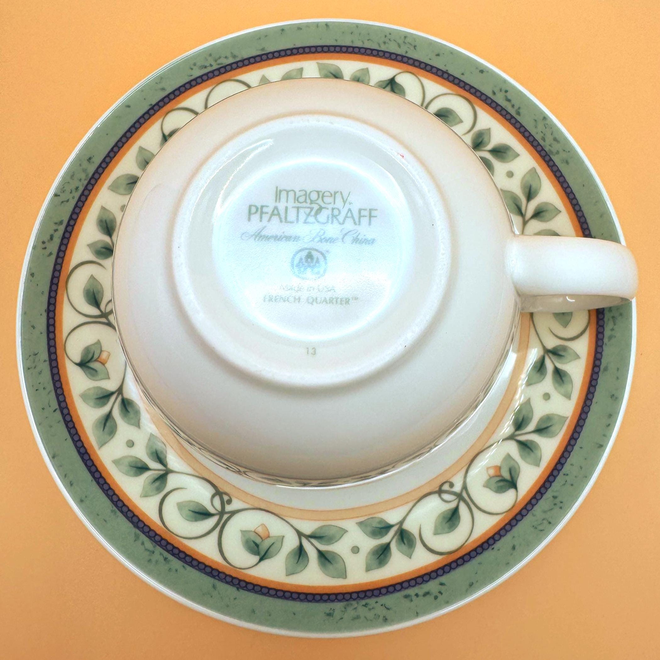 Classic and timeless, this Pfaltzgraff “French Quarter” pattern features soft green scrollwork with subtle blue and tan accents on crisp white American Bone China. A versatile set that works beautifully for tea service, dessert, or everyday elegance.
