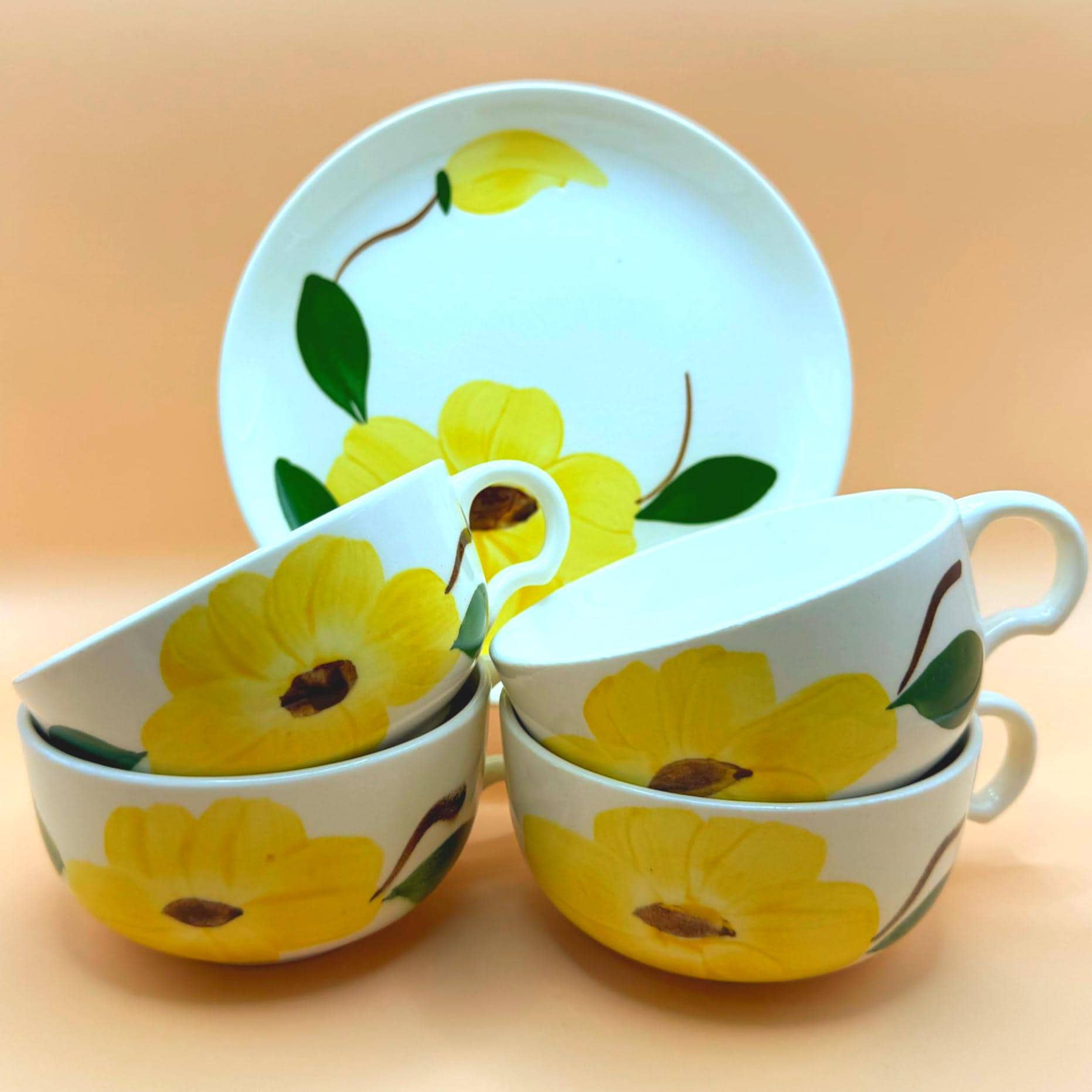 🌼Condition: Good vintage condition overall with gentle wear from use. There's crazing consistent with age and minor pottery/glaze irregularities, typical of hand-finished pieces from this era. One teacup has a small rim chip near the handle. No other chips or cracks noted. Colors remain bright and the set displays beautifully. (See photos for more detail)