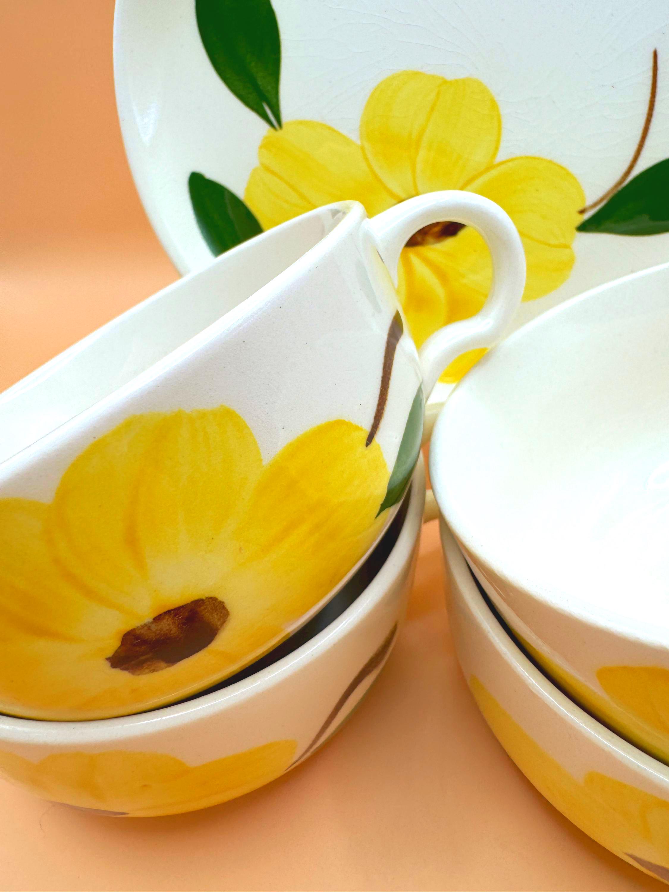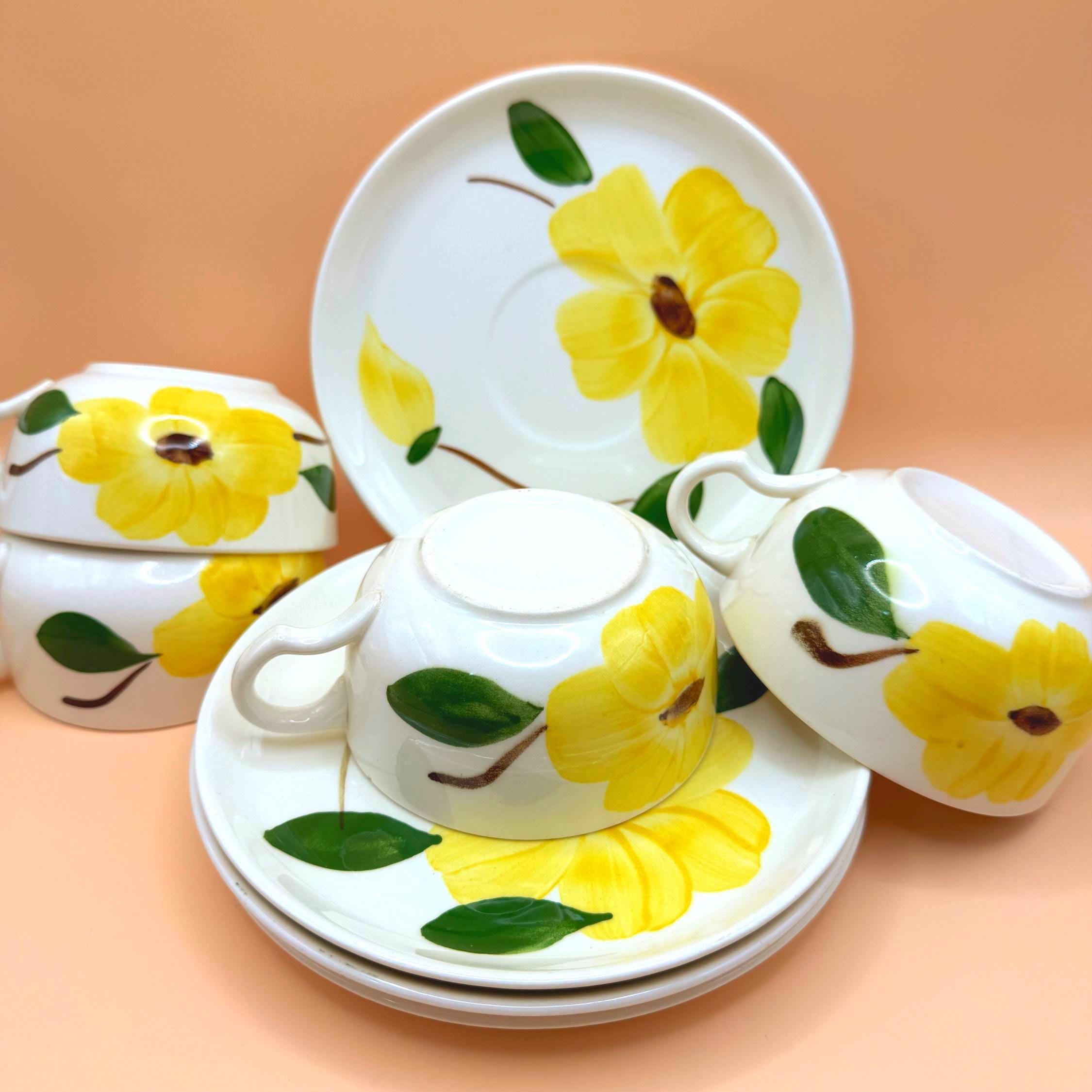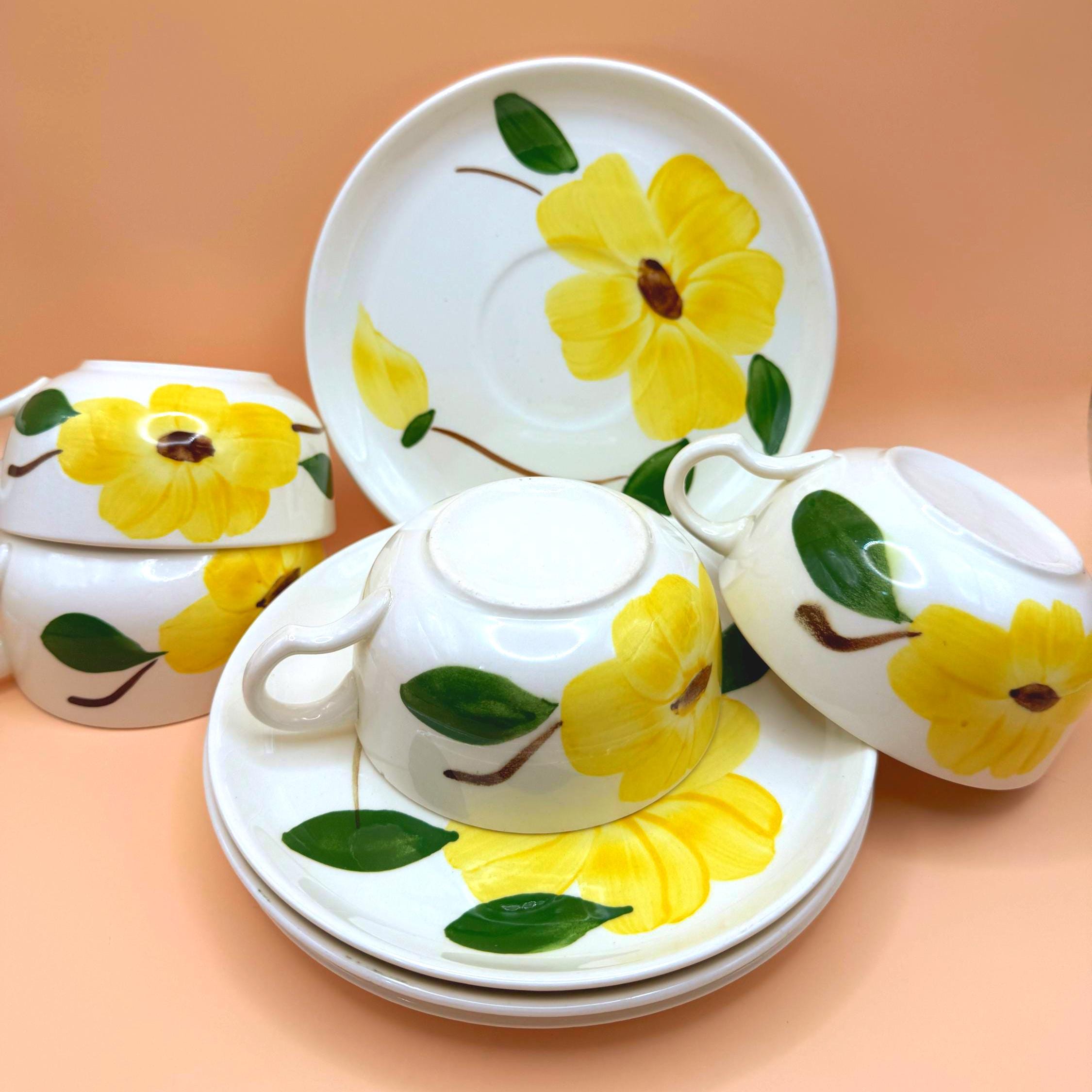 Bright, cheerful, and full of mid-century charm, this vintage pottery tea set features hand-painted yellow flowers with green leaves on a soft white glaze. The painterly floral style, visible crazing, and subtle glaze variations are characteristic of mid-20th-century hand-finished pottery, giving the set warm, authentic vintage character.
