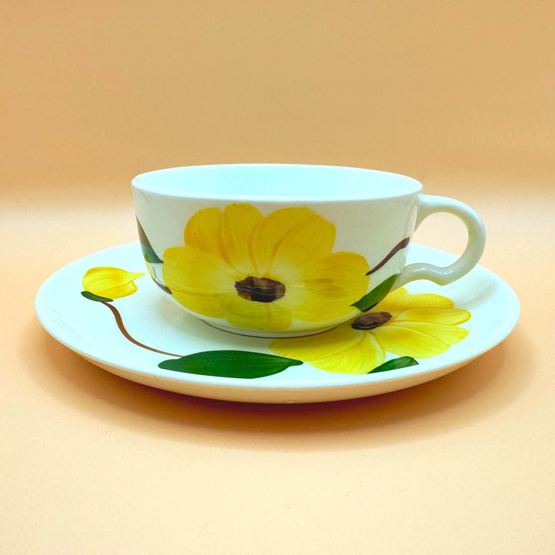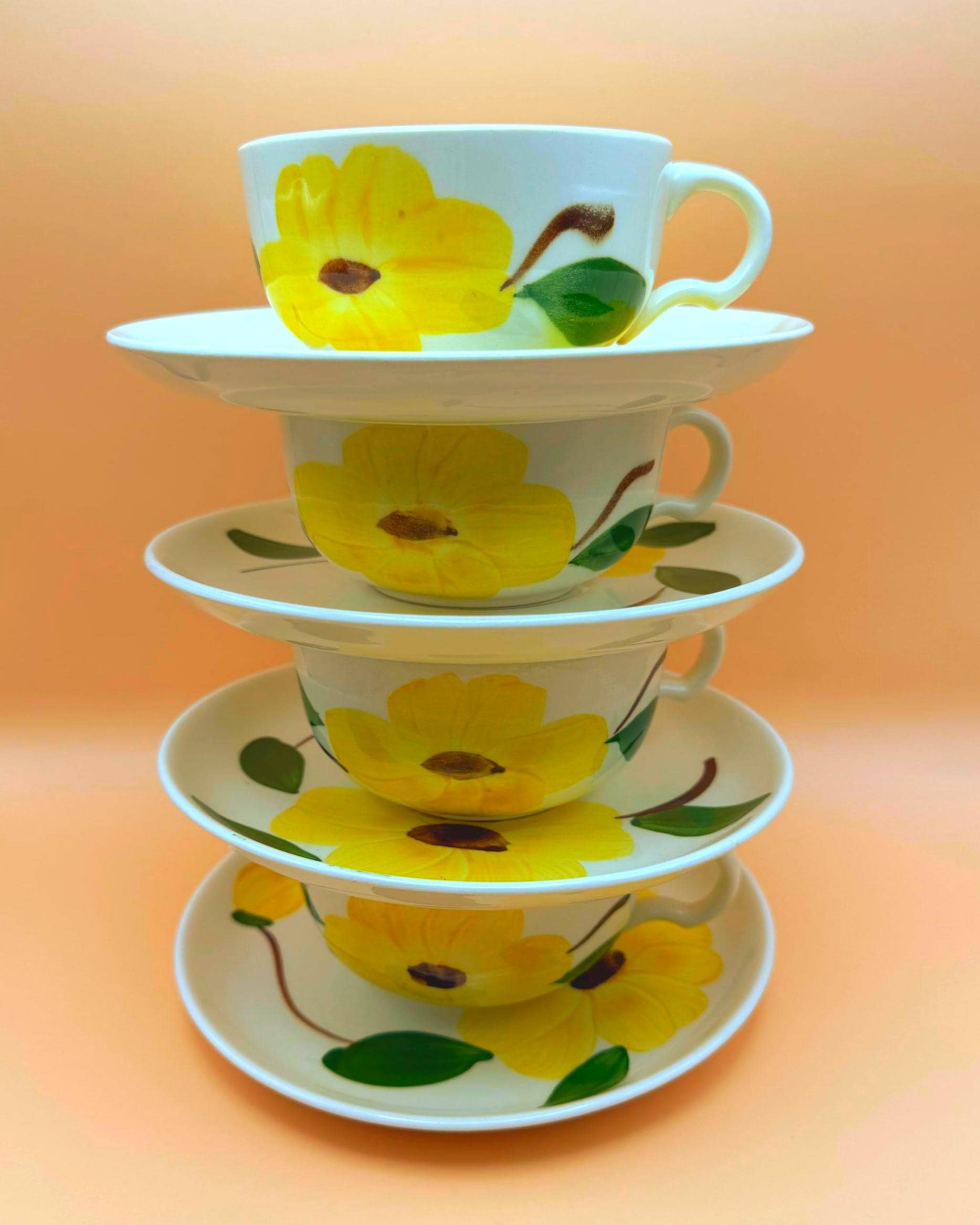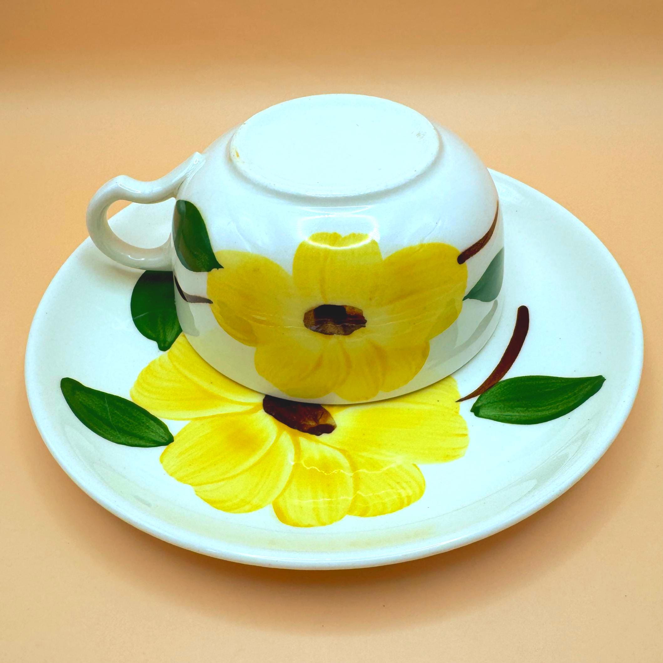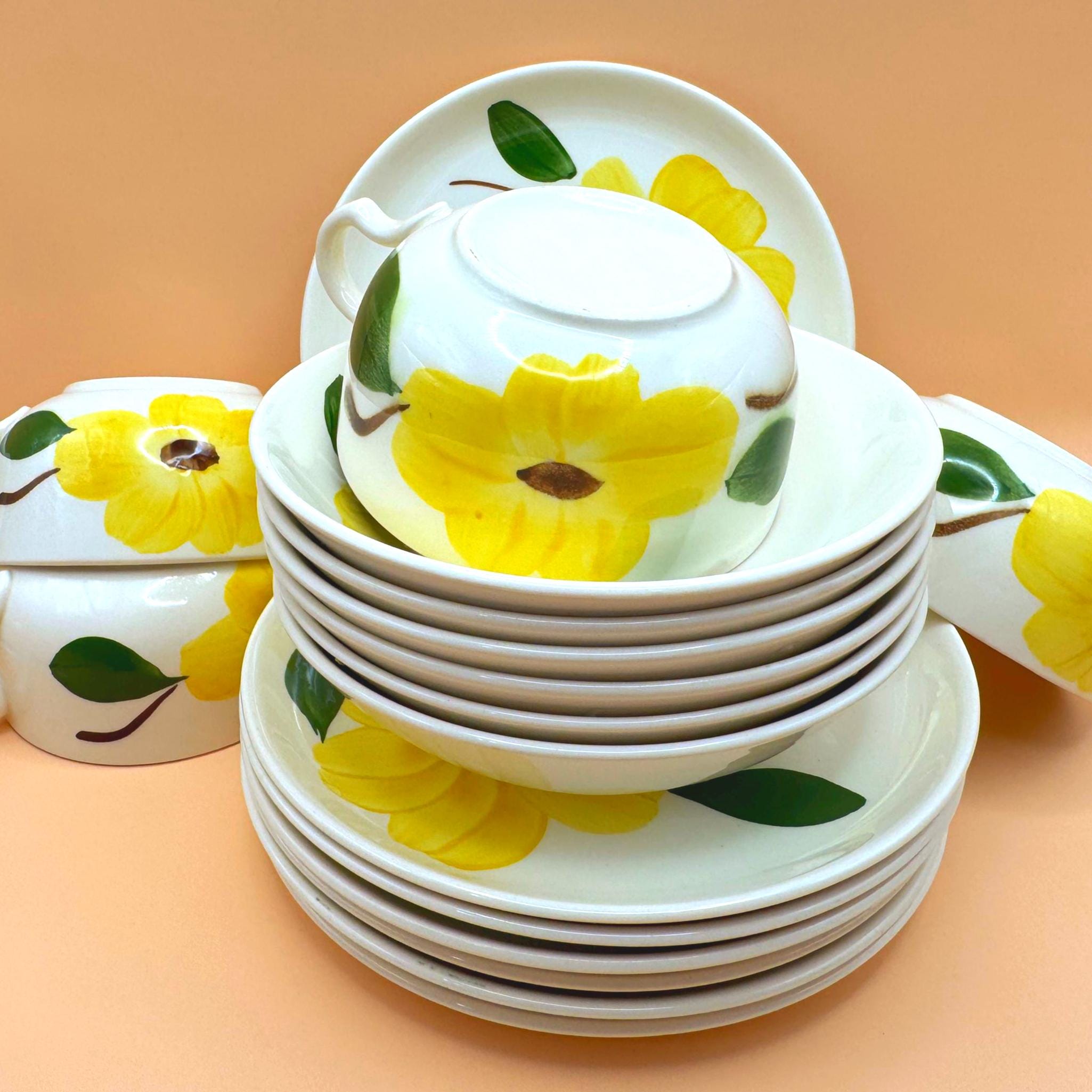 Bright, cheerful, and full of mid-century charm, this vintage pottery tea set features hand-painted yellow flowers with green leaves on a soft white glaze. The painterly floral style, visible crazing, and subtle glaze variations are characteristic of mid-20th-century hand-finished pottery, giving the set warm, authentic vintage character.