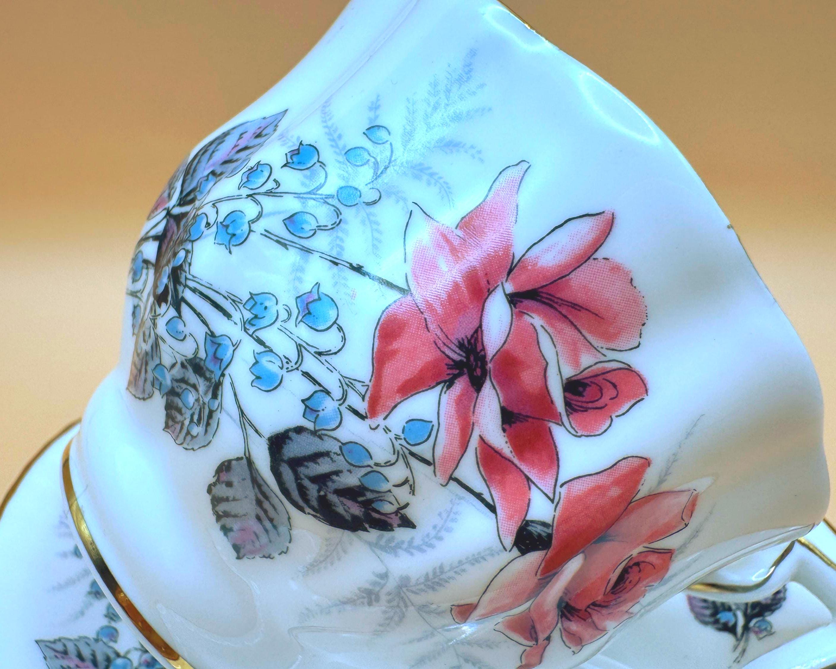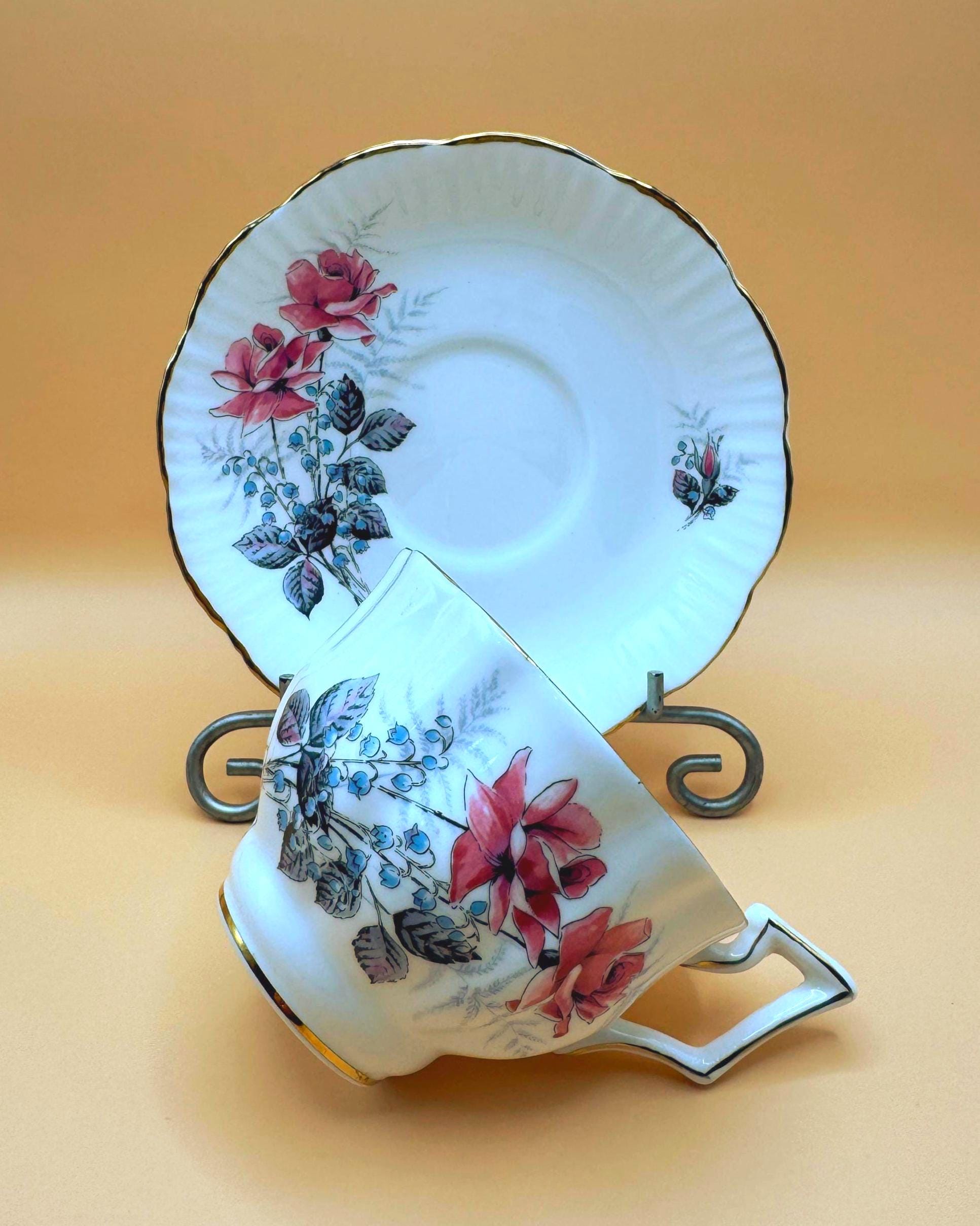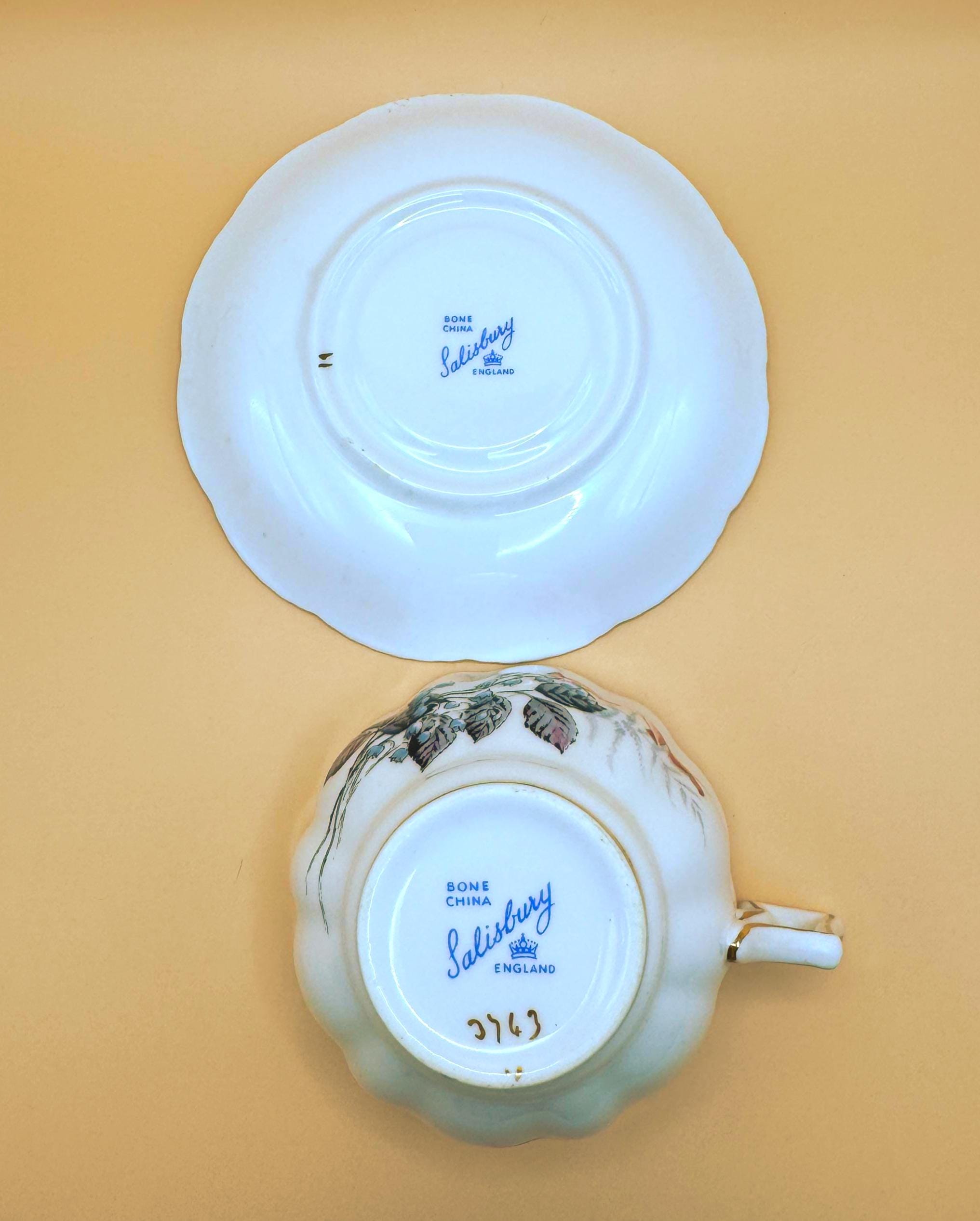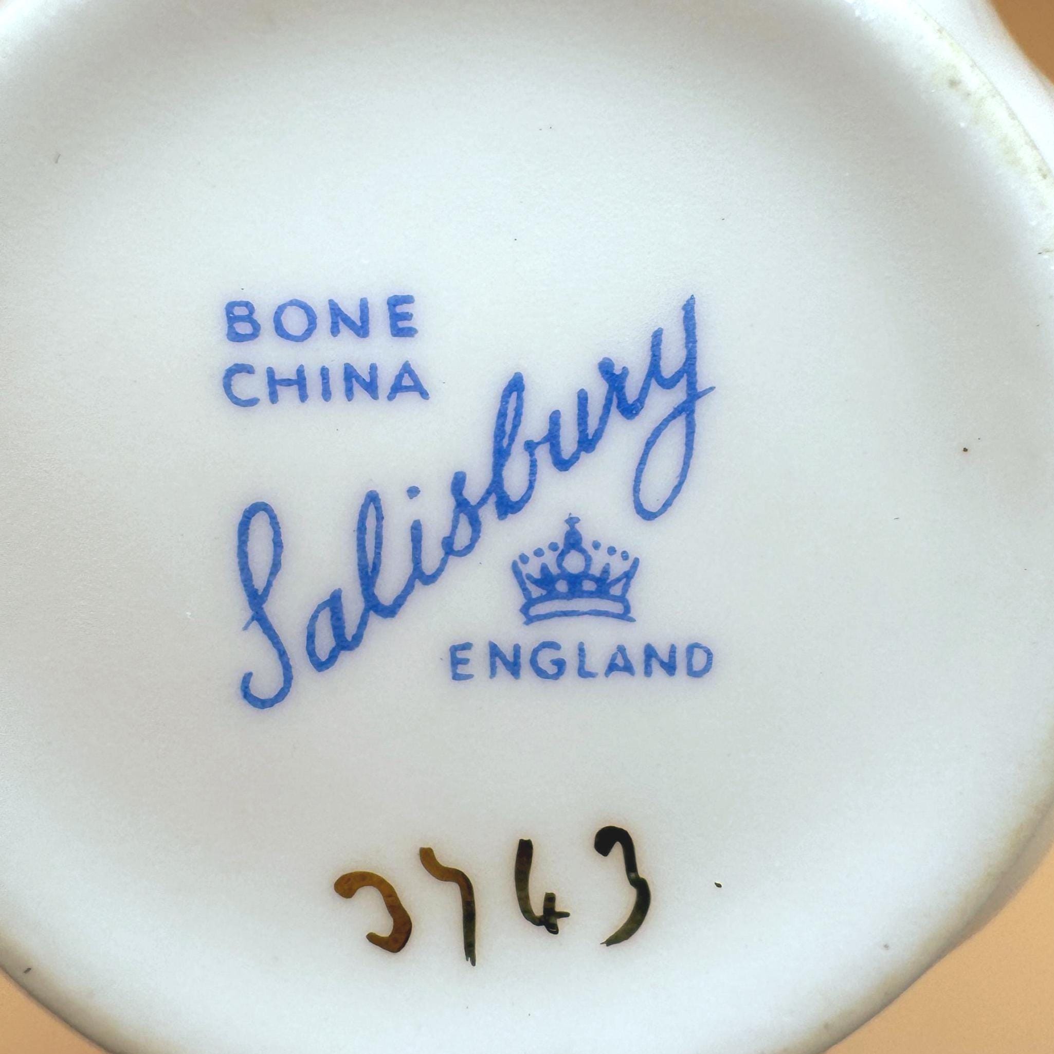 This romantic vintage teacup and saucer by Salisbury was crafted in England during the mid-20th century, circa 1950s–1960s. Made of fine bone china, it features soft pink roses paired with delicate blue bell flowers—an elegant floral design that feels timeless, gentle, and beautifully nostalgic.
