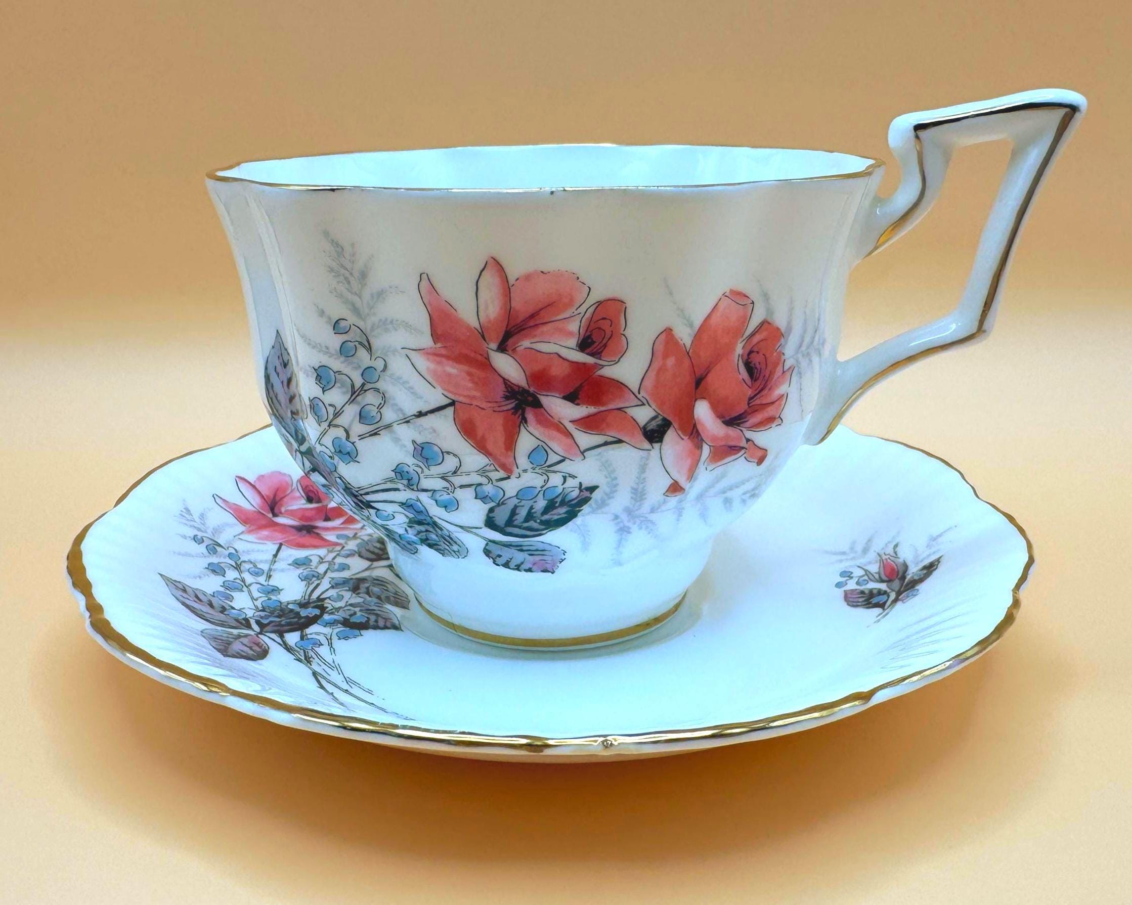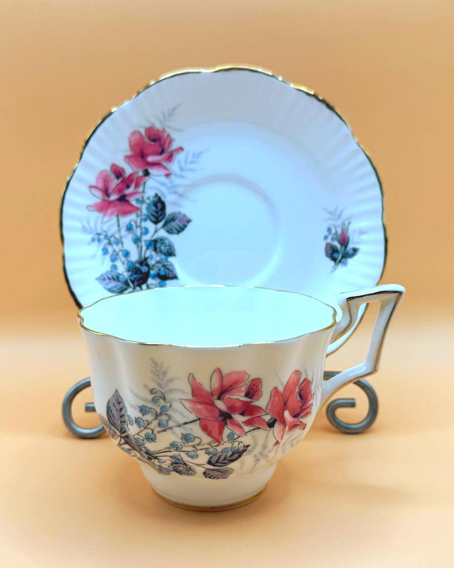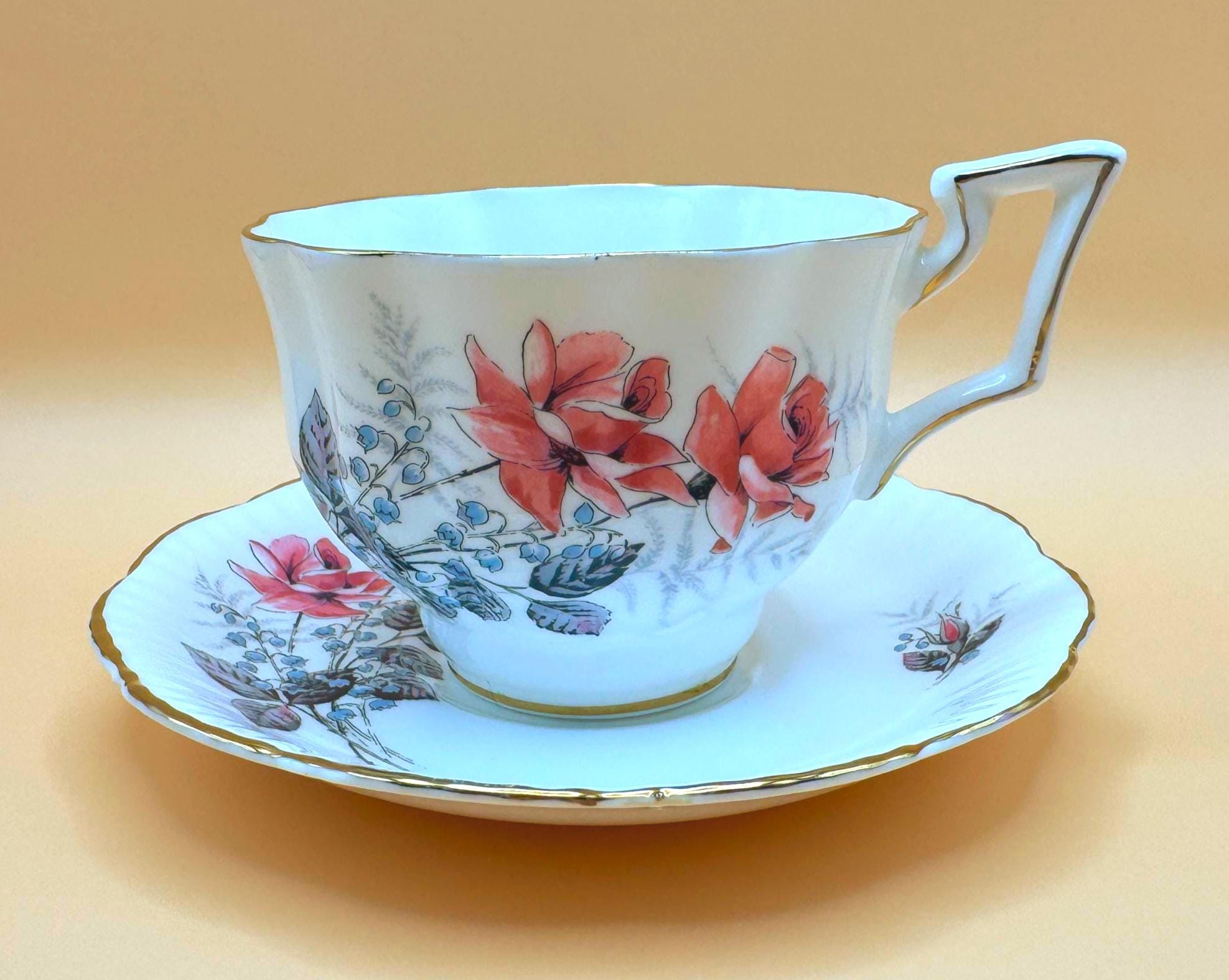 This romantic vintage teacup and saucer by Salisbury was crafted in England during the mid-20th century, circa 1950s–1960s. Made of fine bone china, it features soft pink roses paired with delicate blue bell flowers—an elegant floral design that feels timeless, gentle, and beautifully nostalgic.