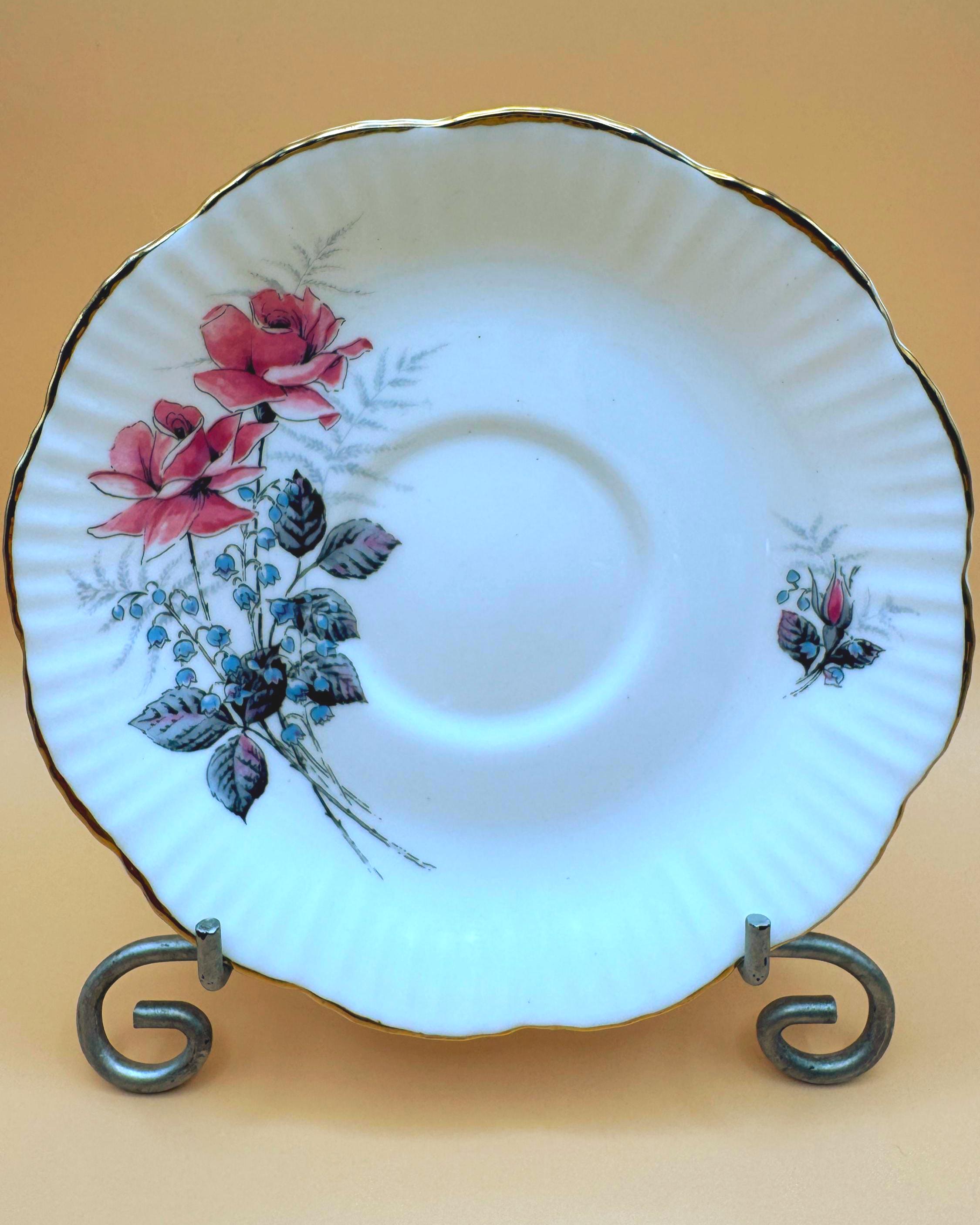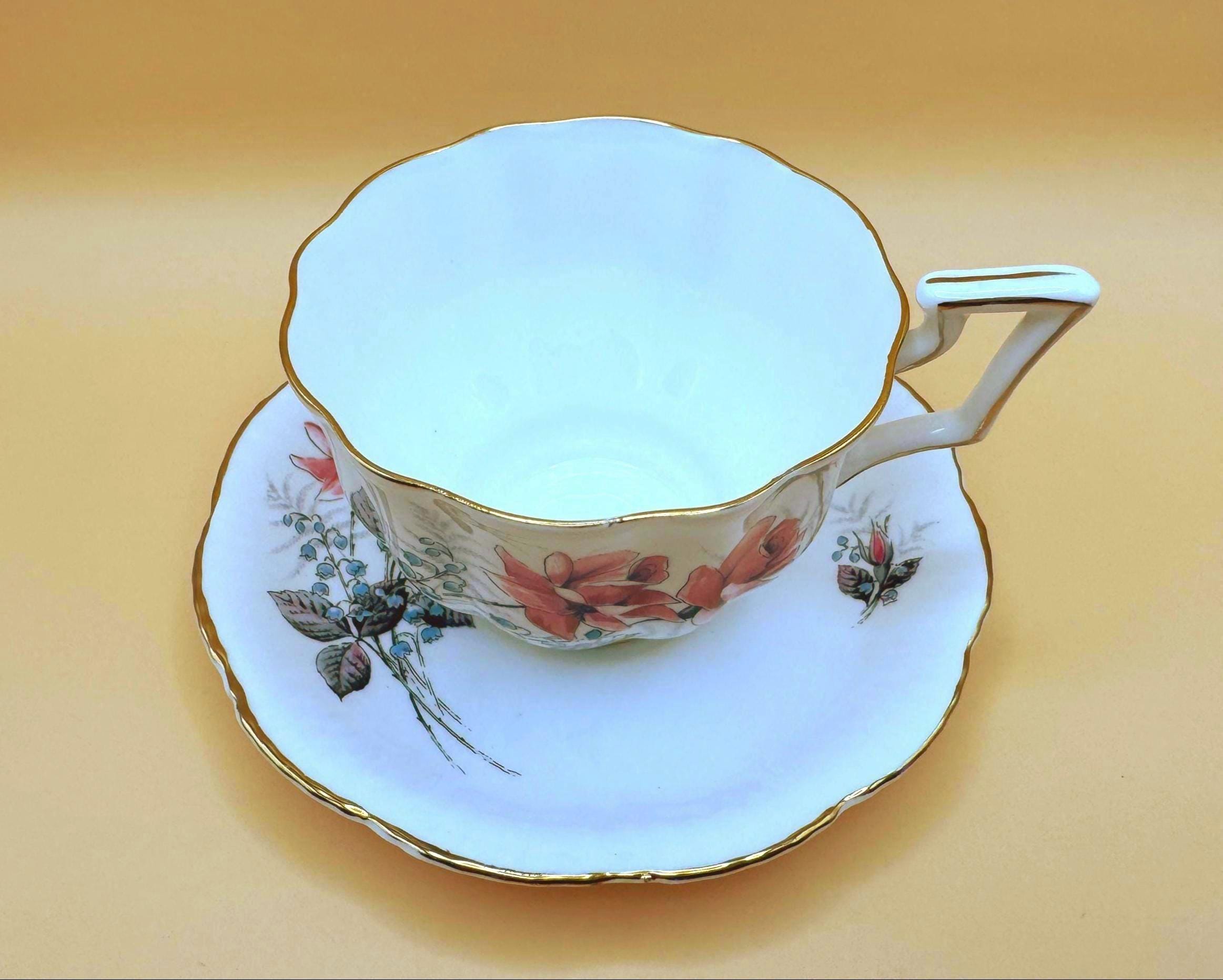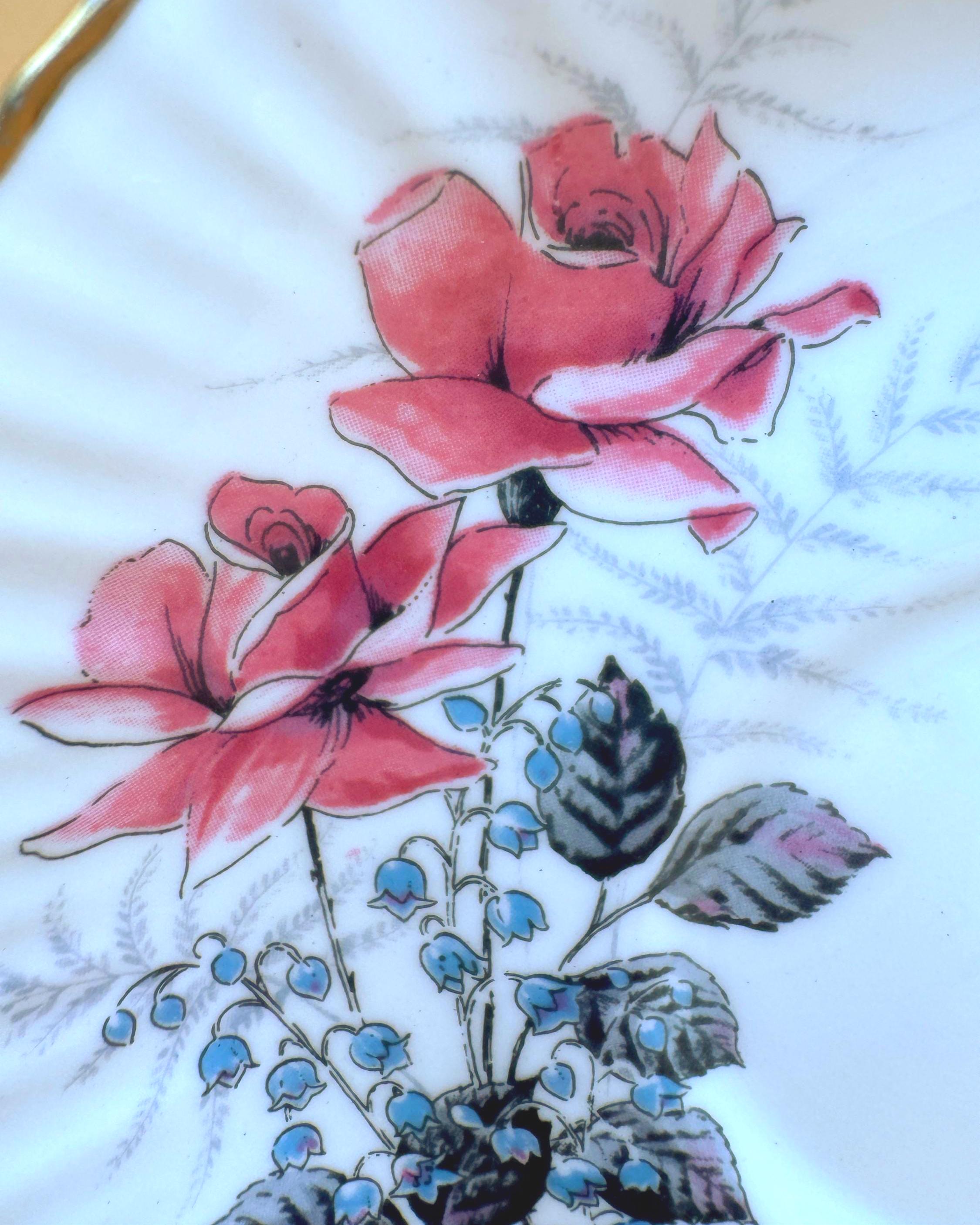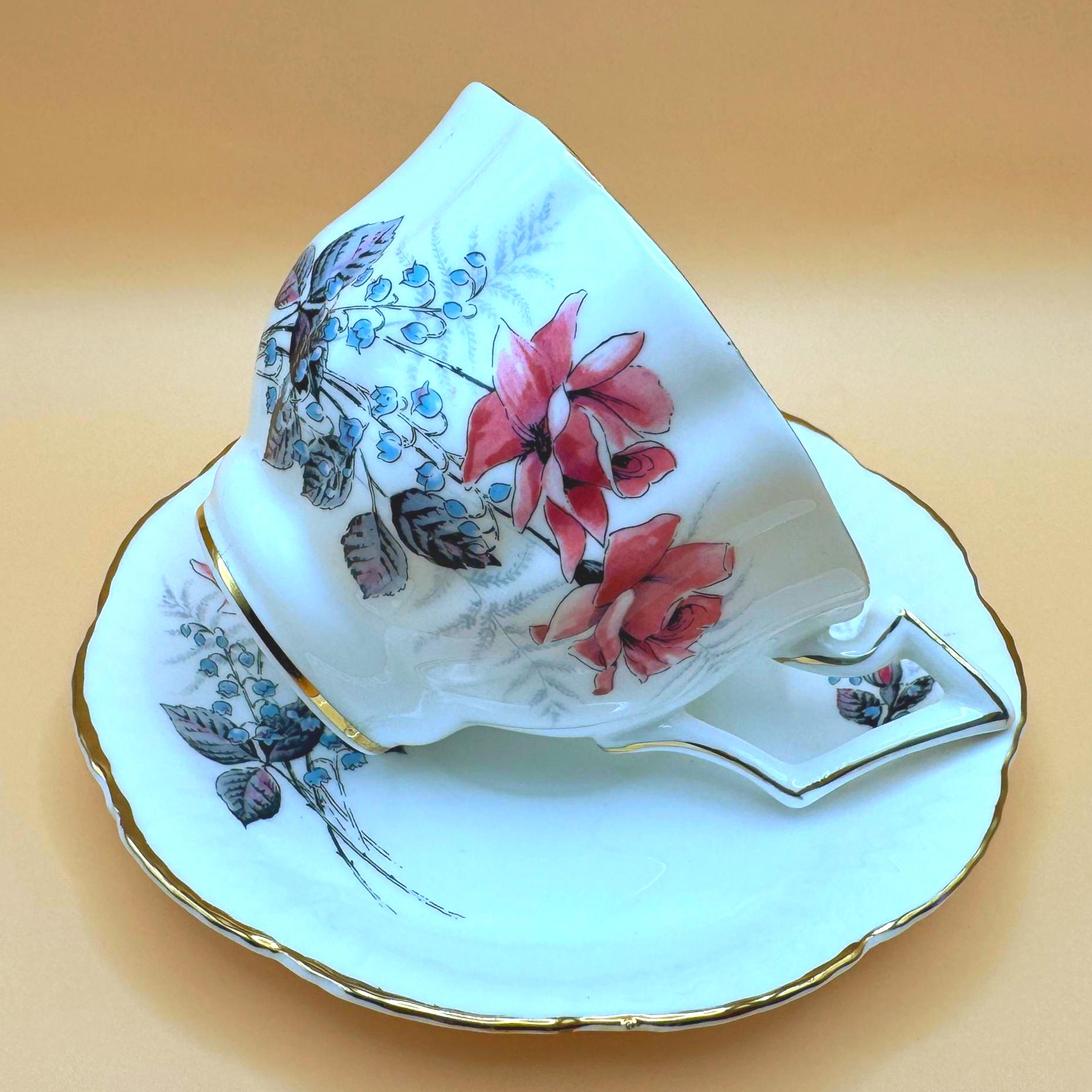 This romantic vintage teacup and saucer by Salisbury was crafted in England during the mid-20th century, circa 1950s–1960s. Made of fine bone china, it features soft pink roses paired with delicate blue bell flowers—an elegant floral design that feels timeless, gentle, and beautifully nostalgic.