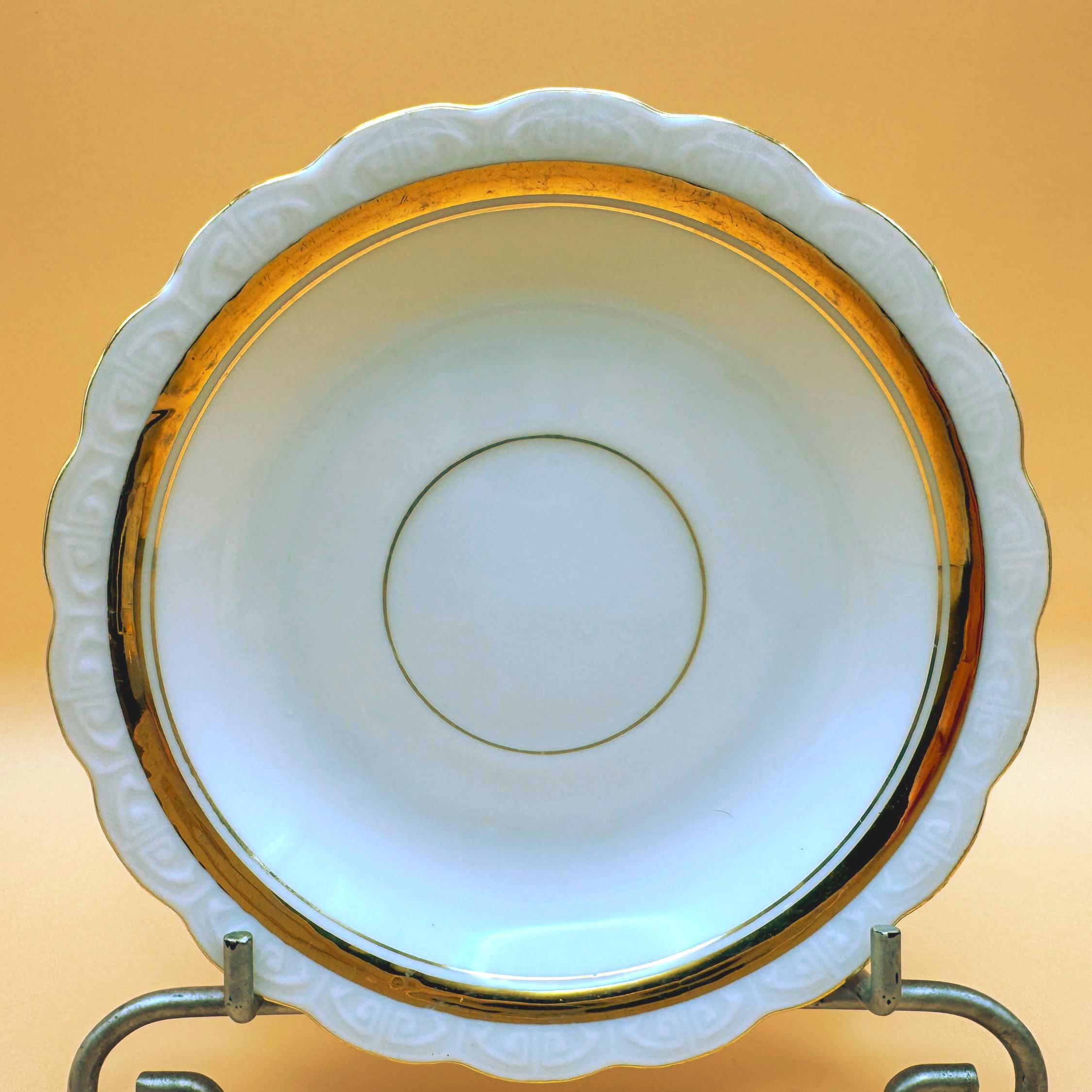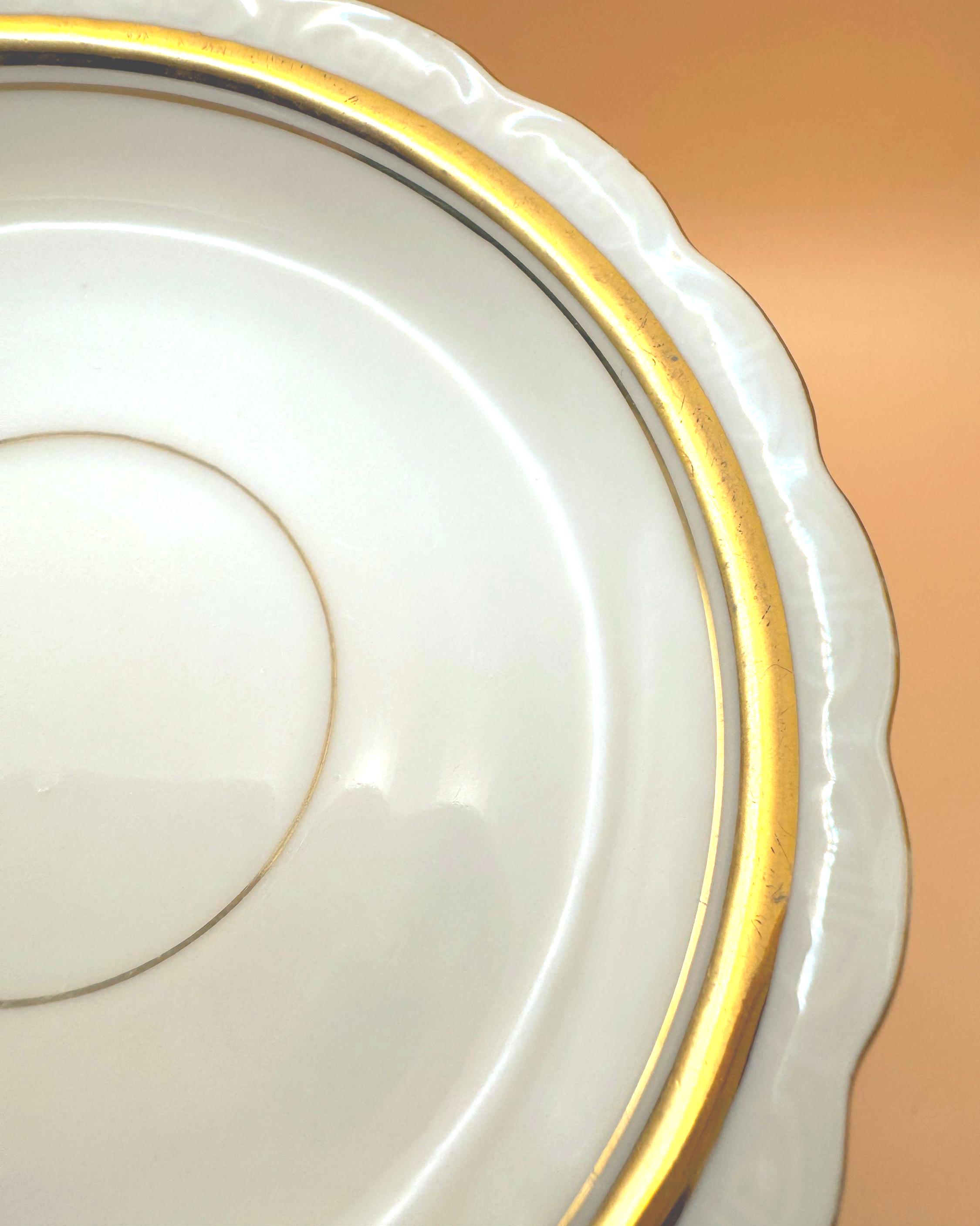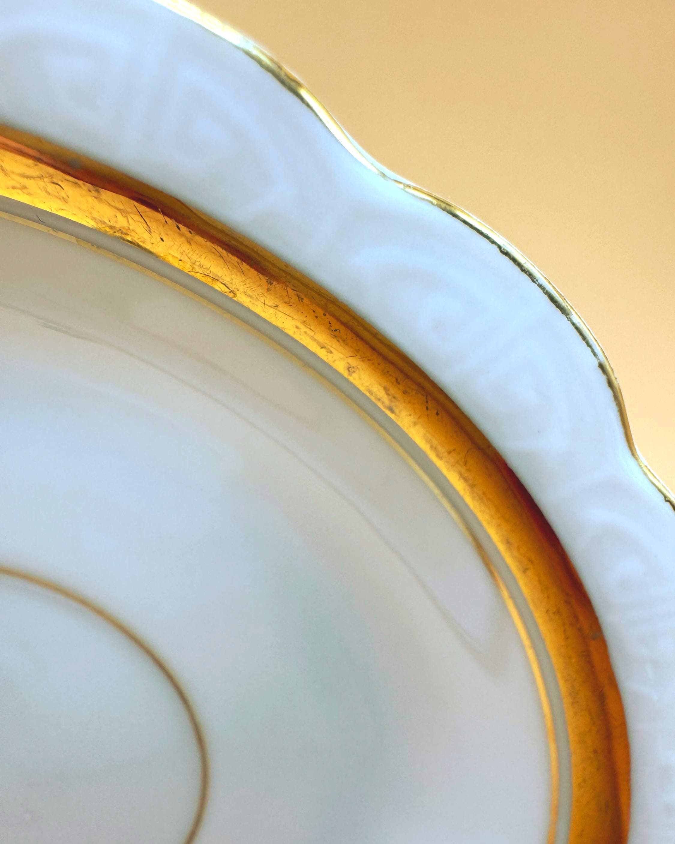 Design: White porcelain with wide gold band and scalloped edges