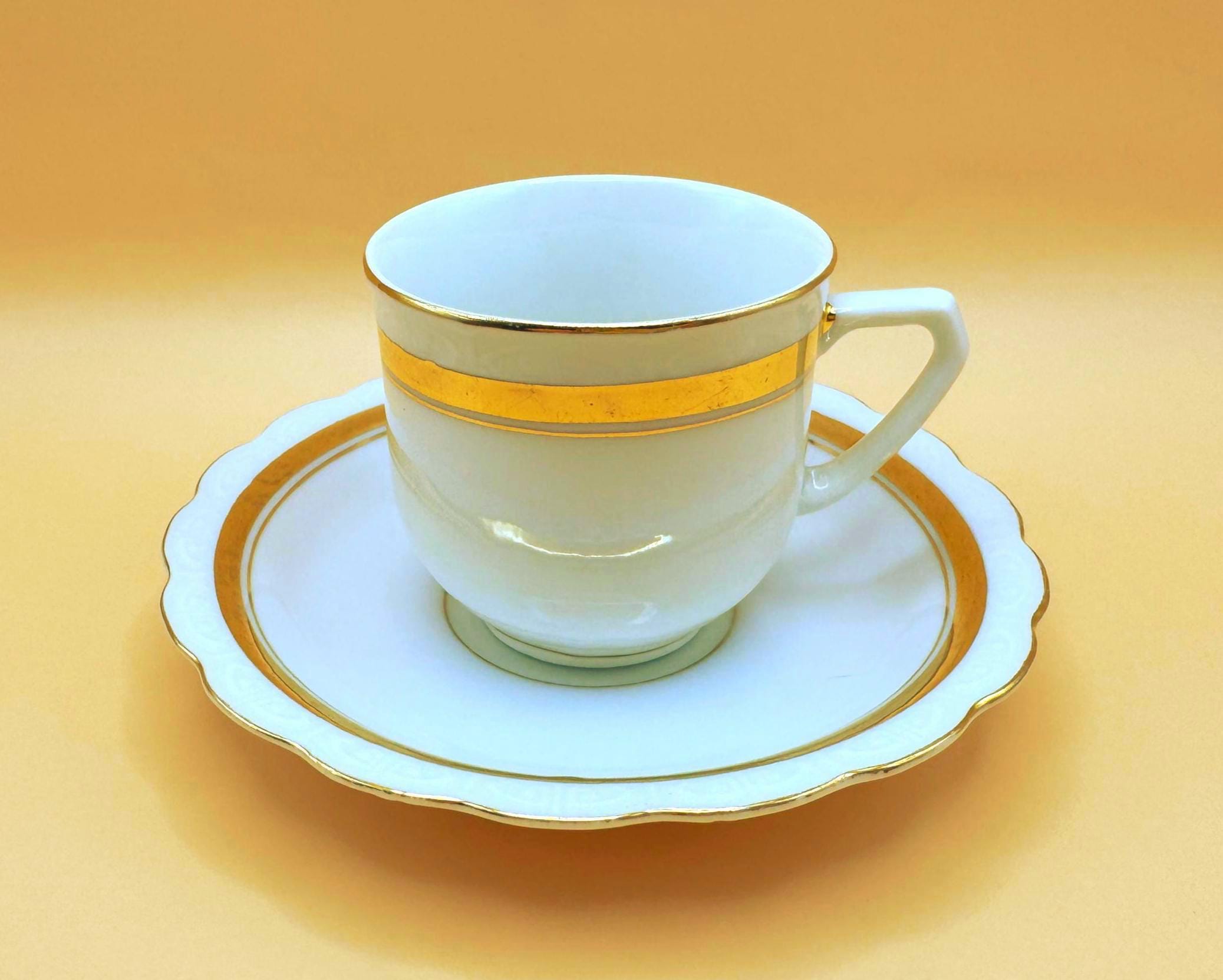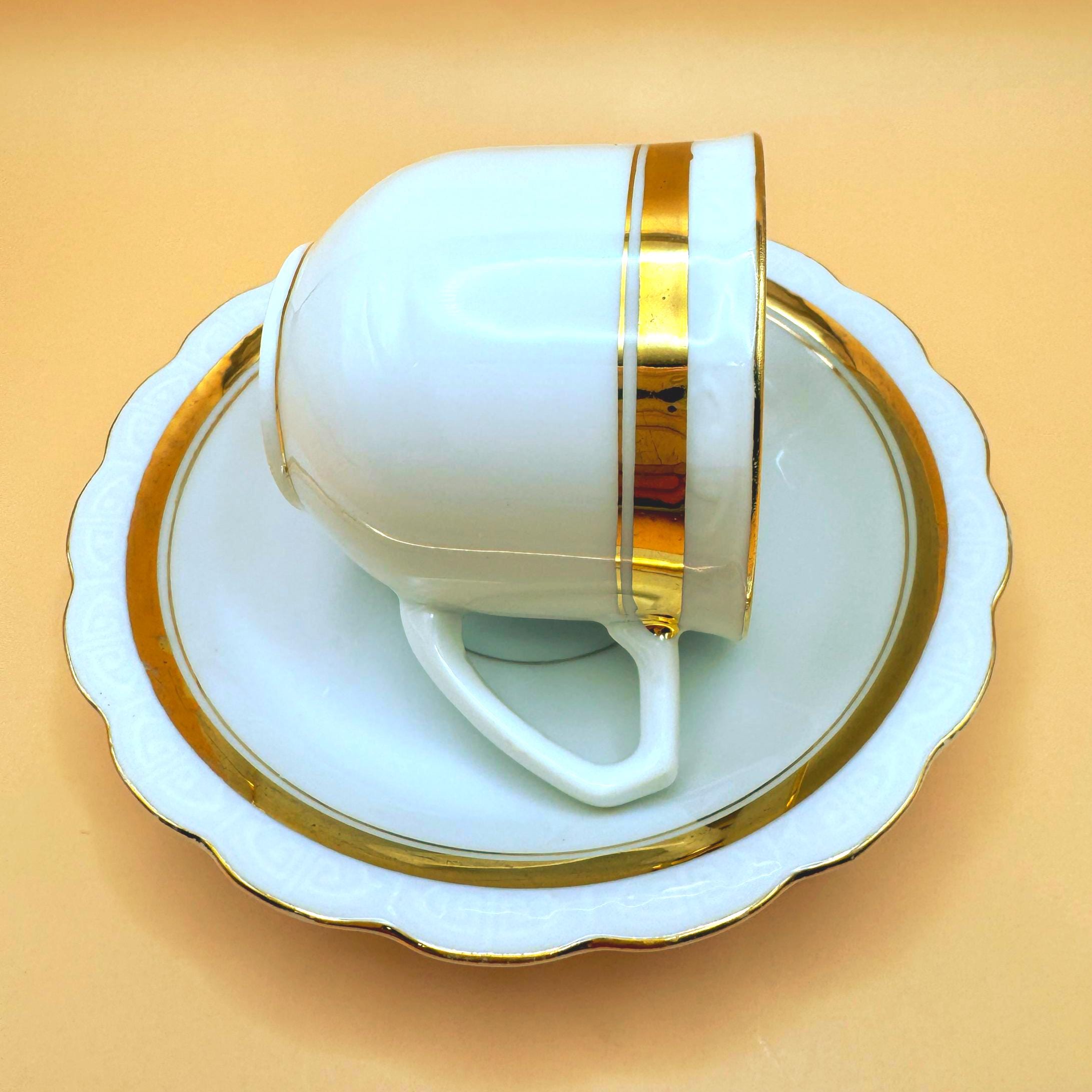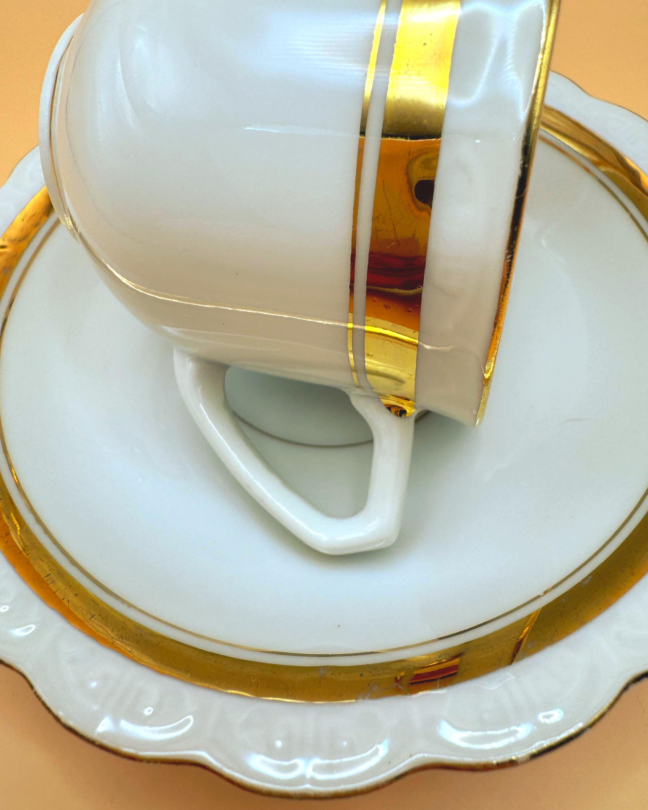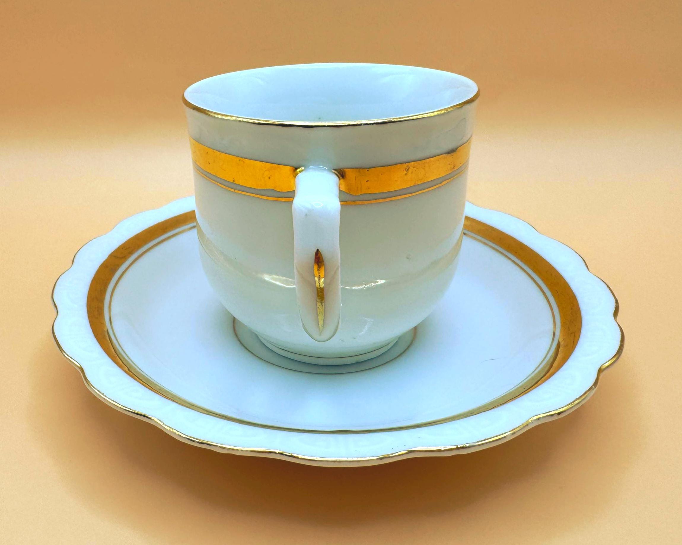 This elegant vintage demi teacup and saucer was produced in Silesia (marked P K Silesia) and dates to the early–mid 20th century, circa 1930s–1950s. Crafted in a soft white porcelain, the design is beautifully minimal and romantic, highlighted by a wide gold band around the teacup and matching gold trim on the scalloped saucer.