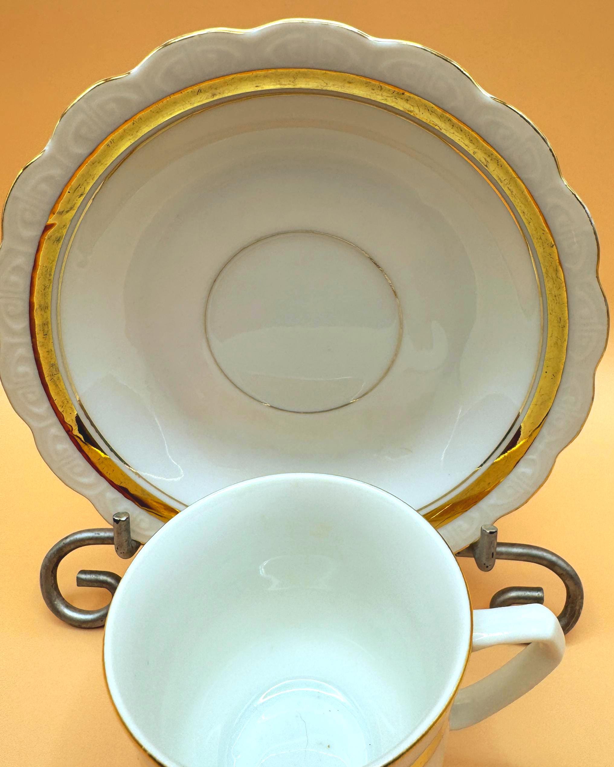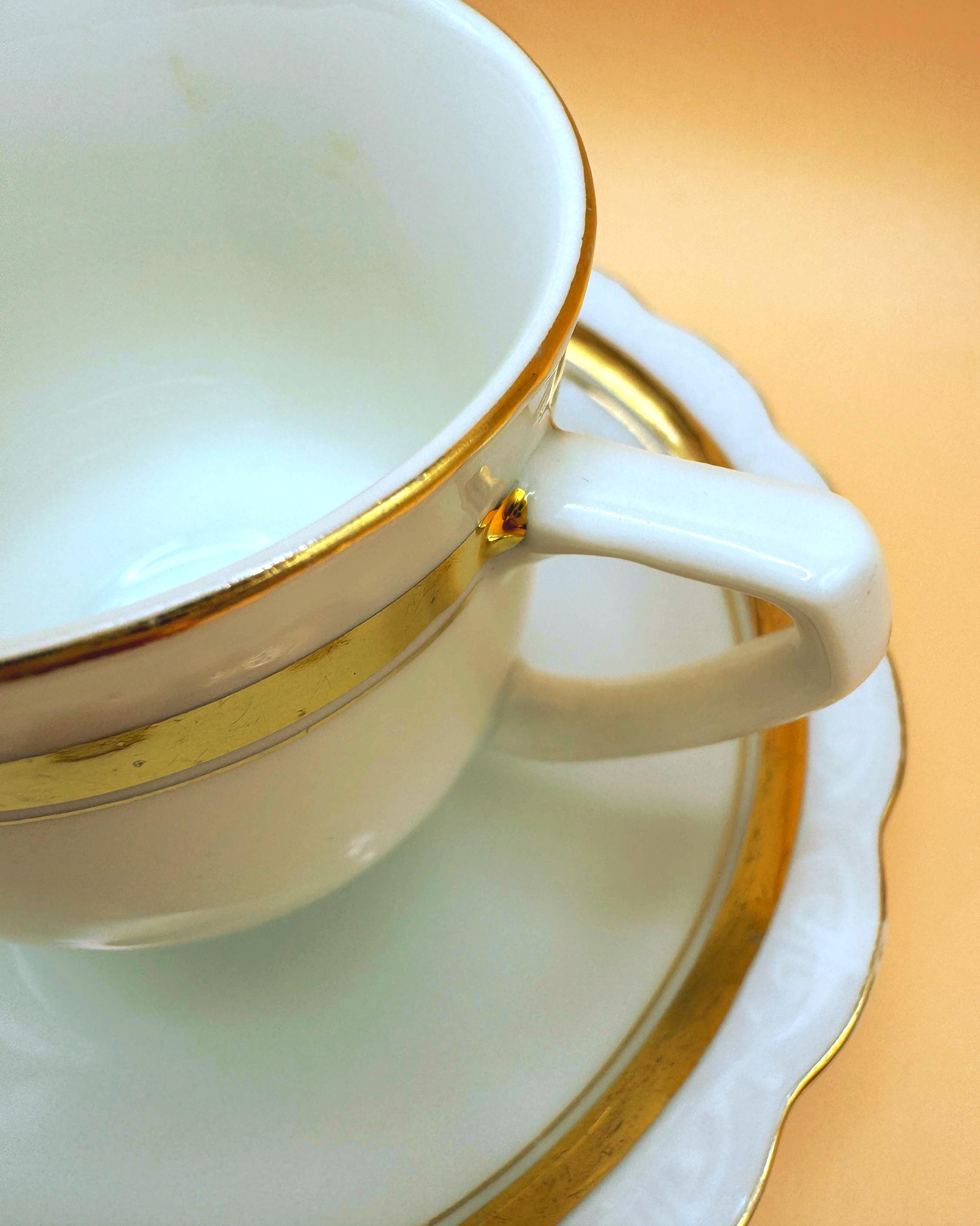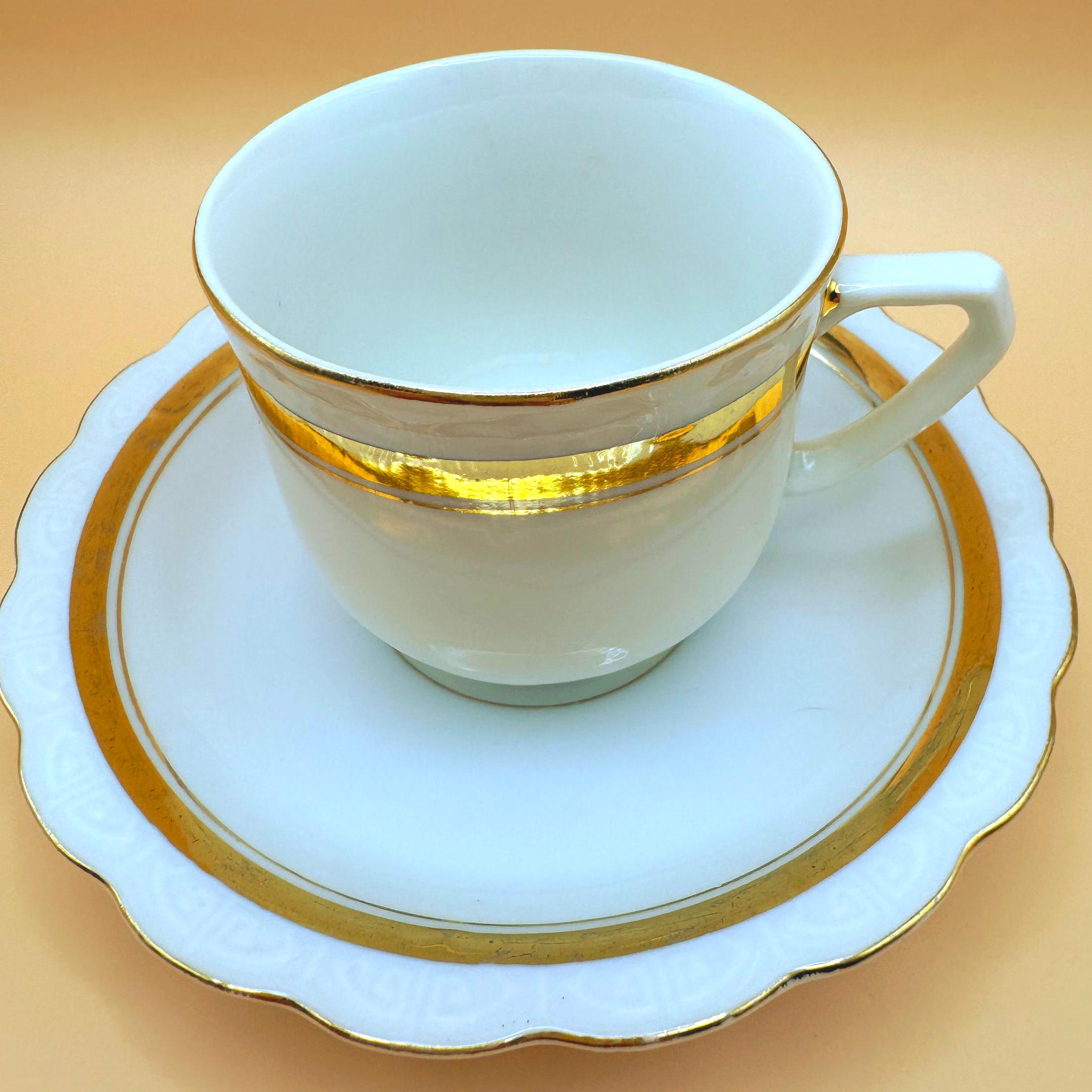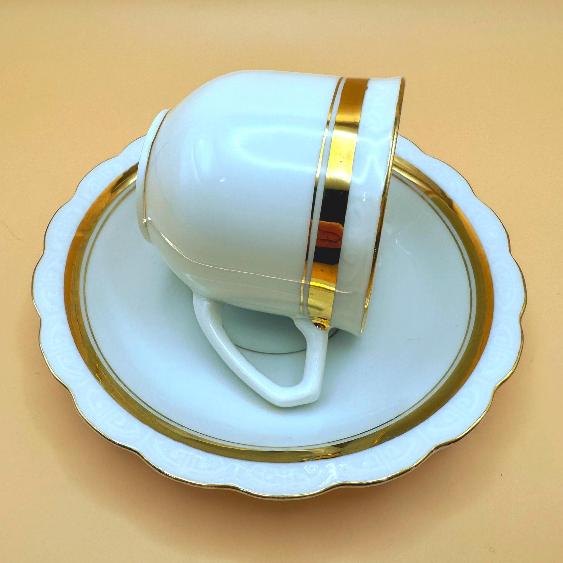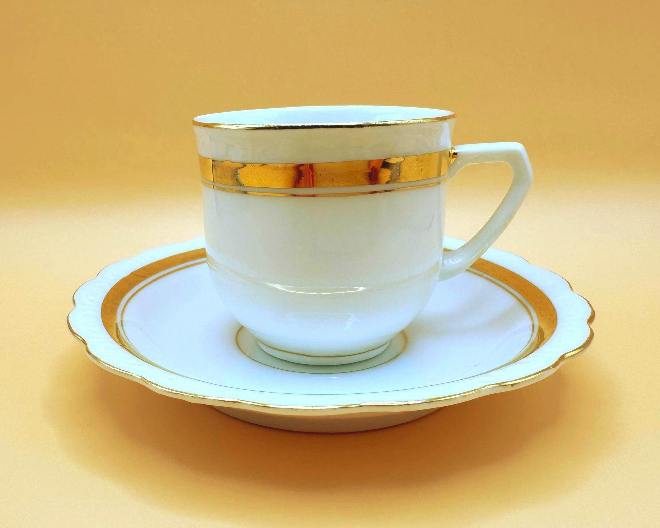 This elegant vintage demi teacup and saucer was produced in Silesia (marked P K Silesia) and dates to the early–mid 20th century, circa 1930s–1950s. Crafted in a soft white porcelain, the design is beautifully minimal and romantic, highlighted by a wide gold band around the teacup and matching gold trim on the scalloped saucer.