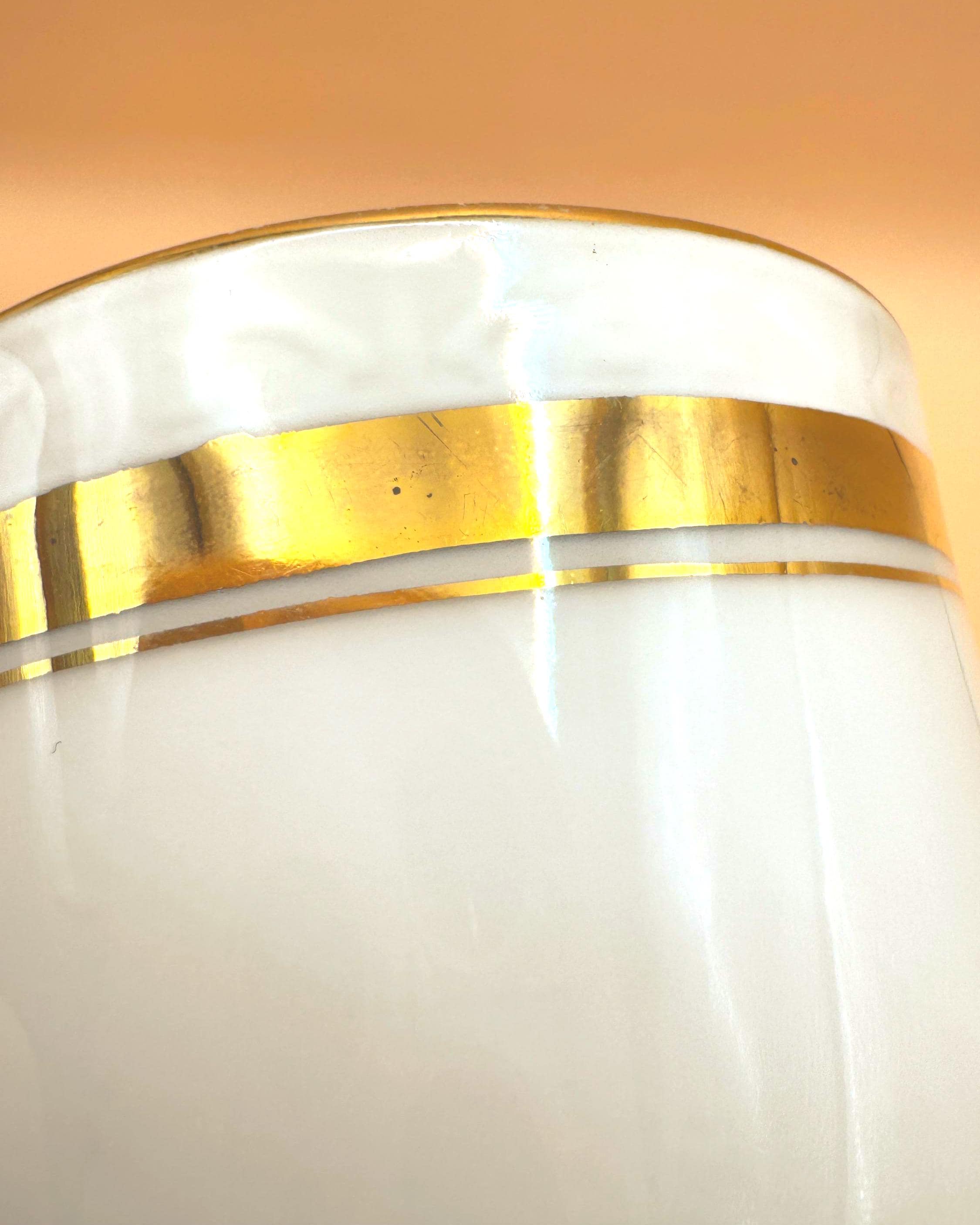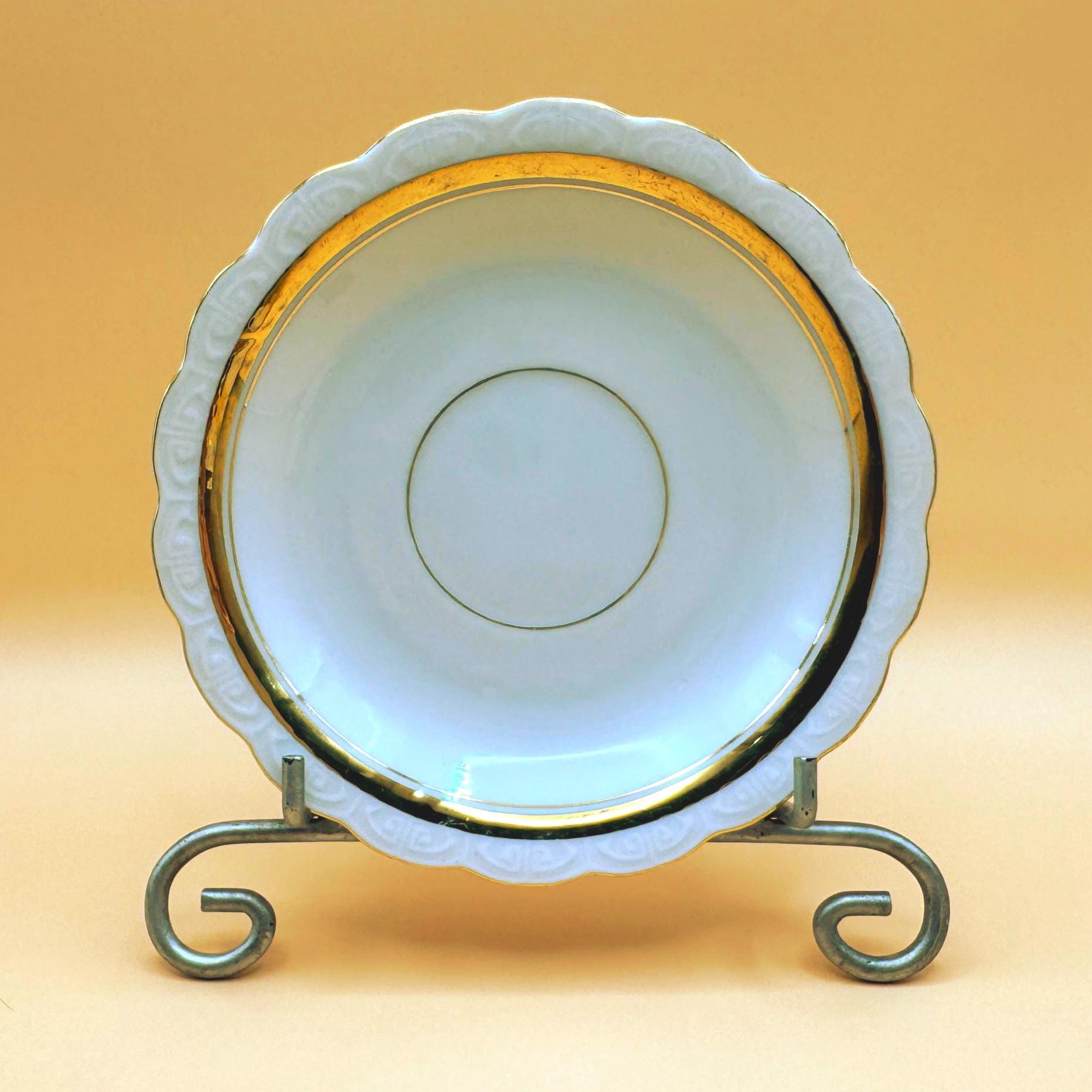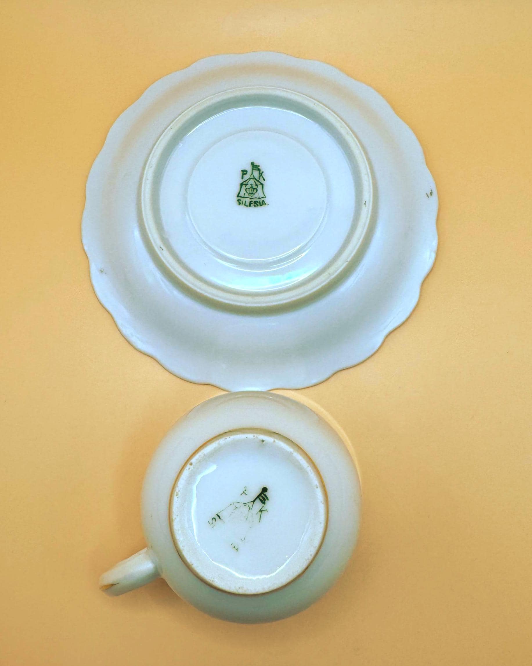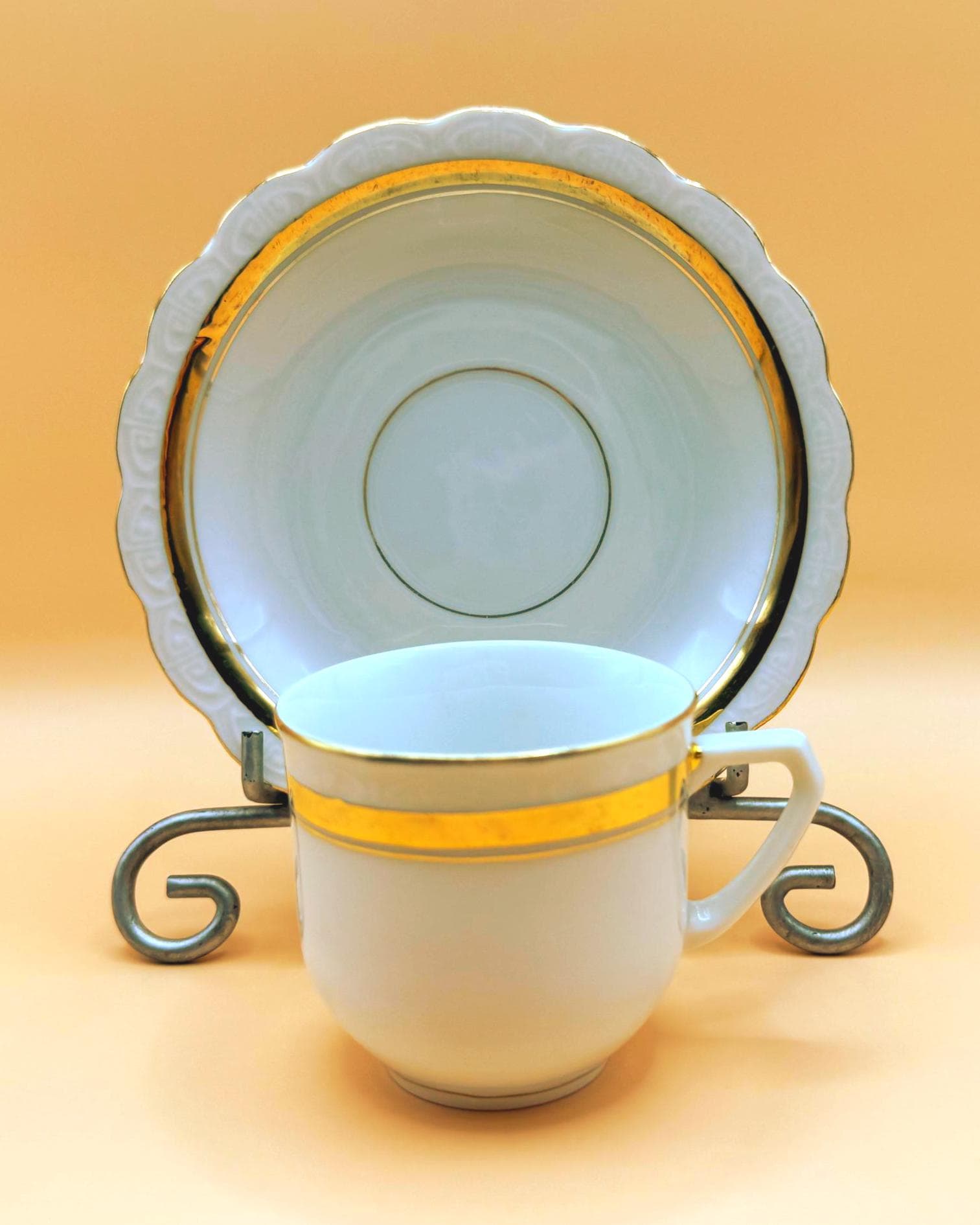This elegant vintage demi teacup and saucer was produced in Silesia (marked P K Silesia) and dates to the early–mid 20th century, circa 1930s–1950s. Crafted in a soft white porcelain, the design is beautifully minimal and romantic, highlighted by a wide gold band around the teacup and matching gold trim on the scalloped saucer.