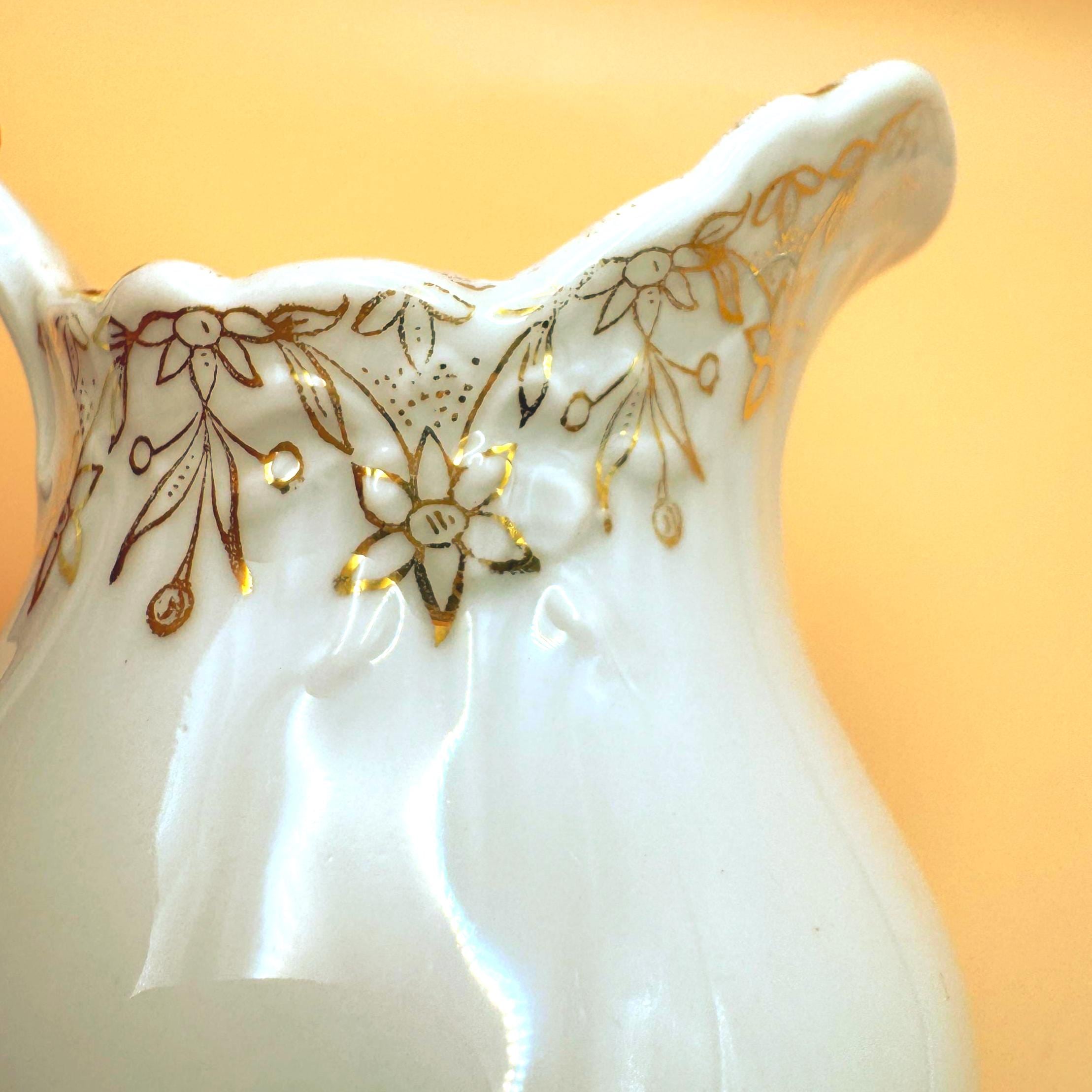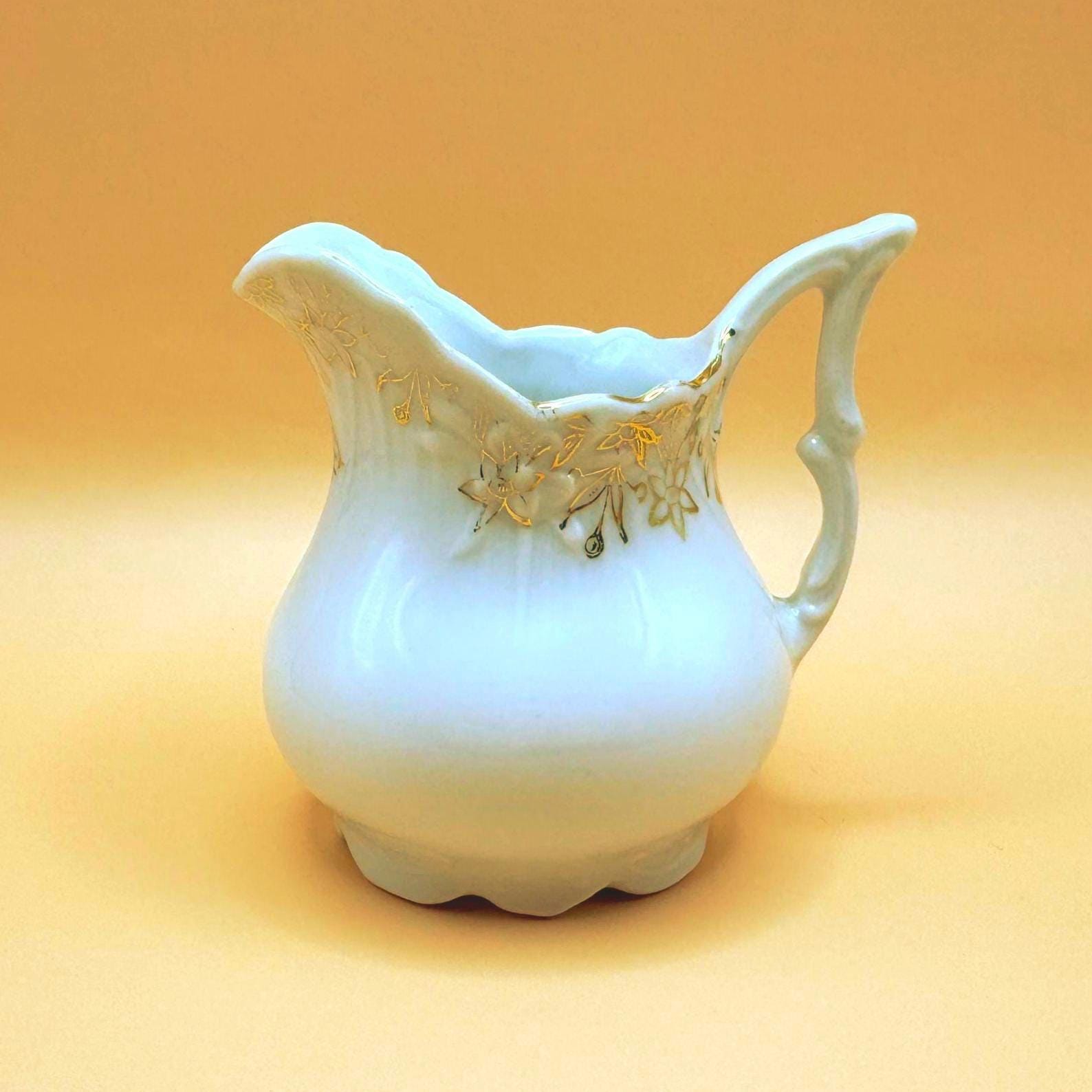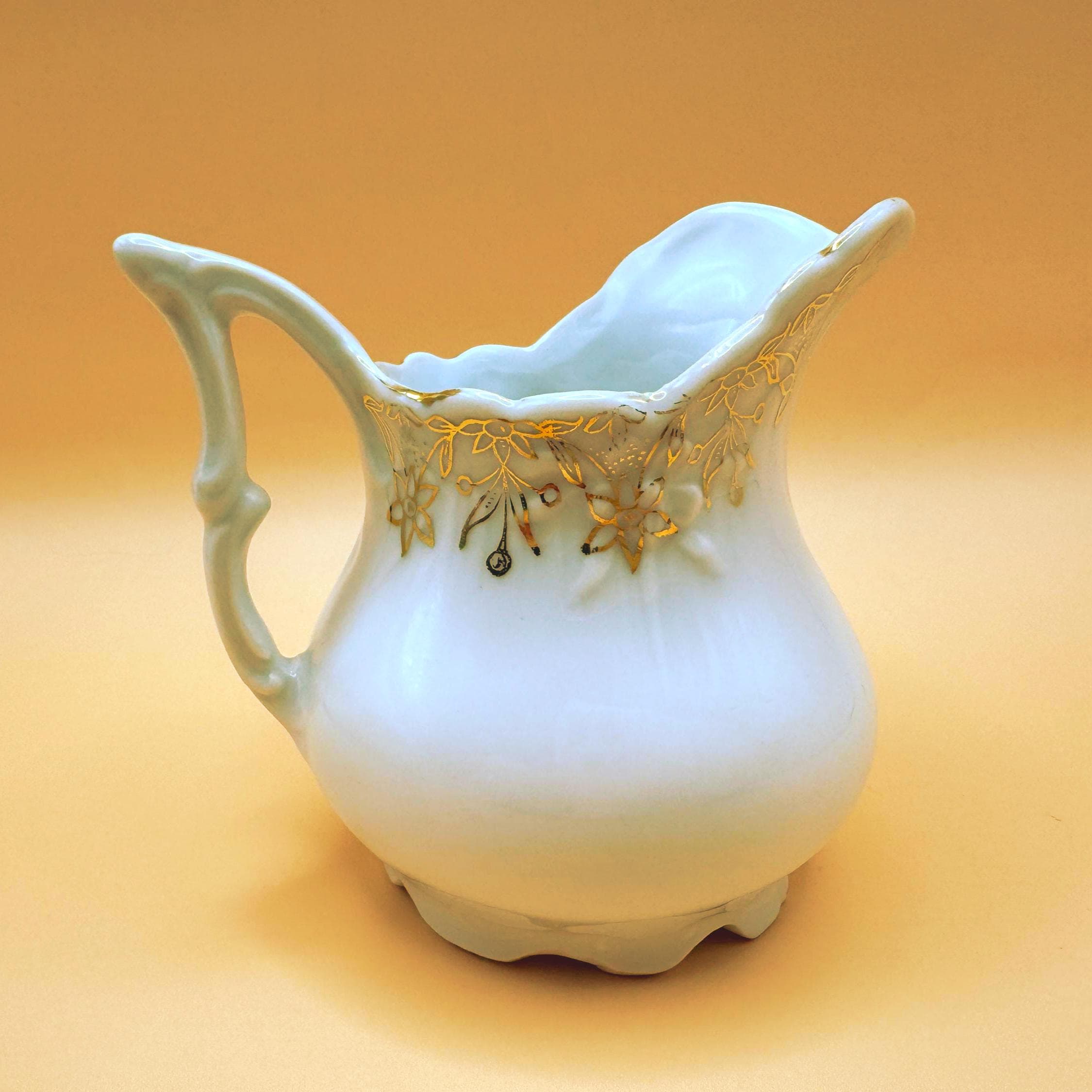 This elegant antique porcelain creamer is crafted in classic white porcelain and adorned with hand-applied gold floral detailing around the rim. The softly scalloped spout, rounded body, and distinct pointed/angular handle reflect the refined, romantic design typical of early 20th-century tea wares.
