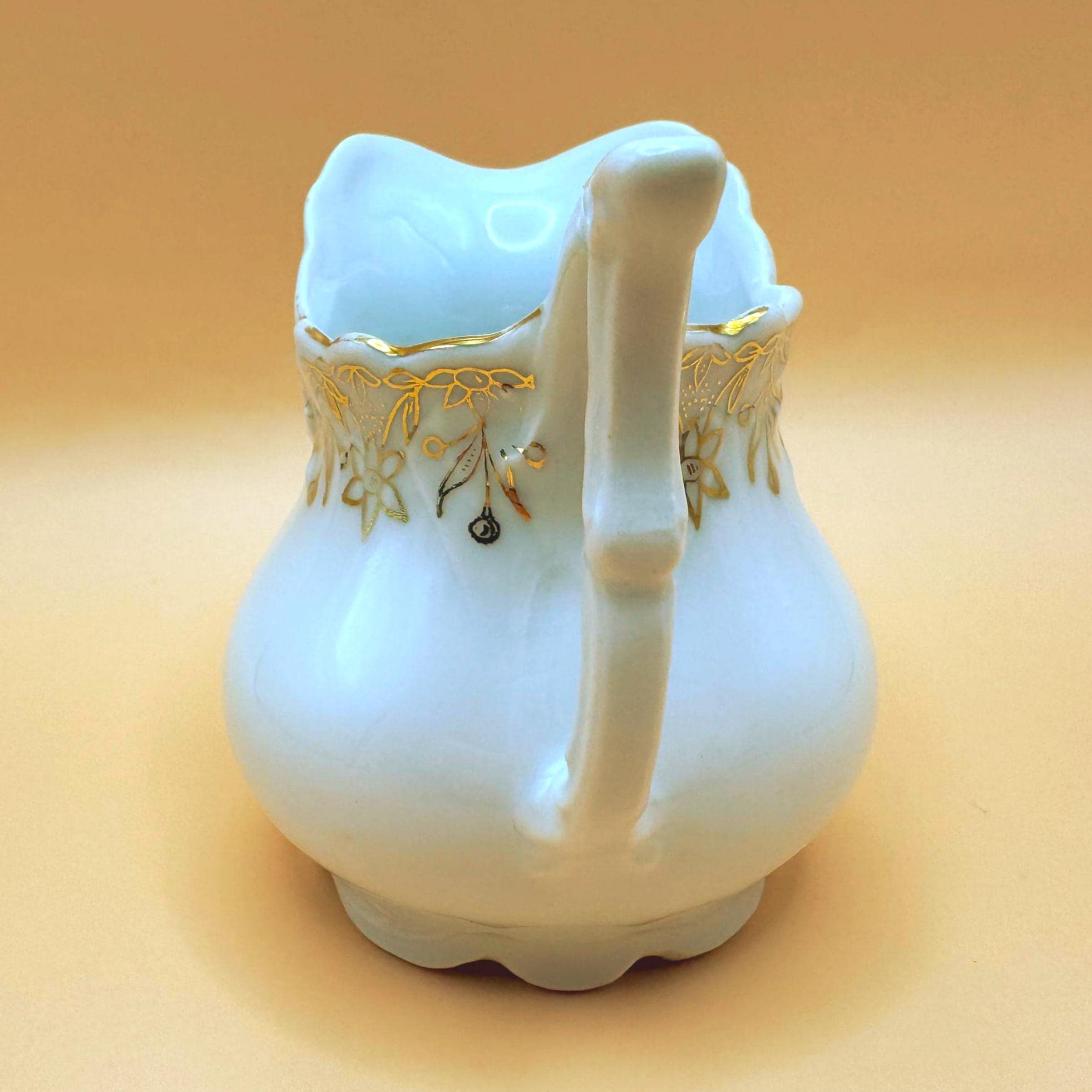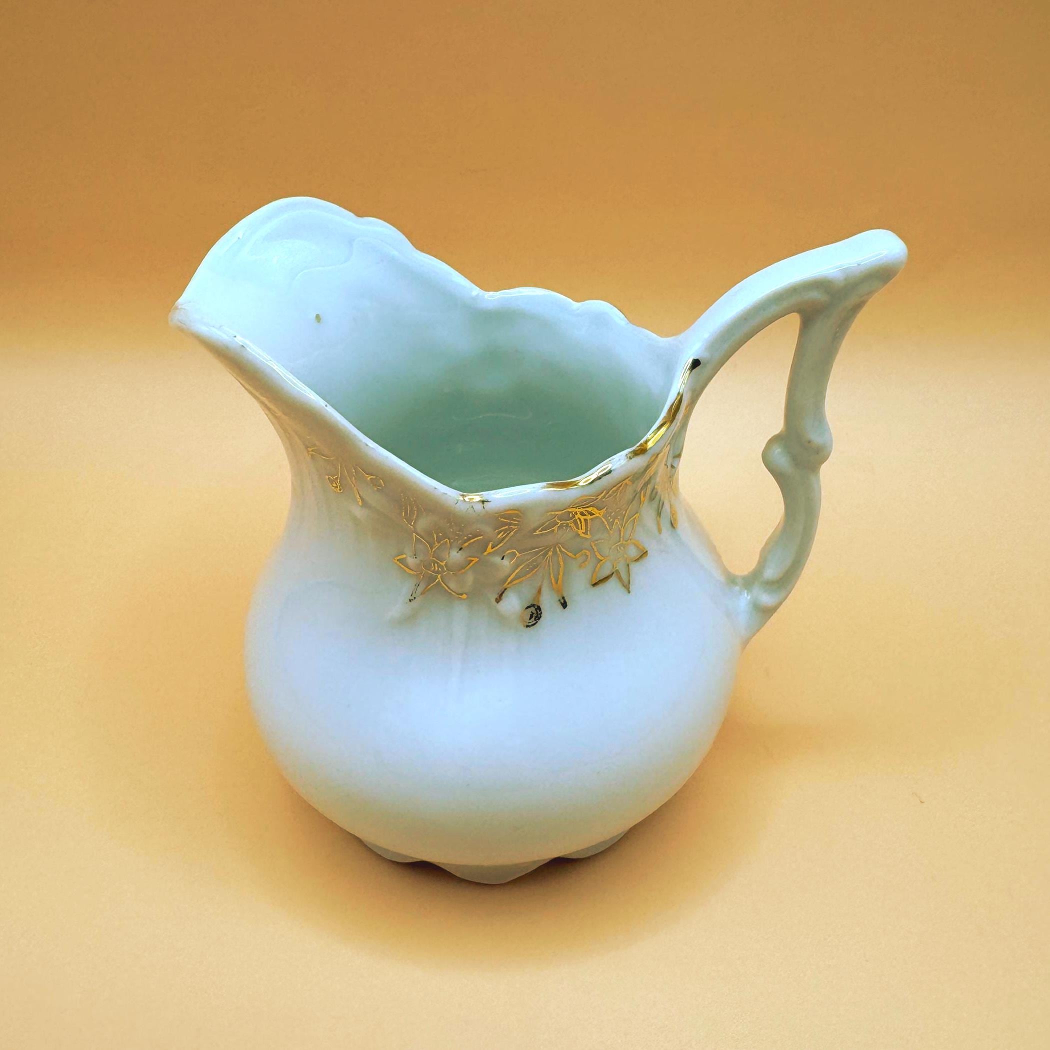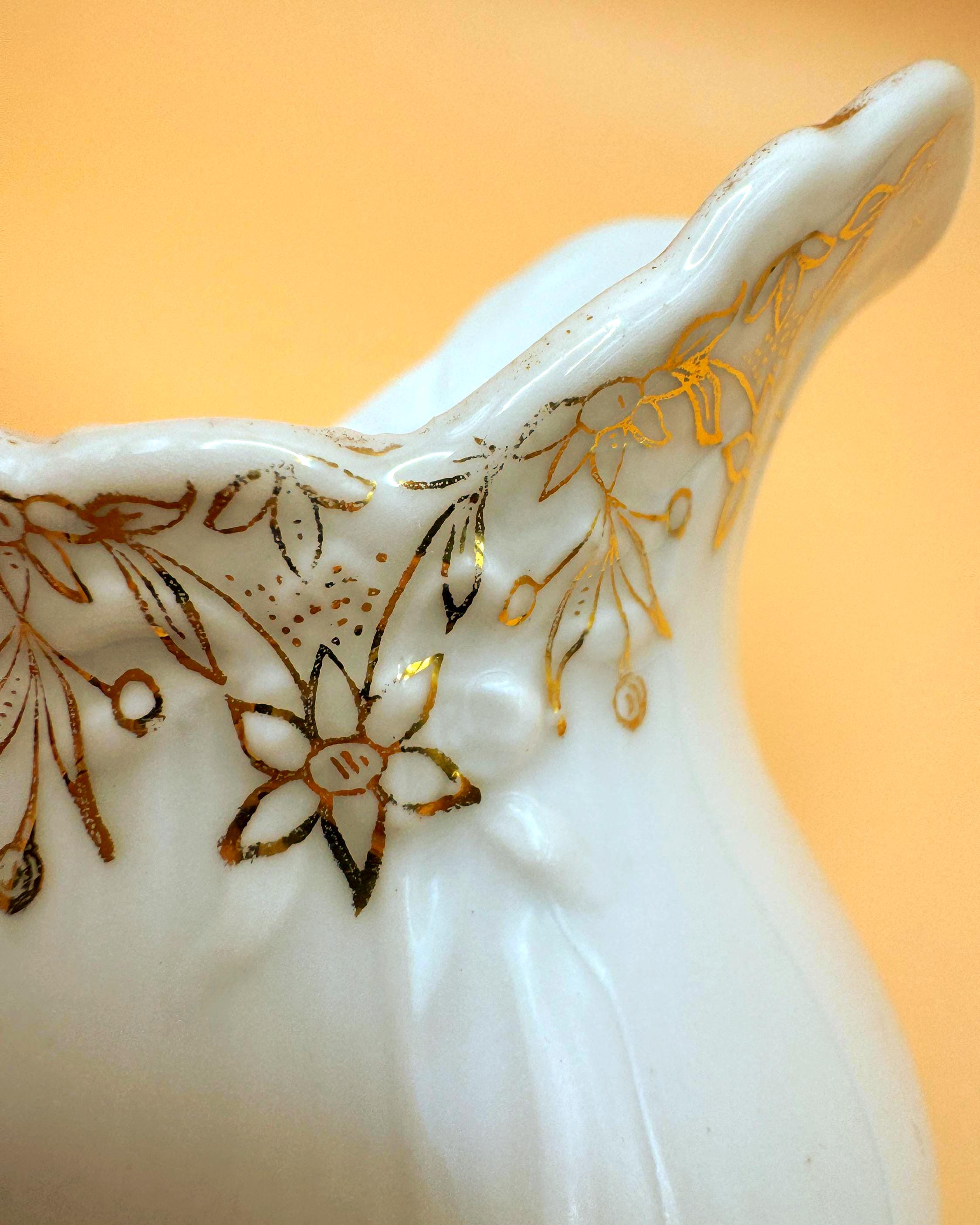 This elegant antique porcelain creamer is crafted in classic white porcelain and adorned with hand-applied gold floral detailing around the rim. The softly scalloped spout, rounded body, and distinct pointed/angular handle reflect the refined, romantic design typical of early 20th-century tea wares.