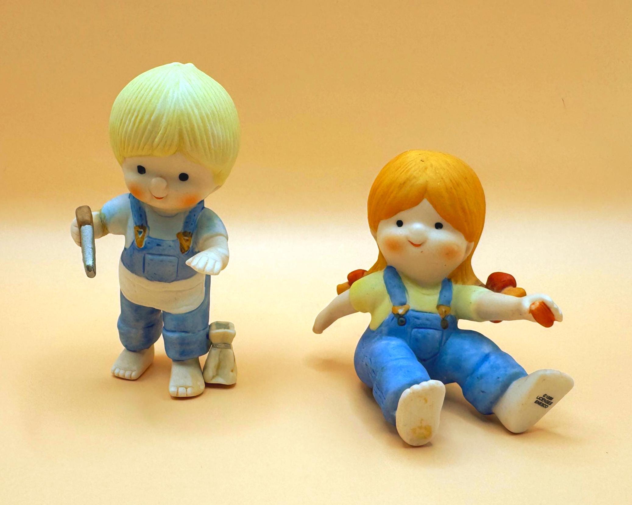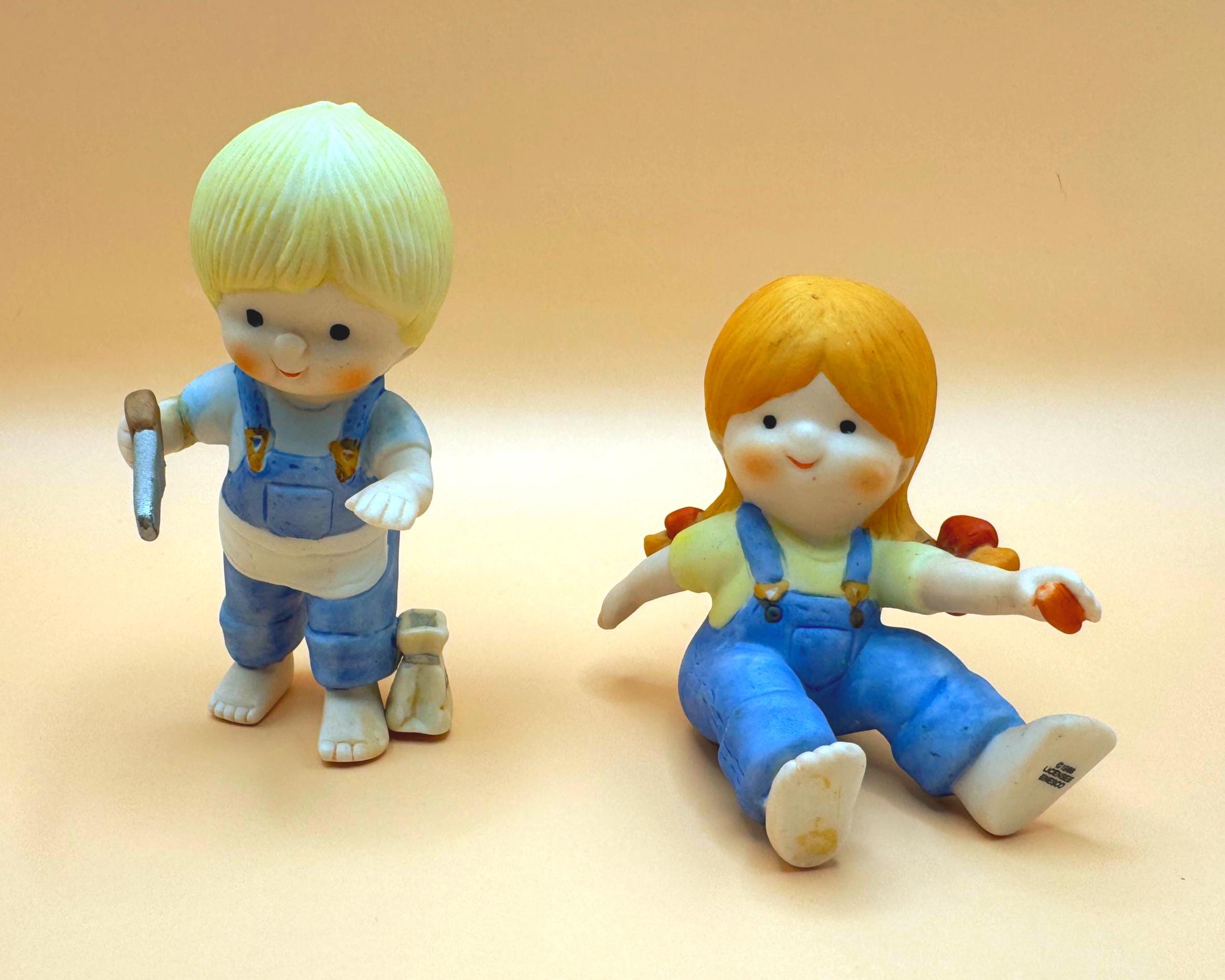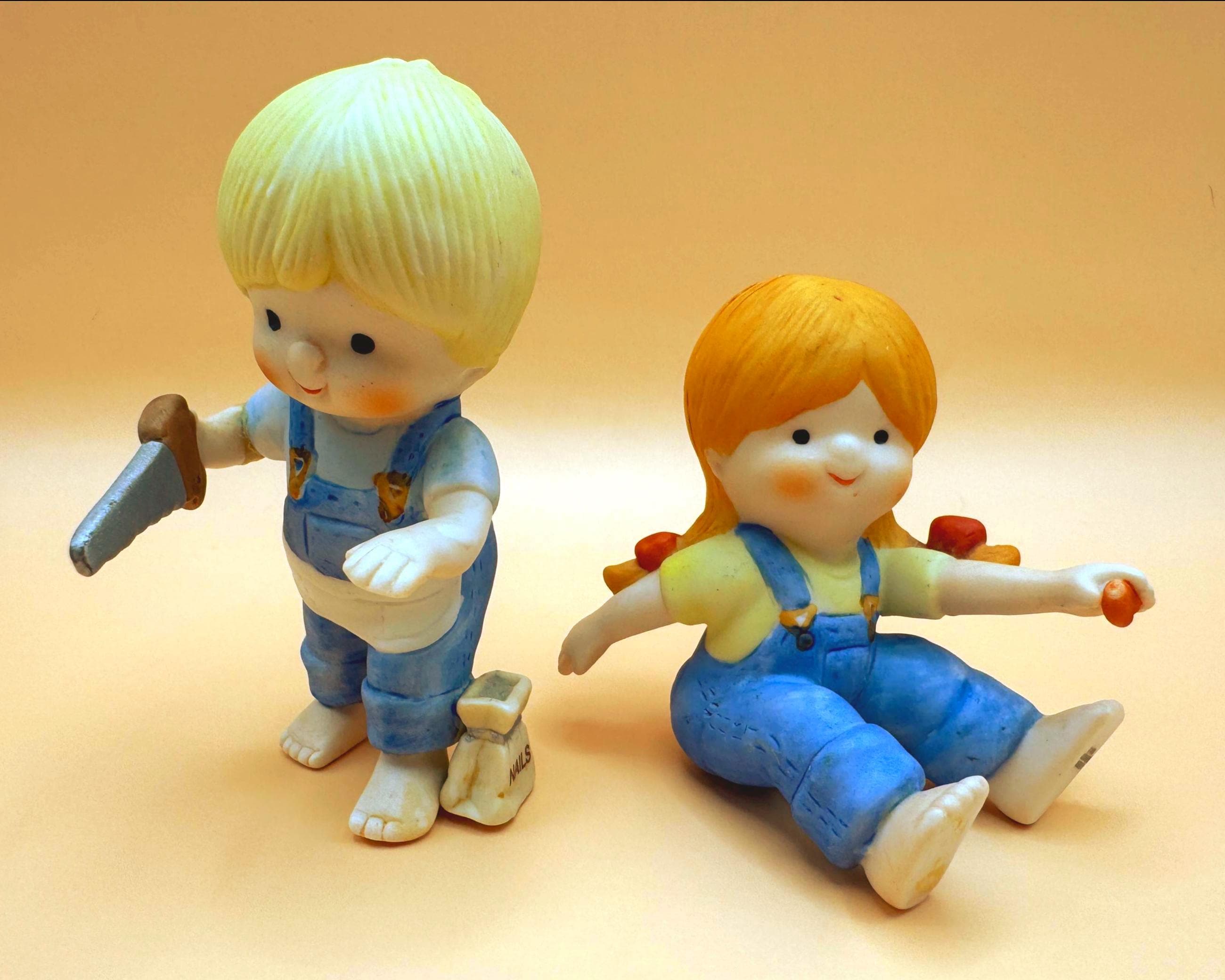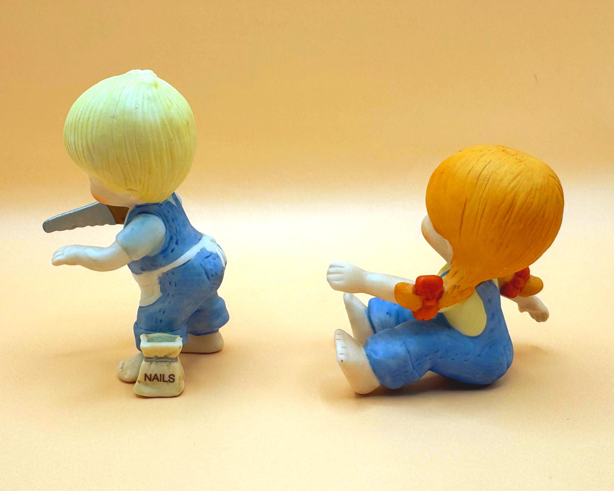 This charming vintage pair of Enesco Country Cousins figurines features a sweet boy and girl designed in a classic late-1980s storybook style. The boy stands proudly in blue overalls holding a toy saw, complete with a small “nails” bag at his feet, while the girl sits nearby in matching overalls with pigtails and a gentle, playful expression.