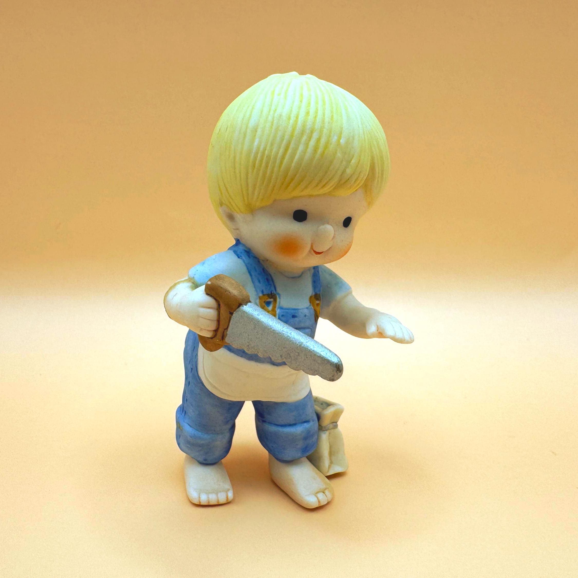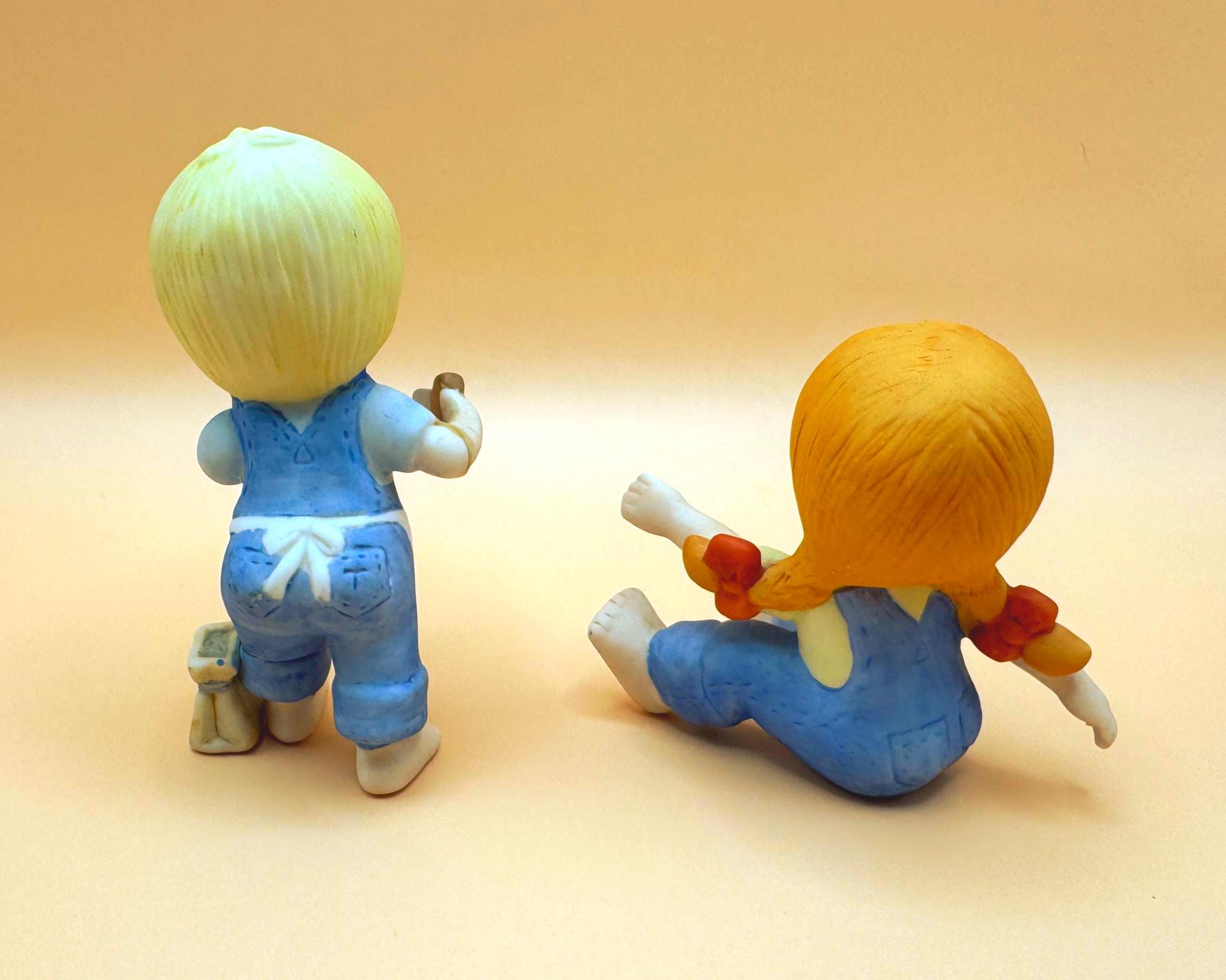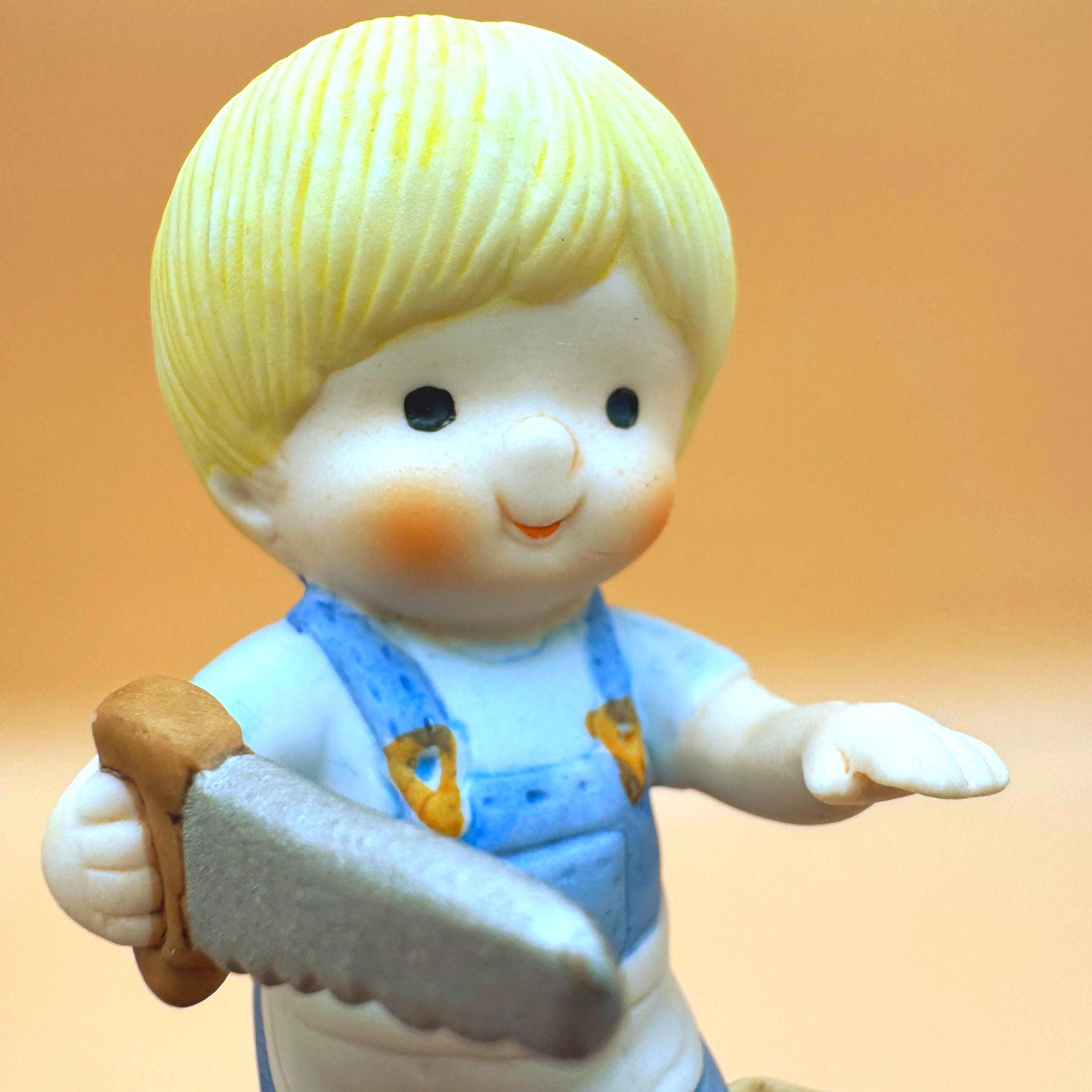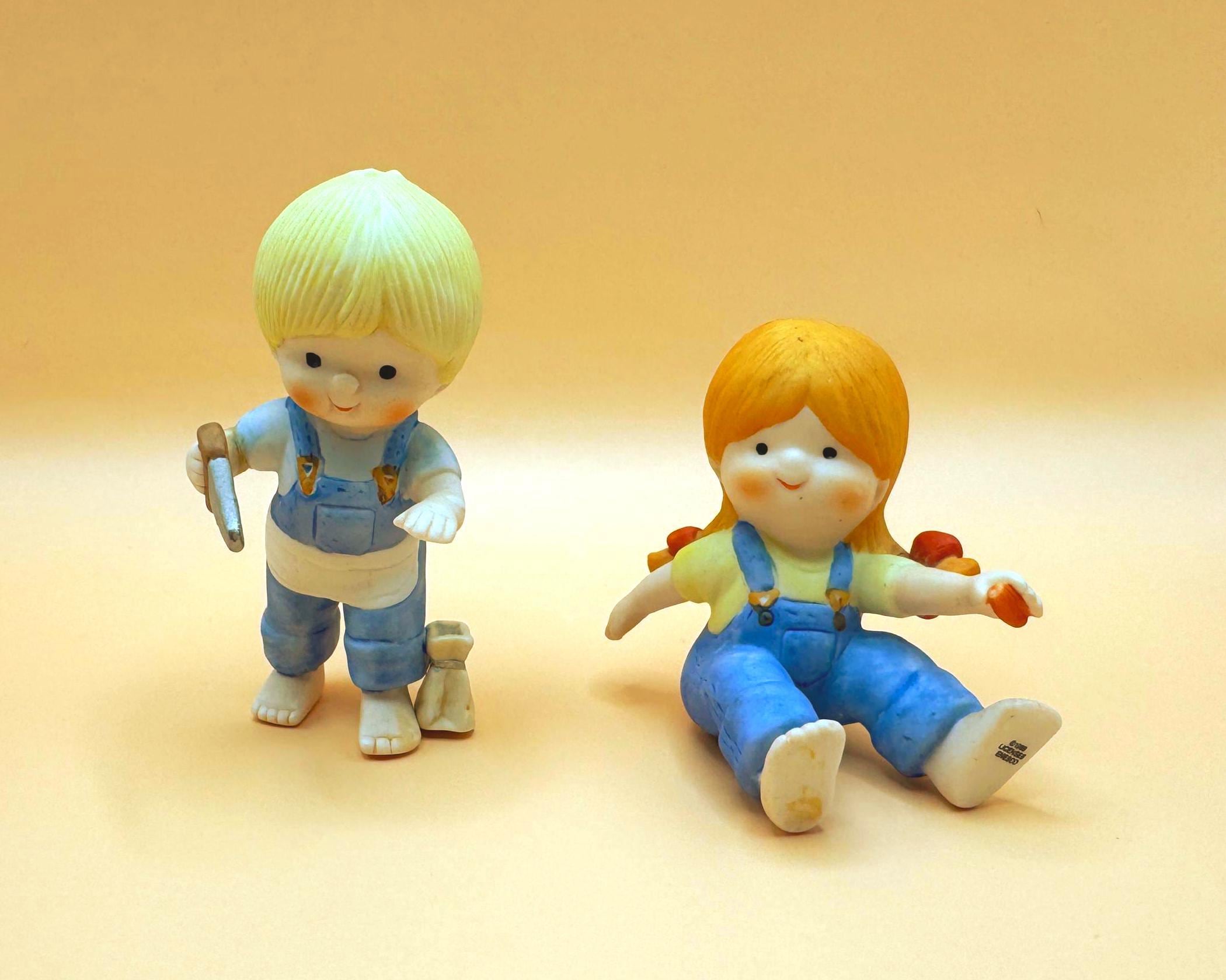 This charming vintage pair of Enesco Country Cousins figurines features a sweet boy and girl designed in a classic late-1980s storybook style. The boy stands proudly in blue overalls holding a toy saw, complete with a small “nails” bag at his feet, while the girl sits nearby in matching overalls with pigtails and a gentle, playful expression.