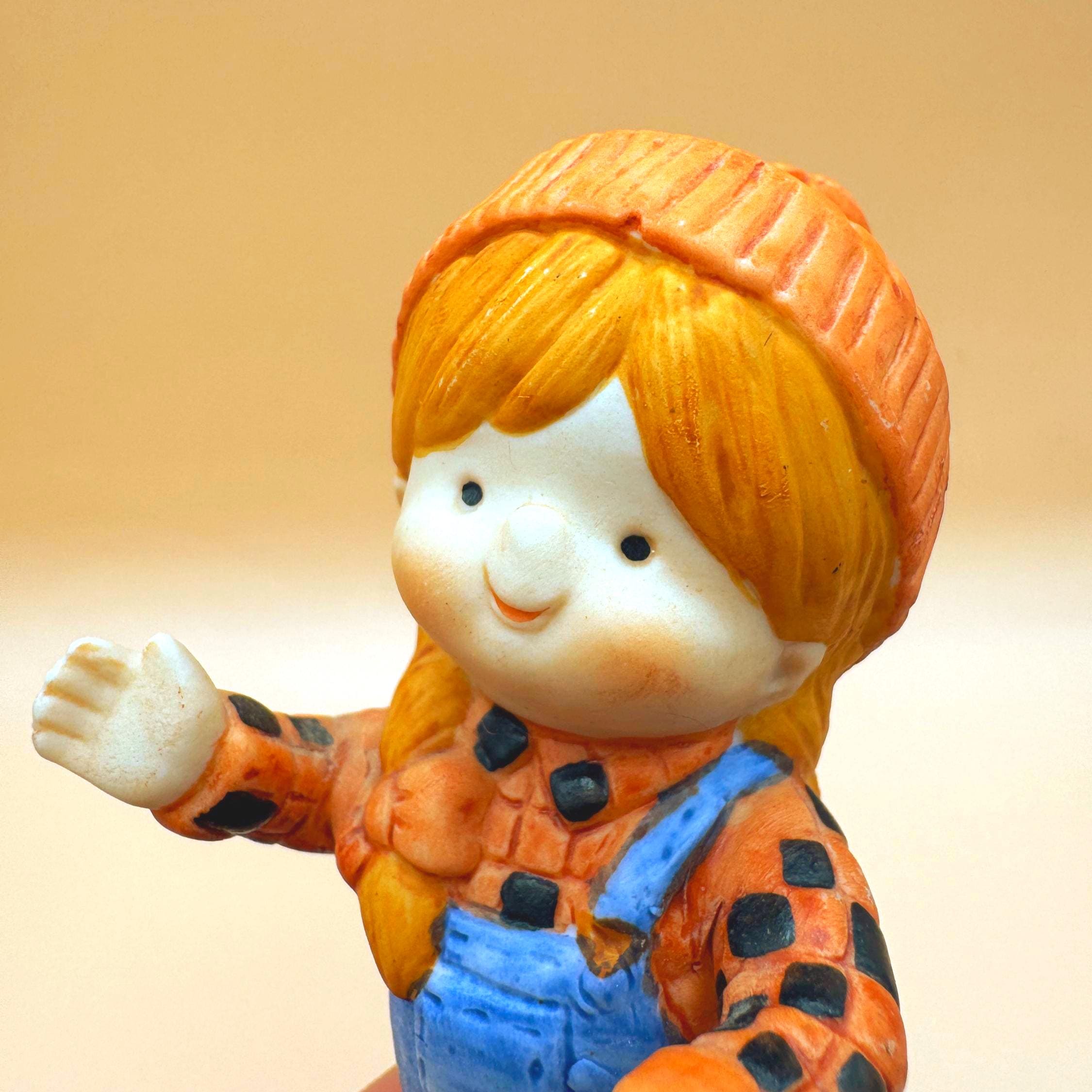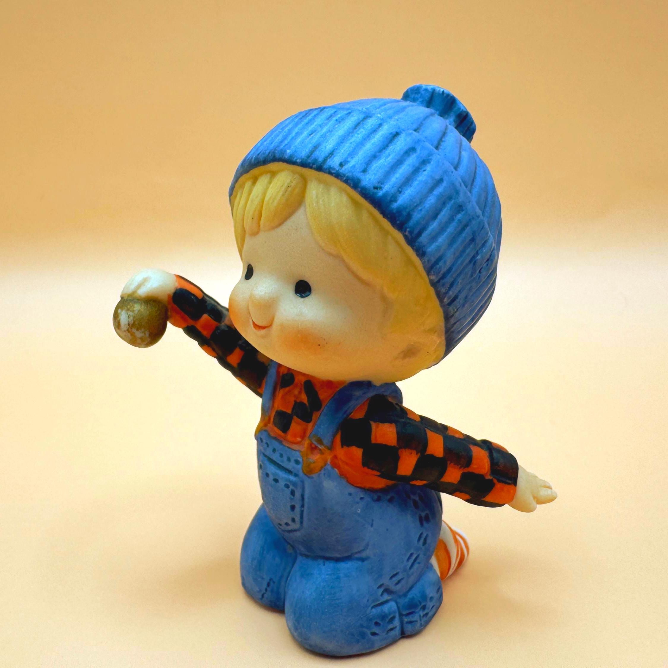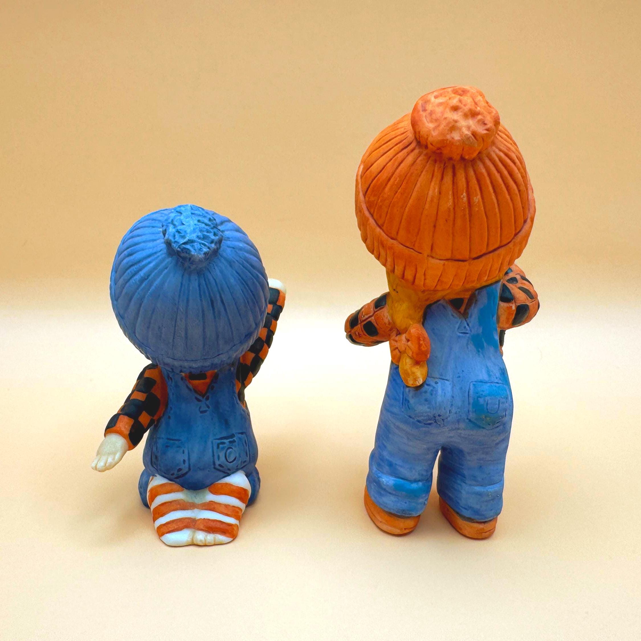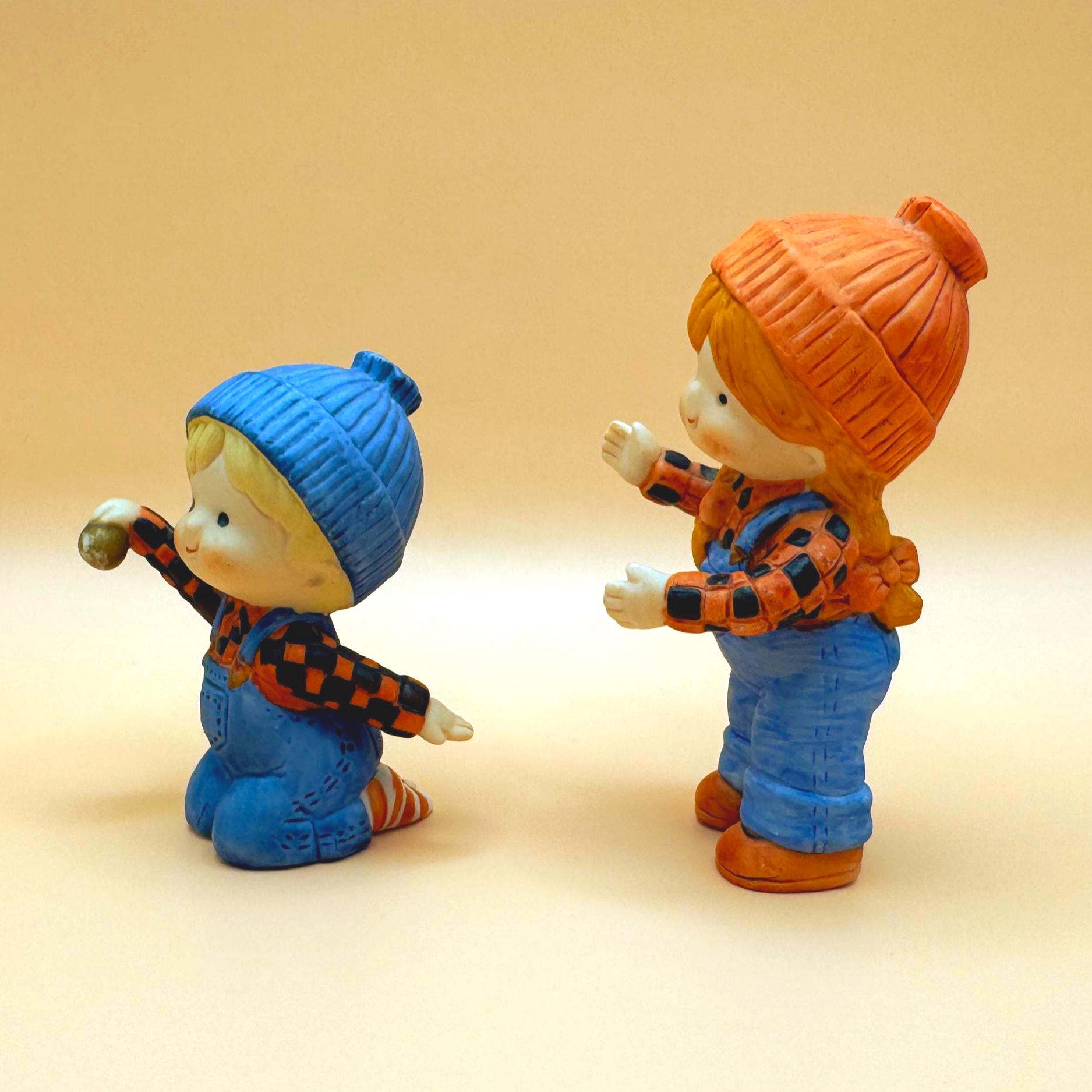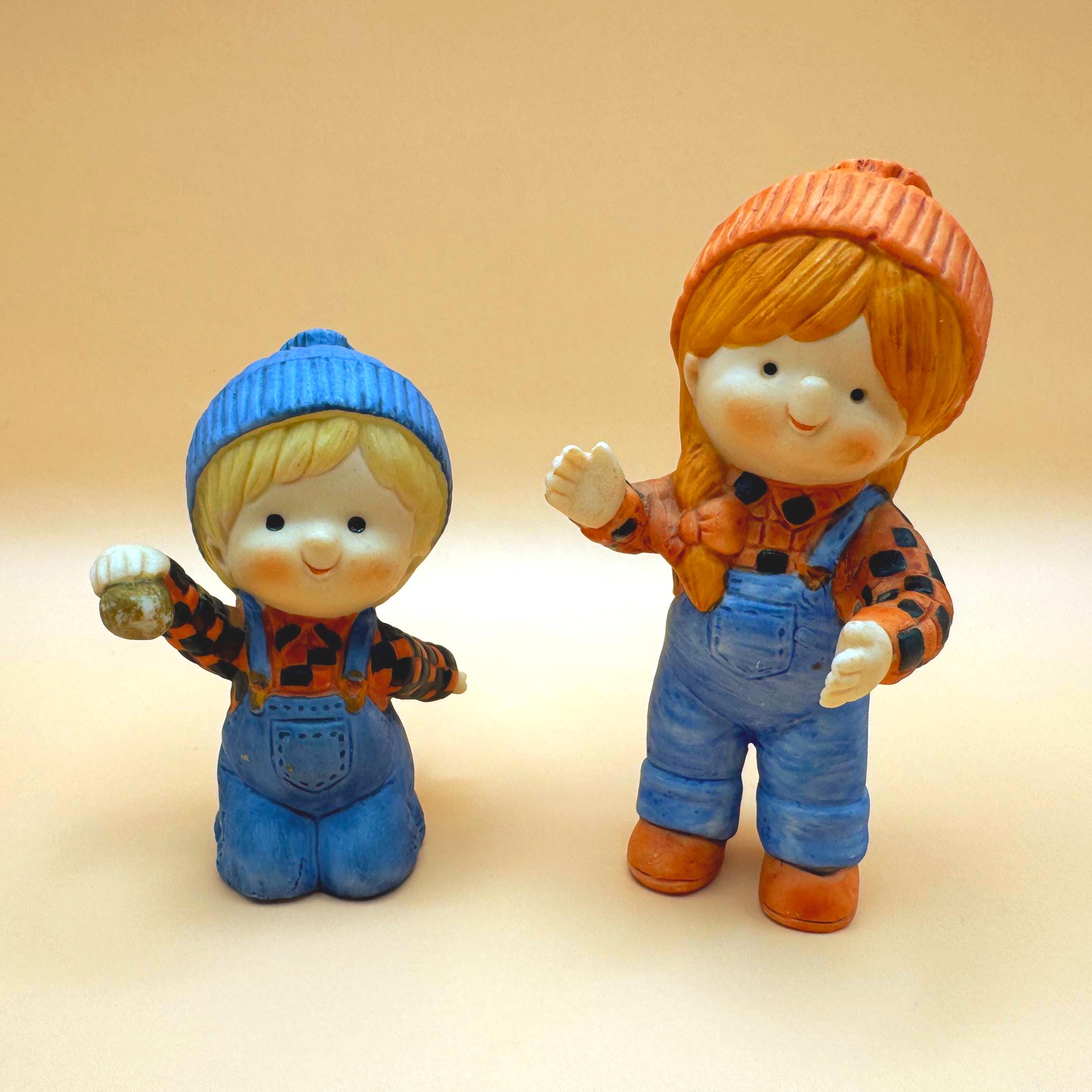 Welcome a sweet touch of vintage charm to your home with this lovely pair of Enesco children figurines, crafted in 1980. The boy figure kneels playfully while holding a ball, and the girl stands with open arms, both dressed in cute overalls and cozy knit-style hats. Their expressive faces and classic matte bisque finish evoke a nostalgic, storybook feel that’s perfect for nursery décor, cottagecore displays, or a vintage figurine collection.