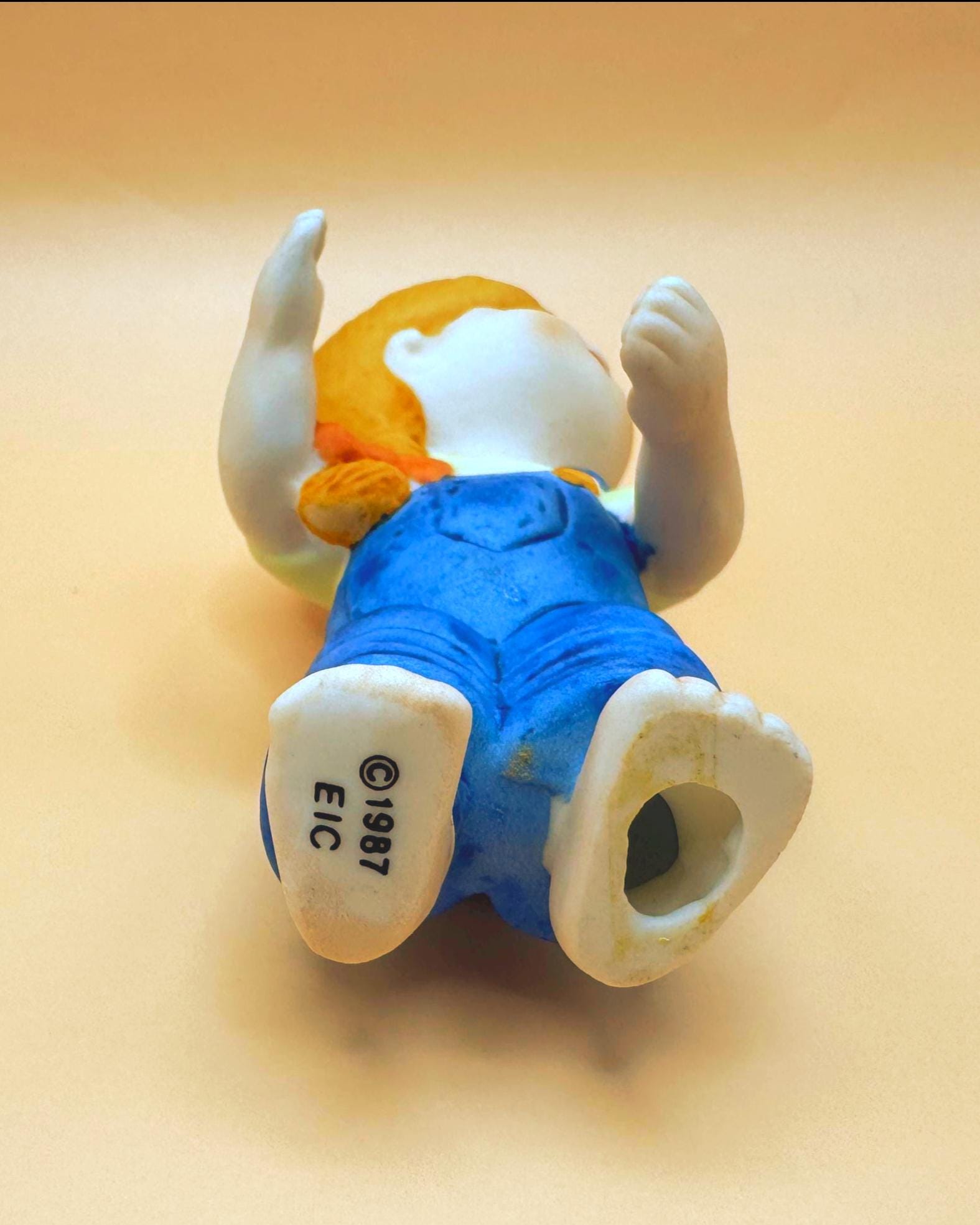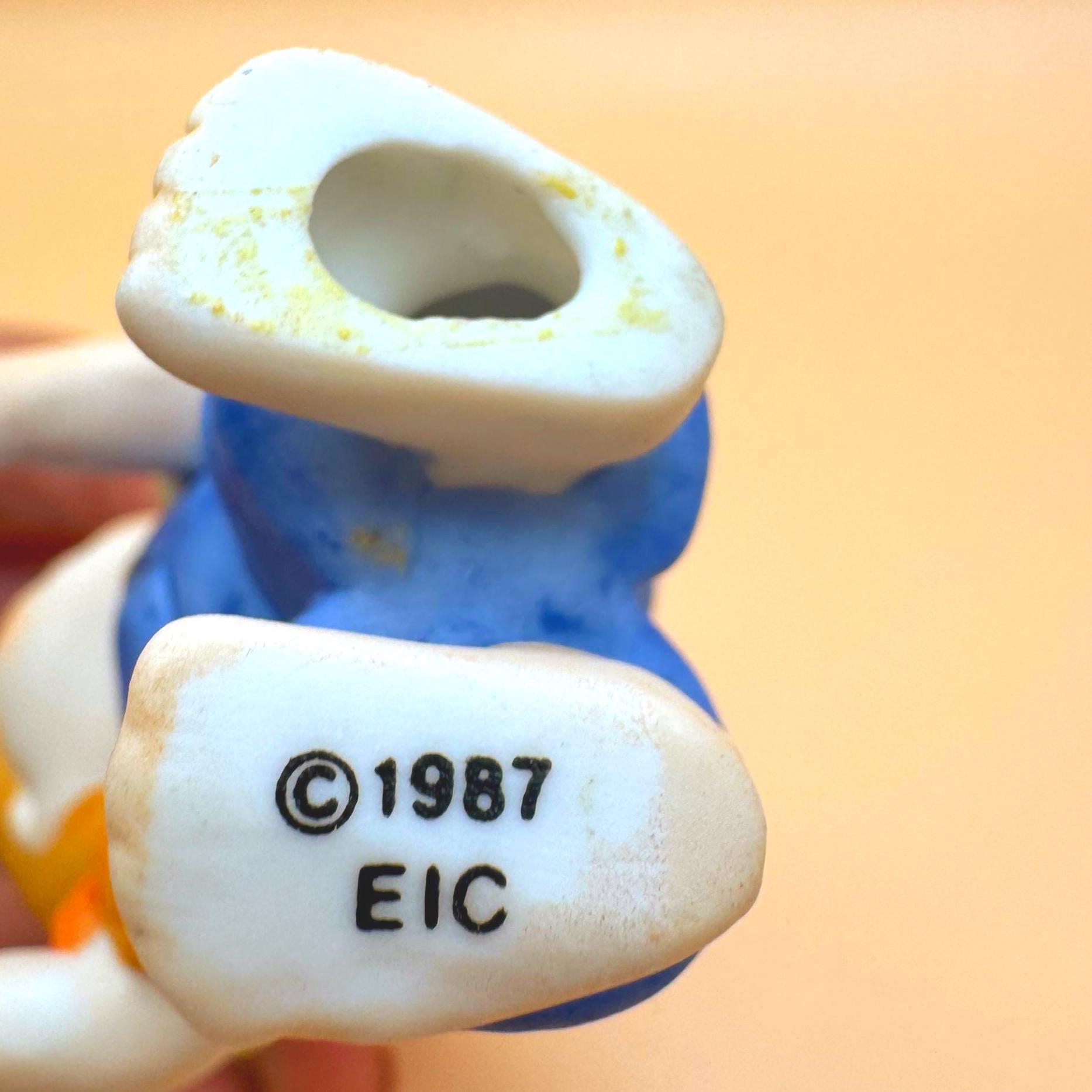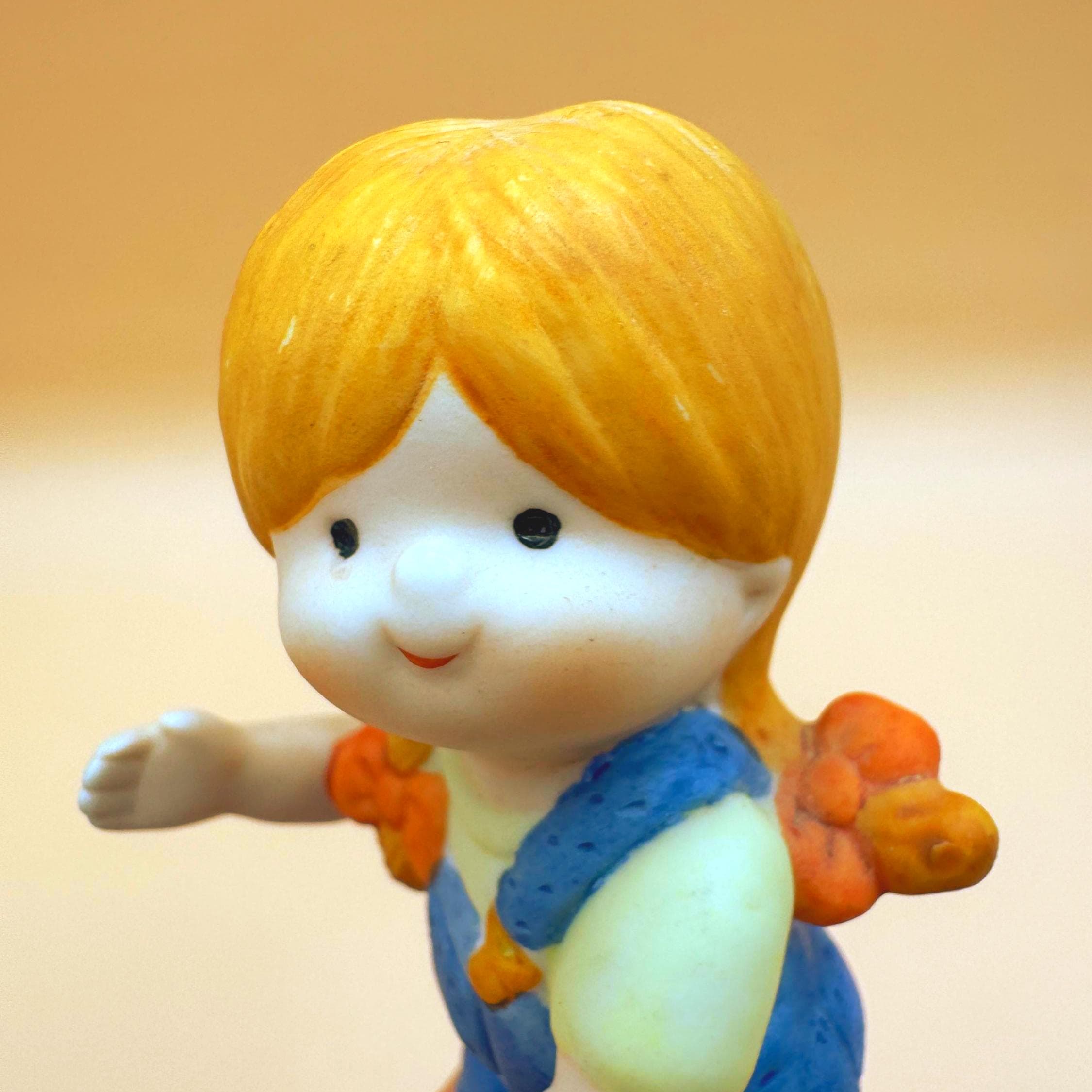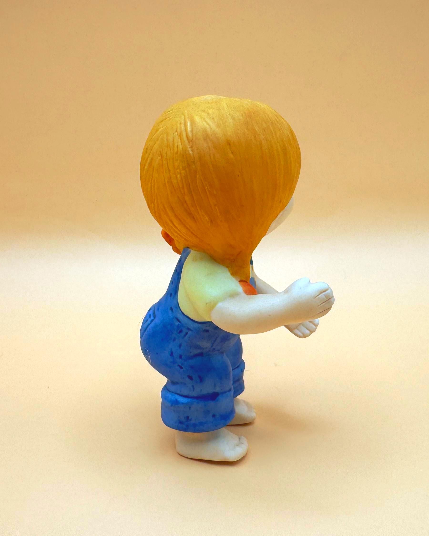 This sweet vintage Enesco Country Cousins girl figurine dates to 1987 and features the cozy, storybook charm the series is known for. Dressed in blue overalls and shown barefoot, she has a gentle expression and a simple pose that gives her a warm, nostalgic feel.