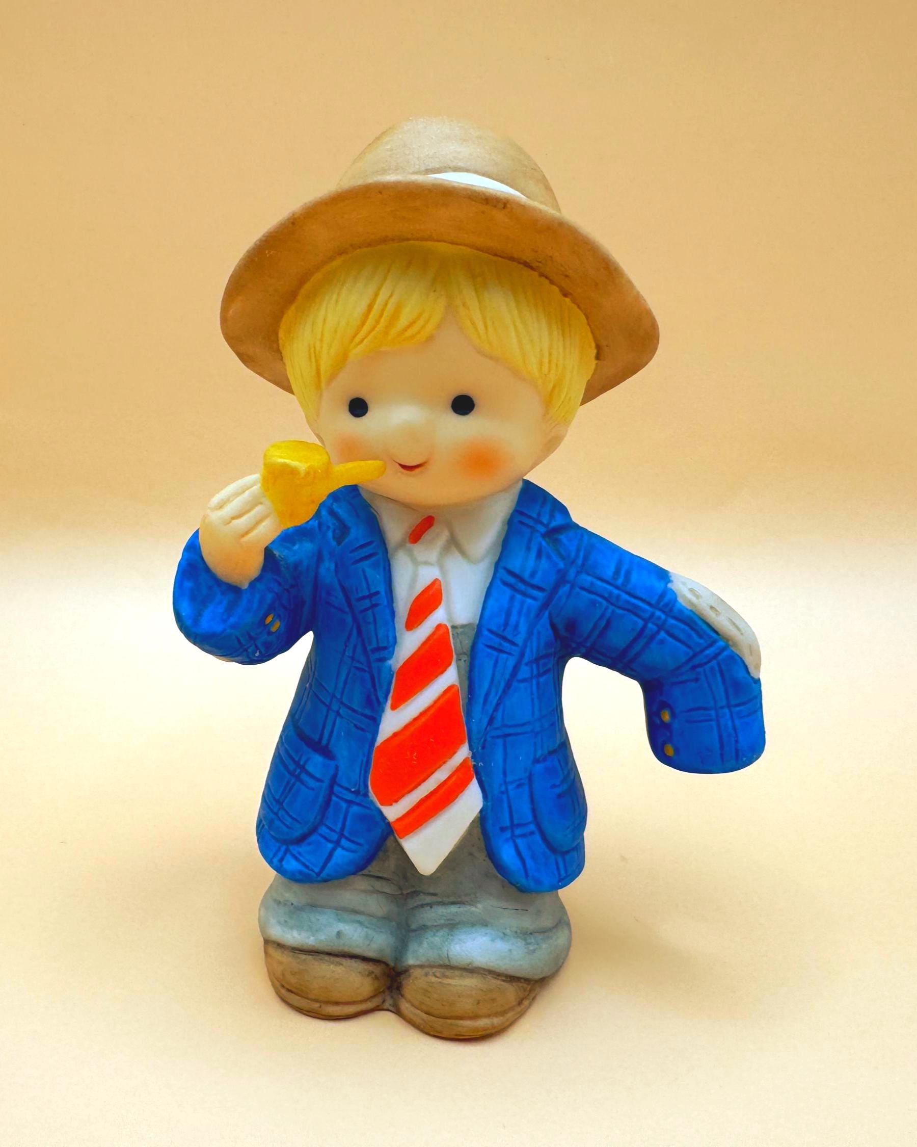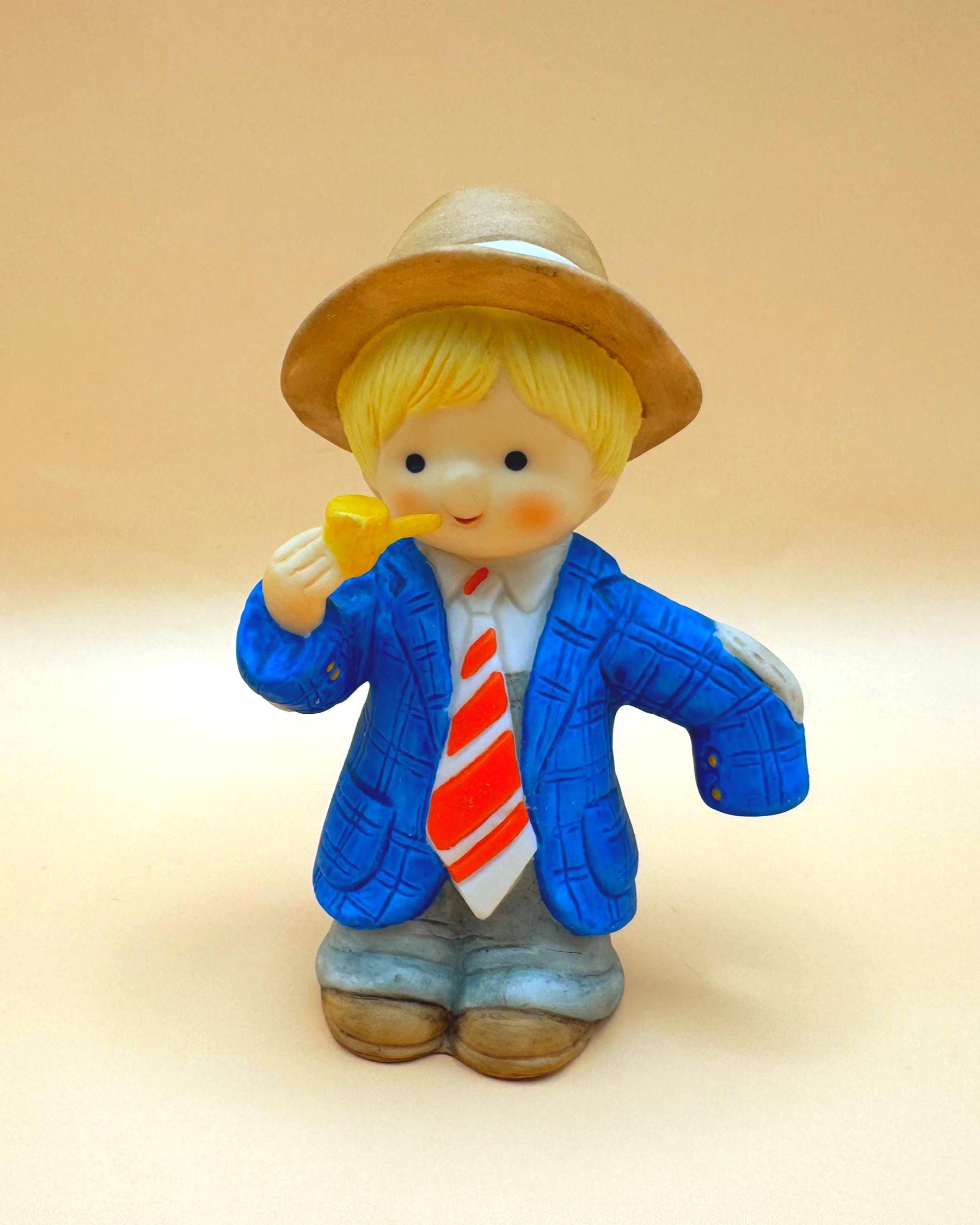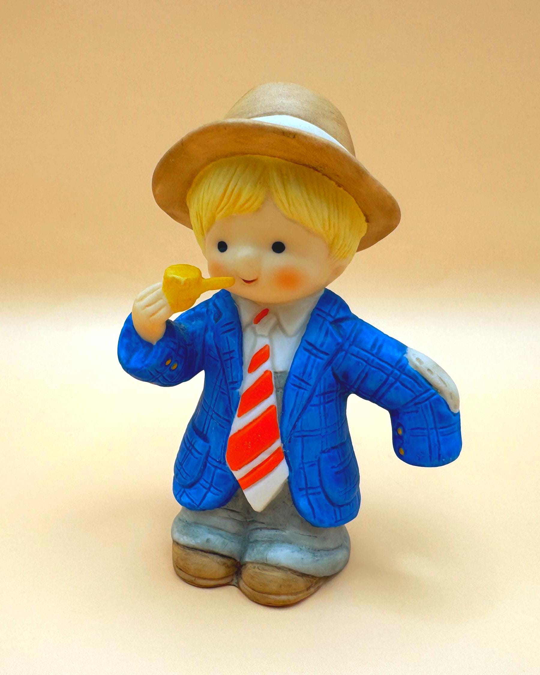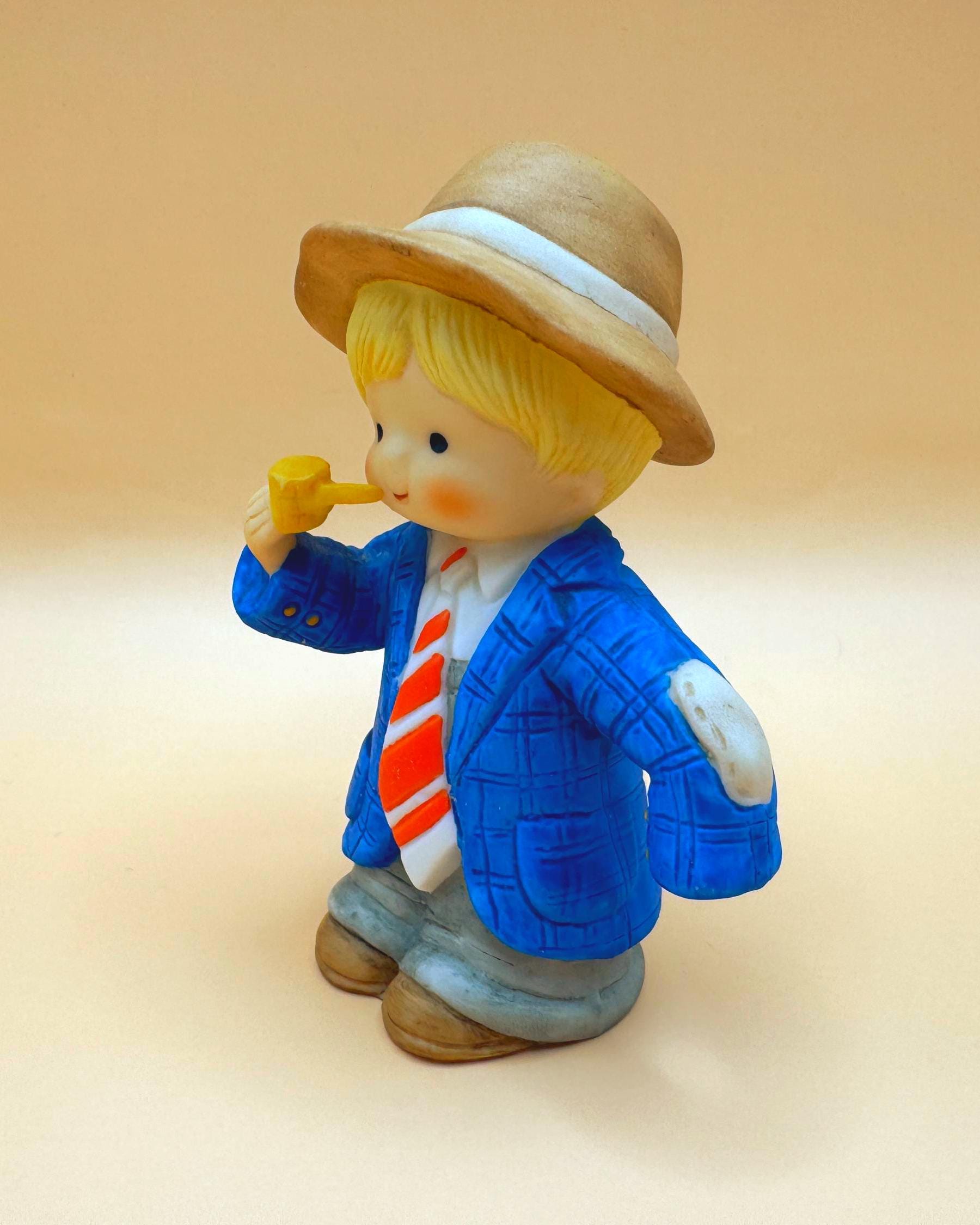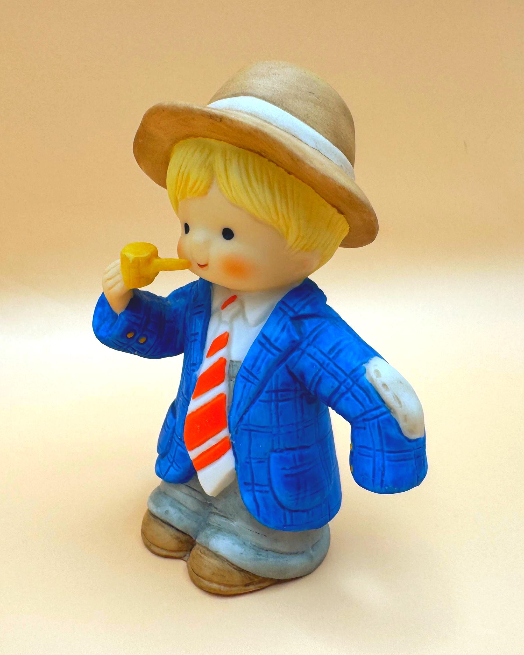 This sweet vintage Enesco Country Cousins figurine features Scooter playing dress-up — wearing “dad’s” oversized jacket and tie with a hat, pretending to be all grown up.