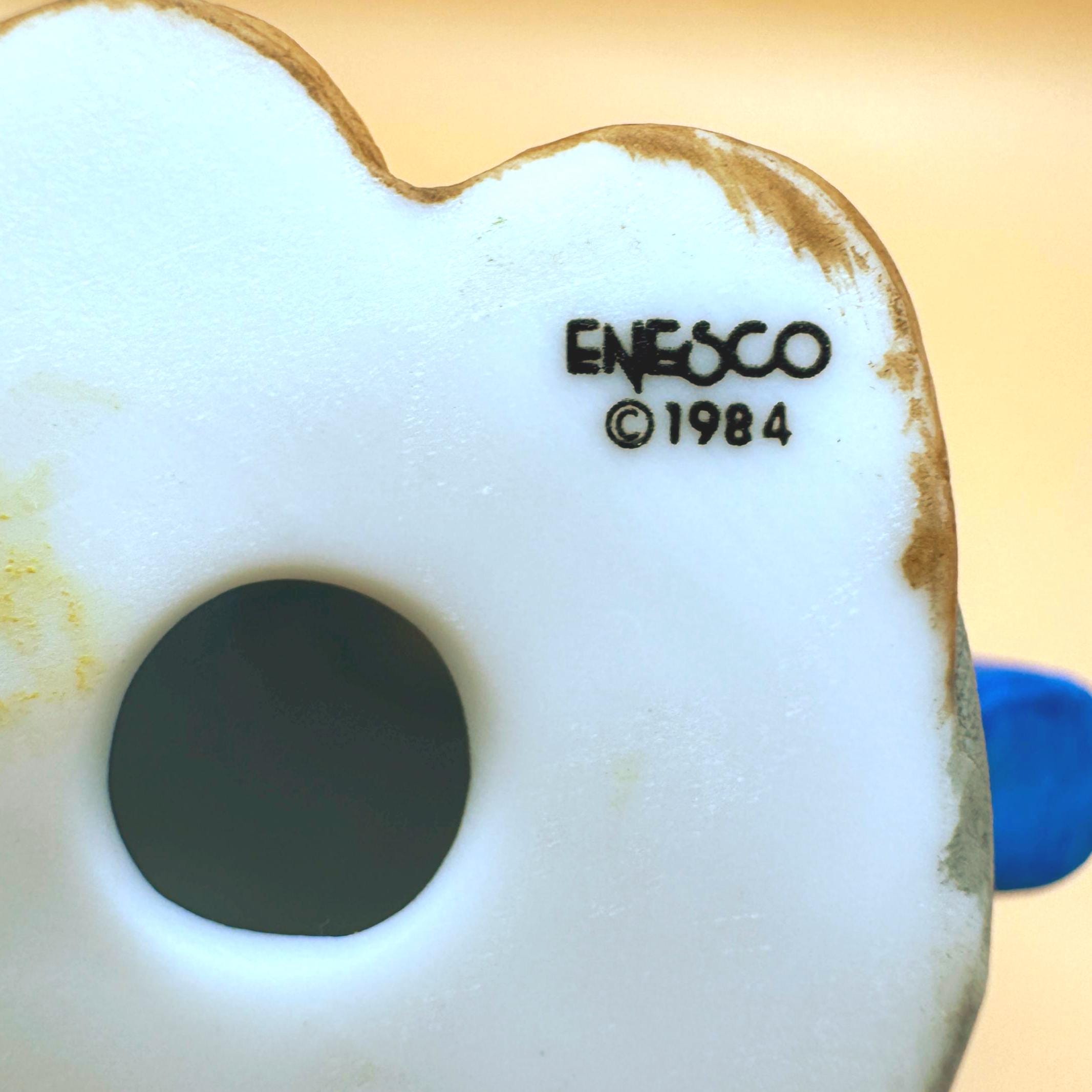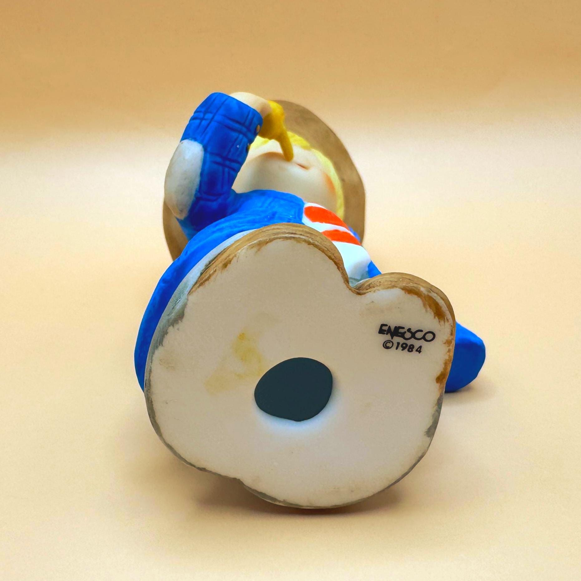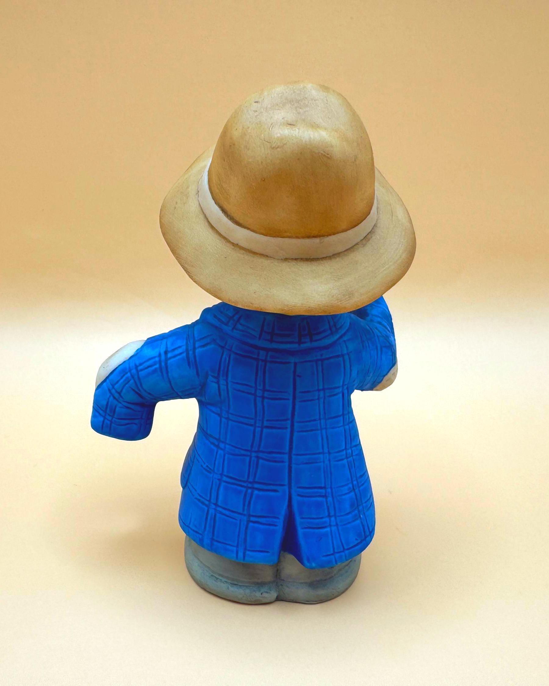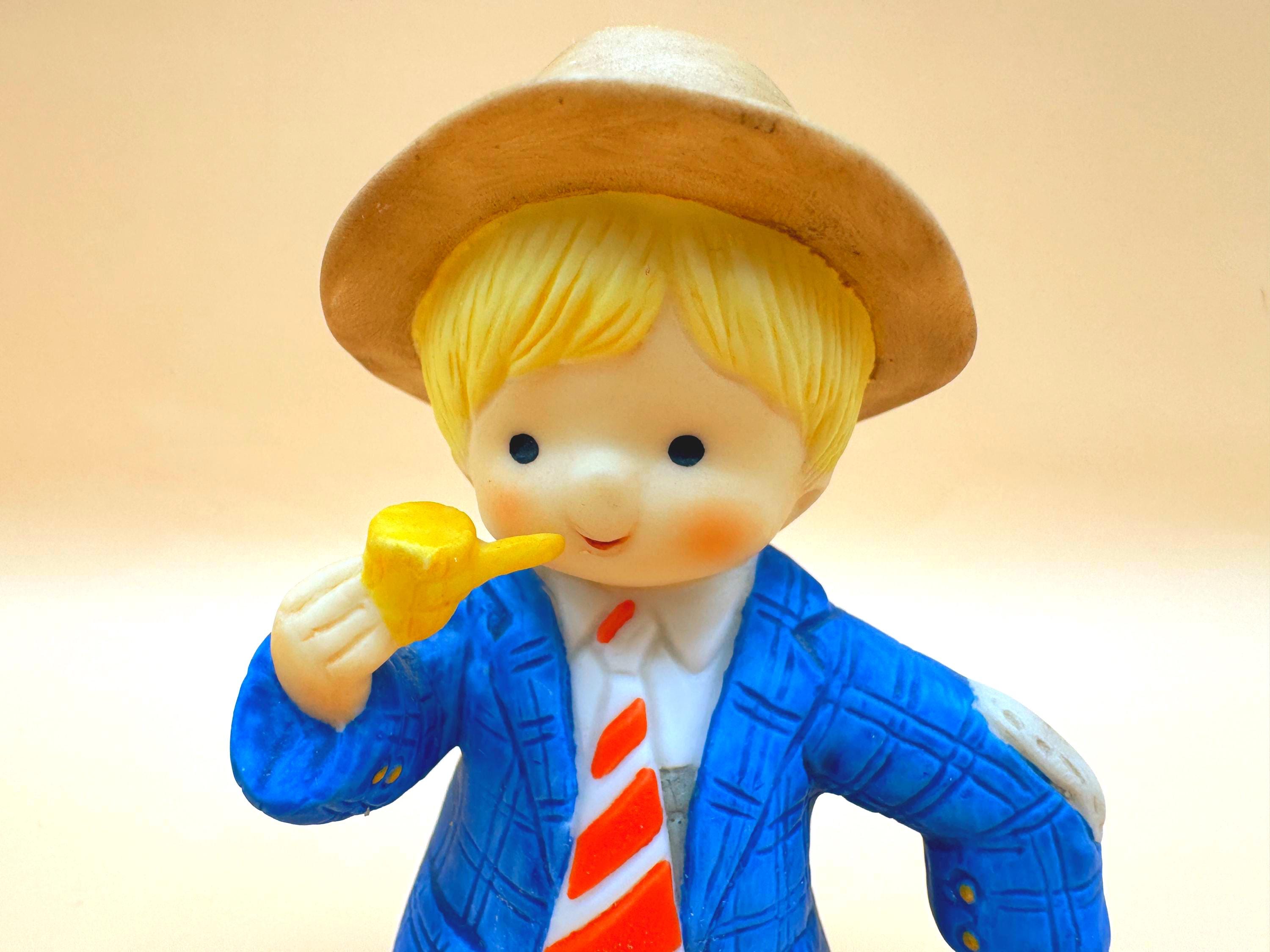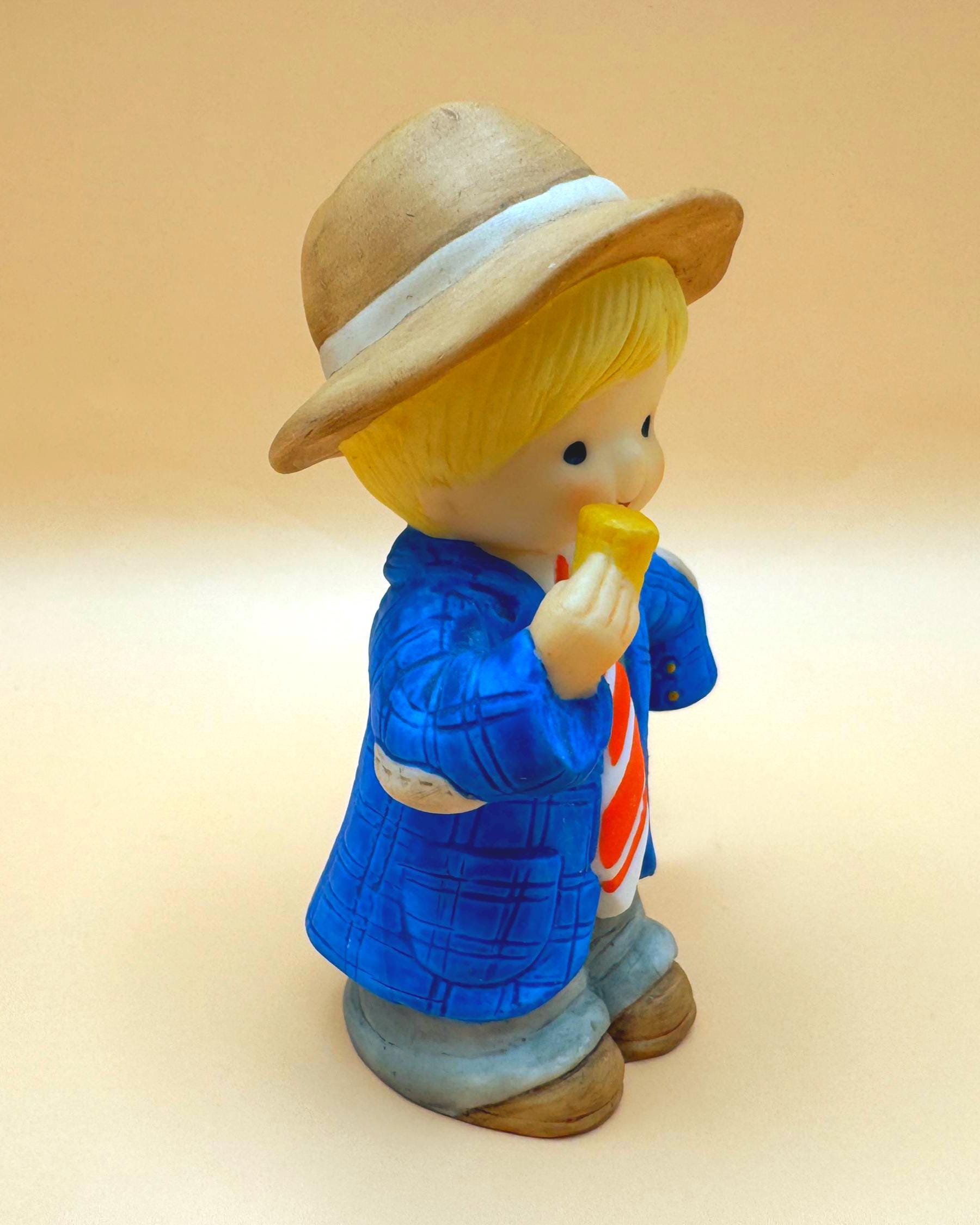 This sweet vintage Enesco Country Cousins figurine features Scooter playing dress-up — wearing “dad’s” oversized jacket and tie with a hat, pretending to be all grown up.