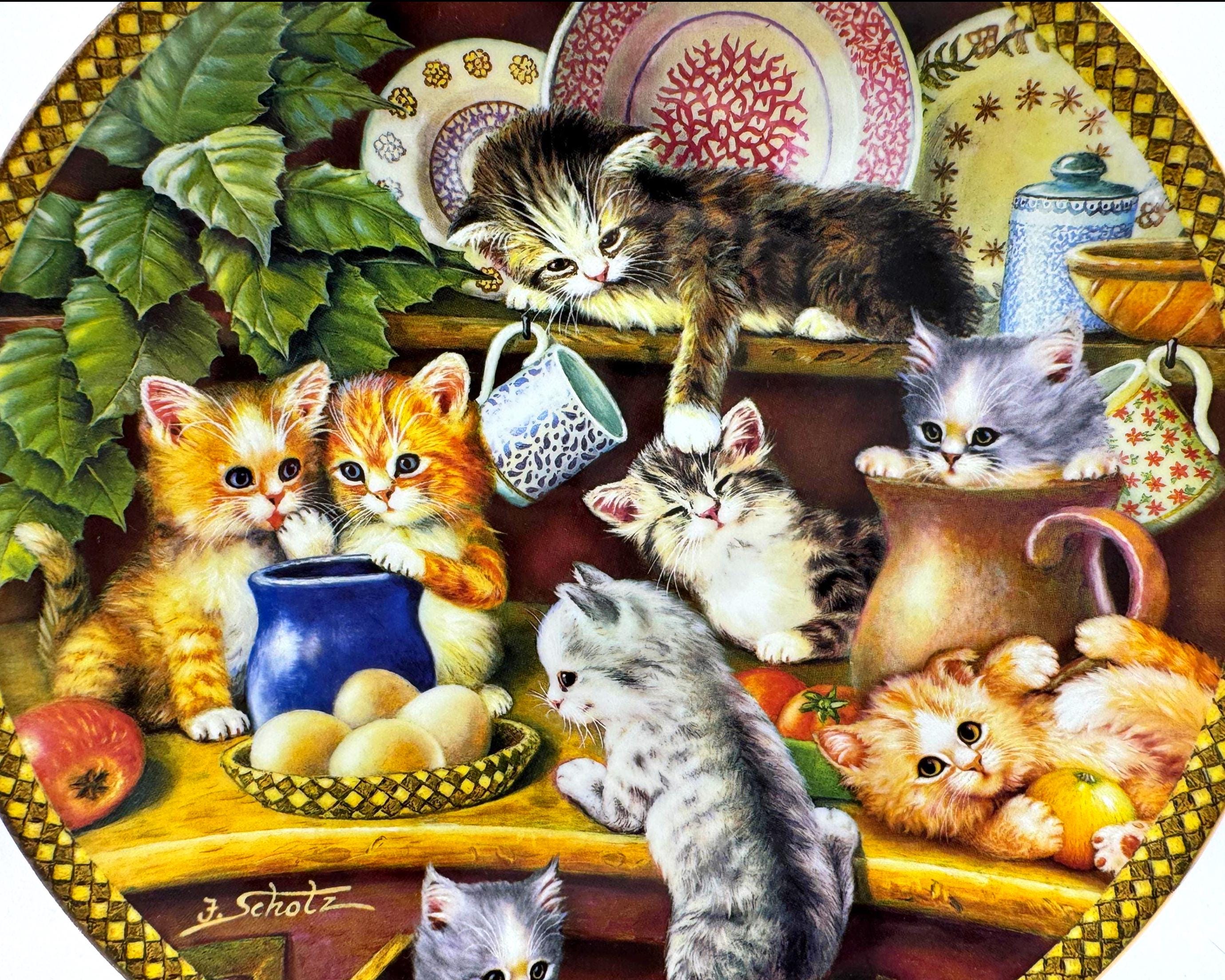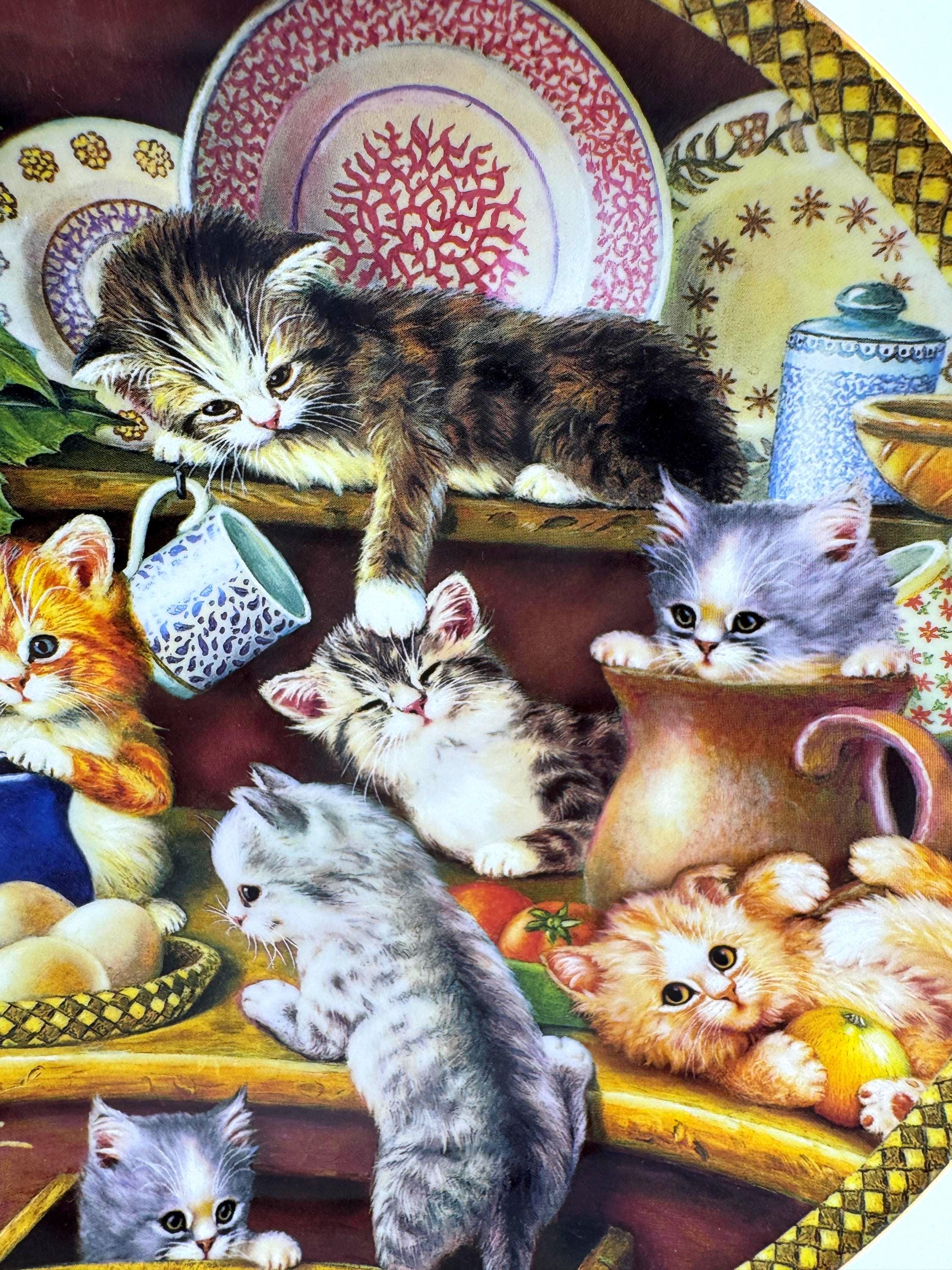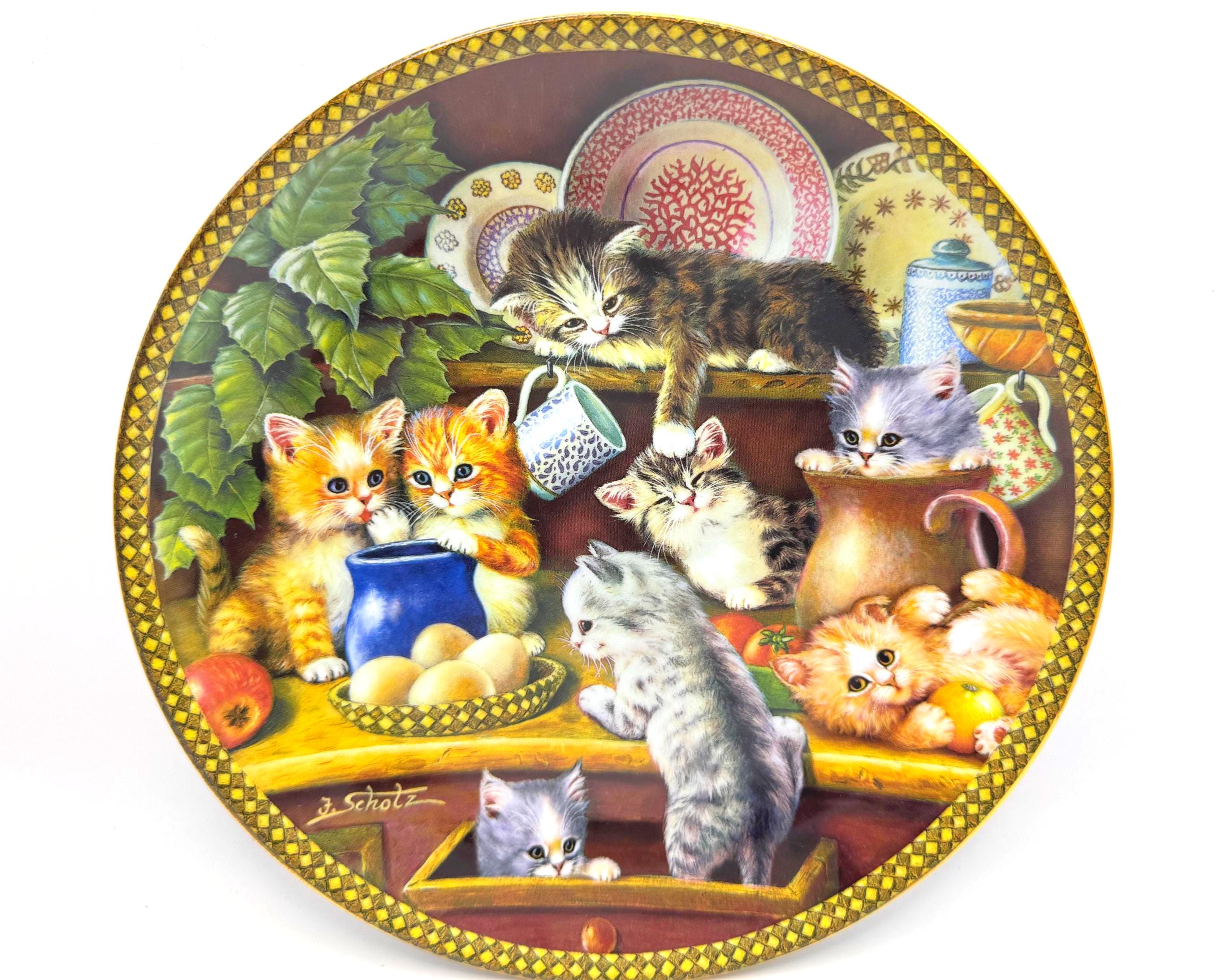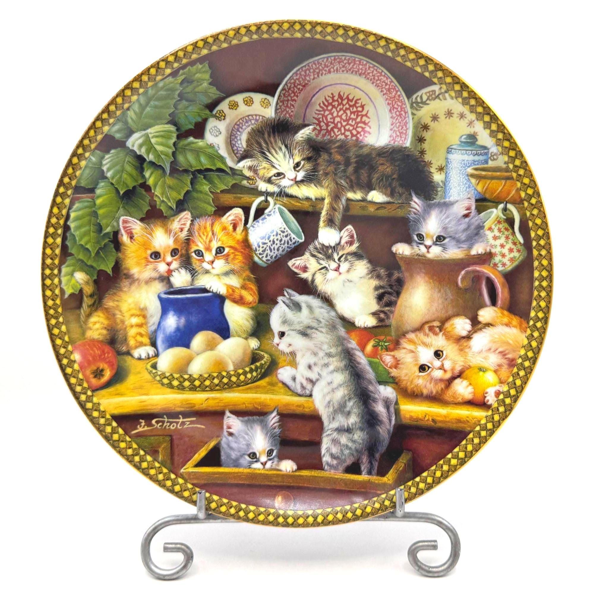 Kitchen Capers is the charming first issue in the Tender Tails collection by beloved artist Jürgen Scholz. This delightful decorative plate captures a heartwarming scene of playful kittens exploring a kitchen cupboard filled with dishes and cozy treasures.