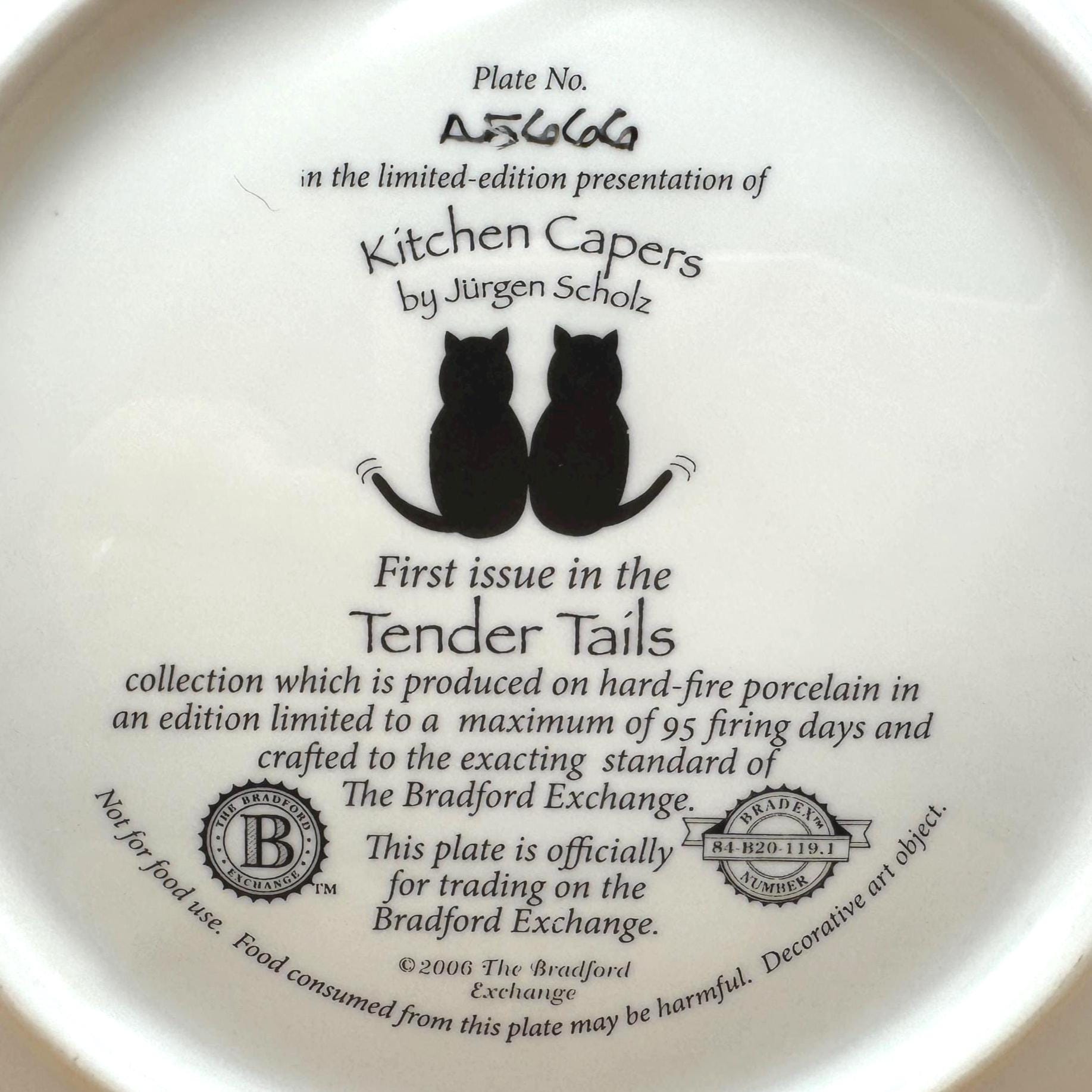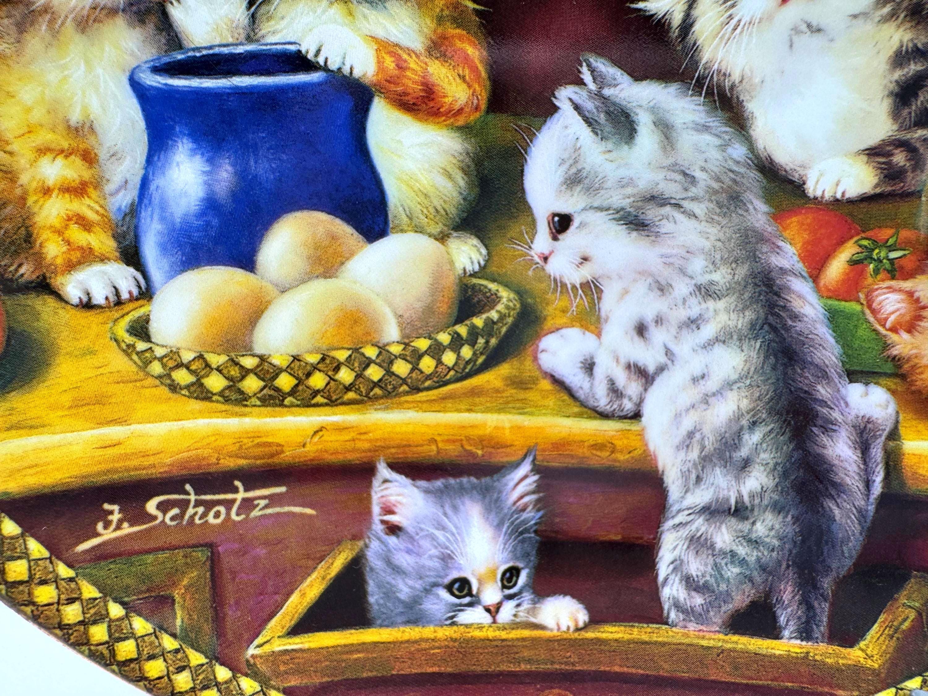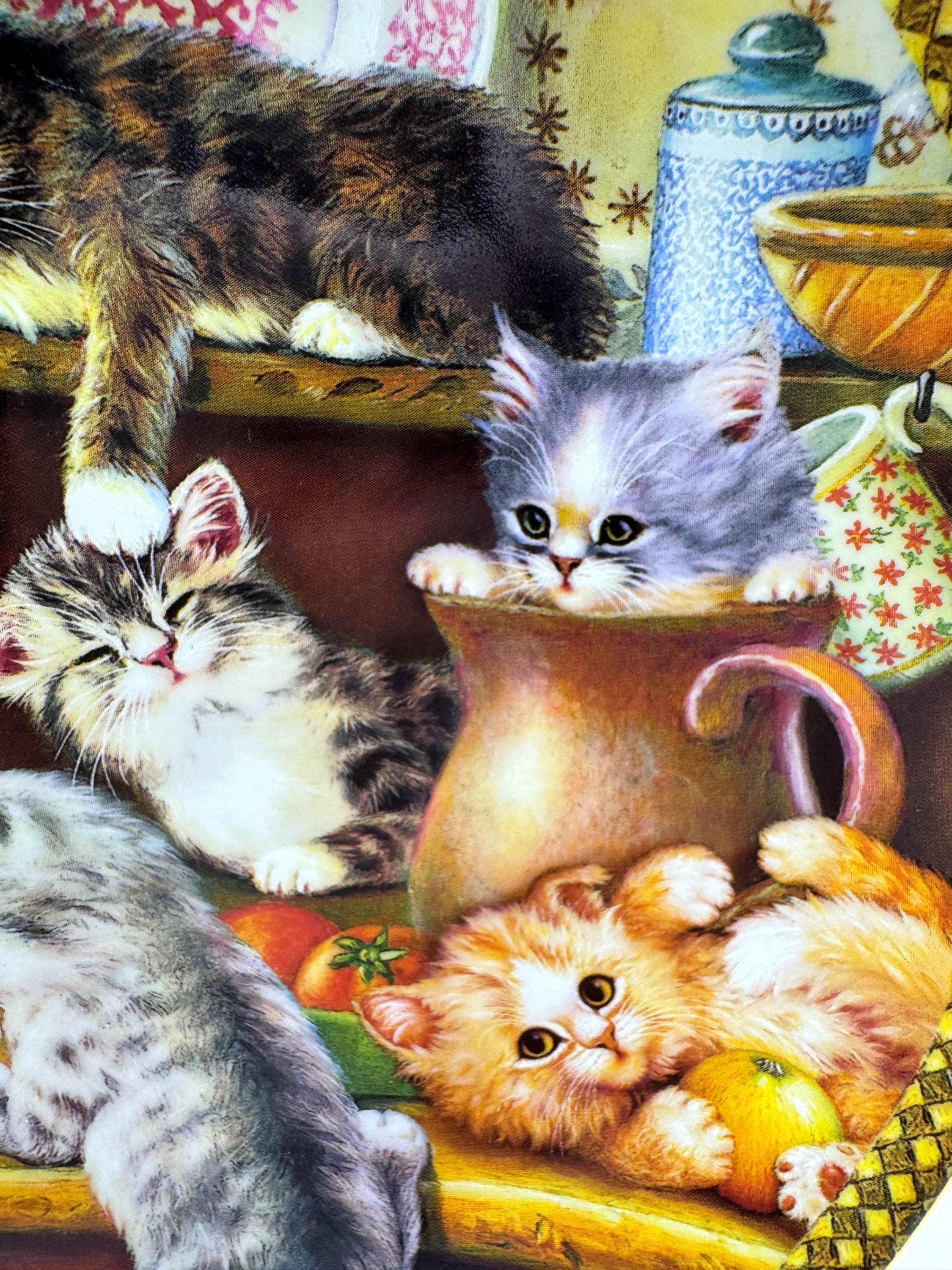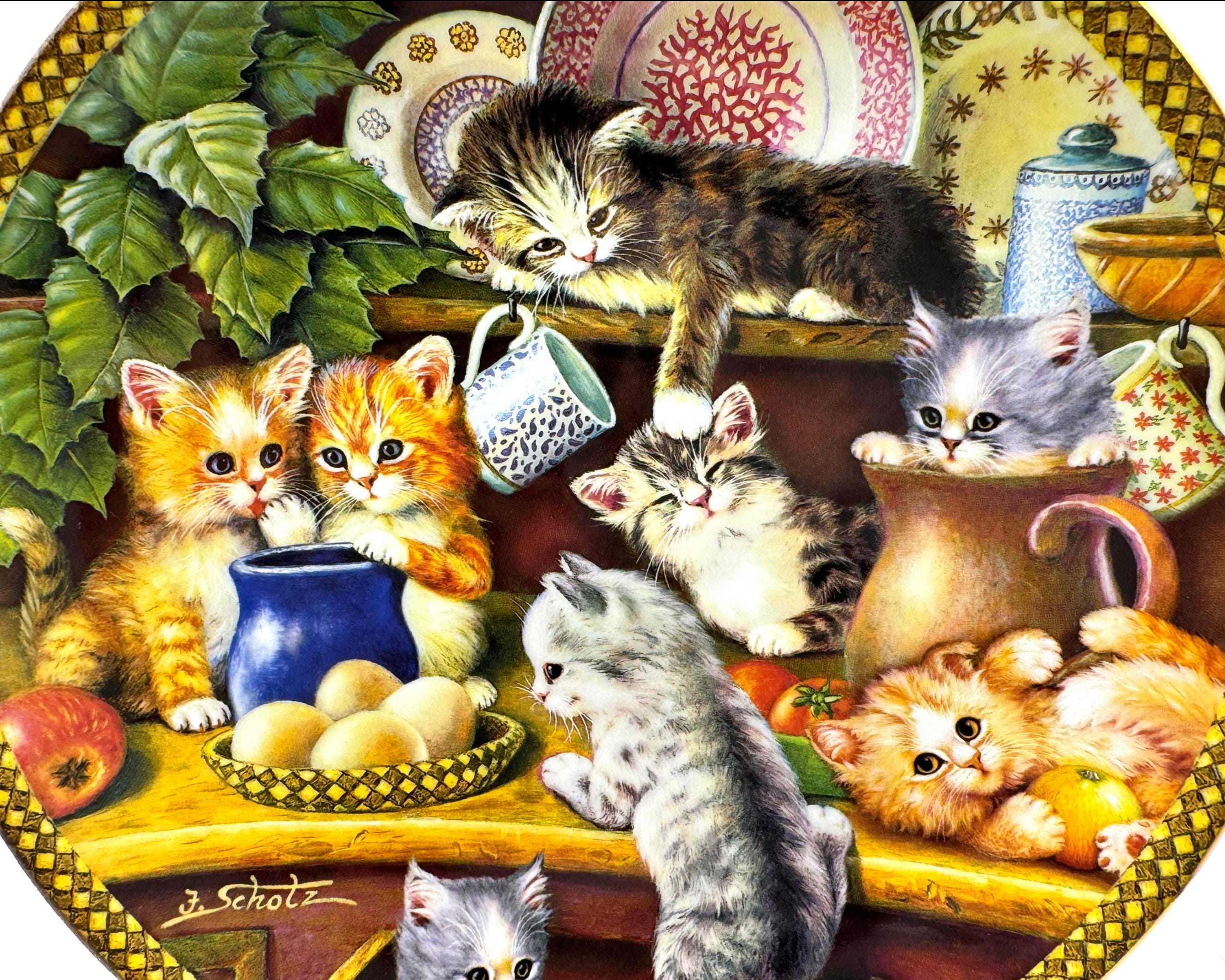 Kitchen Capers is the charming first issue in the Tender Tails collection by beloved artist Jürgen Scholz. This delightful decorative plate captures a heartwarming scene of playful kittens exploring a kitchen cupboard filled with dishes and cozy treasures.