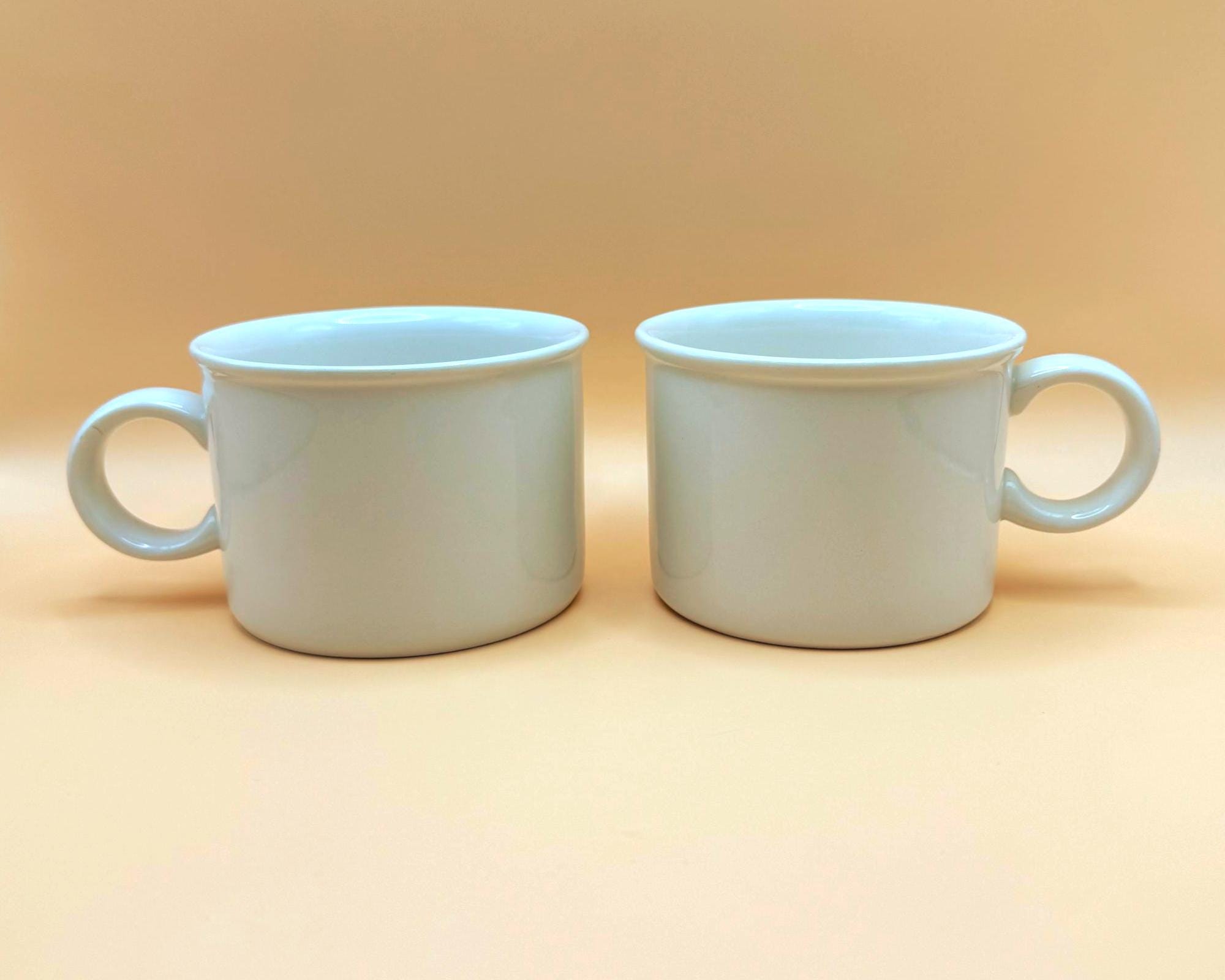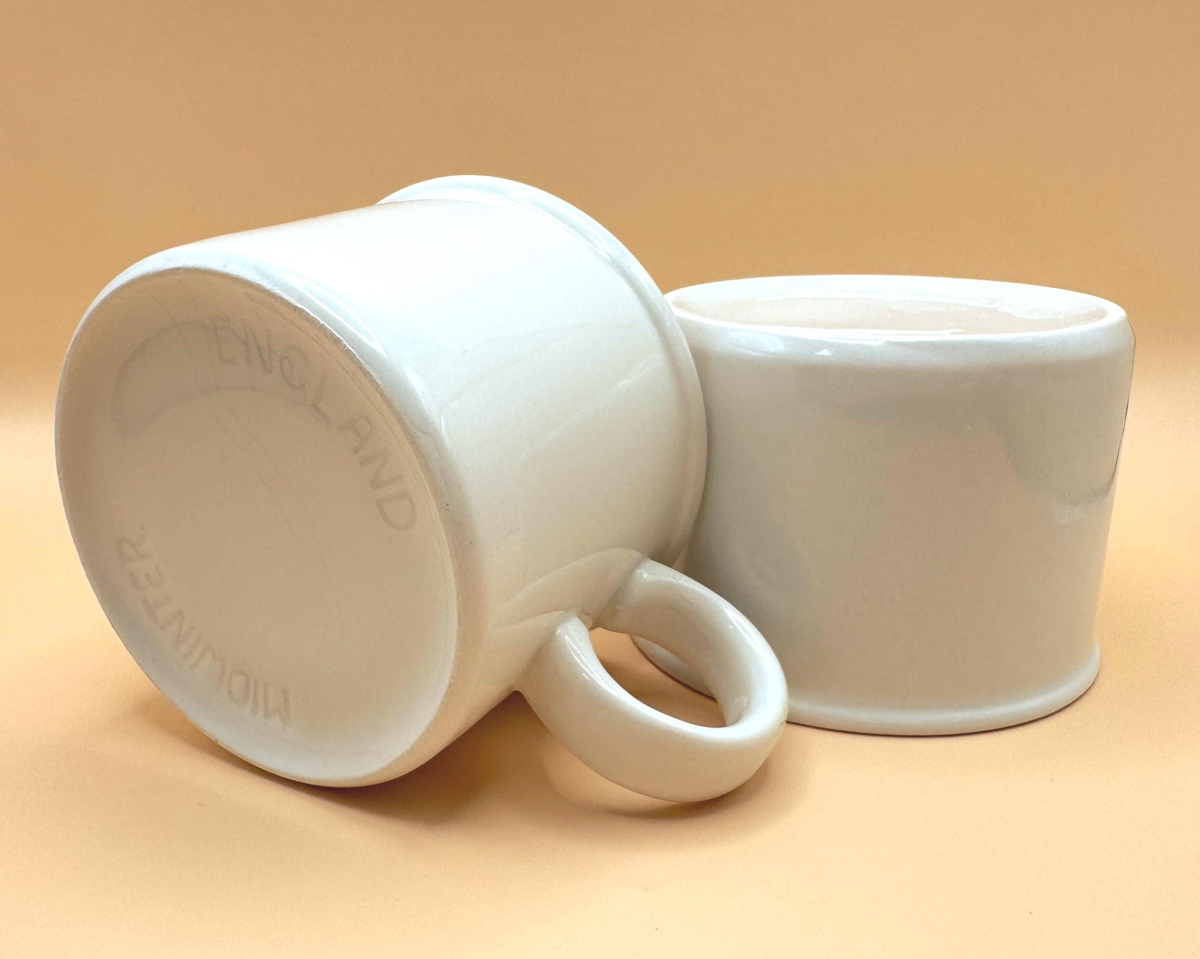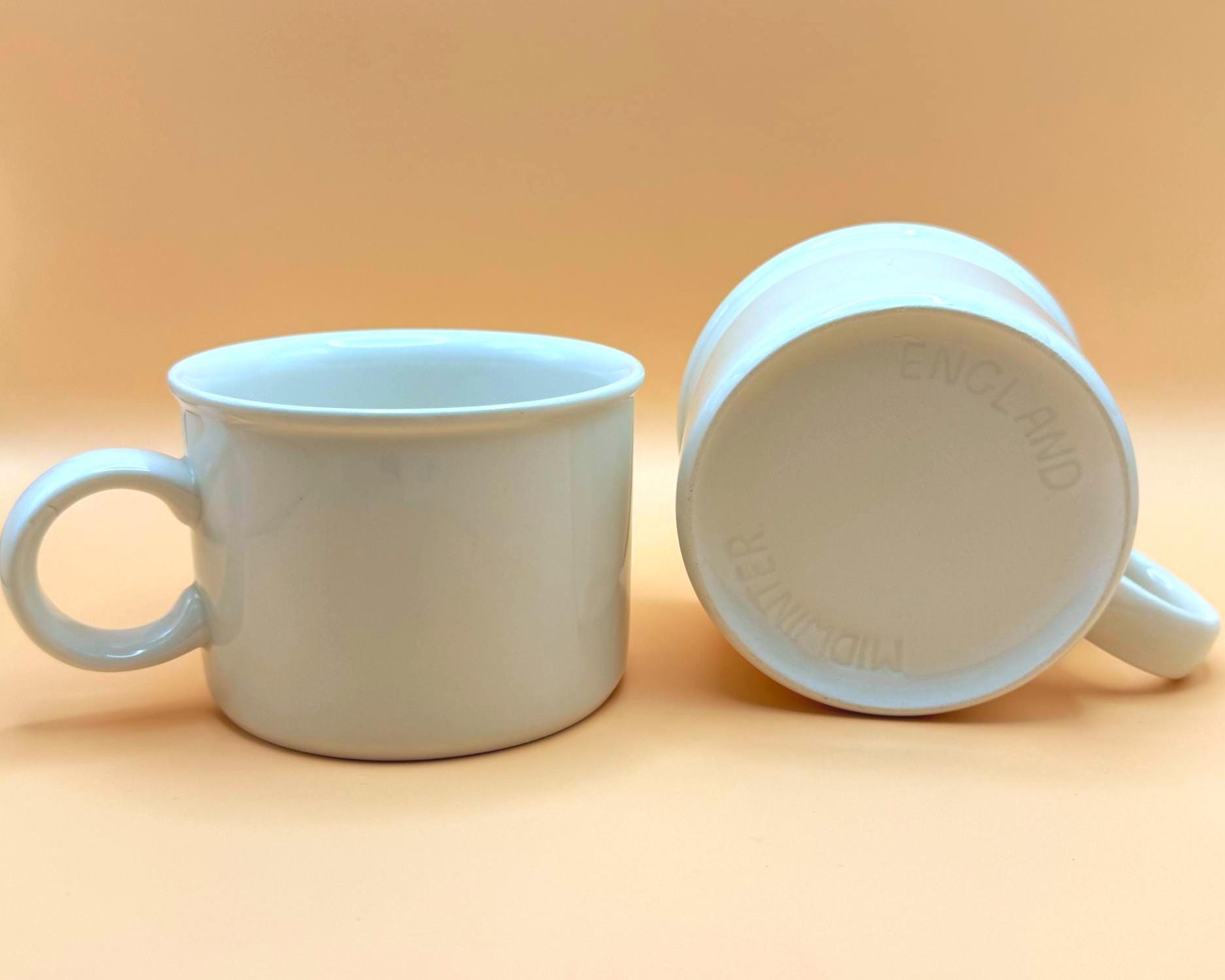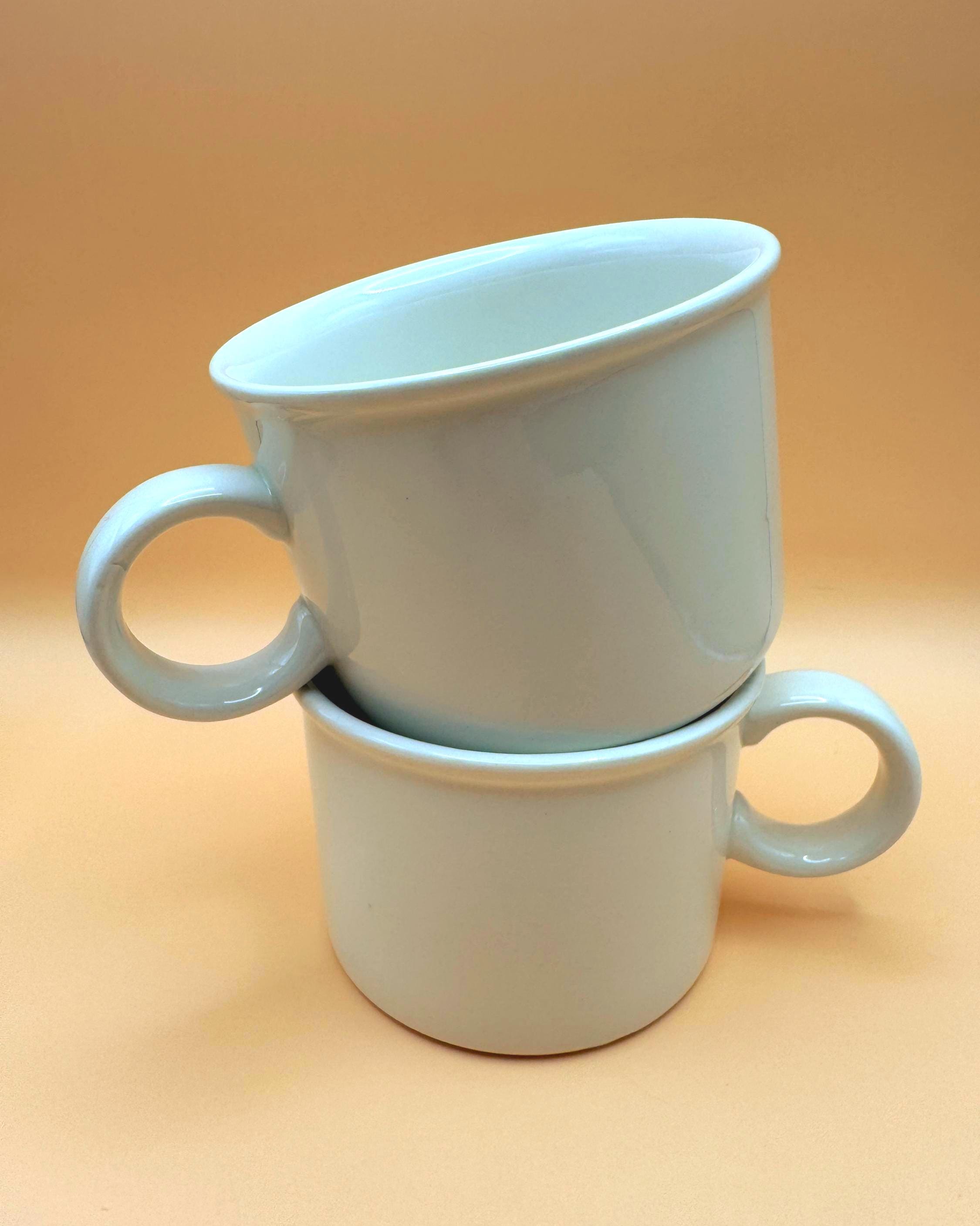 These sturdy, straight-sided white mugs have that unmistakable 1960s British coffee bar feel — simple, substantial, and timeless. Their clean silhouette blends effortlessly into farmhouse kitchens, minimalist spaces, or an ironstone collection.