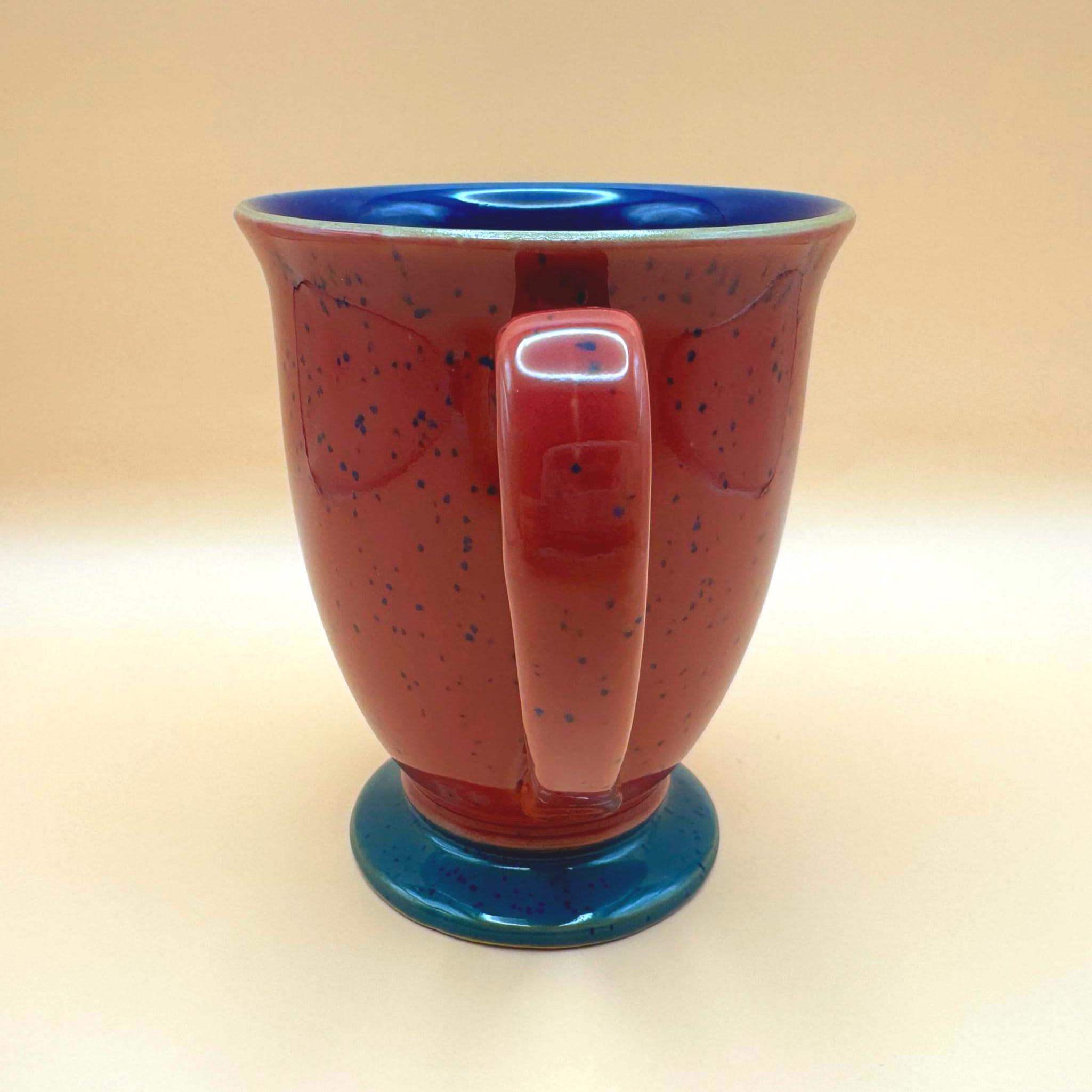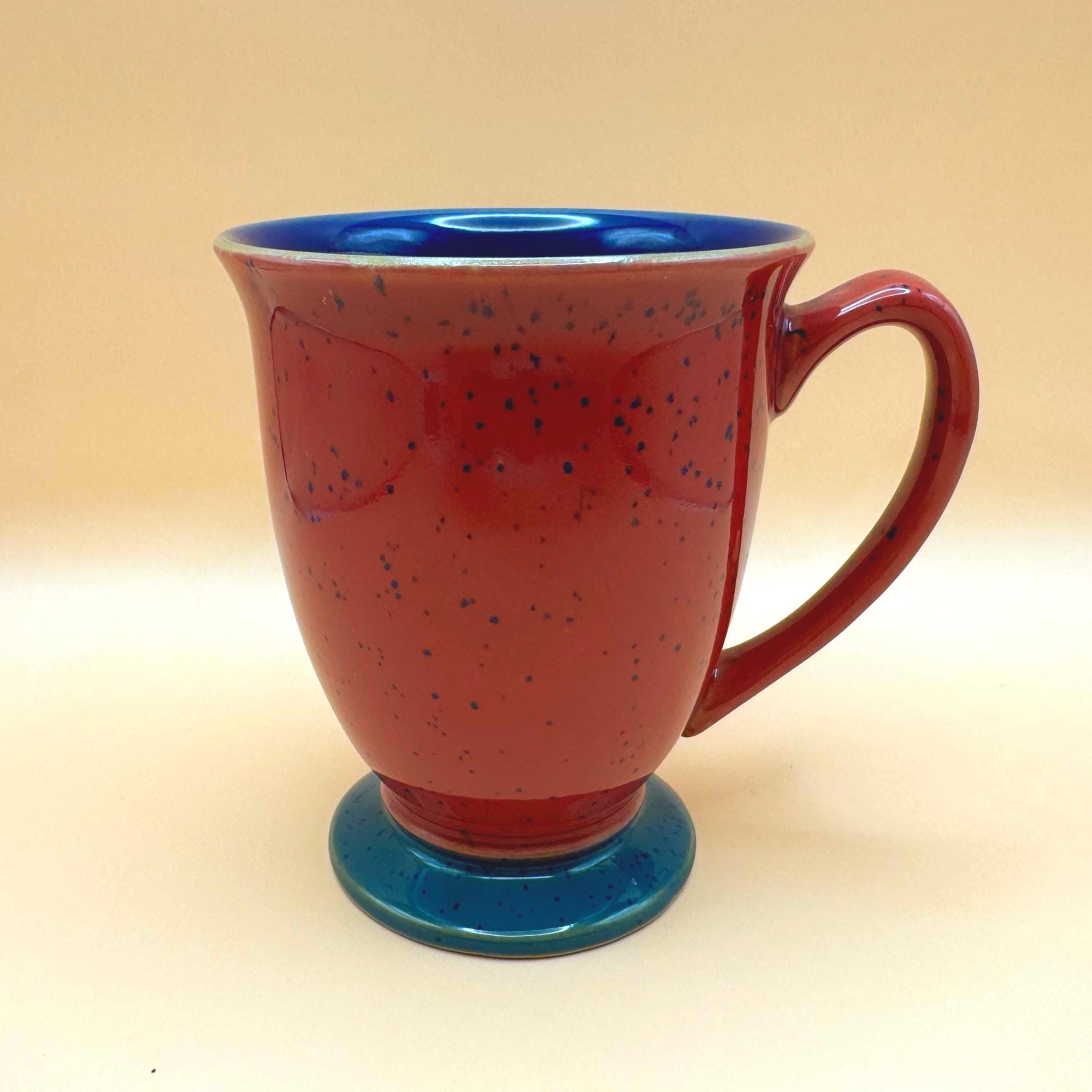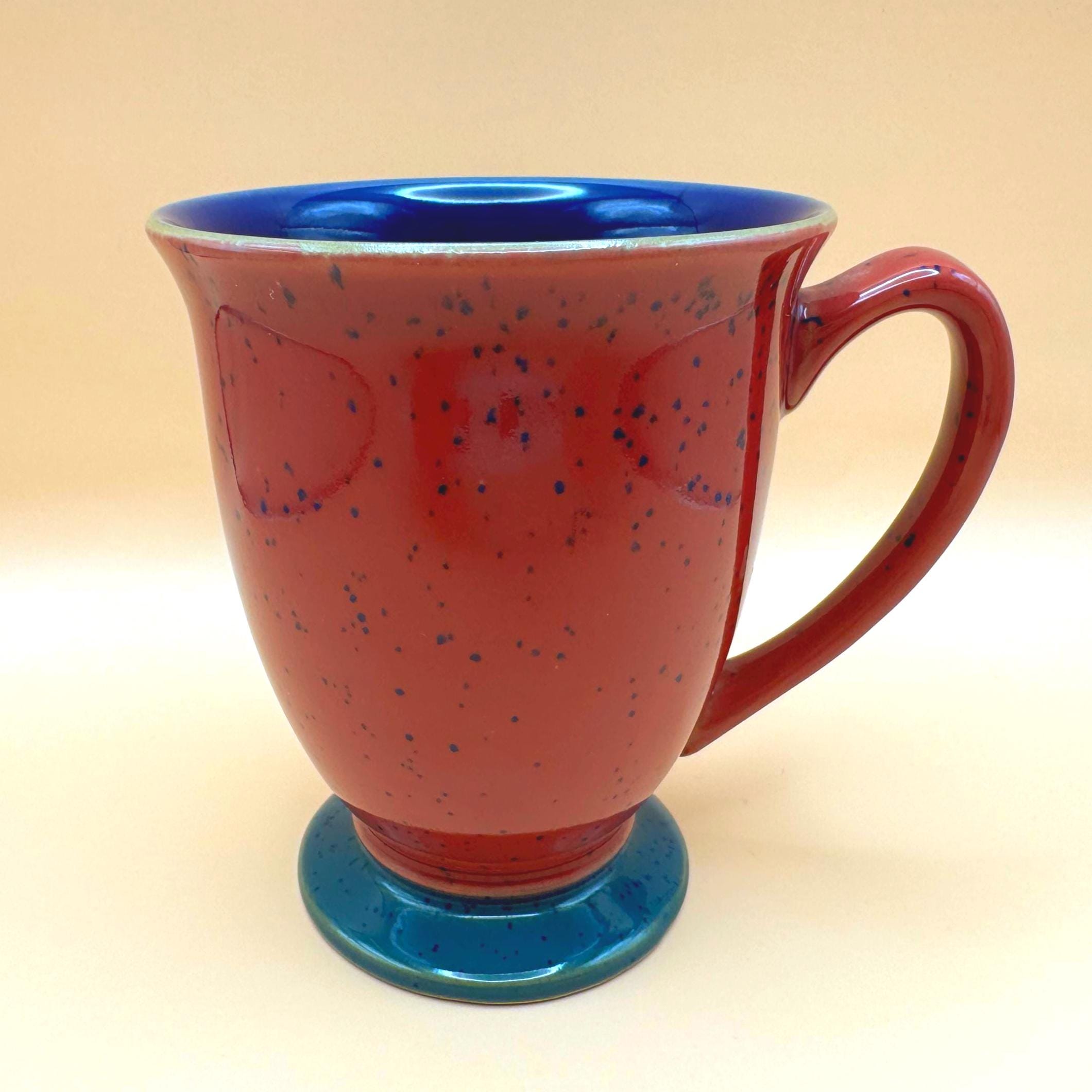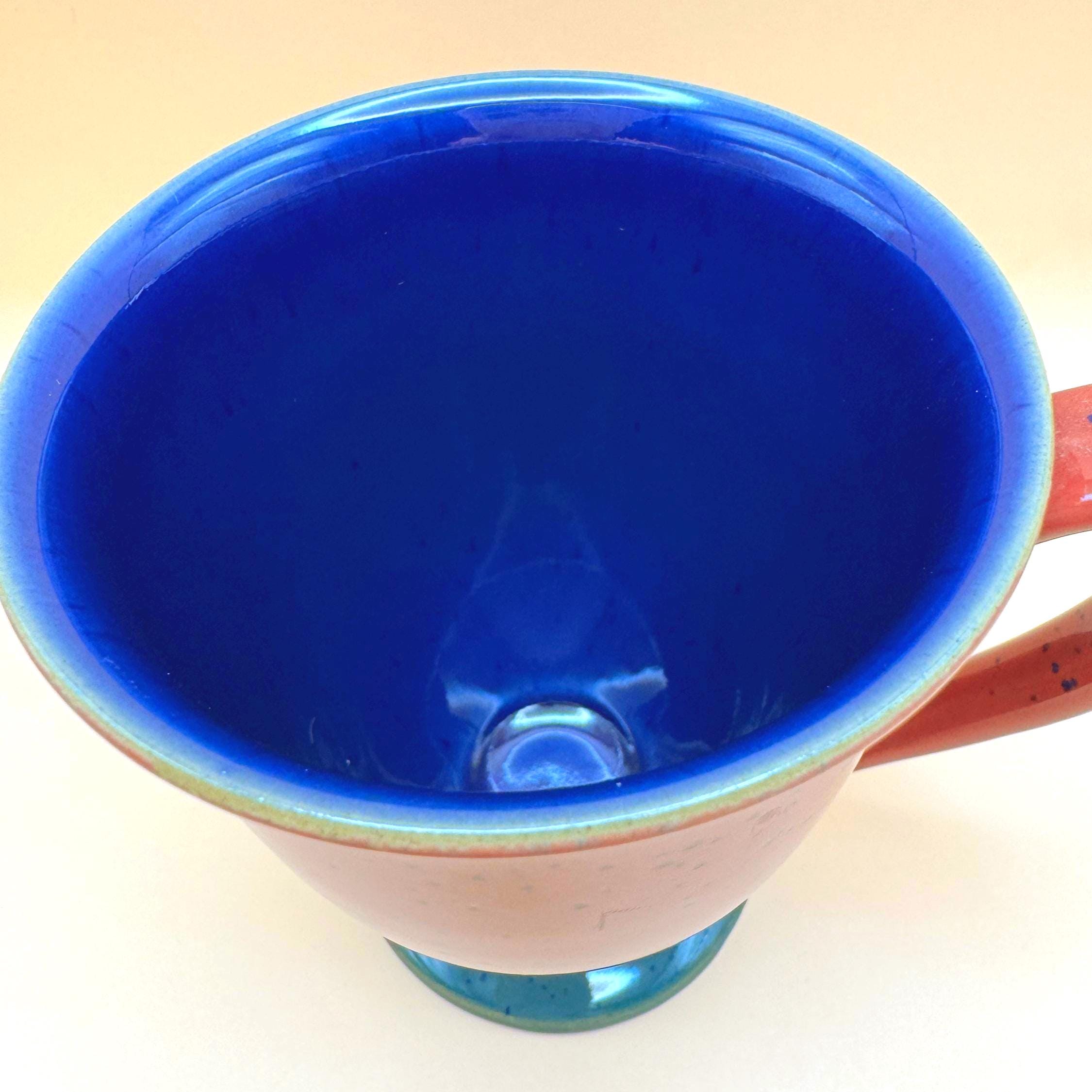 These mugs feature a rich burgundy speckled glaze exterior, complemented by a striking deep cobalt blue interior and a contrasting teal pedestal base. The slightly flared shape and comfortable handle make them perfect for morning coffee, tea, or cozy evening cocoa.