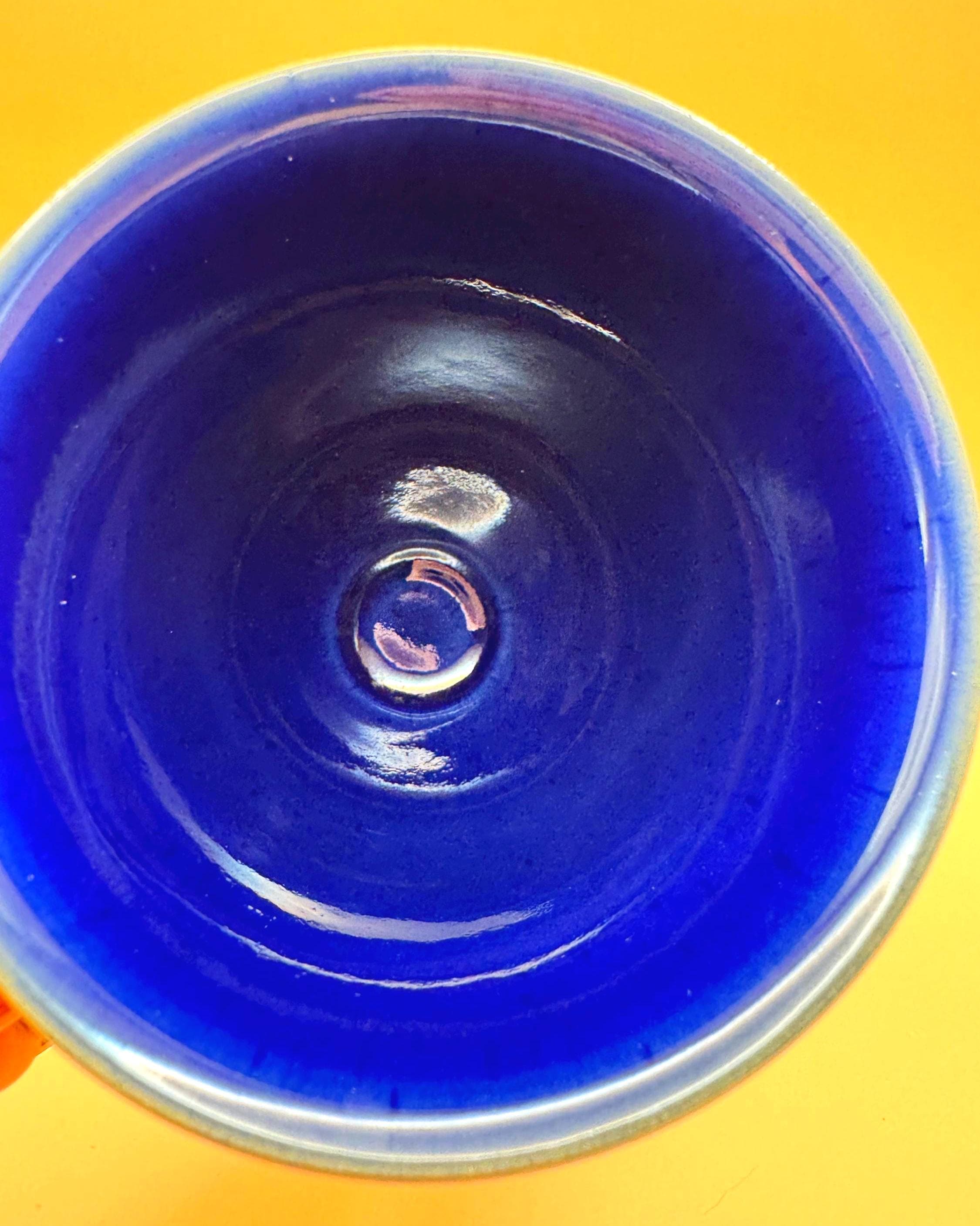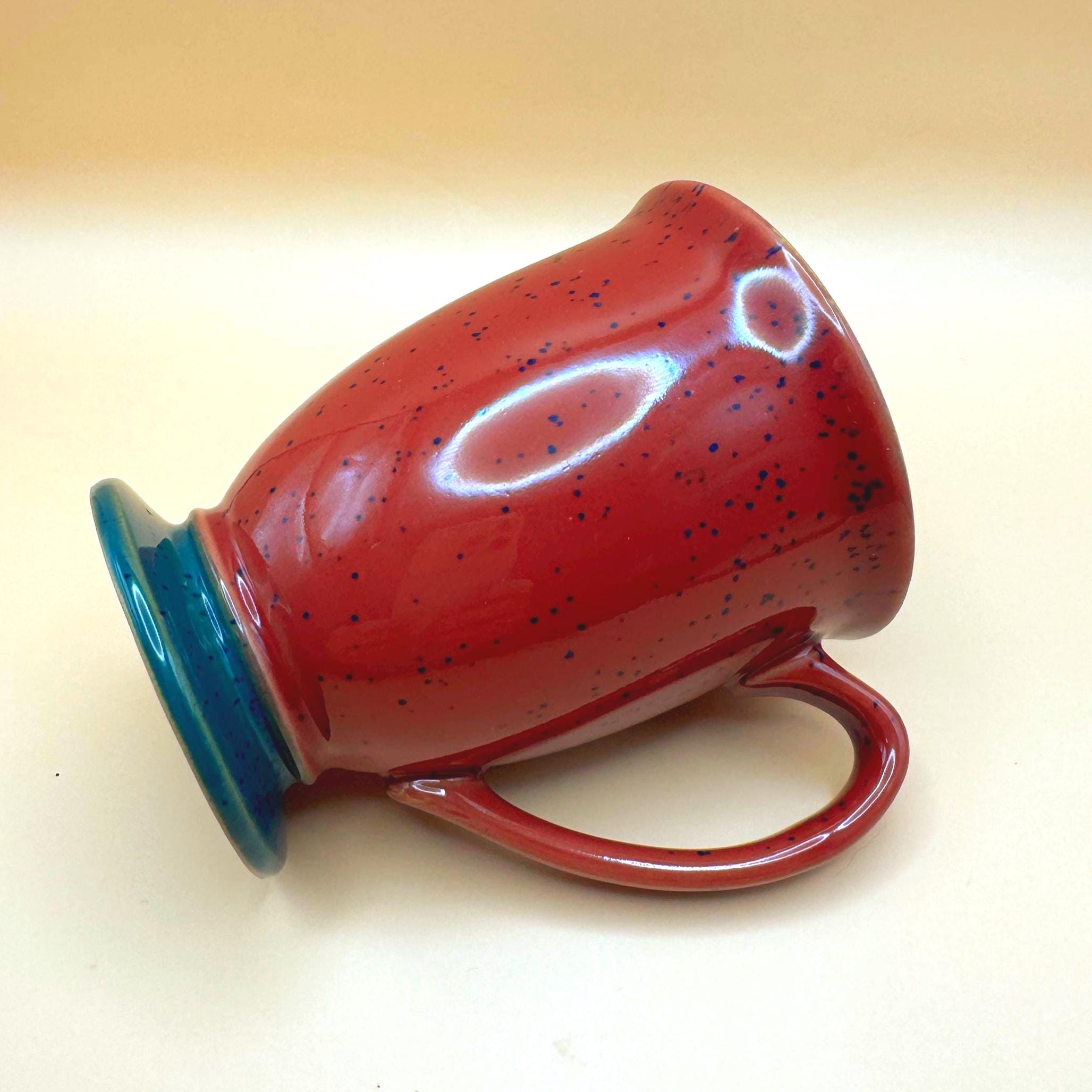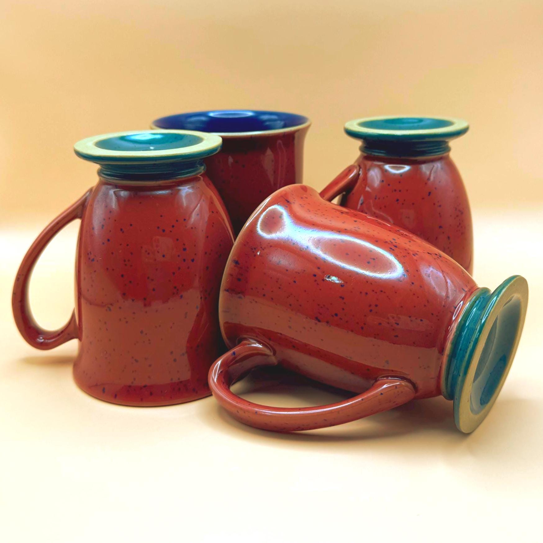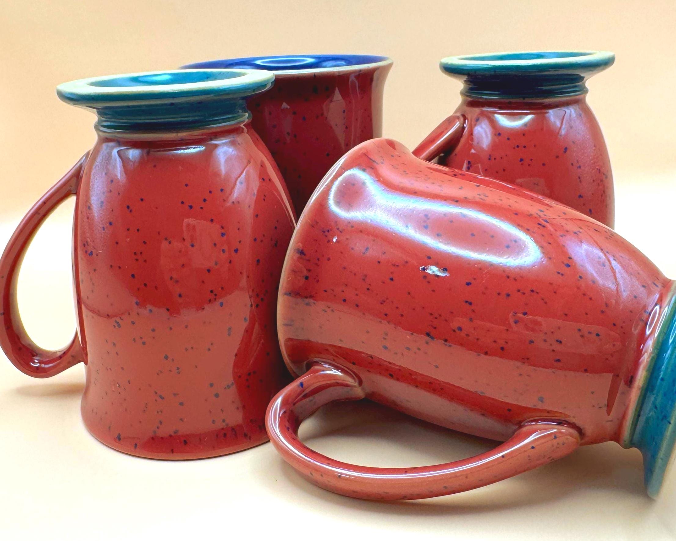These mugs feature a rich burgundy speckled glaze exterior, complemented by a striking deep cobalt blue interior and a contrasting teal pedestal base. The slightly flared shape and comfortable handle make them perfect for morning coffee, tea, or cozy evening cocoa.