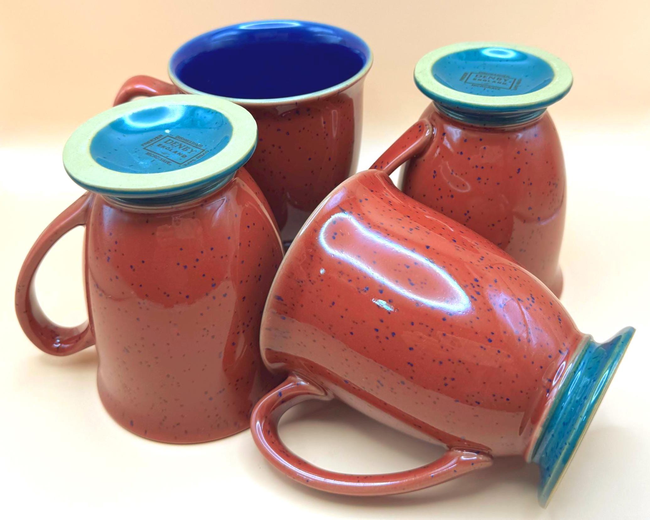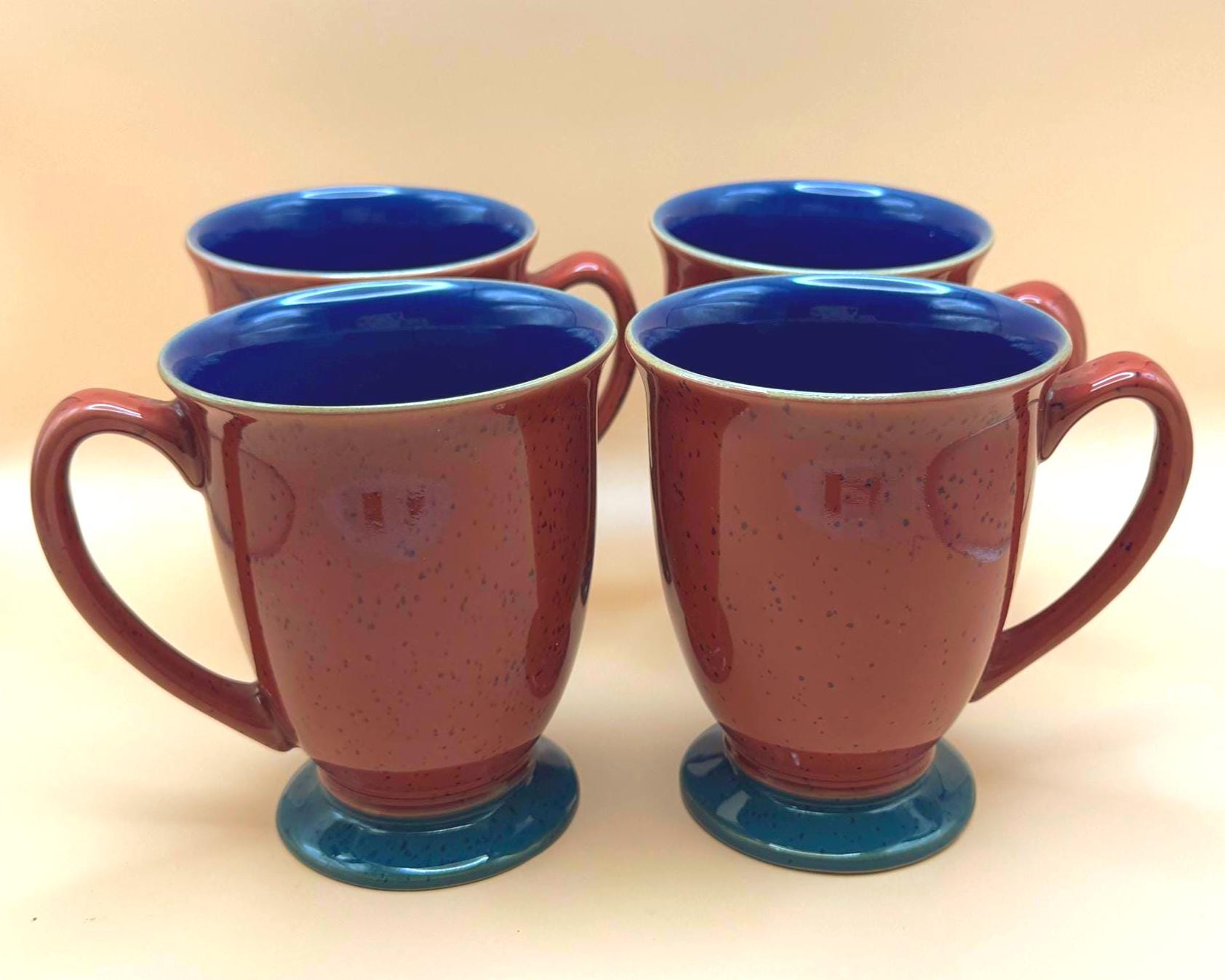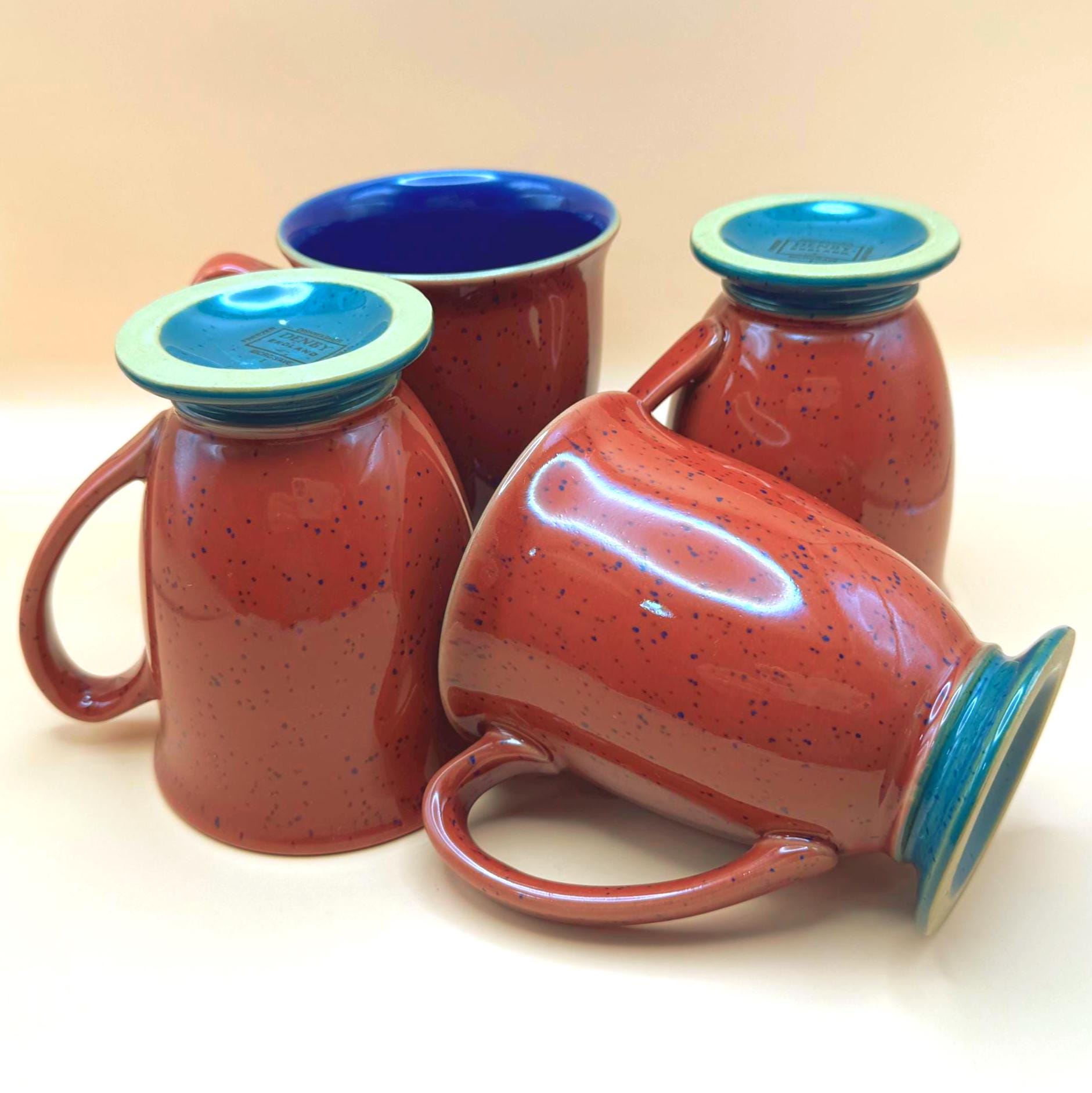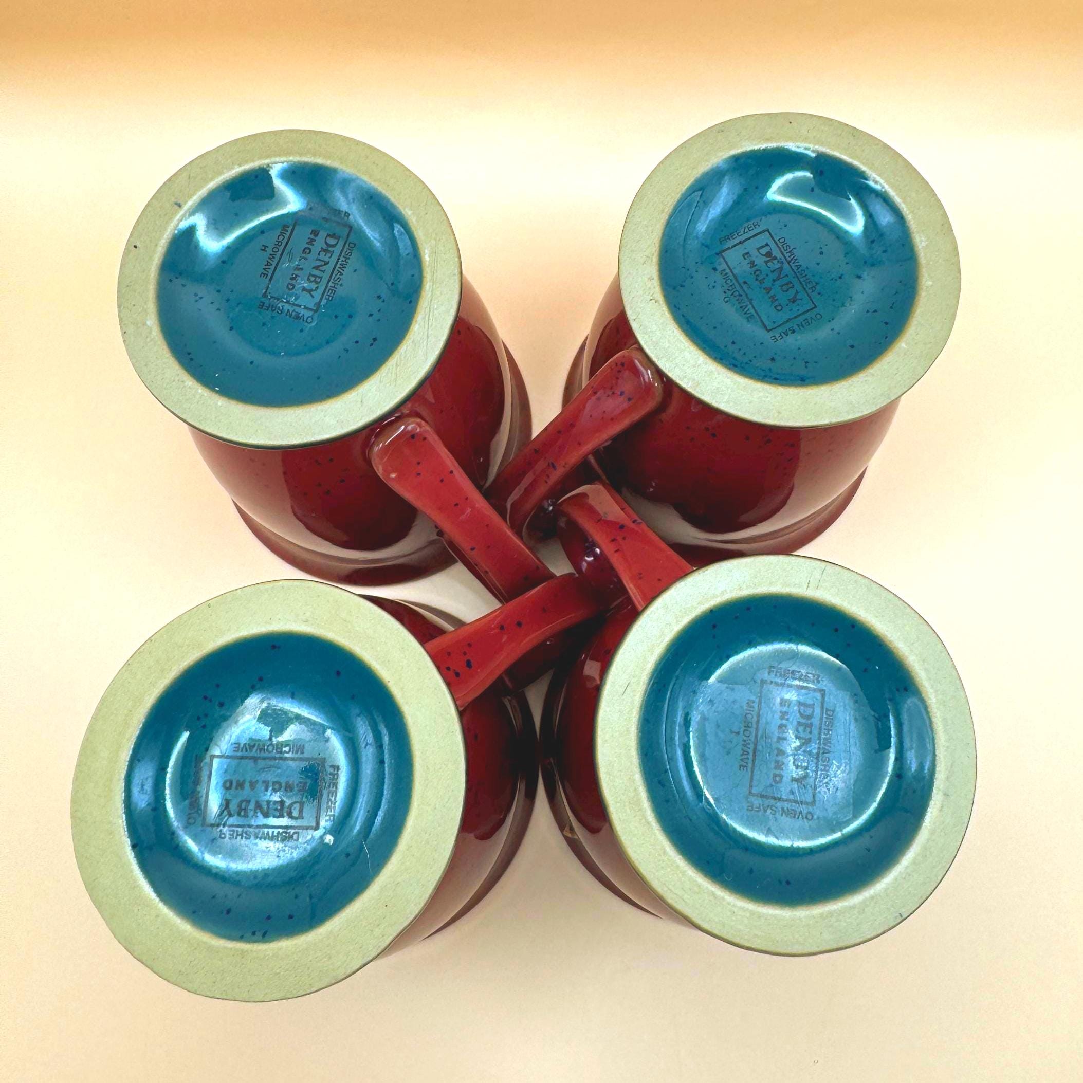 Very good vintage condition. This set of four mugs shows no chips or cracks and remains in excellent usable condition. There may be very light signs of prior use consistent with vintage stoneware, but none obvious when closely inspecting. The mugs are well preserved and display beautifully.