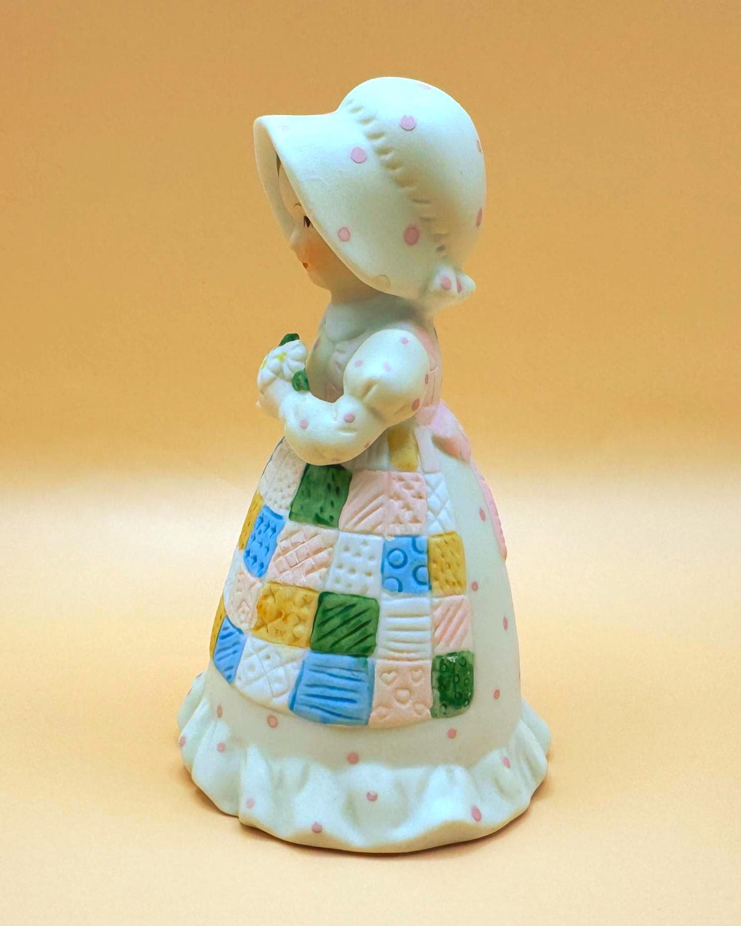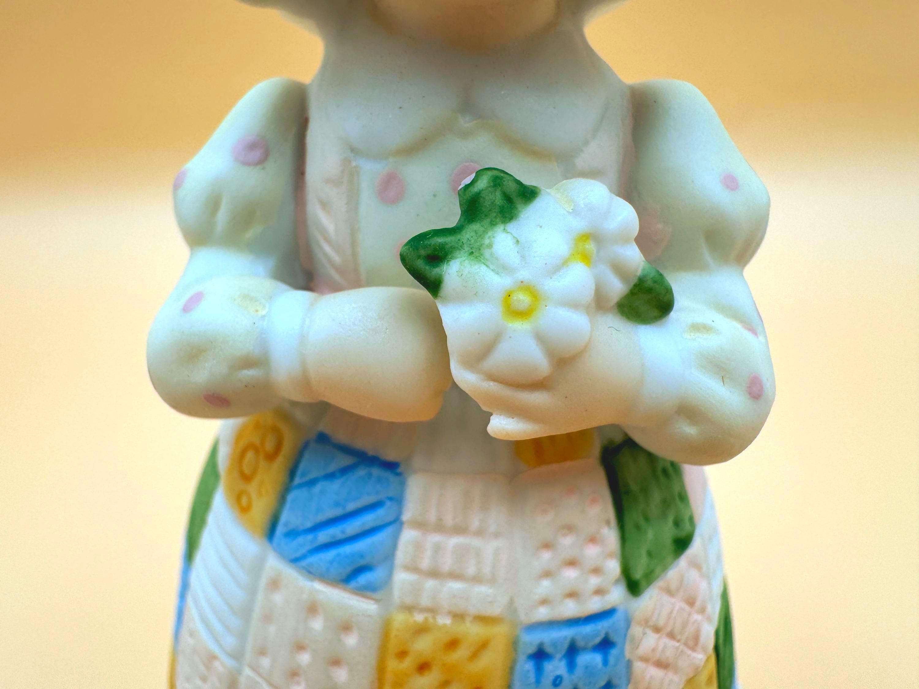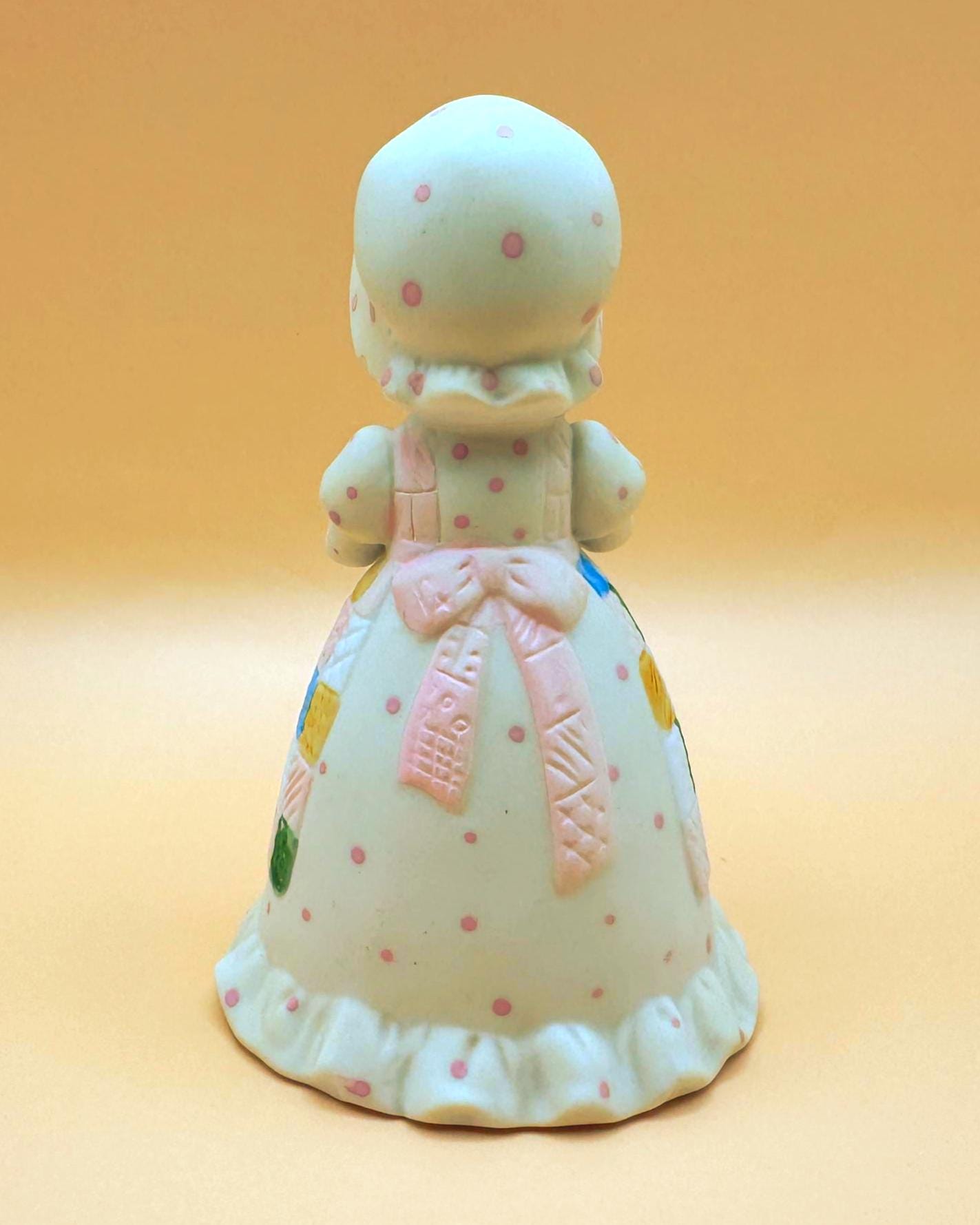 The softly textured bisque porcelain and gentle pastel colors give this bell a warm, storybook feel. Designed as both a figurine and functioning bell, it makes a wonderful display piece for collectors of Holly Hobbie memorabilia or vintage 1980s décor.