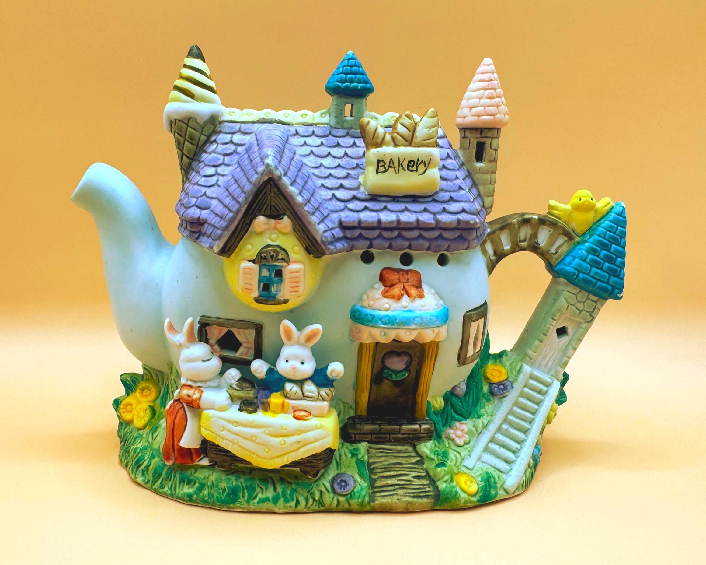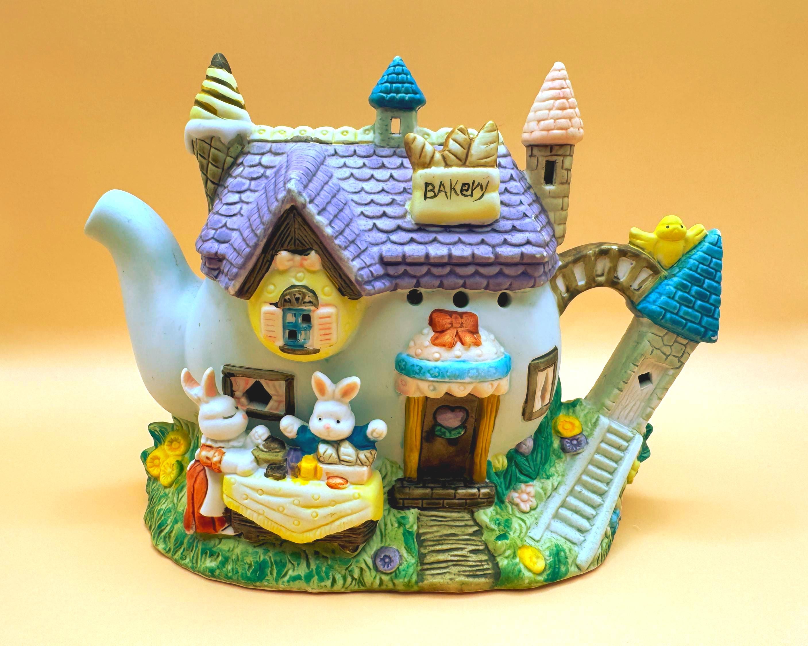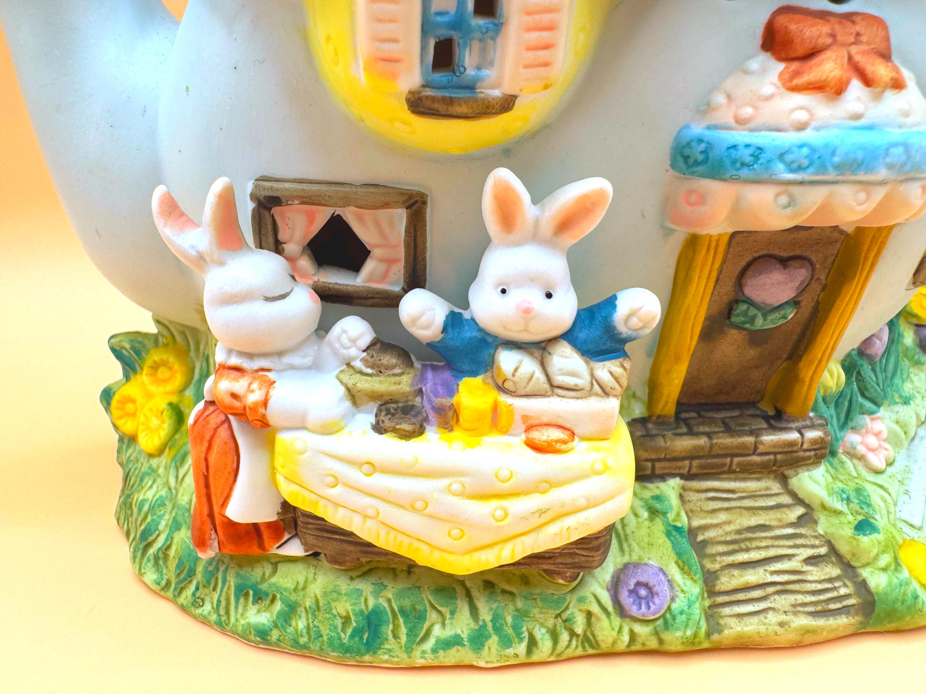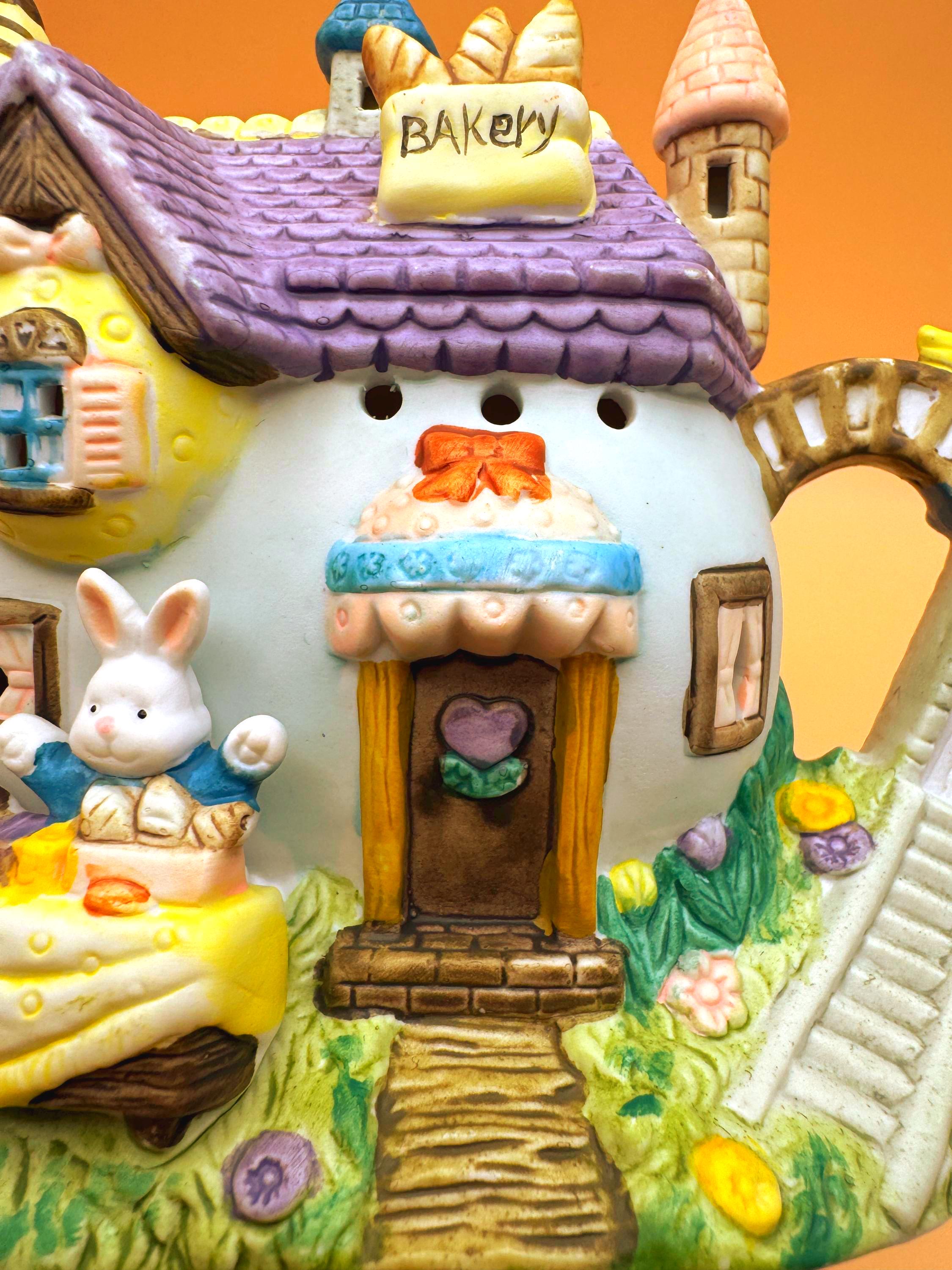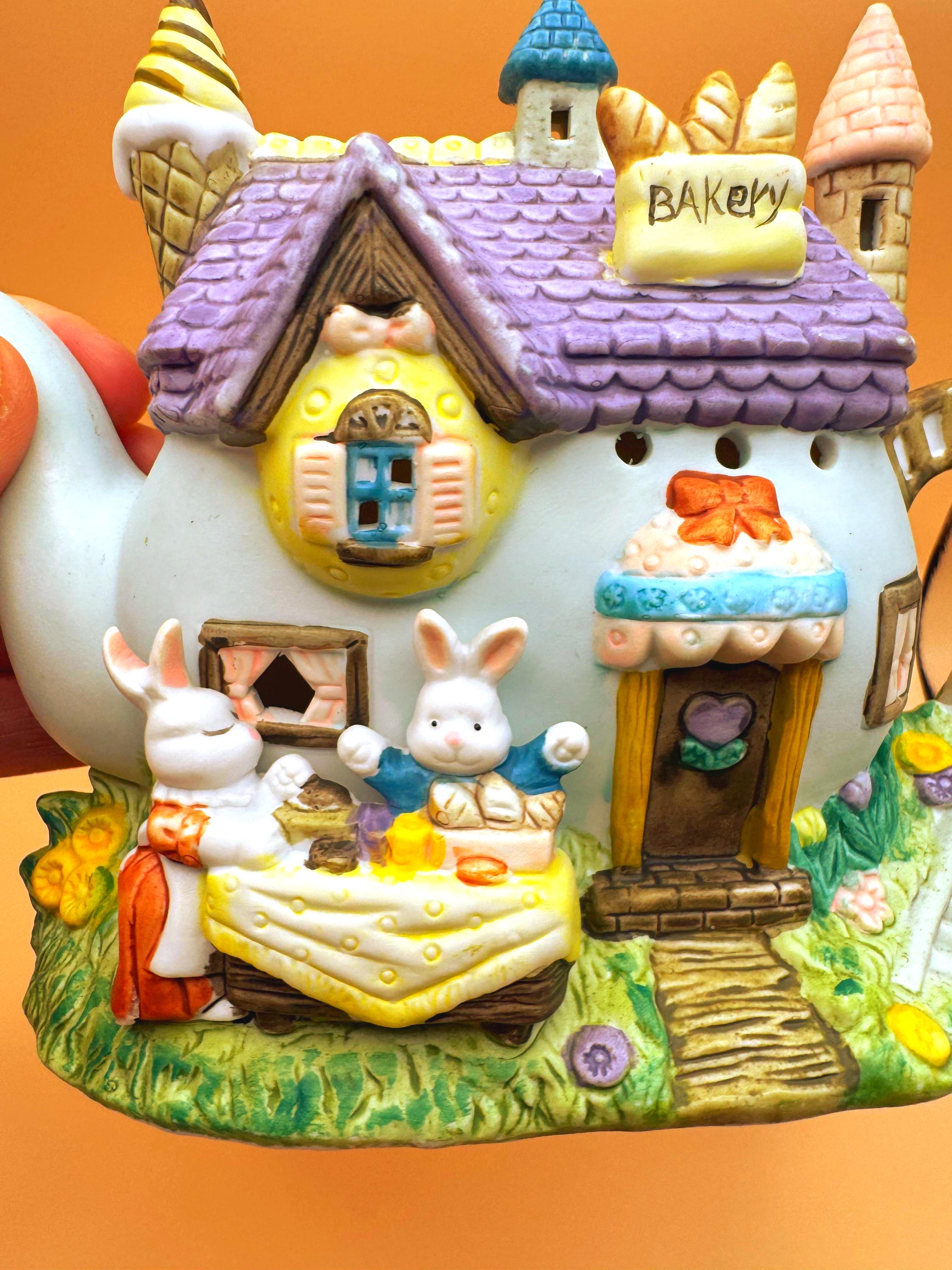 This charming vintage Easter teapot luminary features an adorable bunny bakery cottage design full of whimsical detail. Styled as a teapot-shaped house, this piece showcases sweet bunny characters including a chick, spring florals, and a cozy bakery scene that brings a storybook feel to your seasonal decor.