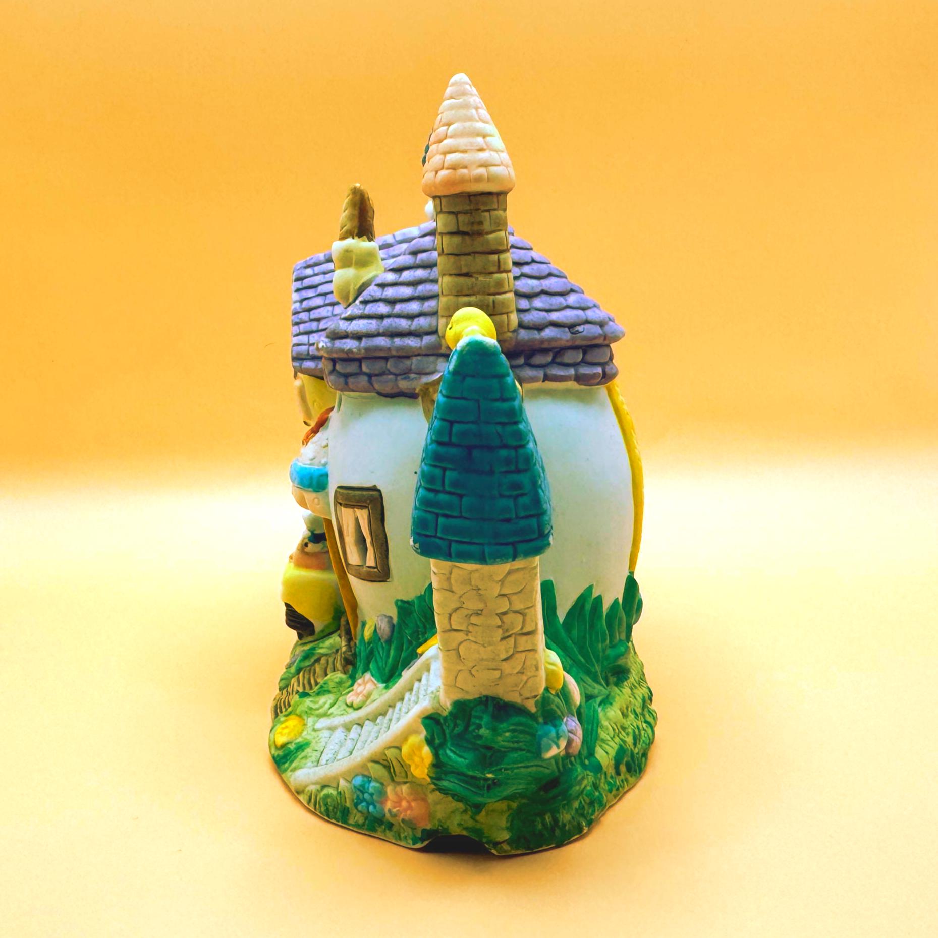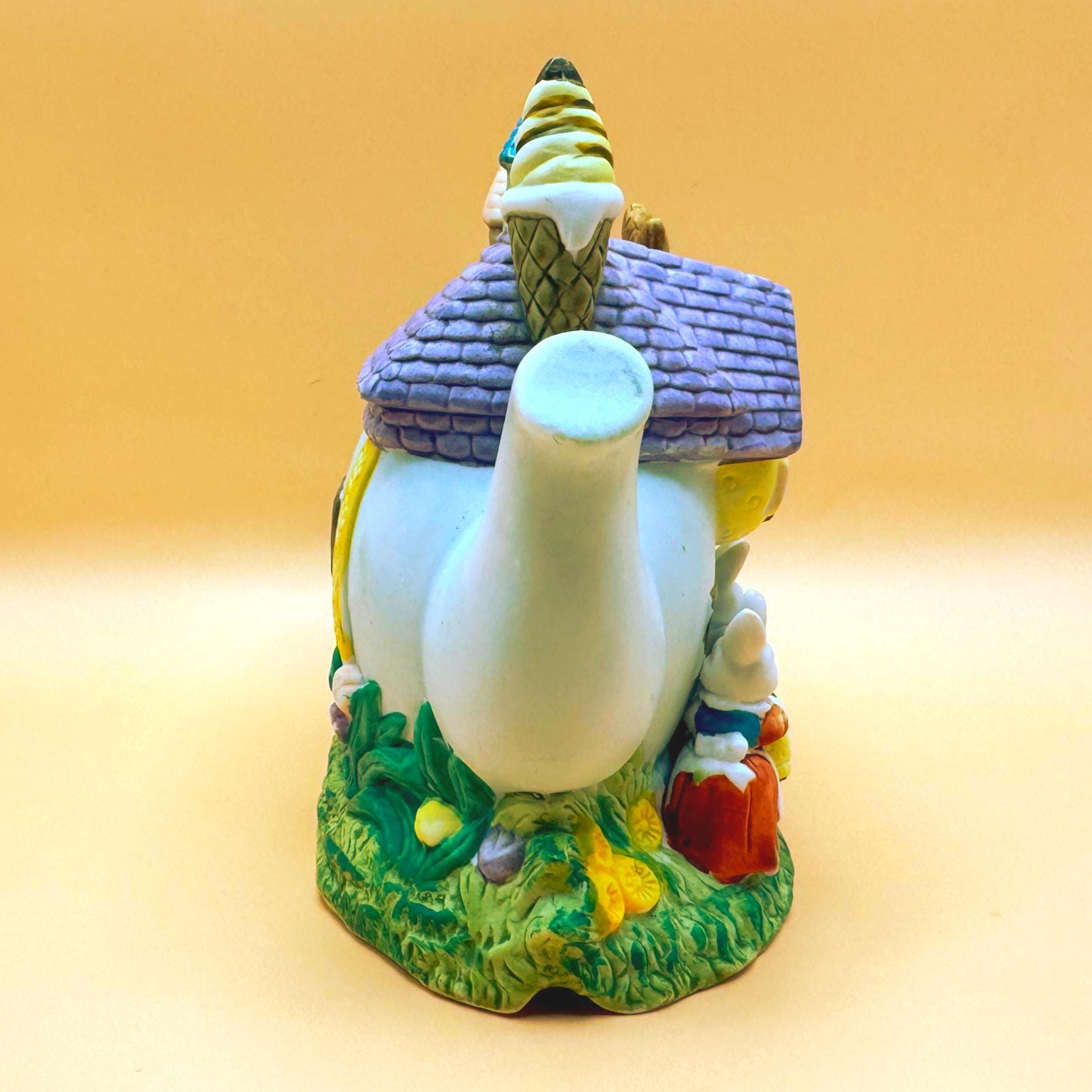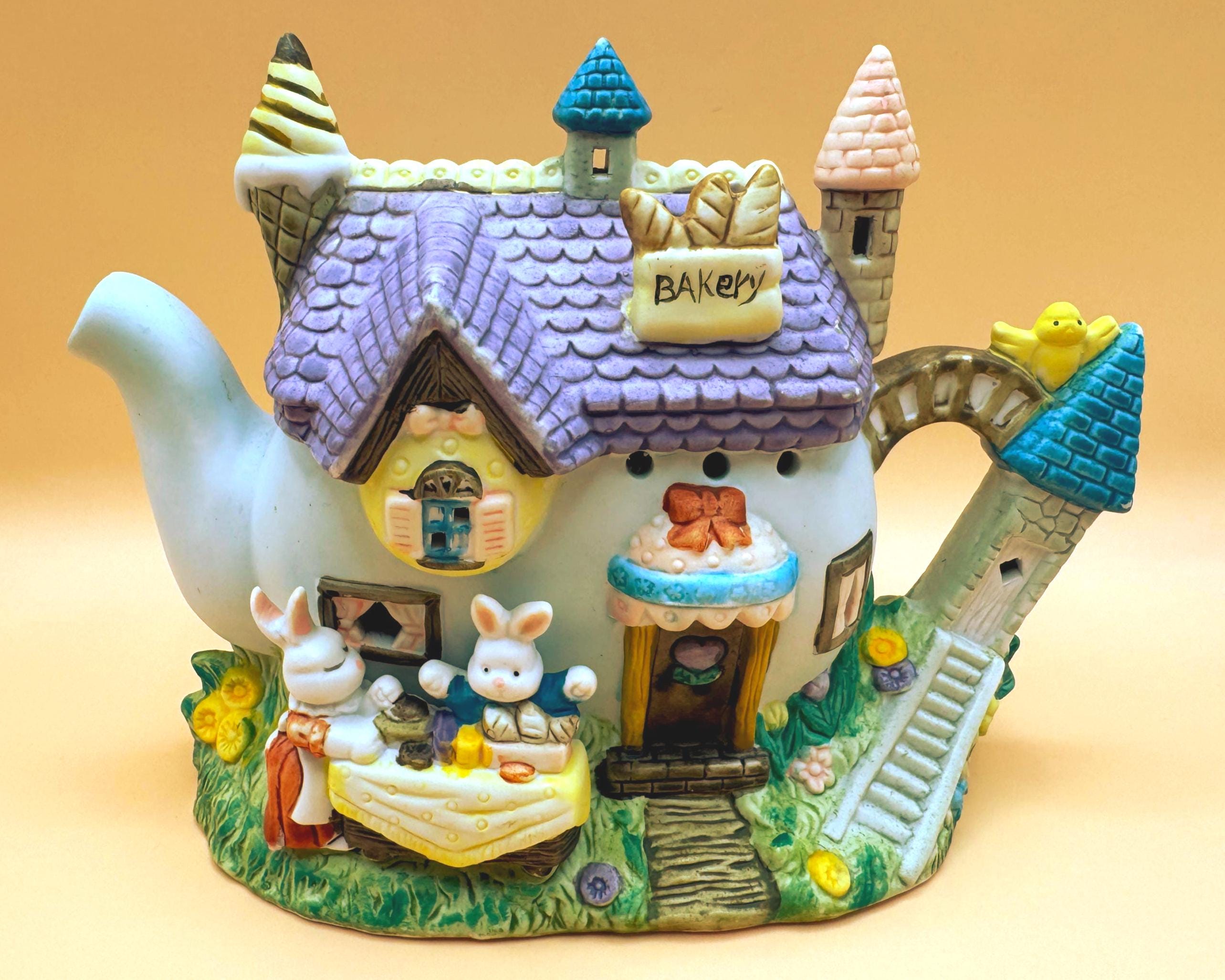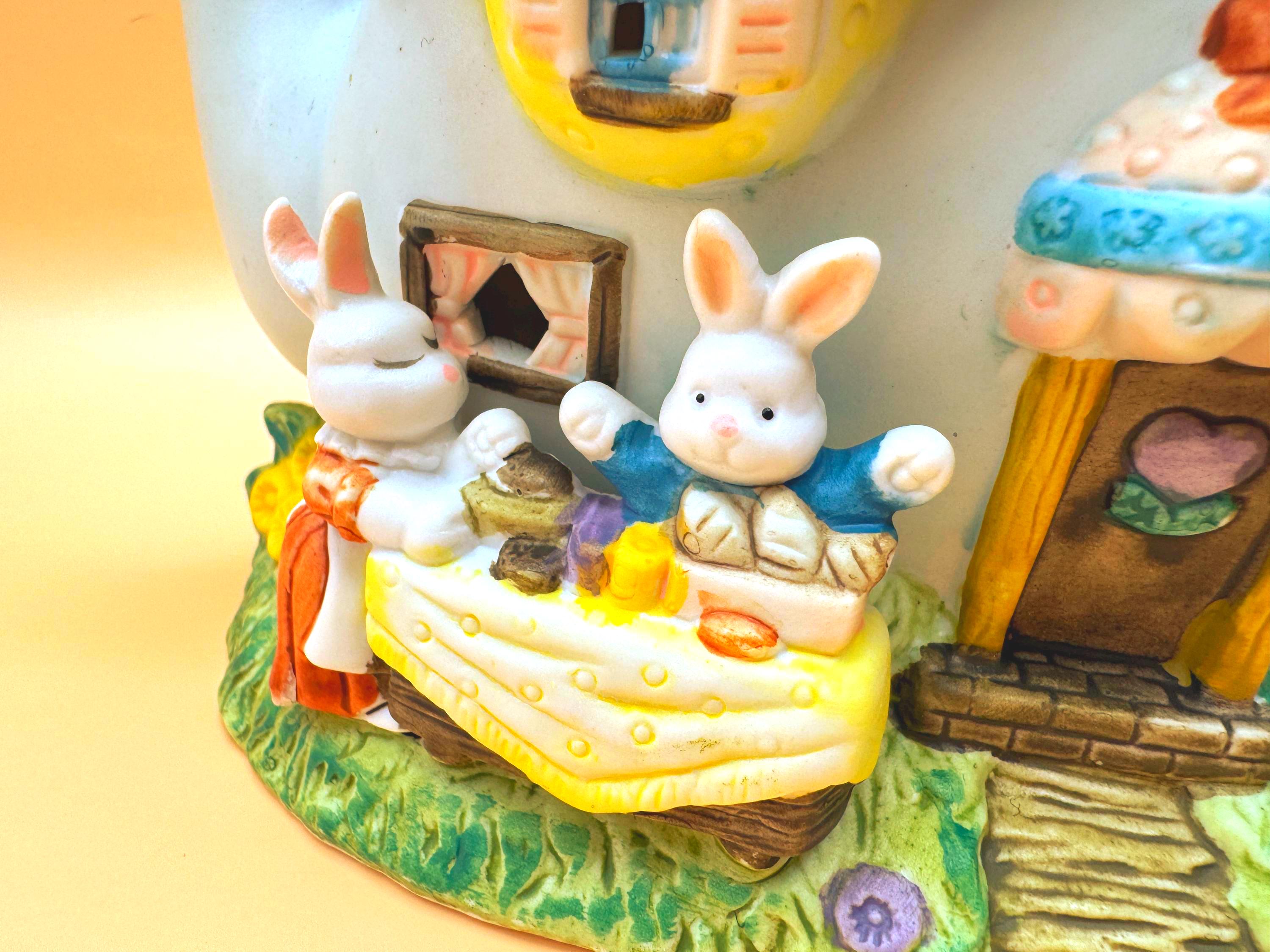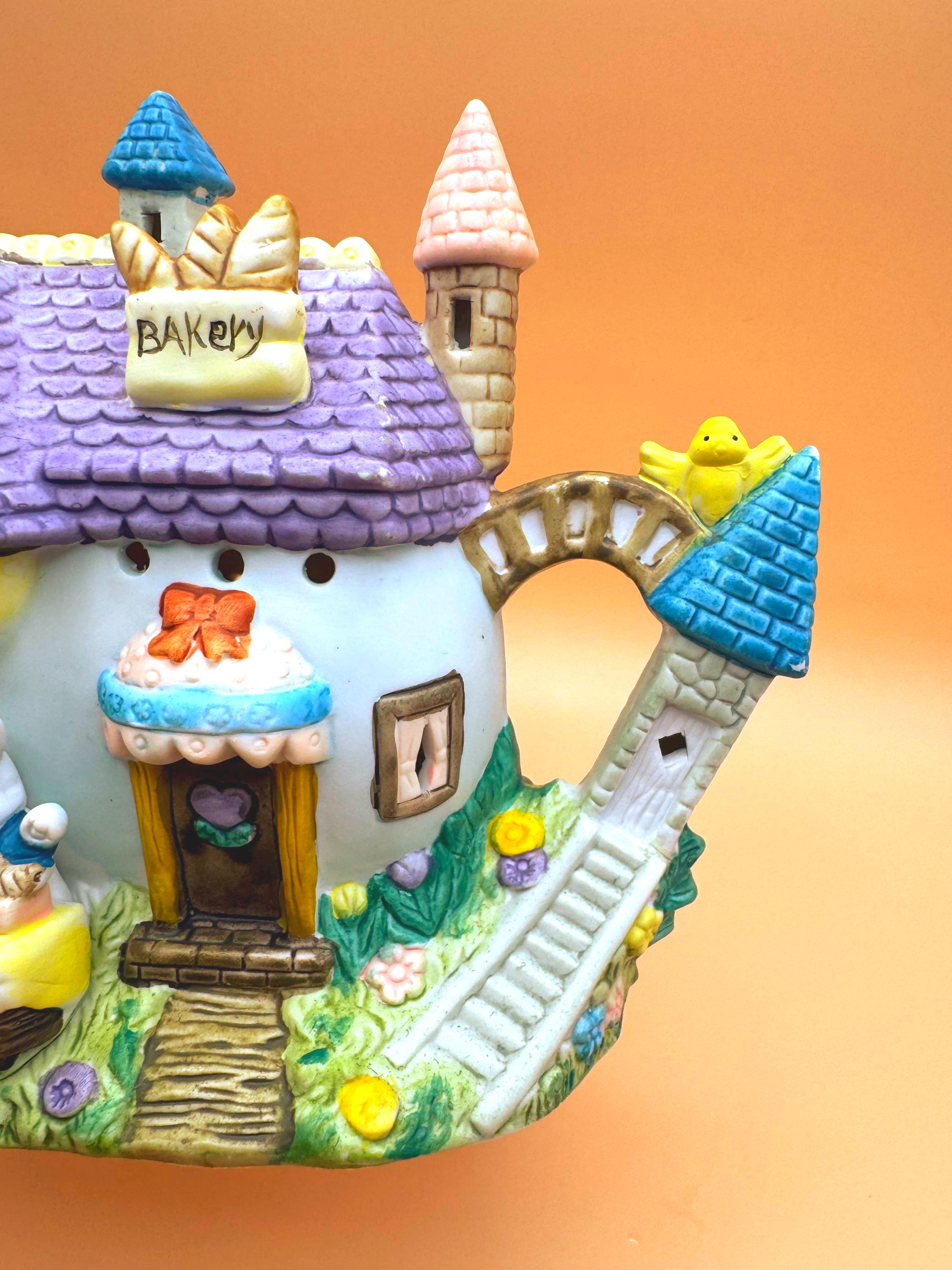 This charming vintage Easter teapot luminary features an adorable bunny bakery cottage design full of whimsical detail. Styled as a teapot-shaped house, this piece showcases sweet bunny characters including a chick, spring florals, and a cozy bakery scene that brings a storybook feel to your seasonal decor.