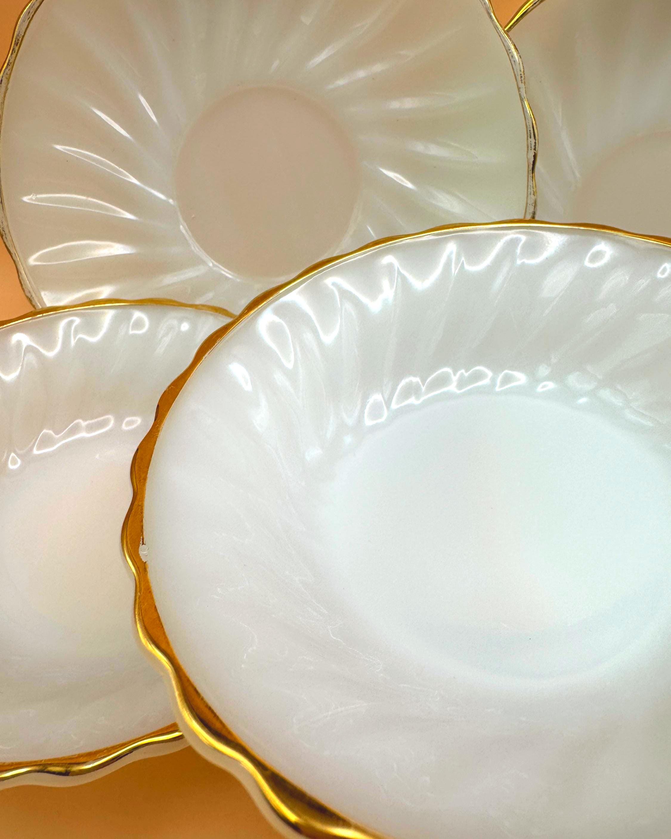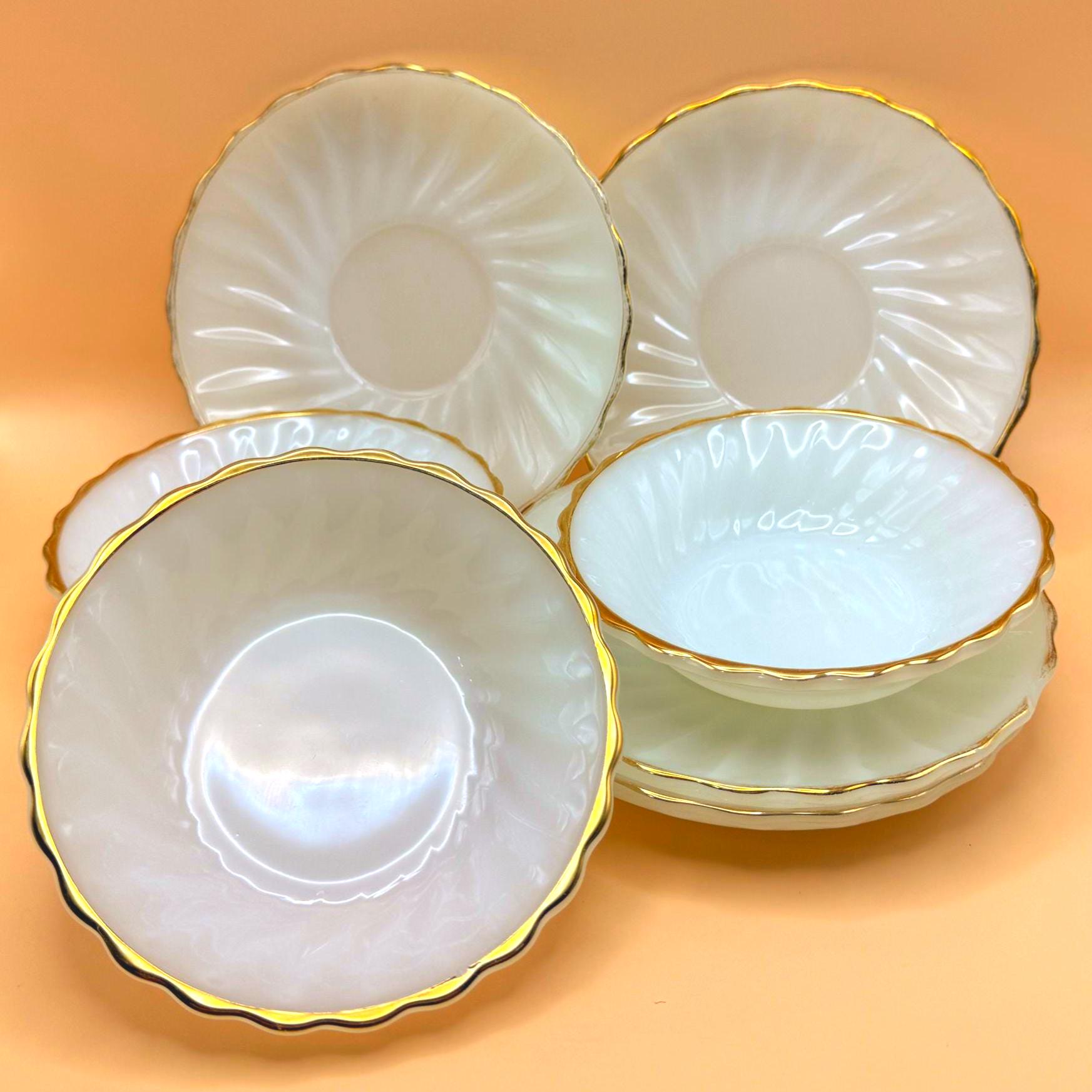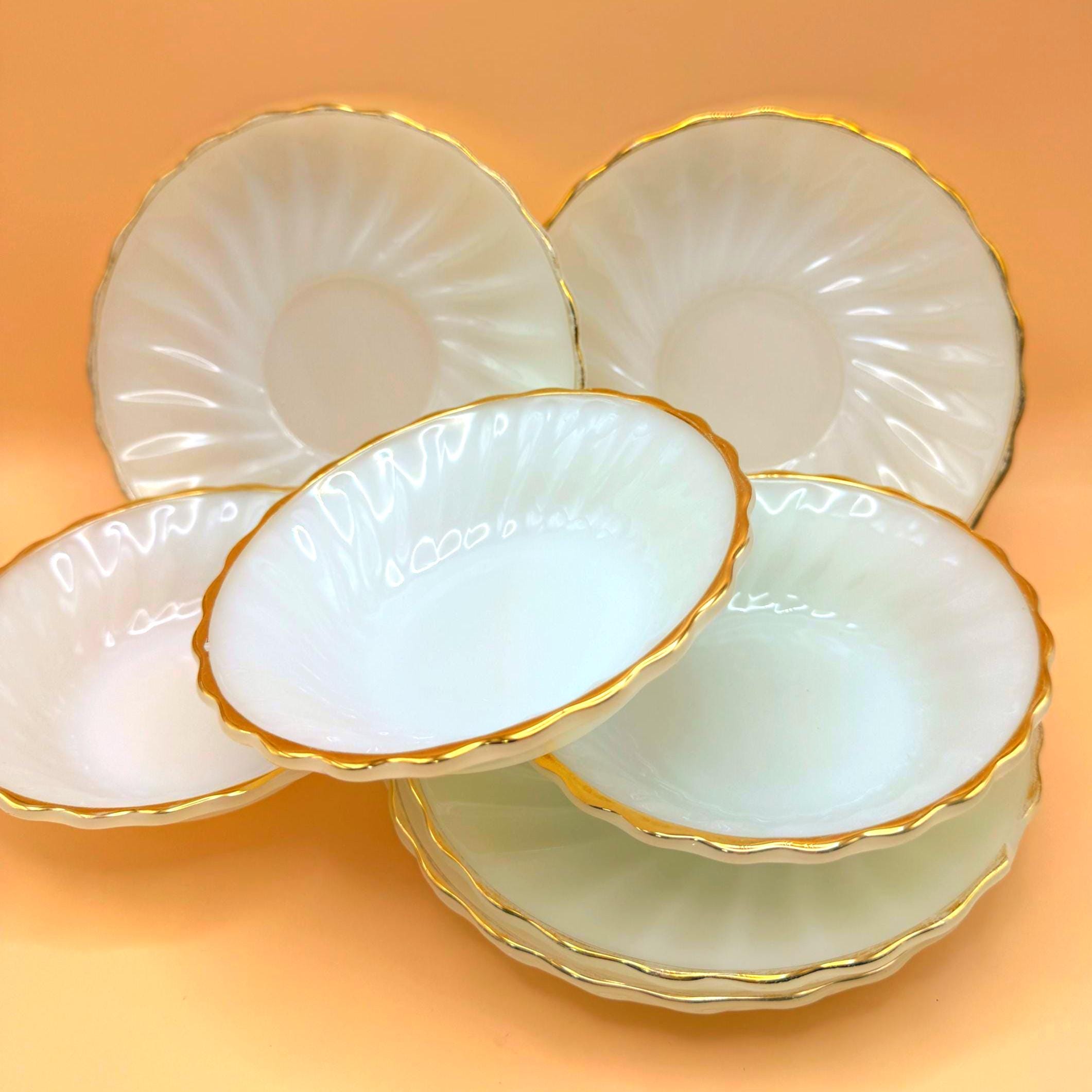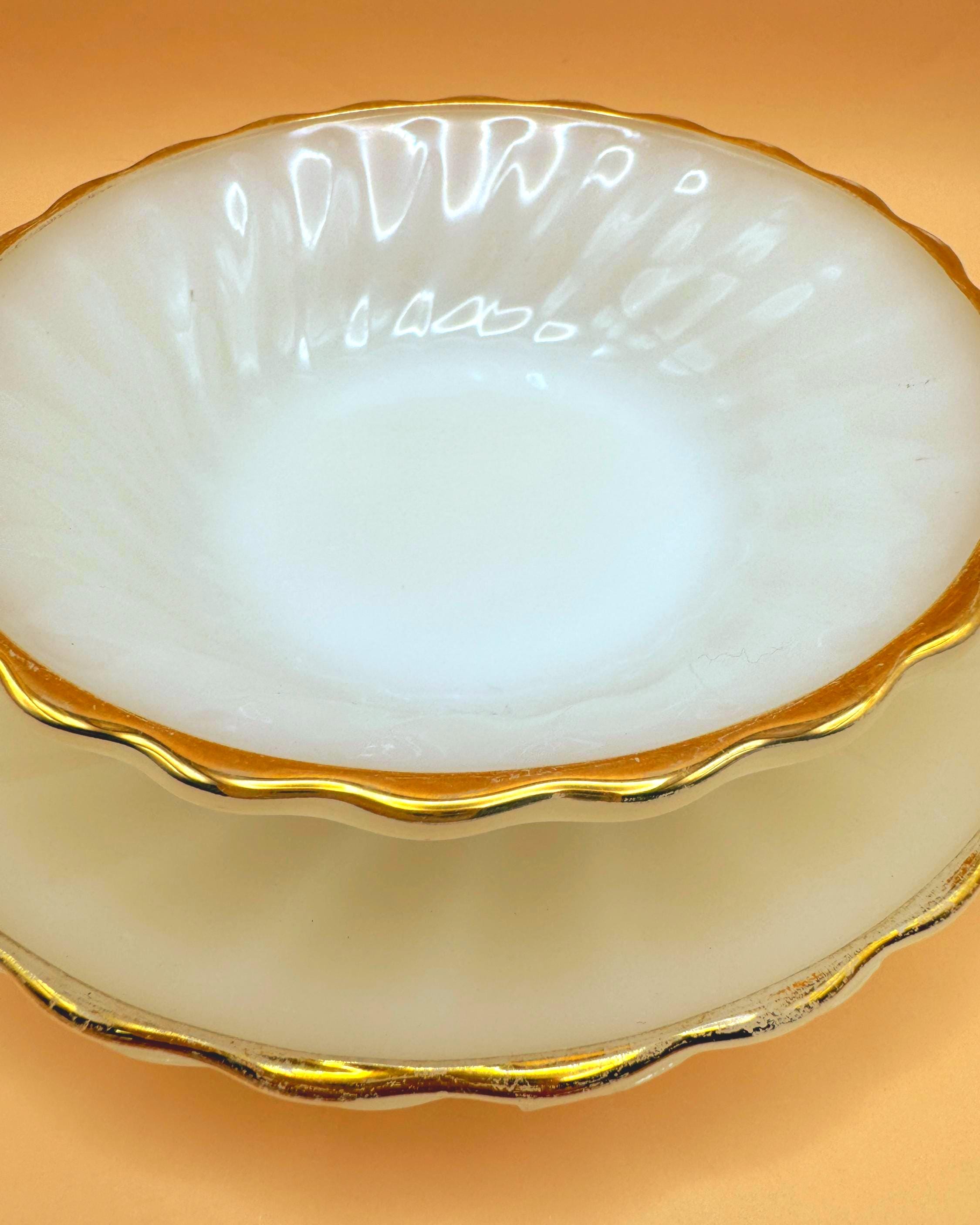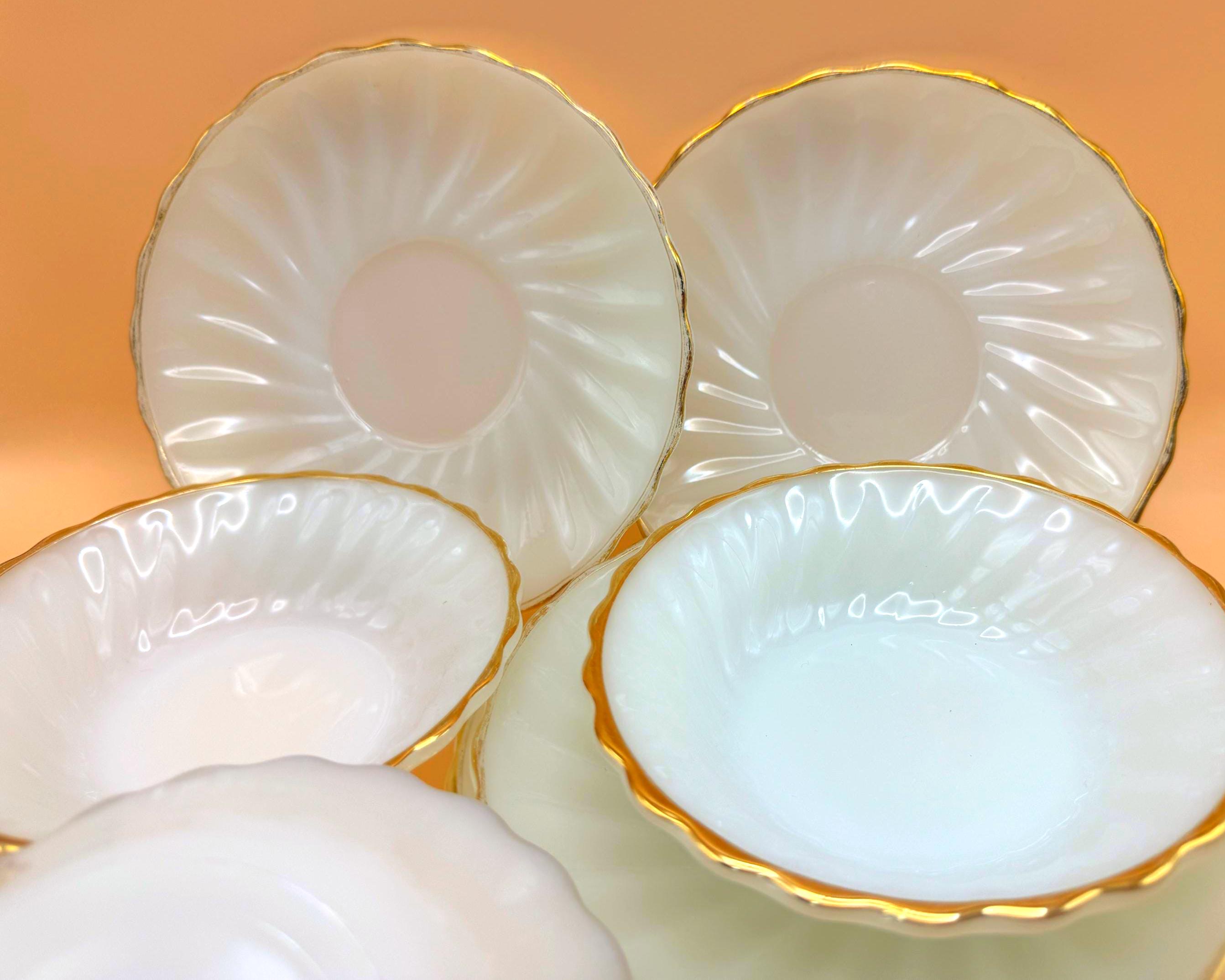 Beautiful vintage Anchor Hocking Fire King milk glass set featuring classic white glass with elegant gold trim. This charming set includes 3 dessert plates and 3 berry bowls, perfect for serving desserts, fruit, or adding a timeless touch to your table.