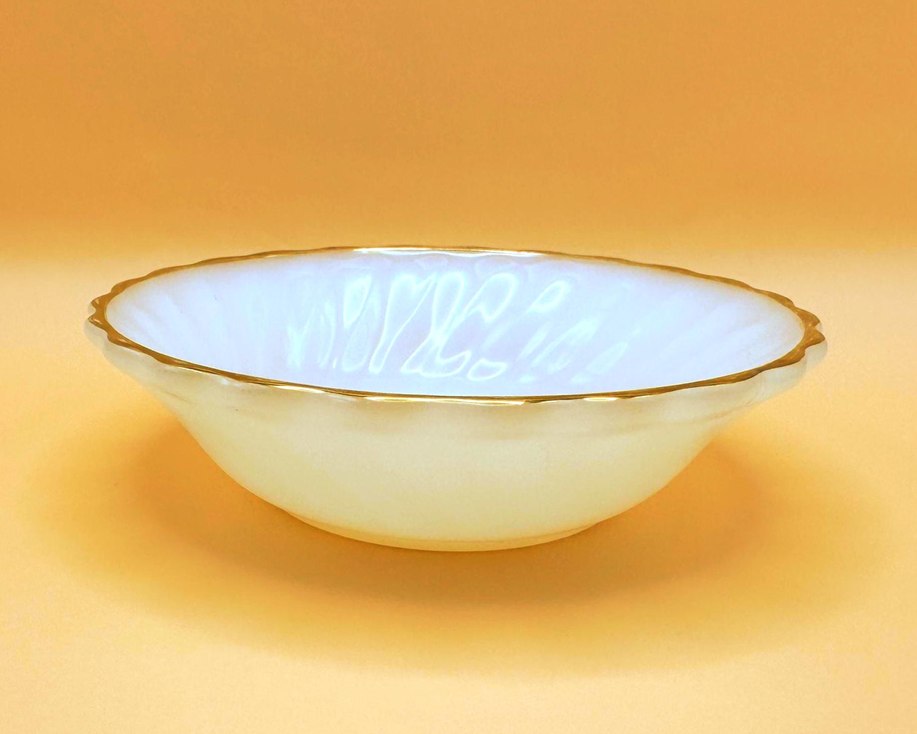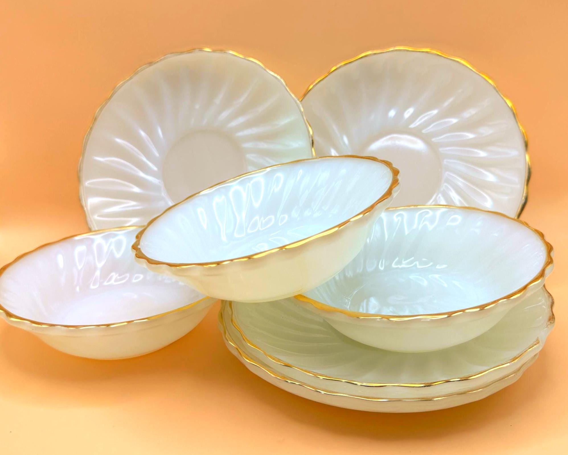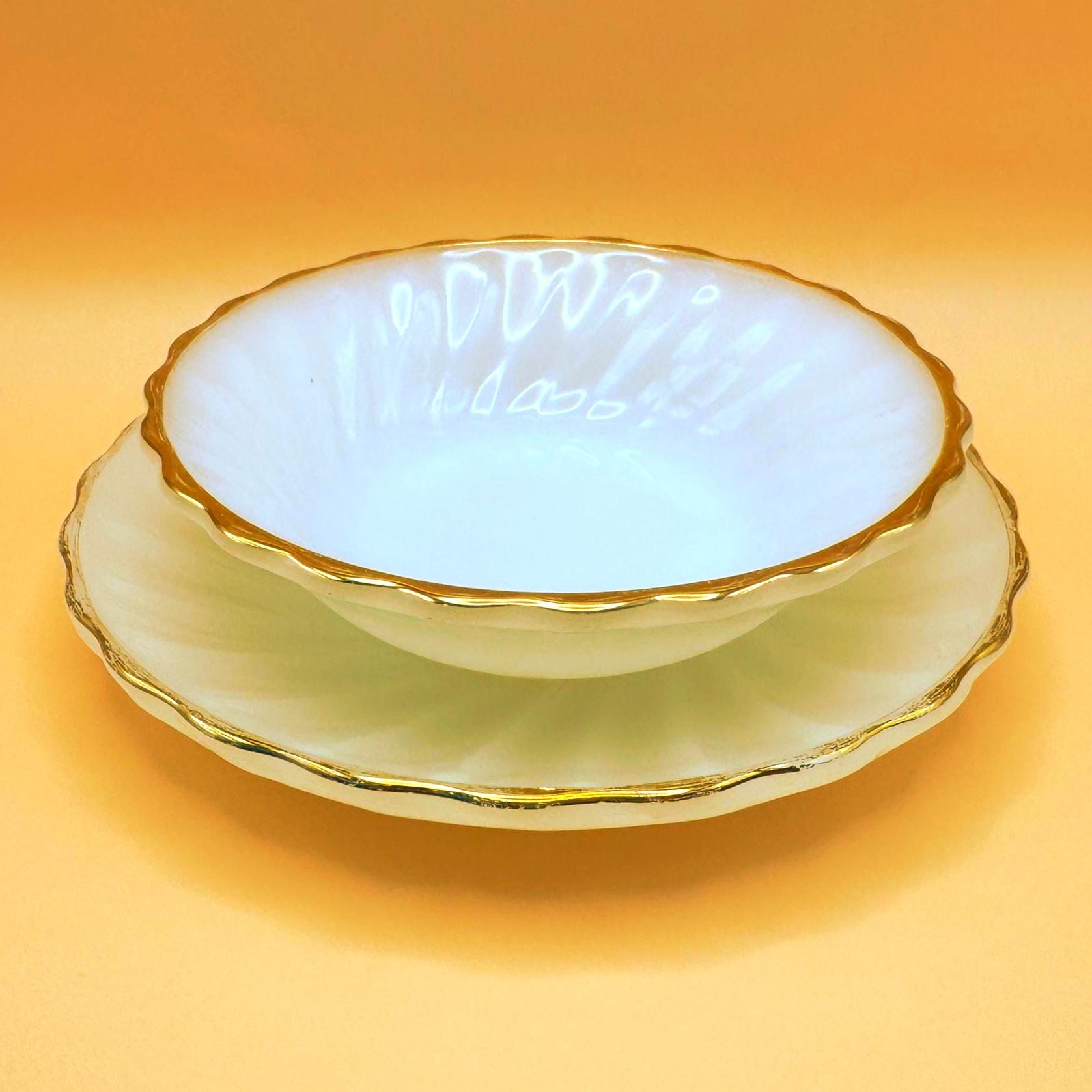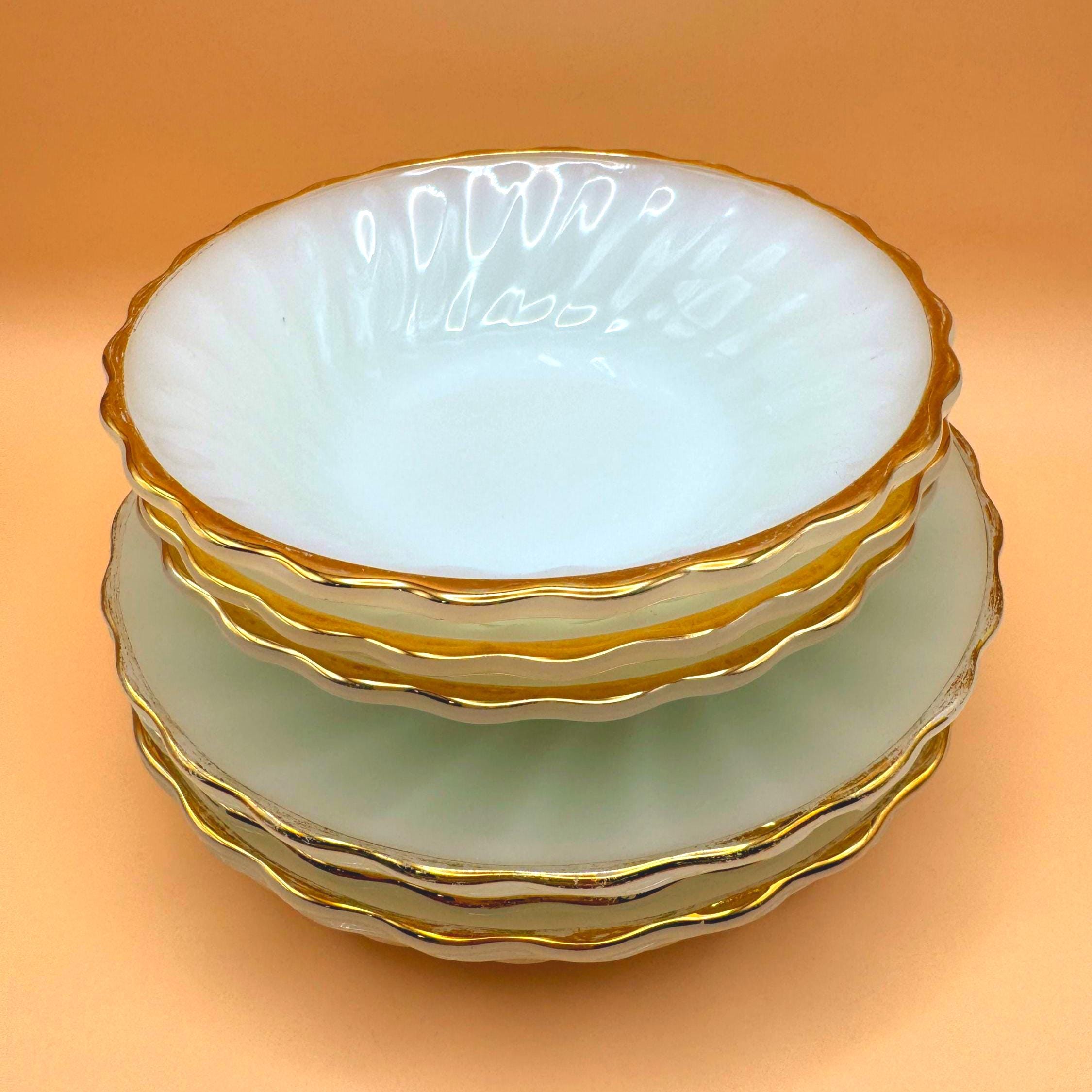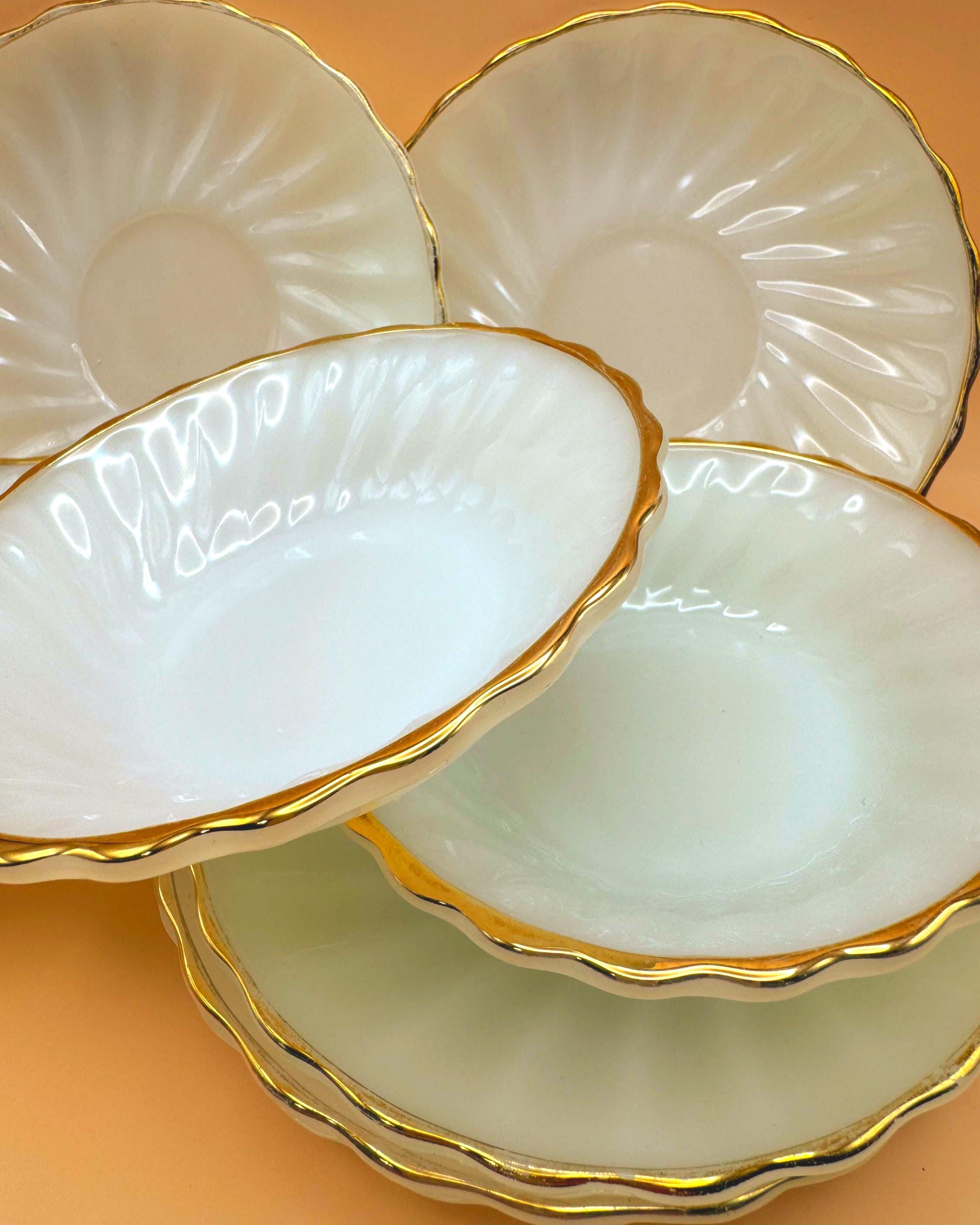 Beautiful vintage Anchor Hocking Fire King milk glass set featuring classic white glass with elegant gold trim. This charming set includes 3 dessert plates and 3 berry bowls, perfect for serving desserts, fruit, or adding a timeless touch to your table.