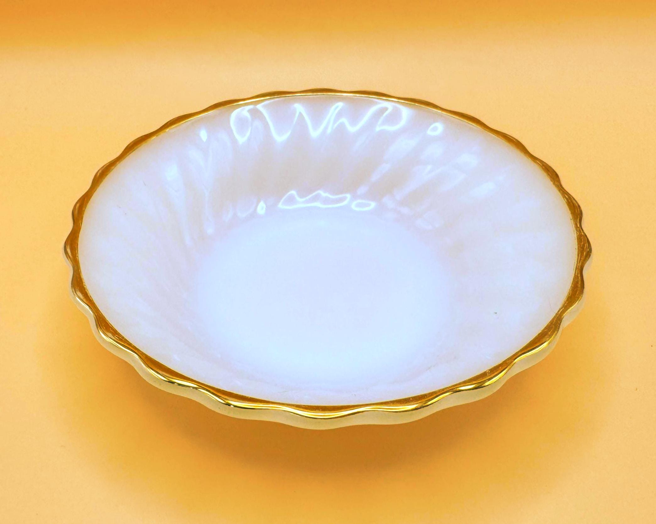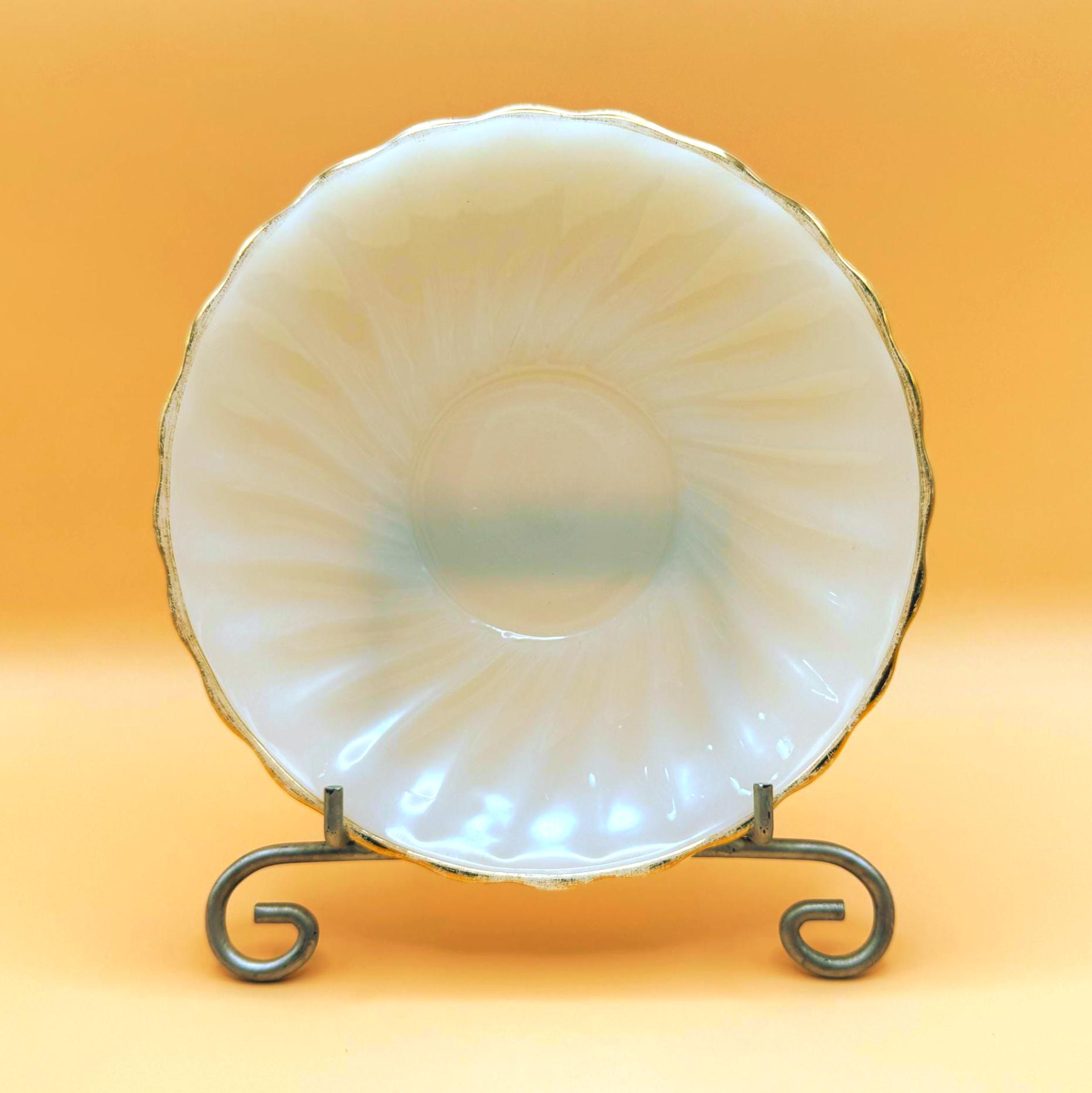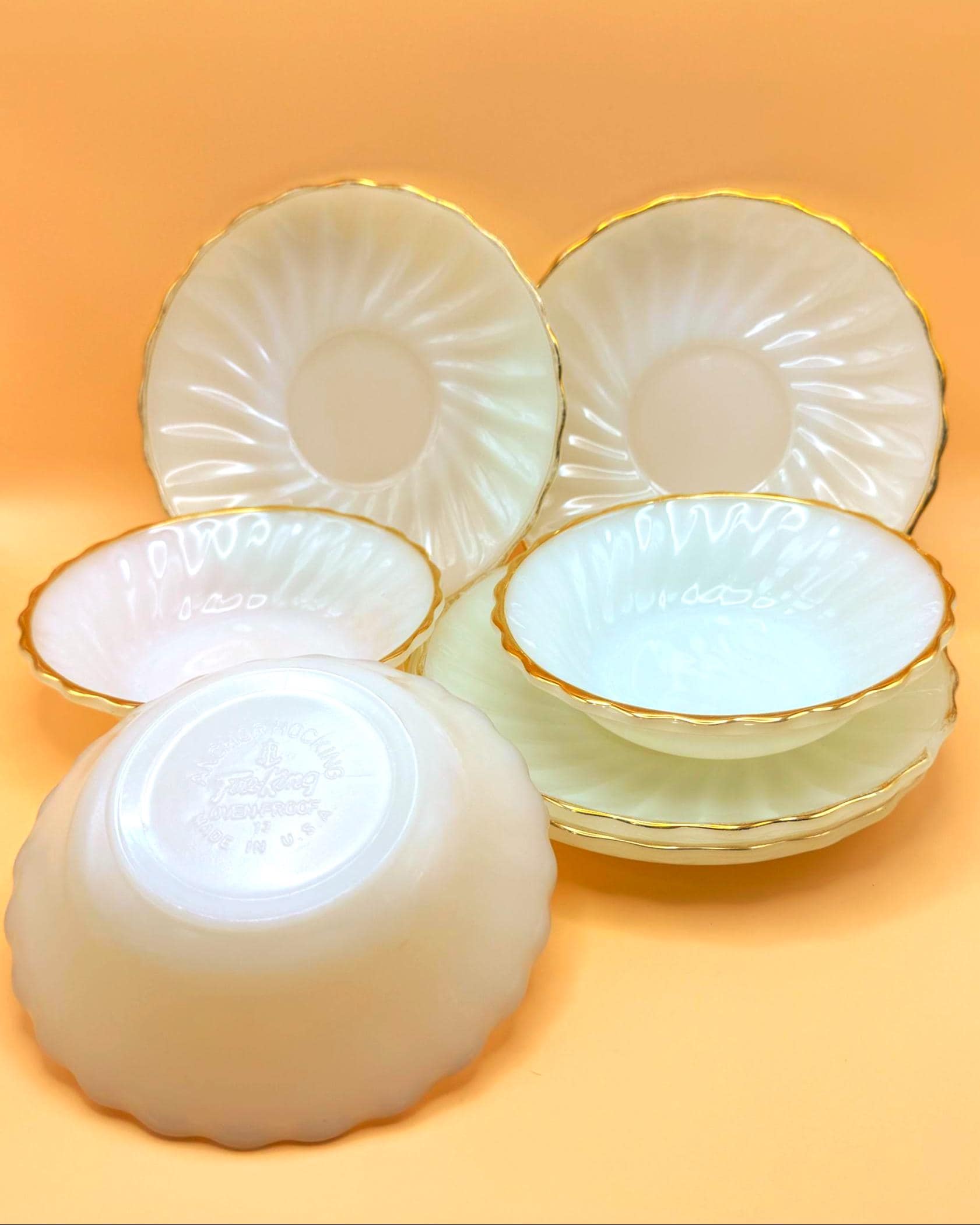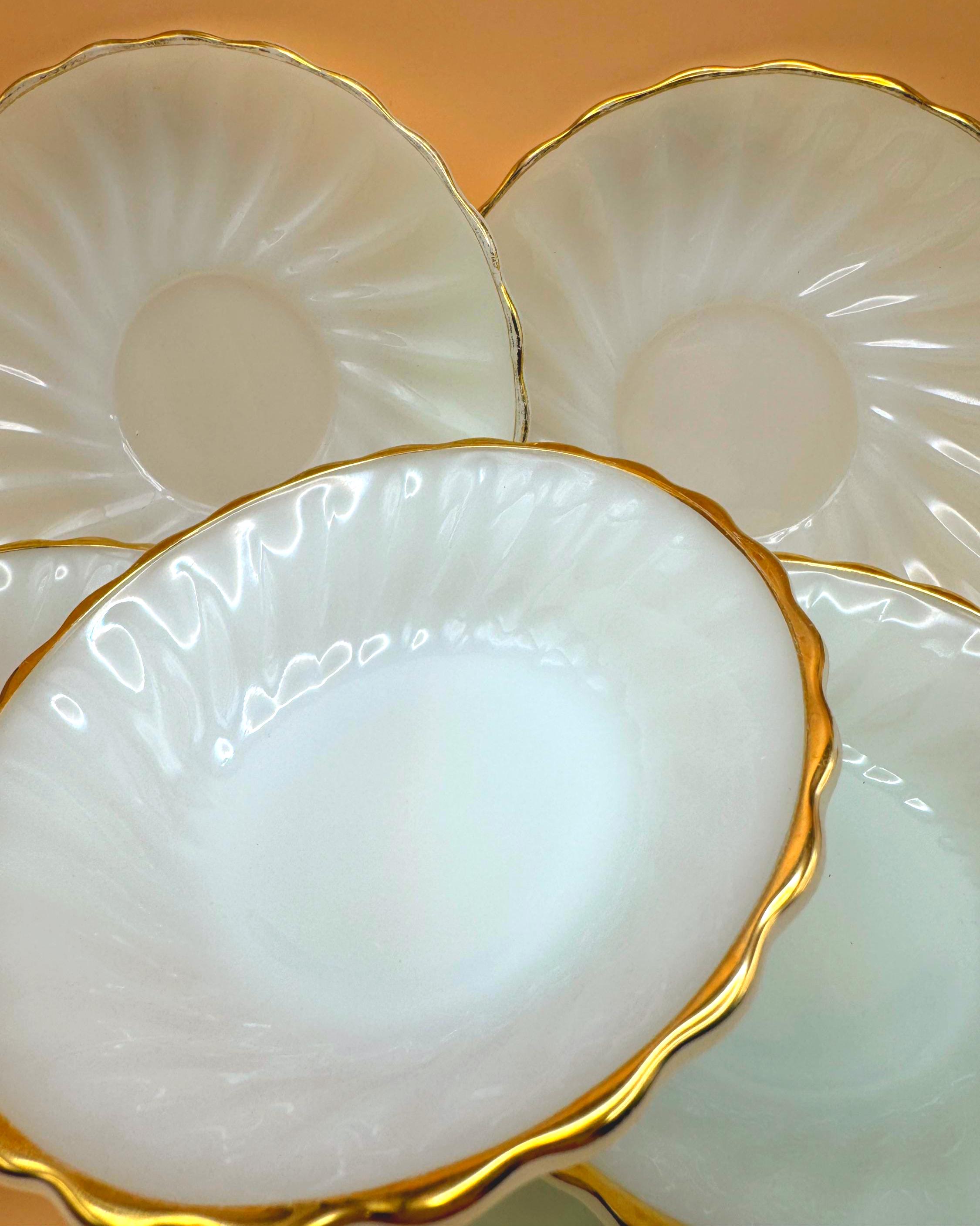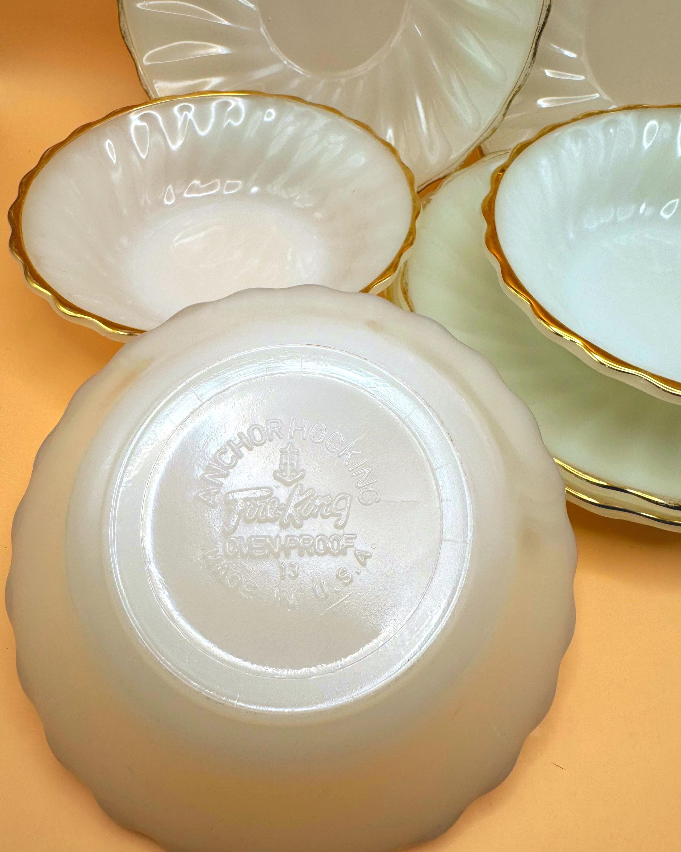Beautiful vintage Anchor Hocking Fire King milk glass set featuring classic white glass with elegant gold trim. This charming set includes 3 dessert plates and 3 berry bowls, perfect for serving desserts, fruit, or adding a timeless touch to your table.