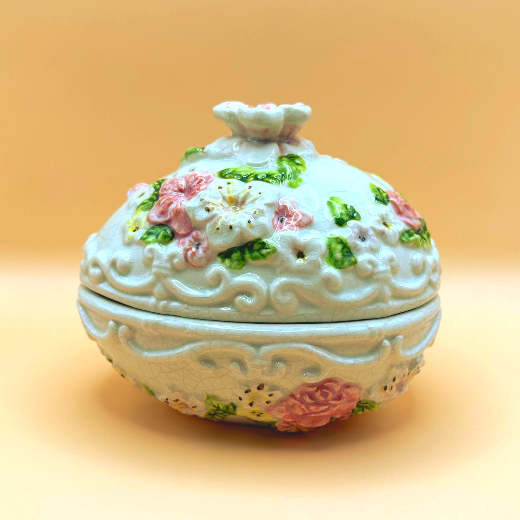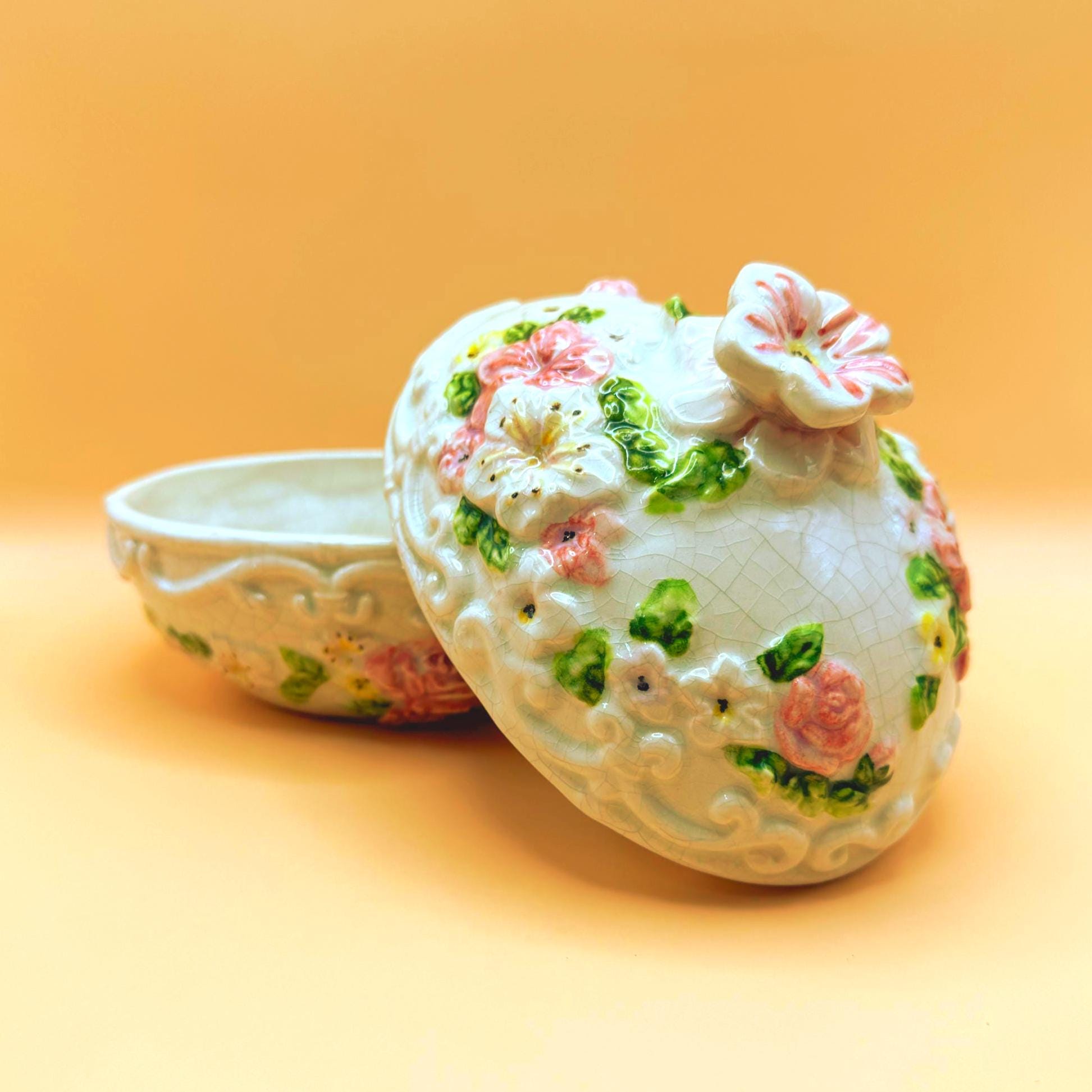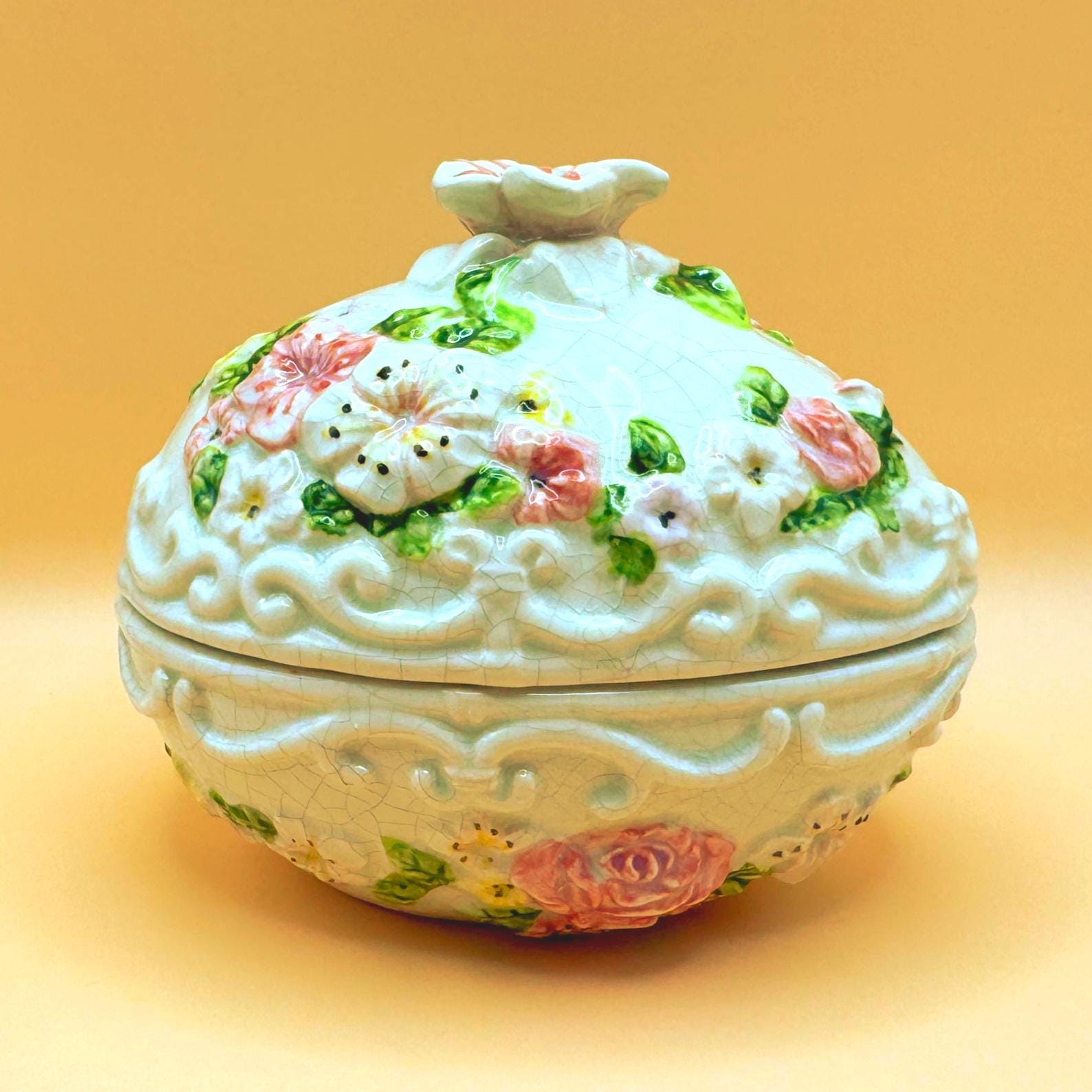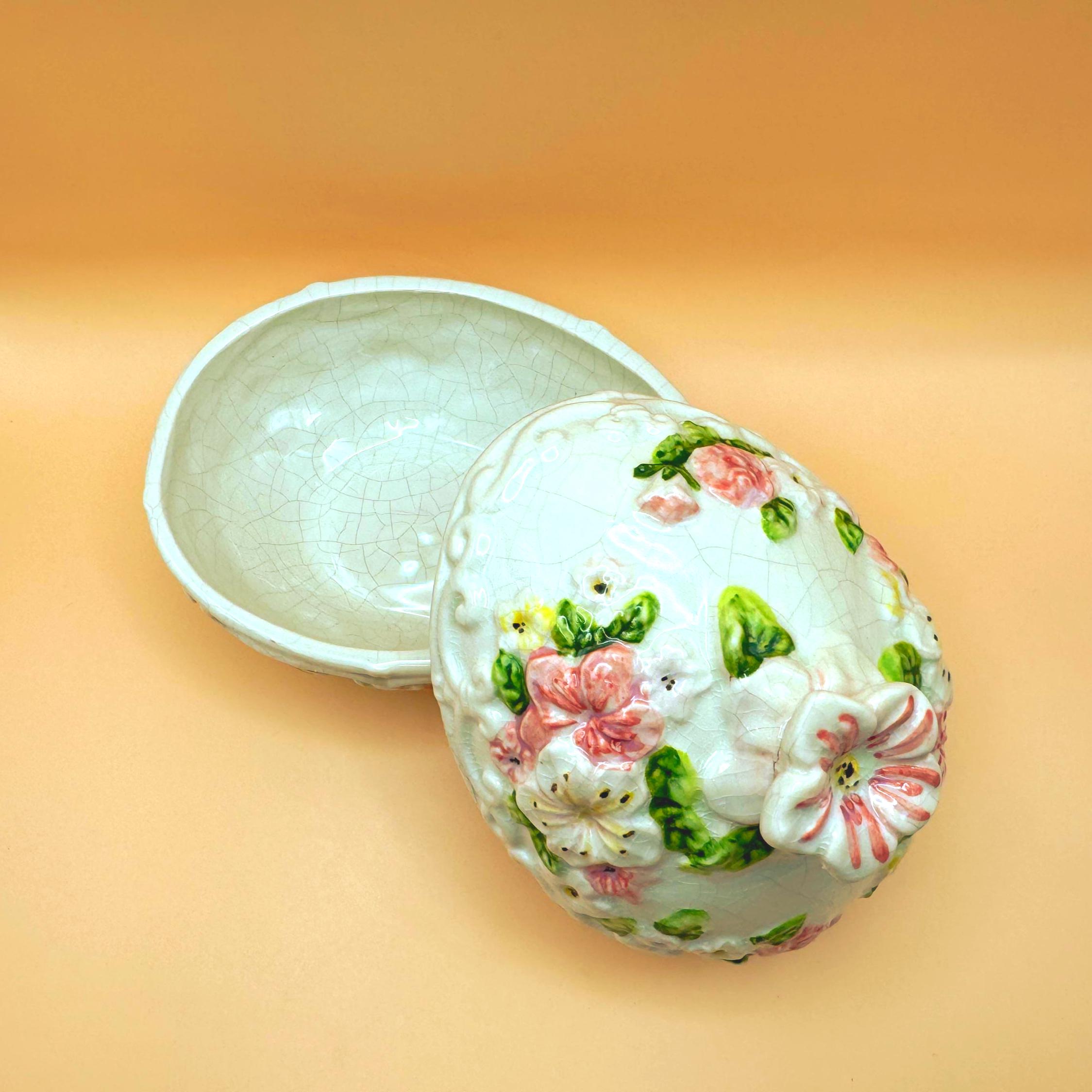 Charming porcelain trinket box in a decorative egg shape, featuring a delicate crackle glaze and beautifully raised floral details. This piece was sold through Cracker Barrel and showcases the soft, romantic style often found in their seasonal décor collections.
