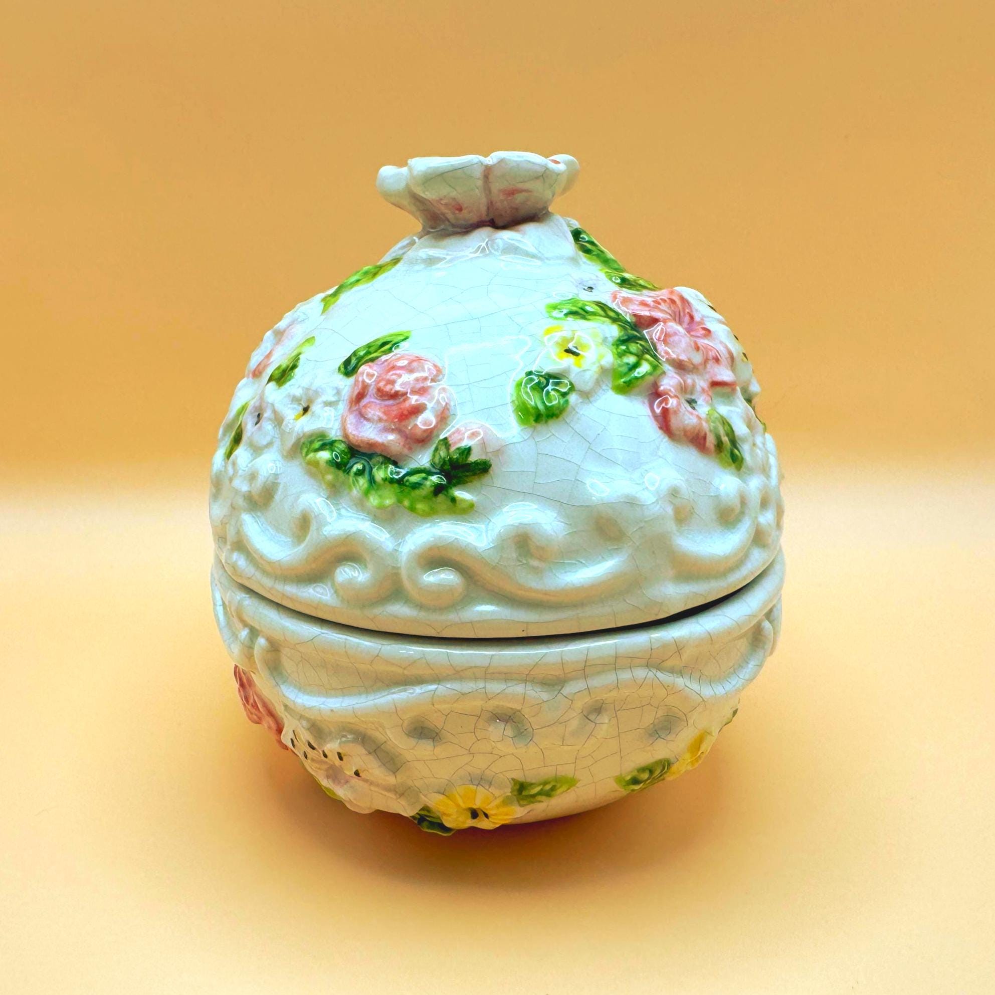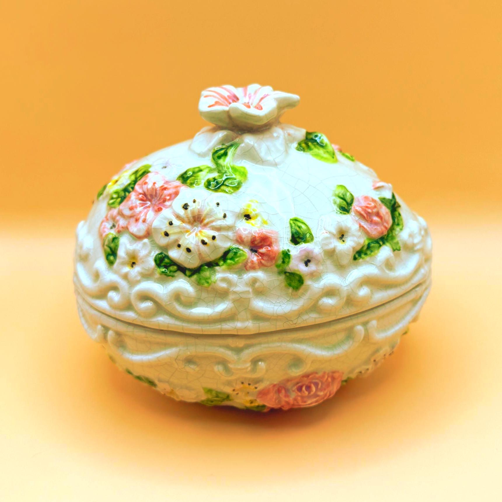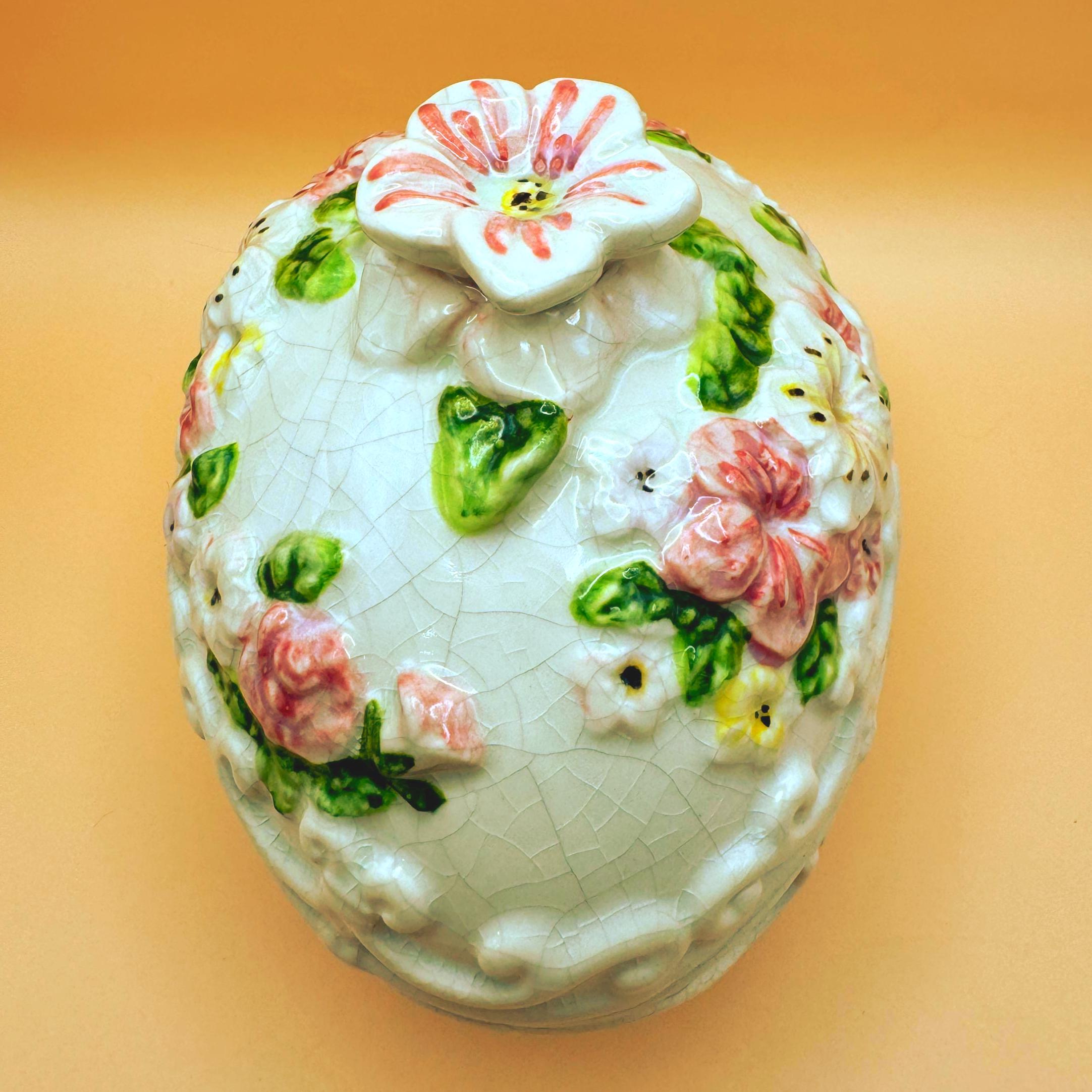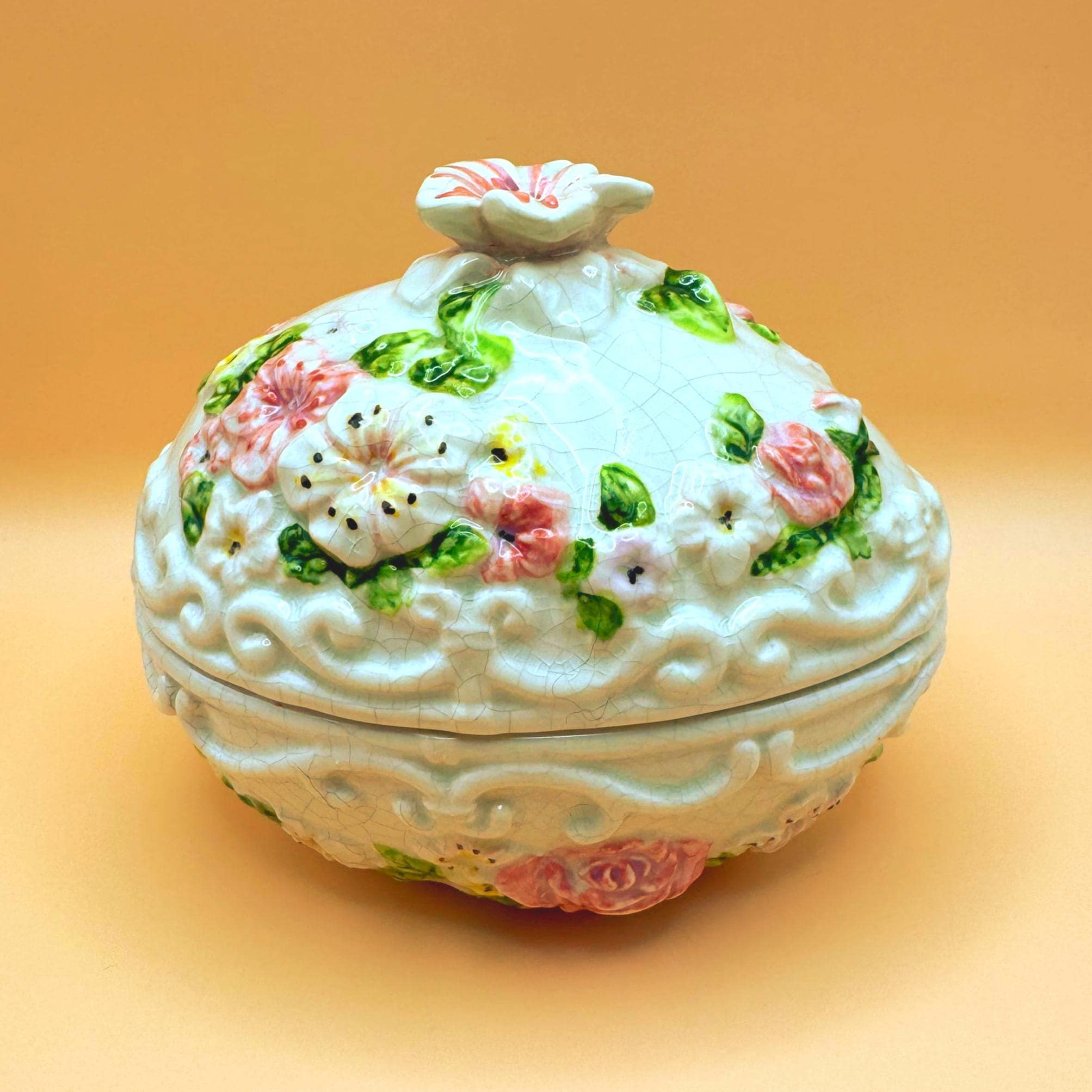 Charming porcelain trinket box in a decorative egg shape, featuring a delicate crackle glaze and beautifully raised floral details. This piece was sold through Cracker Barrel and showcases the soft, romantic style often found in their seasonal décor collections.