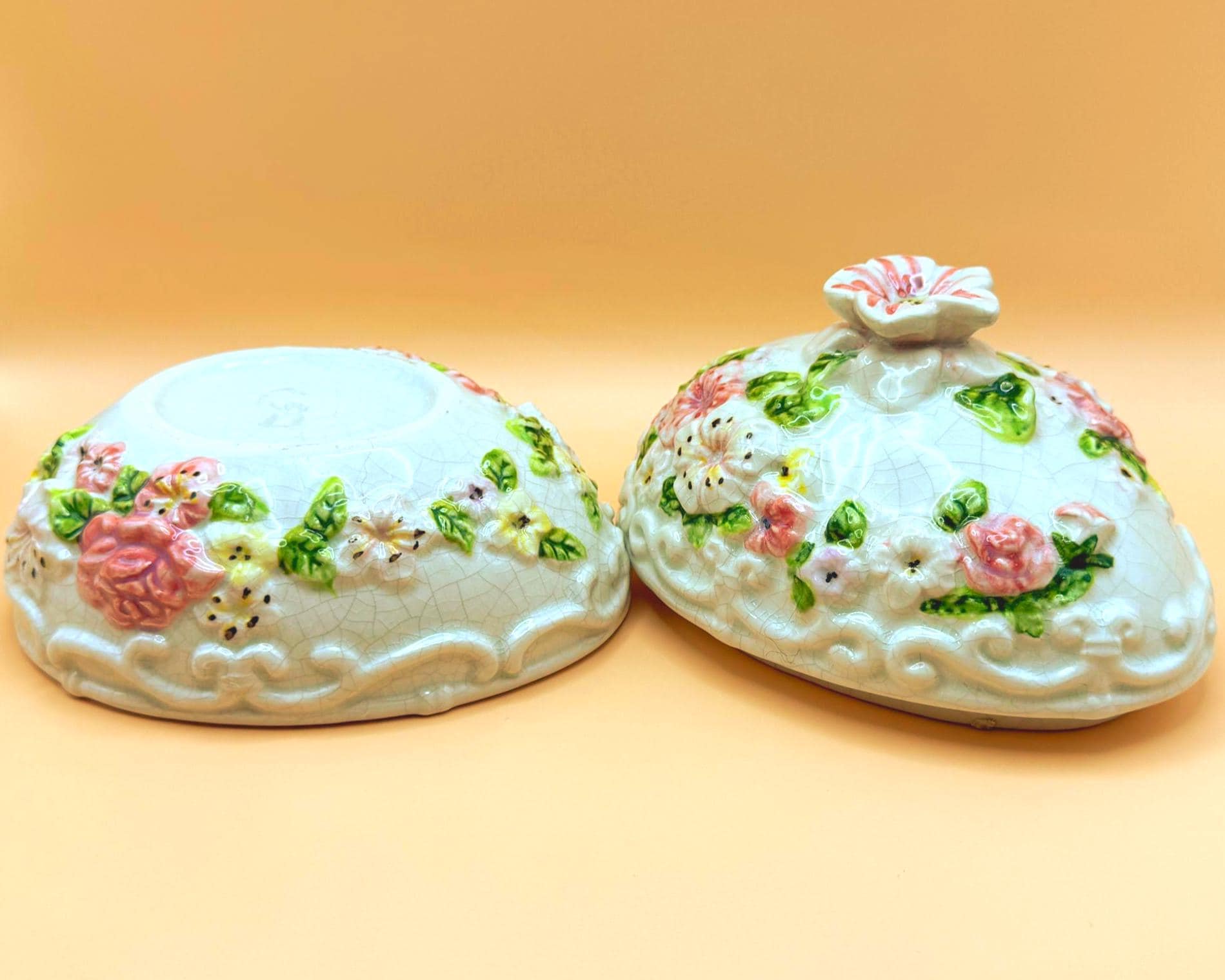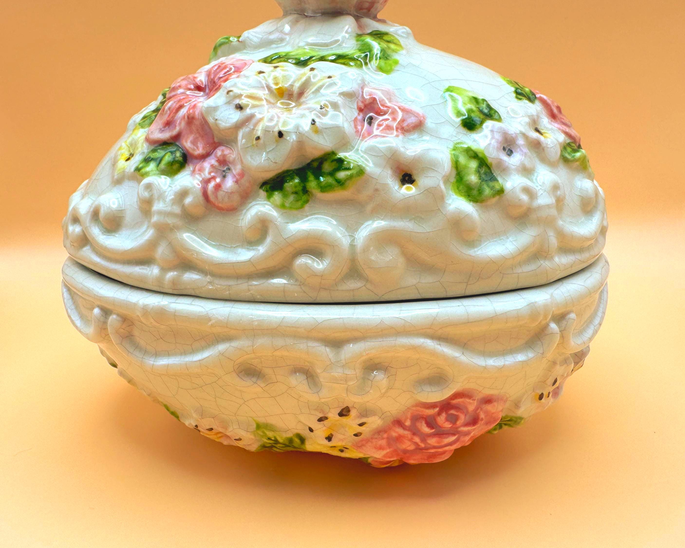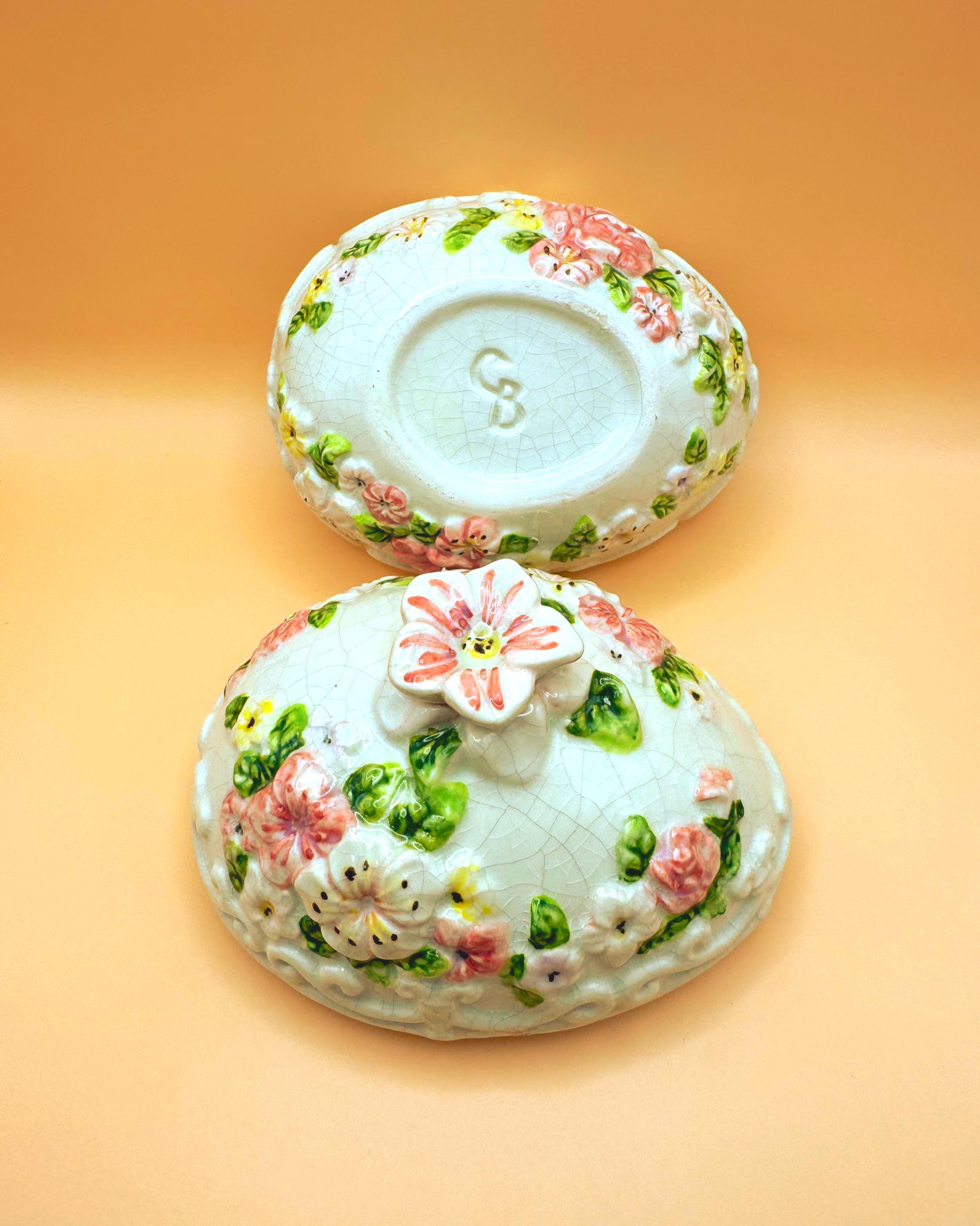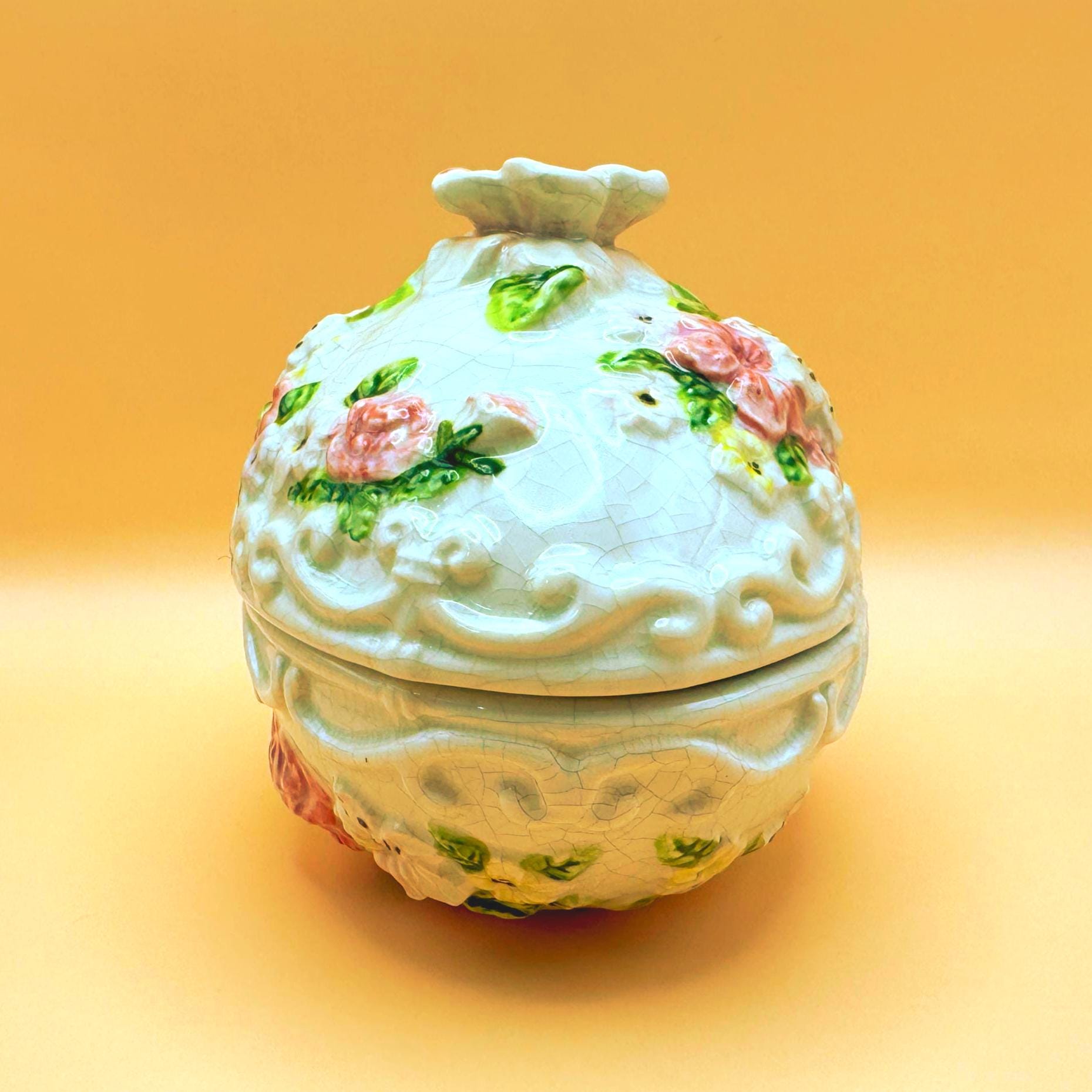Charming porcelain trinket box in a decorative egg shape, featuring a delicate crackle glaze and beautifully raised floral details. This piece was sold through Cracker Barrel and showcases the soft, romantic style often found in their seasonal décor collections.