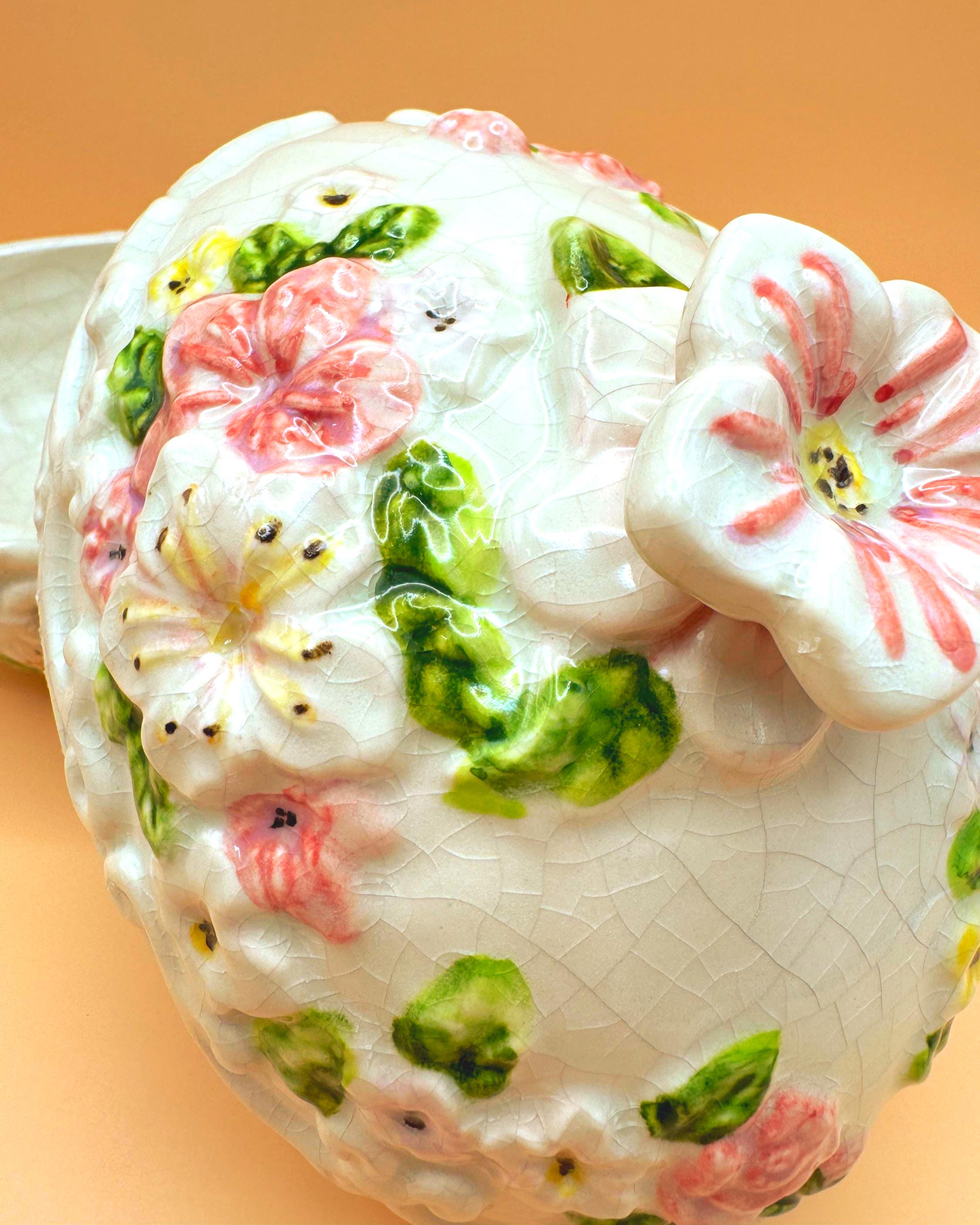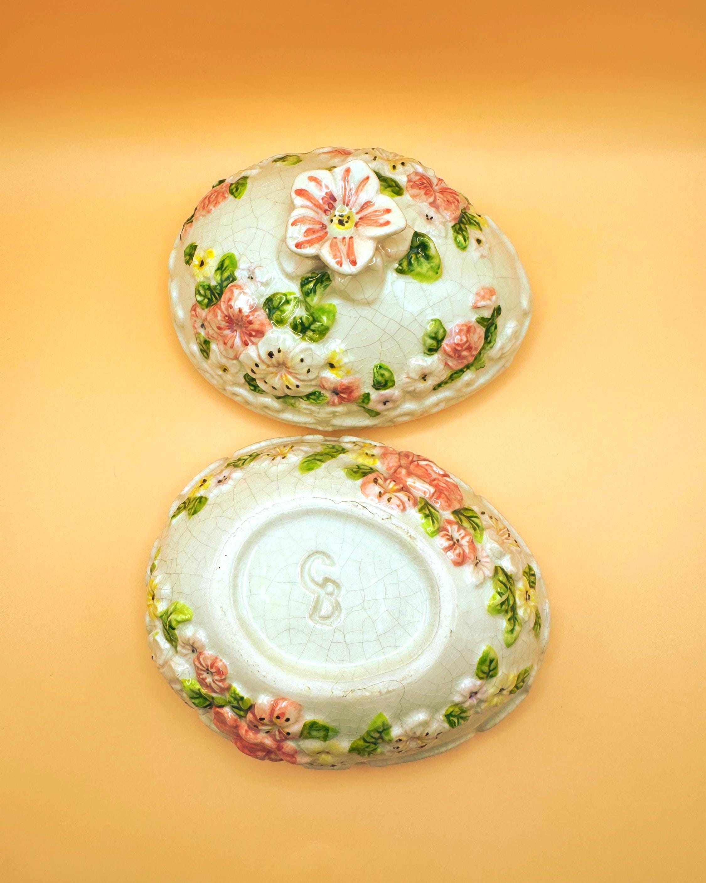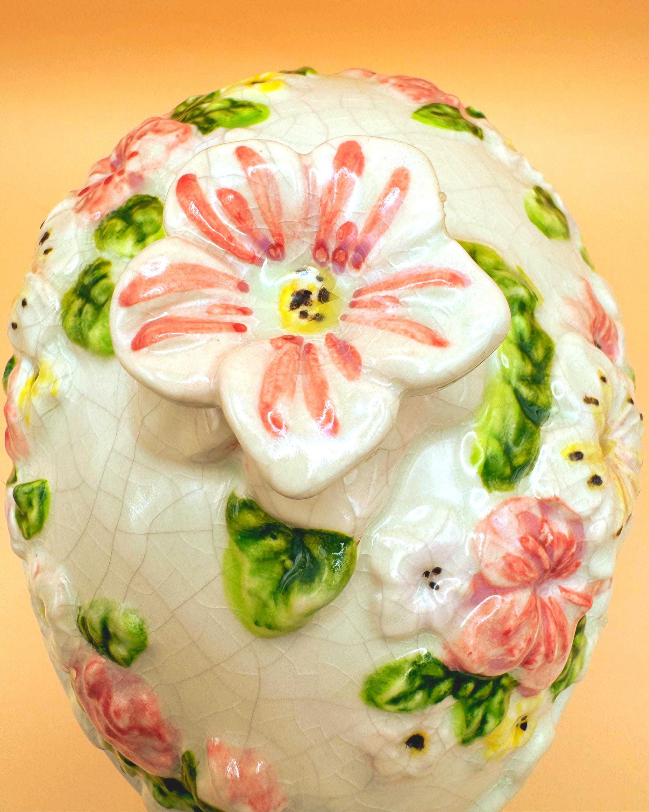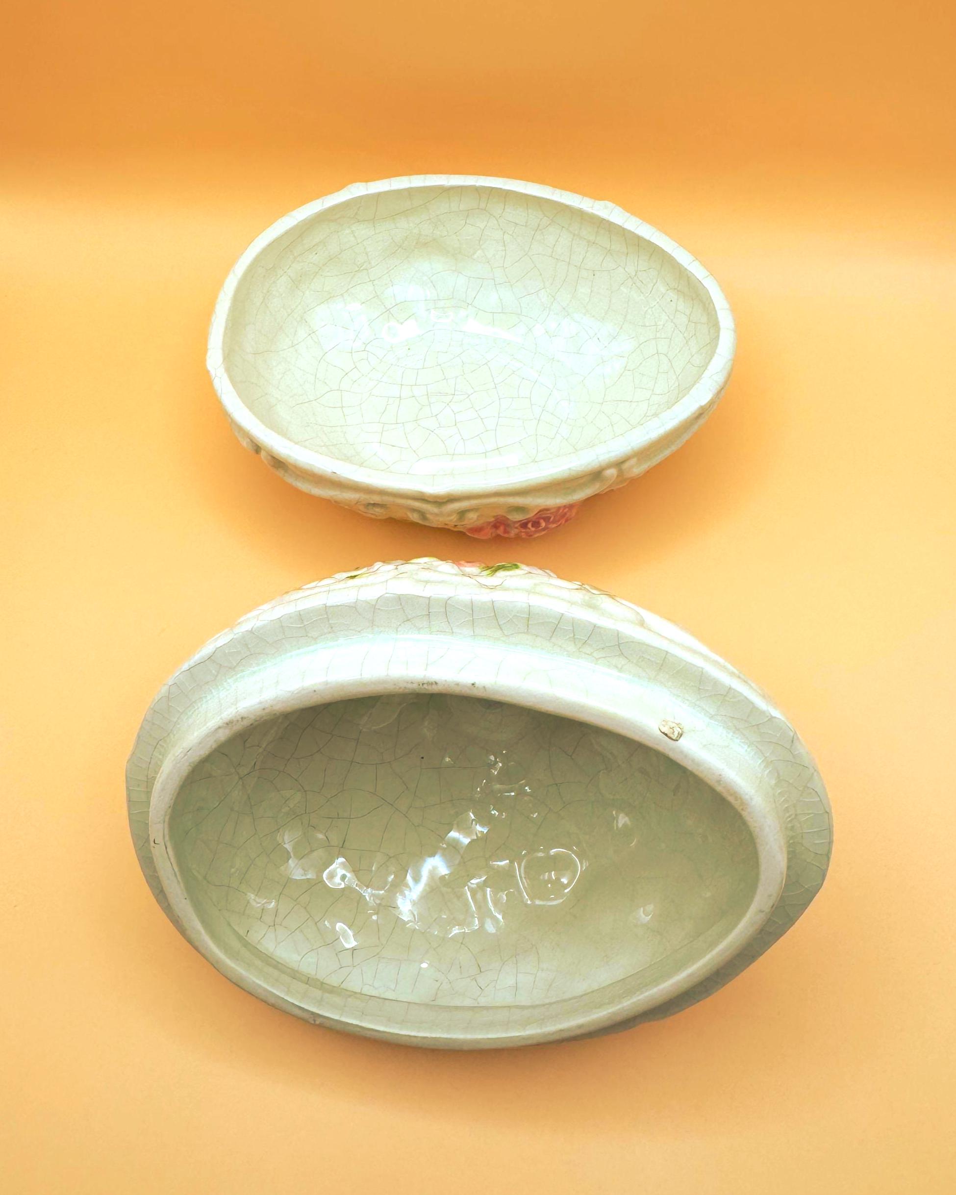 Charming porcelain trinket box in a decorative egg shape, featuring a delicate crackle glaze and beautifully raised floral details. This piece was sold through Cracker Barrel and showcases the soft, romantic style often found in their seasonal décor collections.