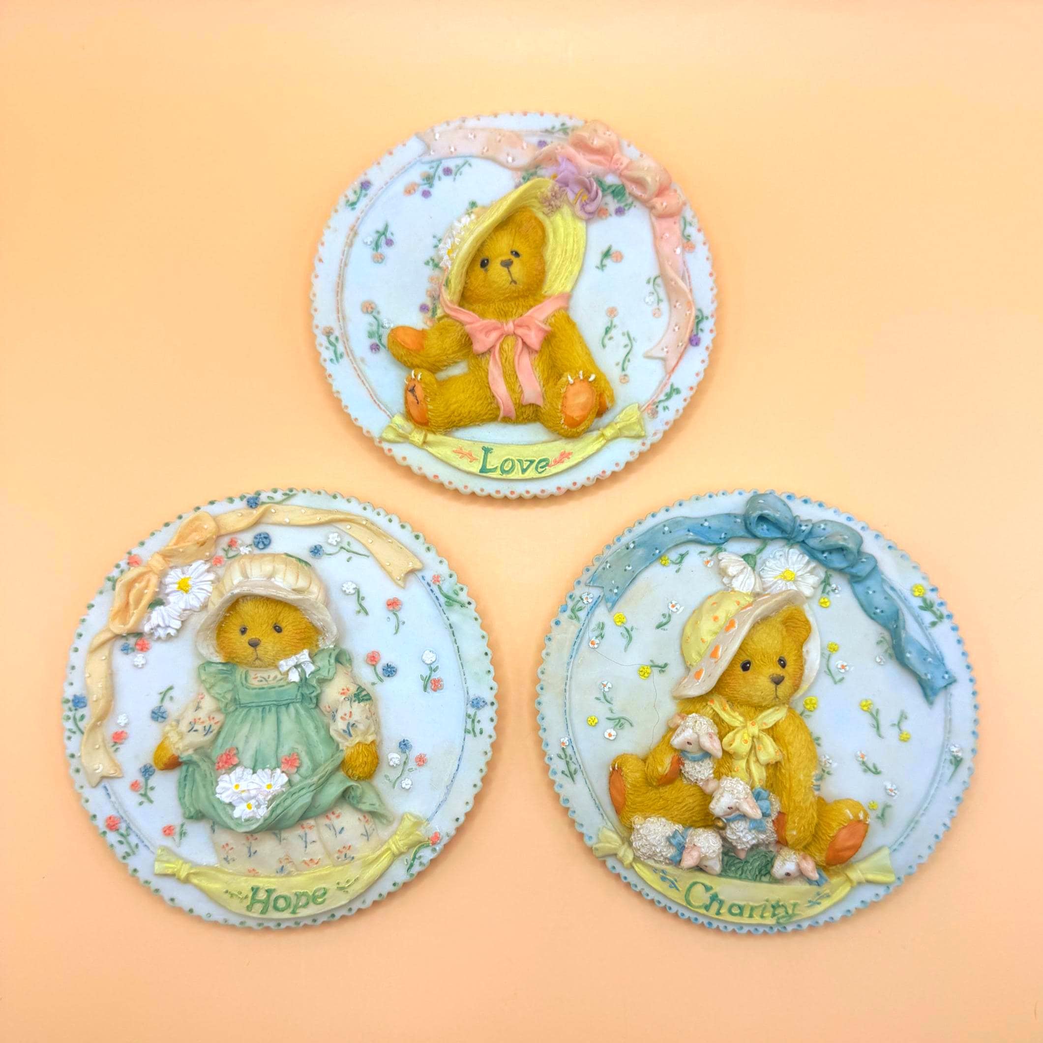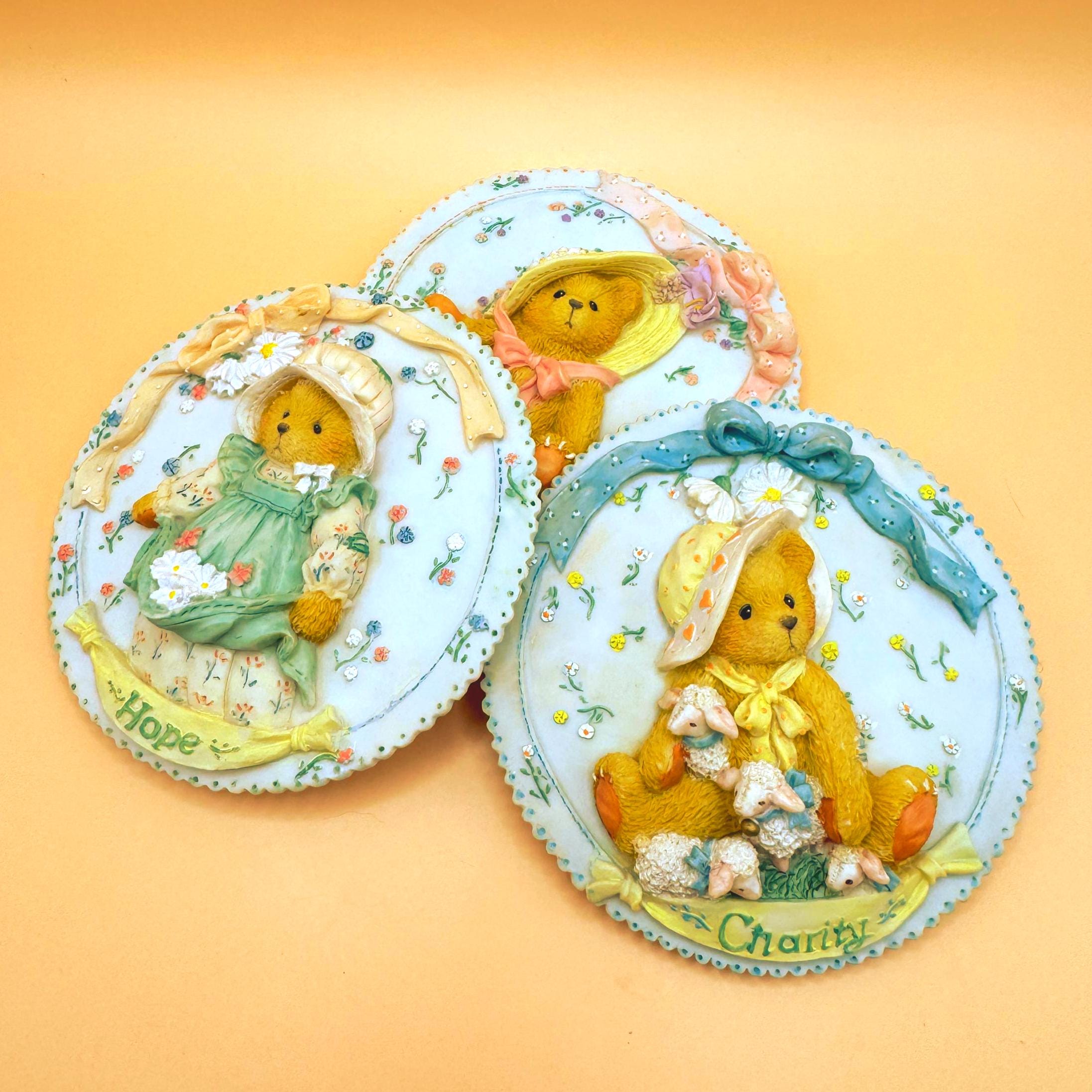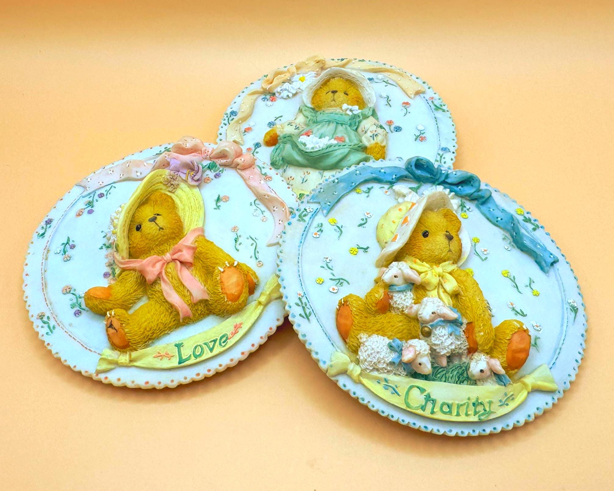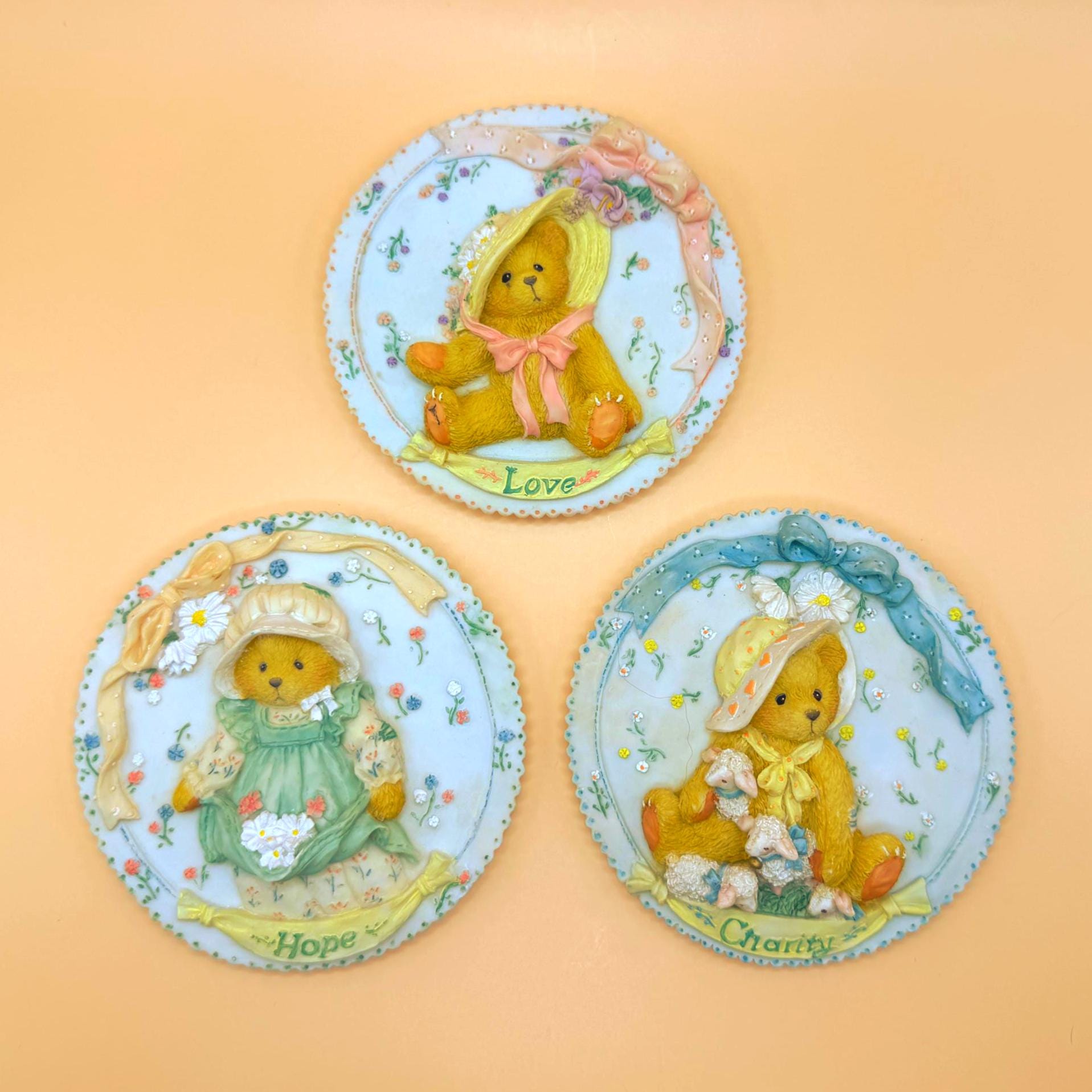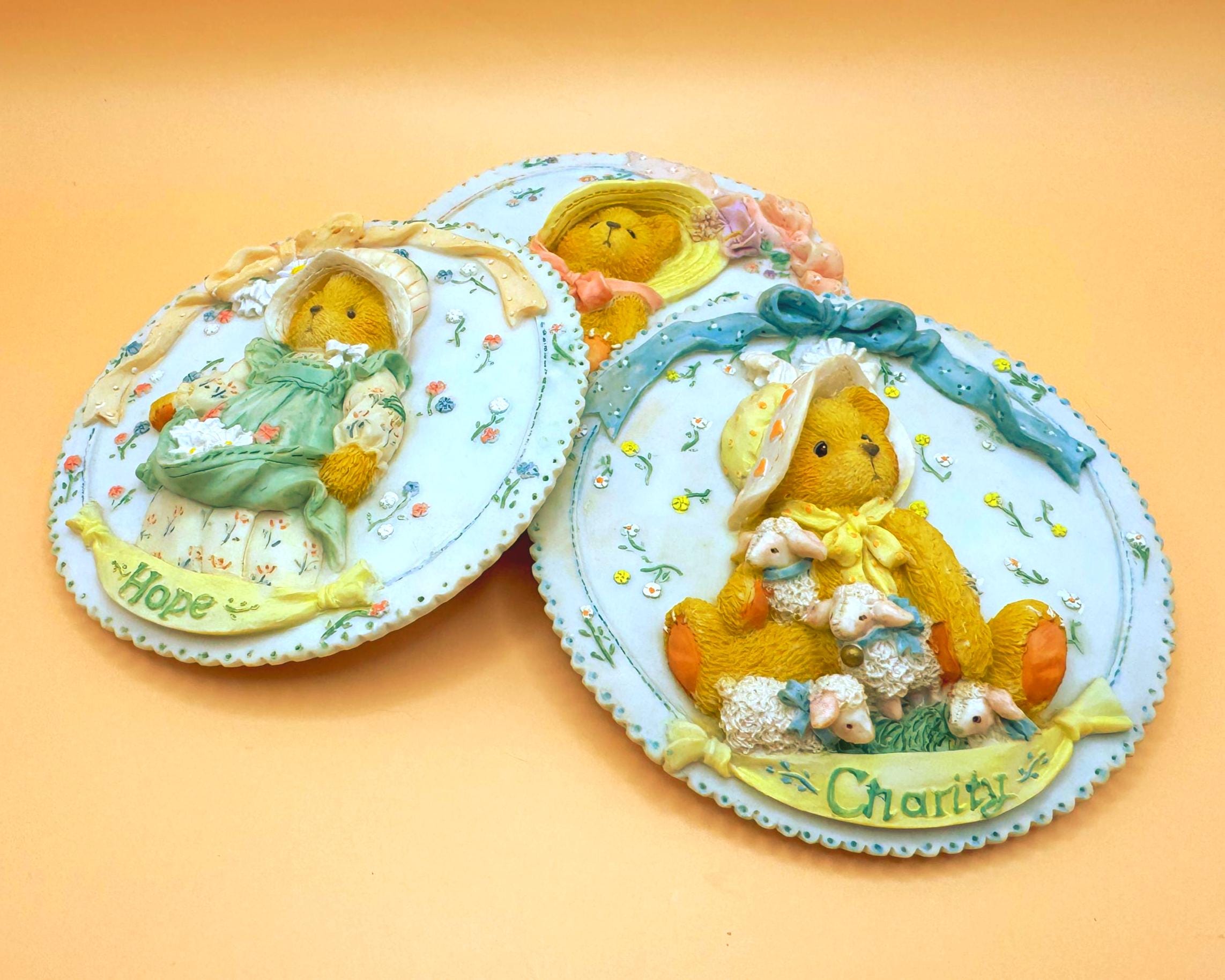 A sweet and nostalgic set of three Cherished Teddies wall plaques featuring the timeless message of Hope, Love, and Charity.