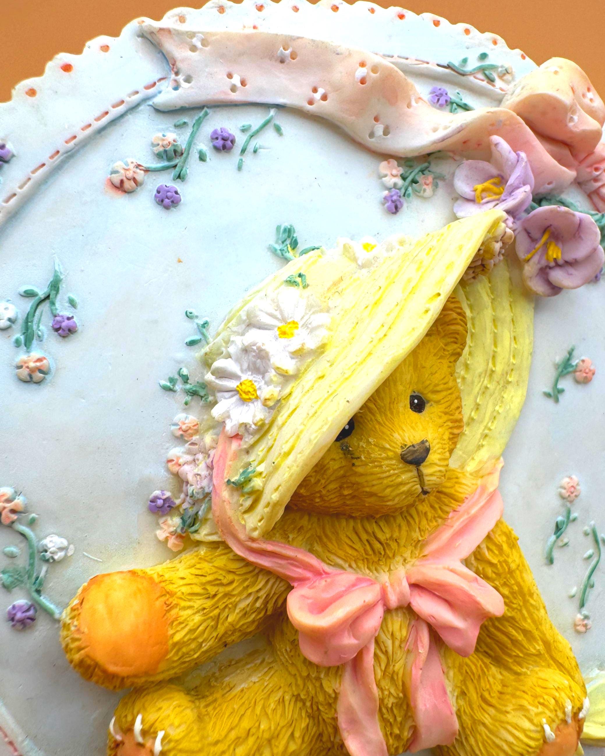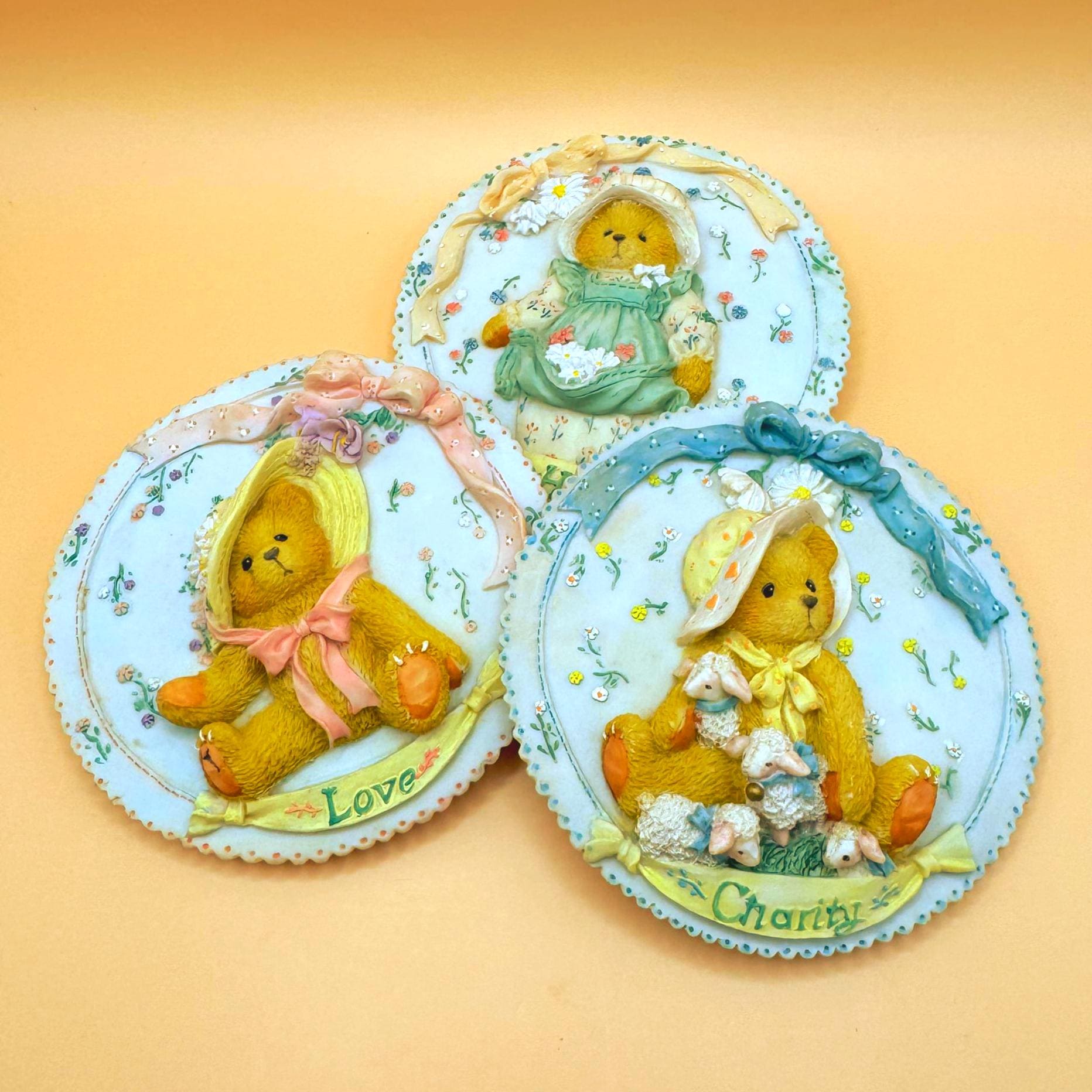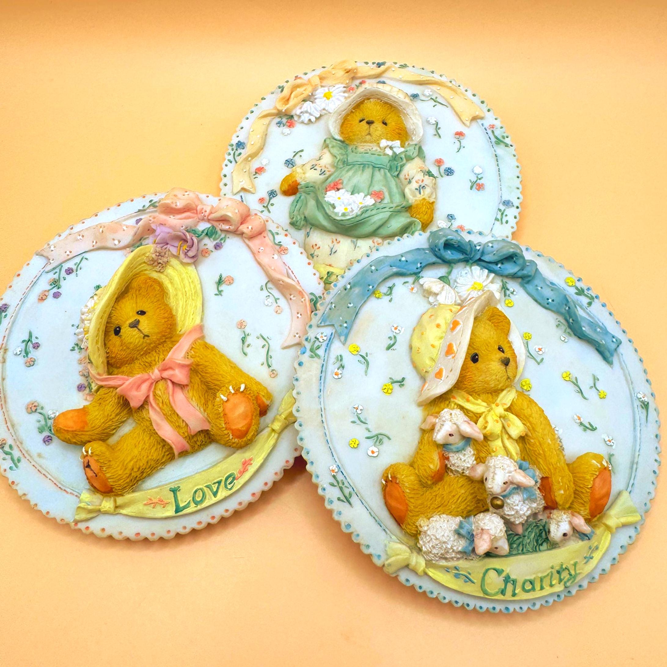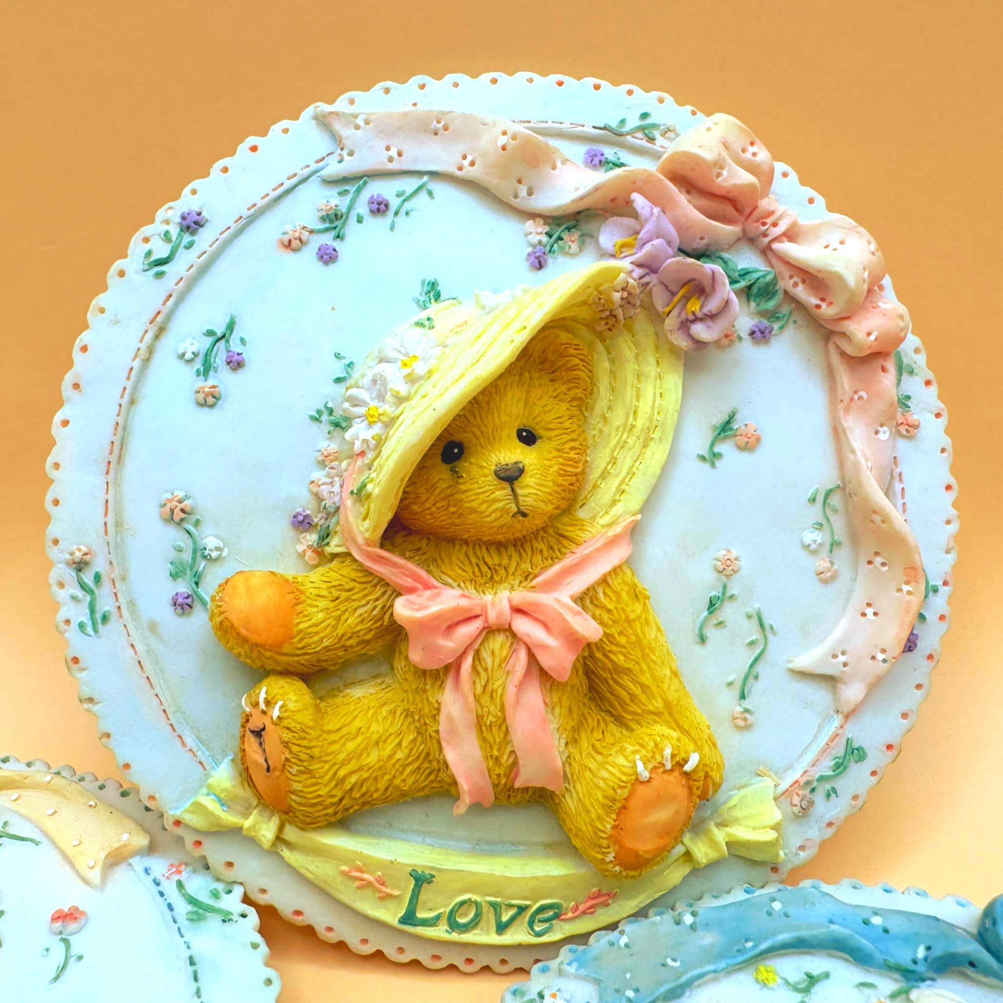 Each plaque showcases a beautifully detailed teddy bear in soft pastel tones with raised 3D design, delicate florals, and ribbon accents. These charming pieces bring a gentle, vintage warmth to any space—perfect for a nursery, gallery wall, or thoughtful gift.