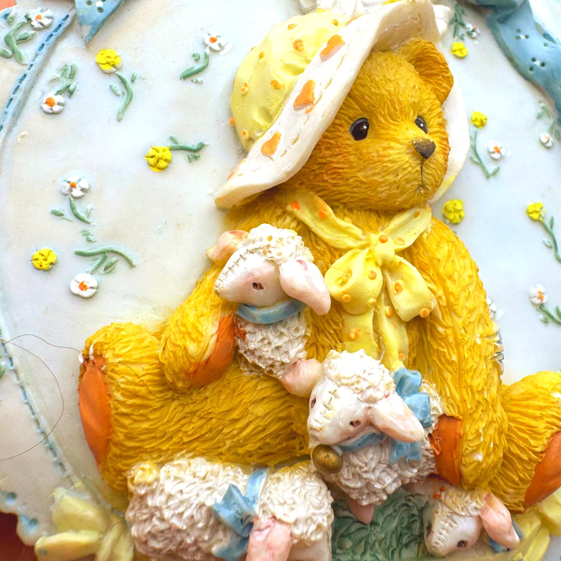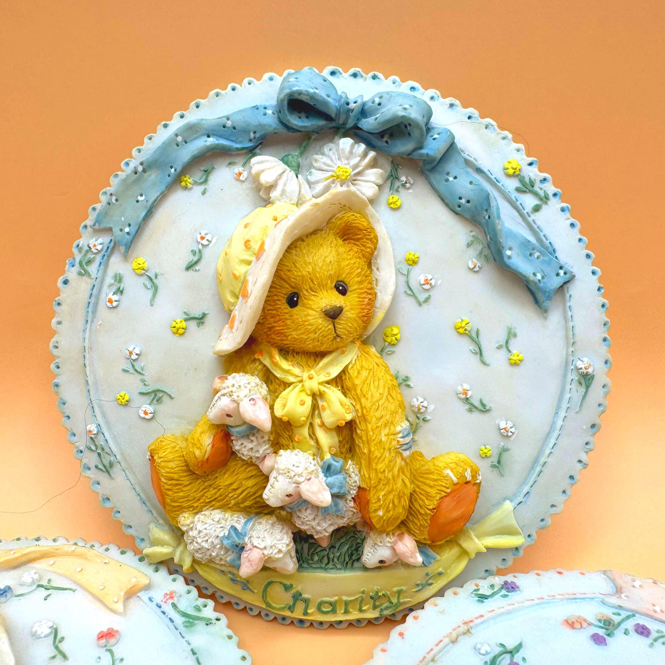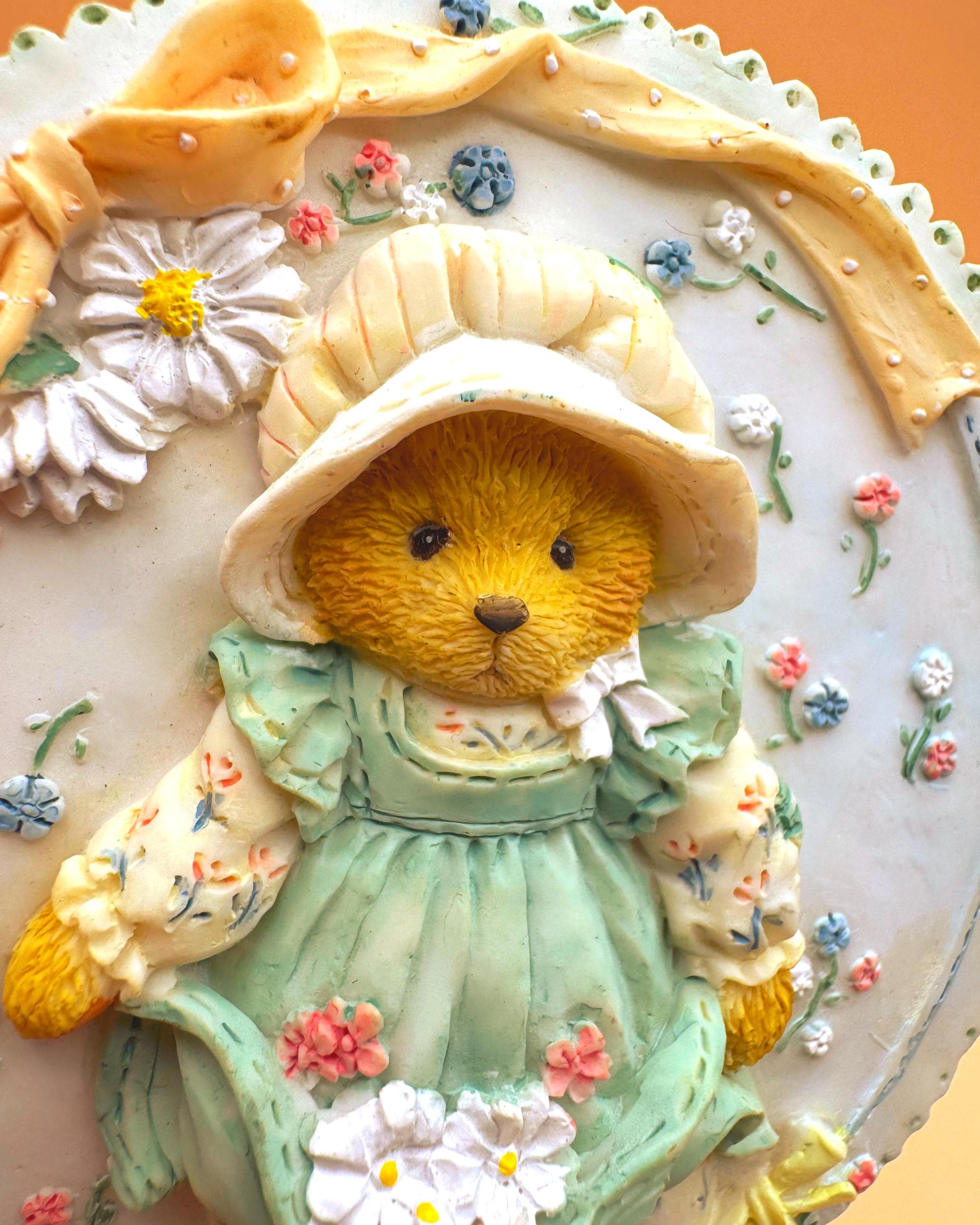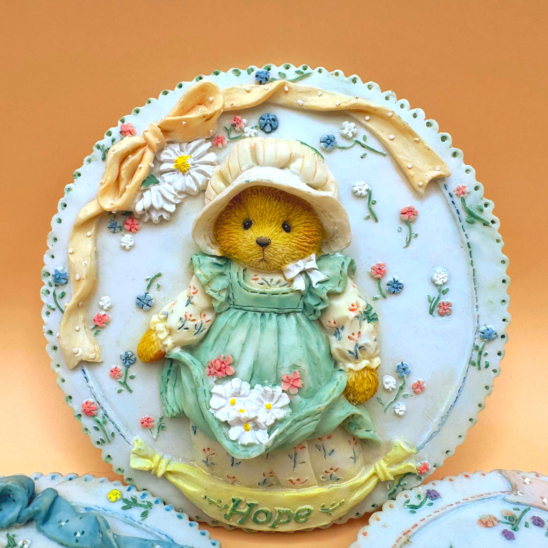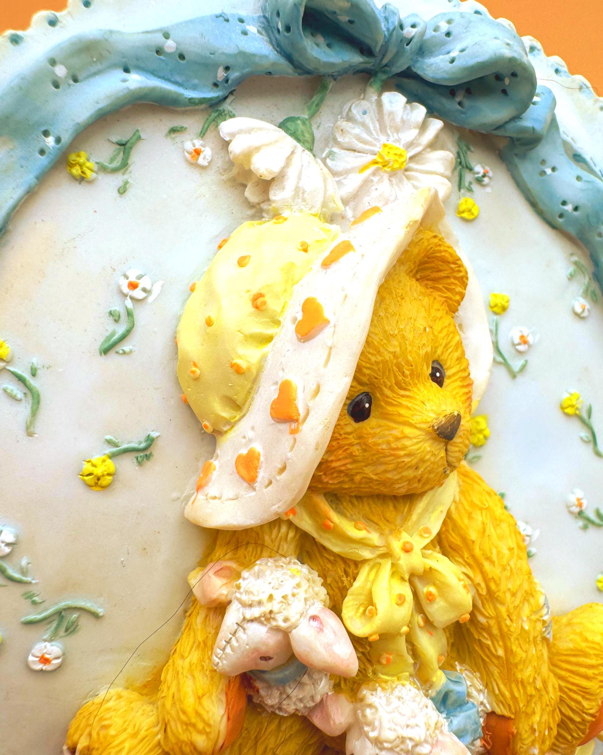 Each plaque showcases a beautifully detailed teddy bear in soft pastel tones with raised 3D design, delicate florals, and ribbon accents. These charming pieces bring a gentle, vintage warmth to any space—perfect for a nursery, gallery wall, or thoughtful gift.